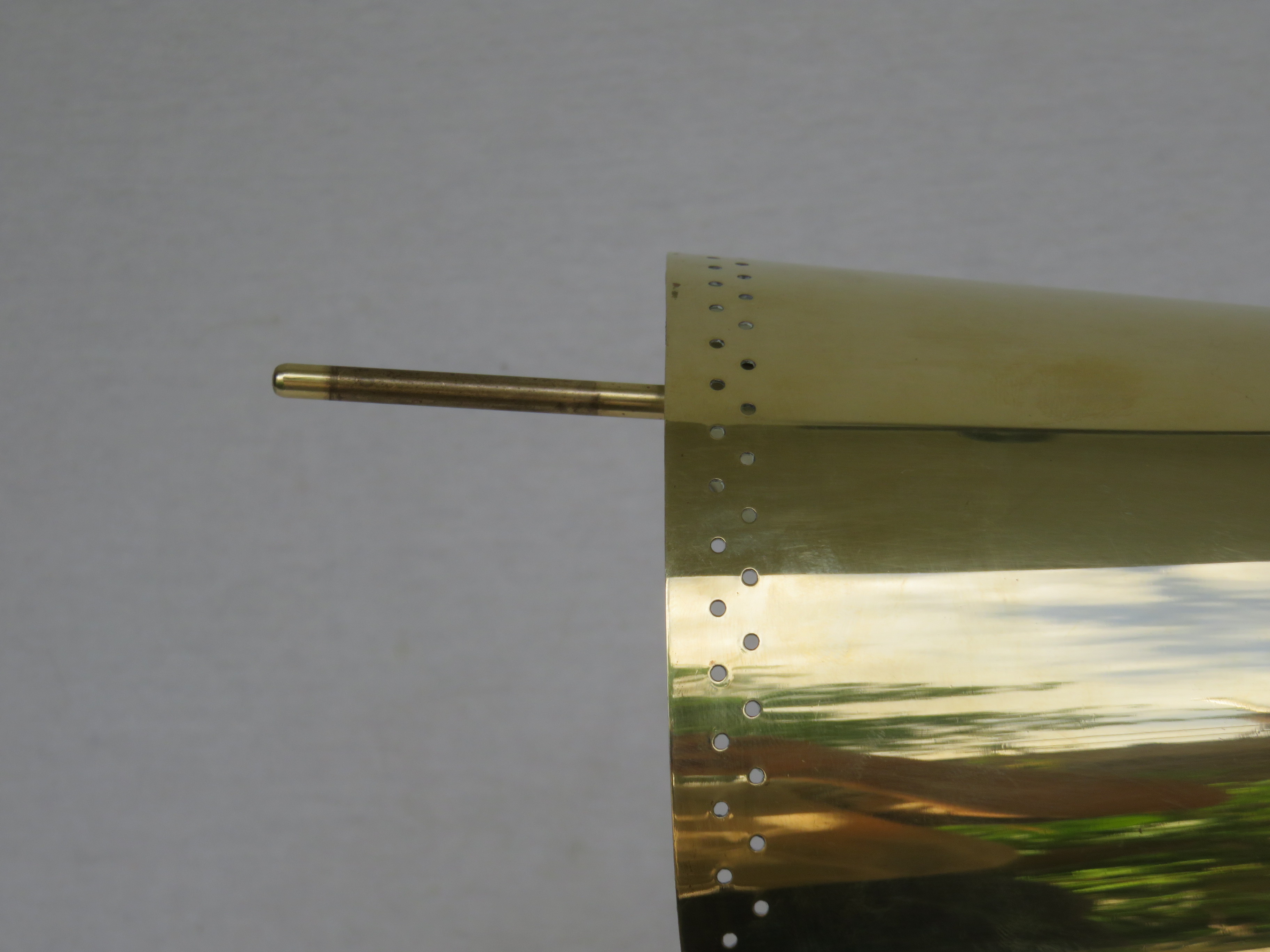 Das Messingrohr hat einen Durchmesser von 10 mm, die Wandhalterung 8 cm, der Lampenschirm 15 cm, Abstand von der Wand 43 cm, Höhe 28 cm.