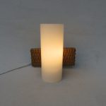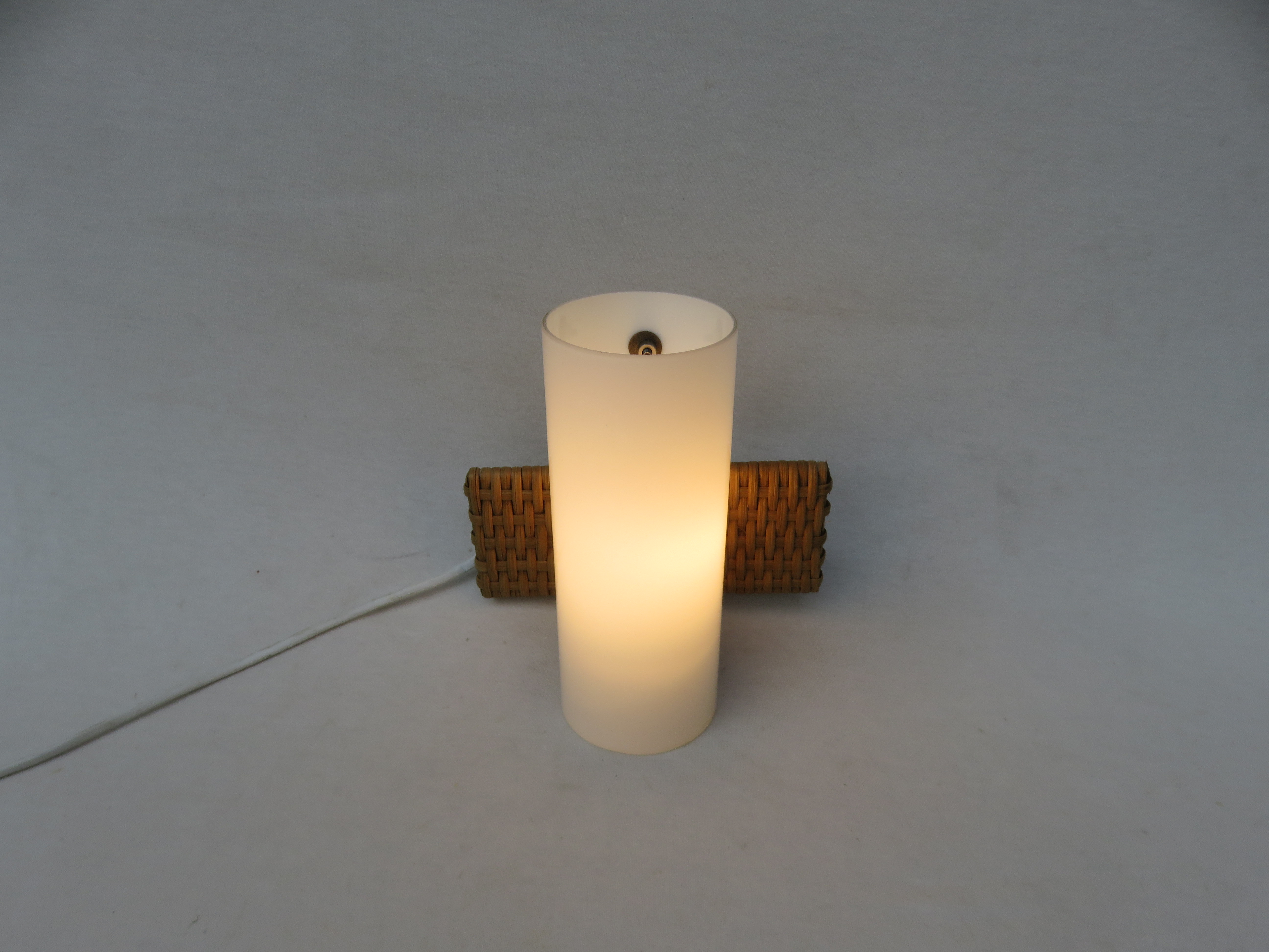 Der zylindrische Glasschirm ist aus weiß satiniertem Überfangglas. Die zylindrische Halterung ist schwarz lackieres Metall, die Wandhalterung ist Metall weiß lackiert.