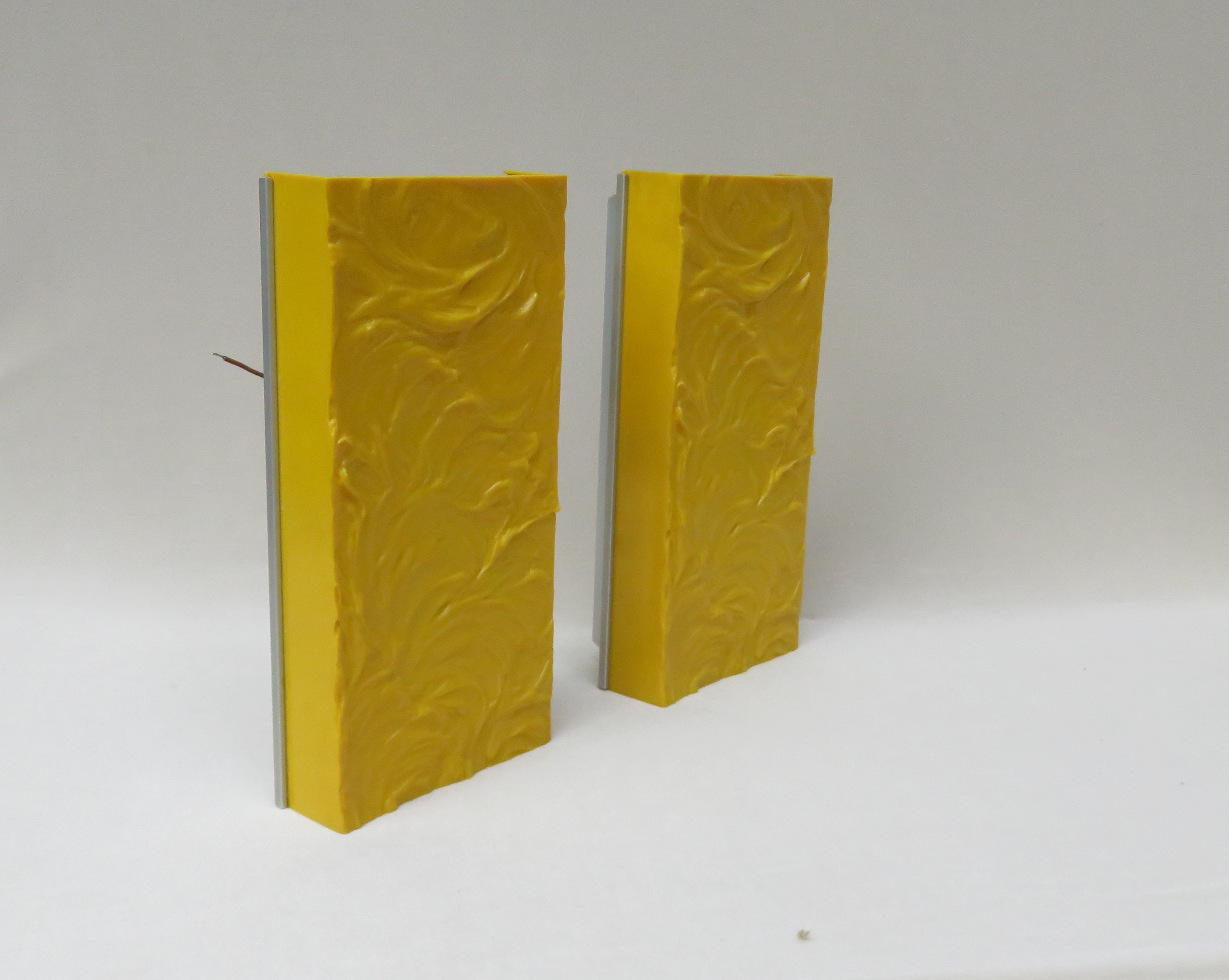 An den weiß lackierten Wandhalterungen wurde an einigen Stellen die Farbe retuschiert (bei einer Halterung an einer Stelle, bei der anderen an 5 Stellen). Im eingebauten Zustand befinden sich die Gläser vor den Halterungen, so daß dies nicht sichtbar ist.
