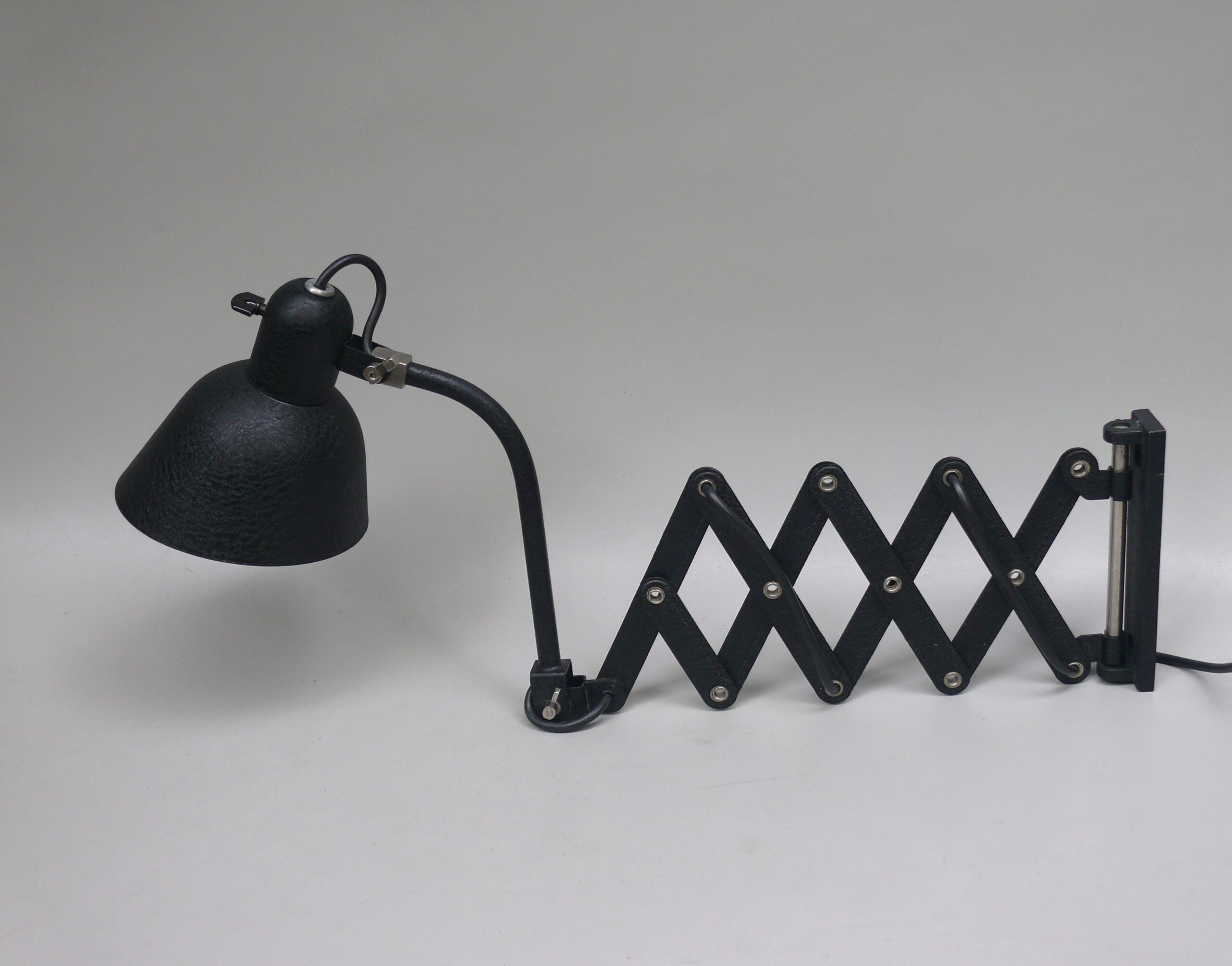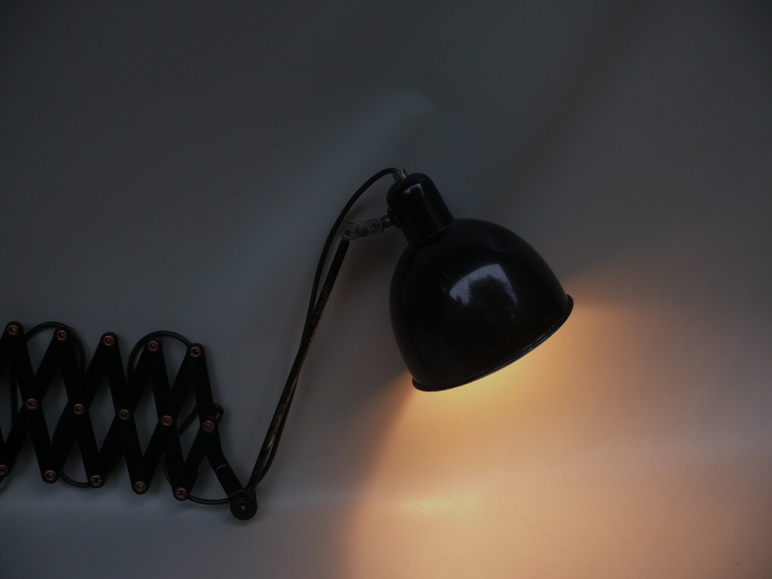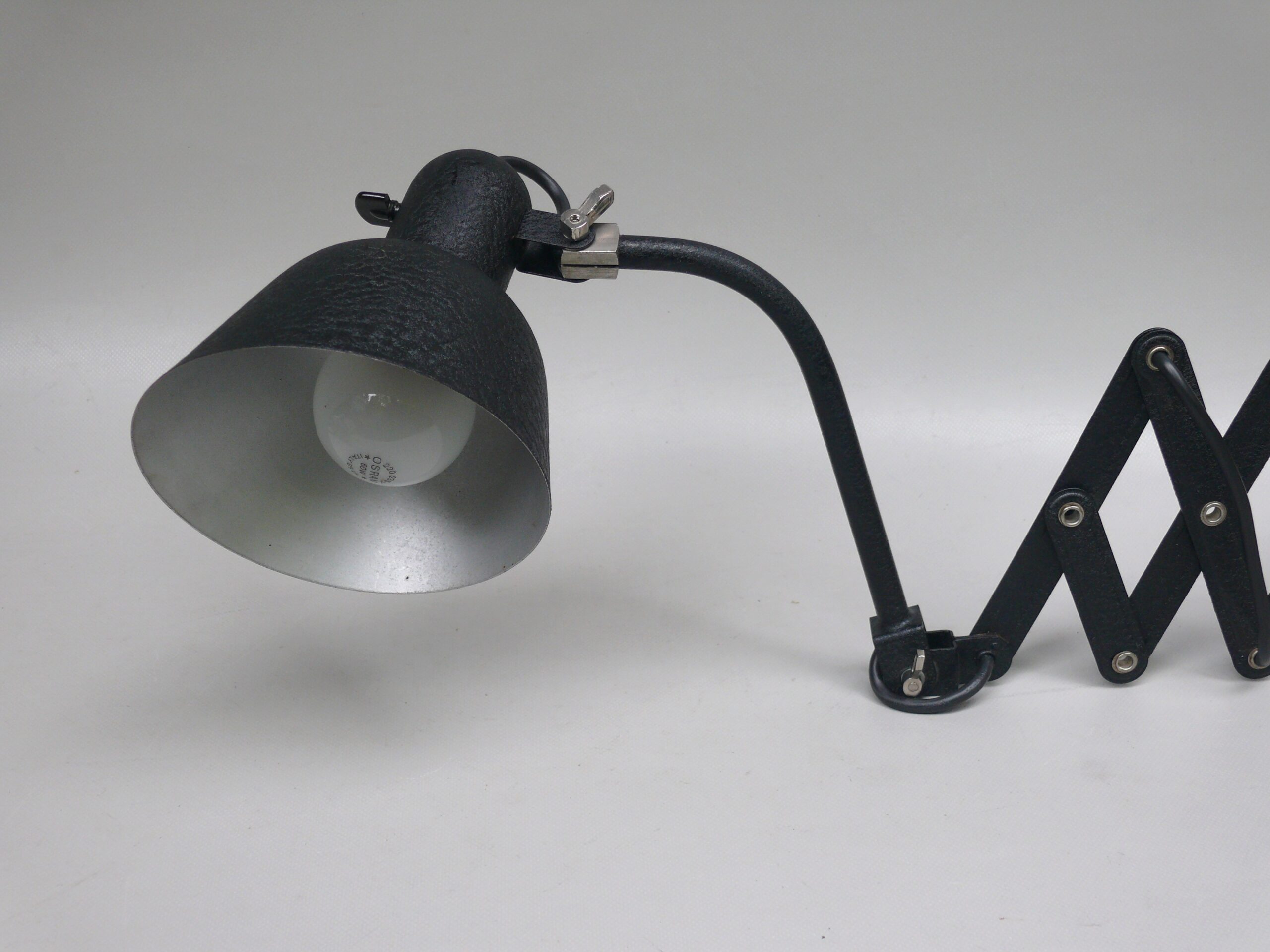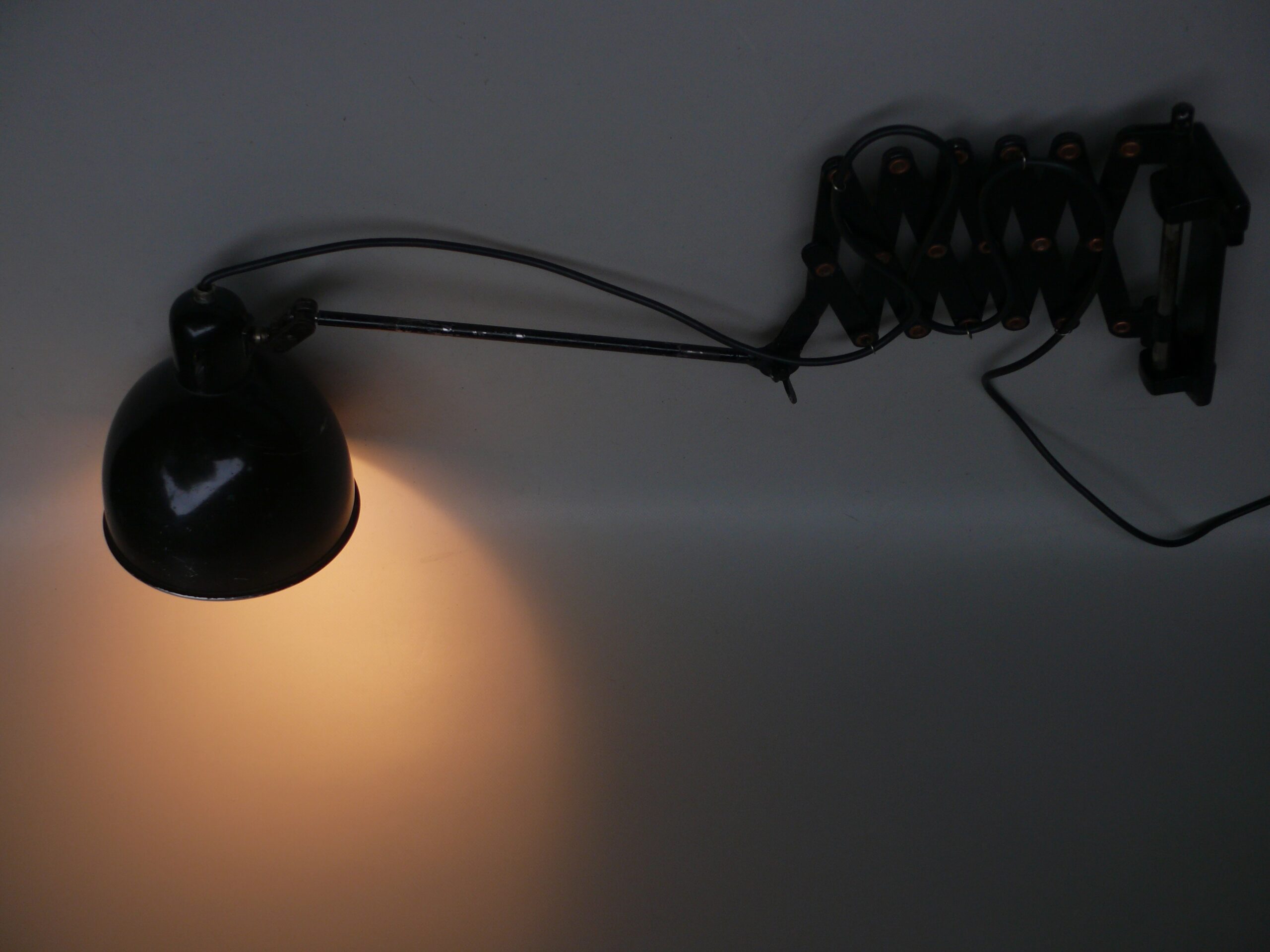 Eine große Scherenleuchte, Arbeitsleuchte aus den 30er Jahren in schwarzem Originallack, hergestellt in Deutschland.