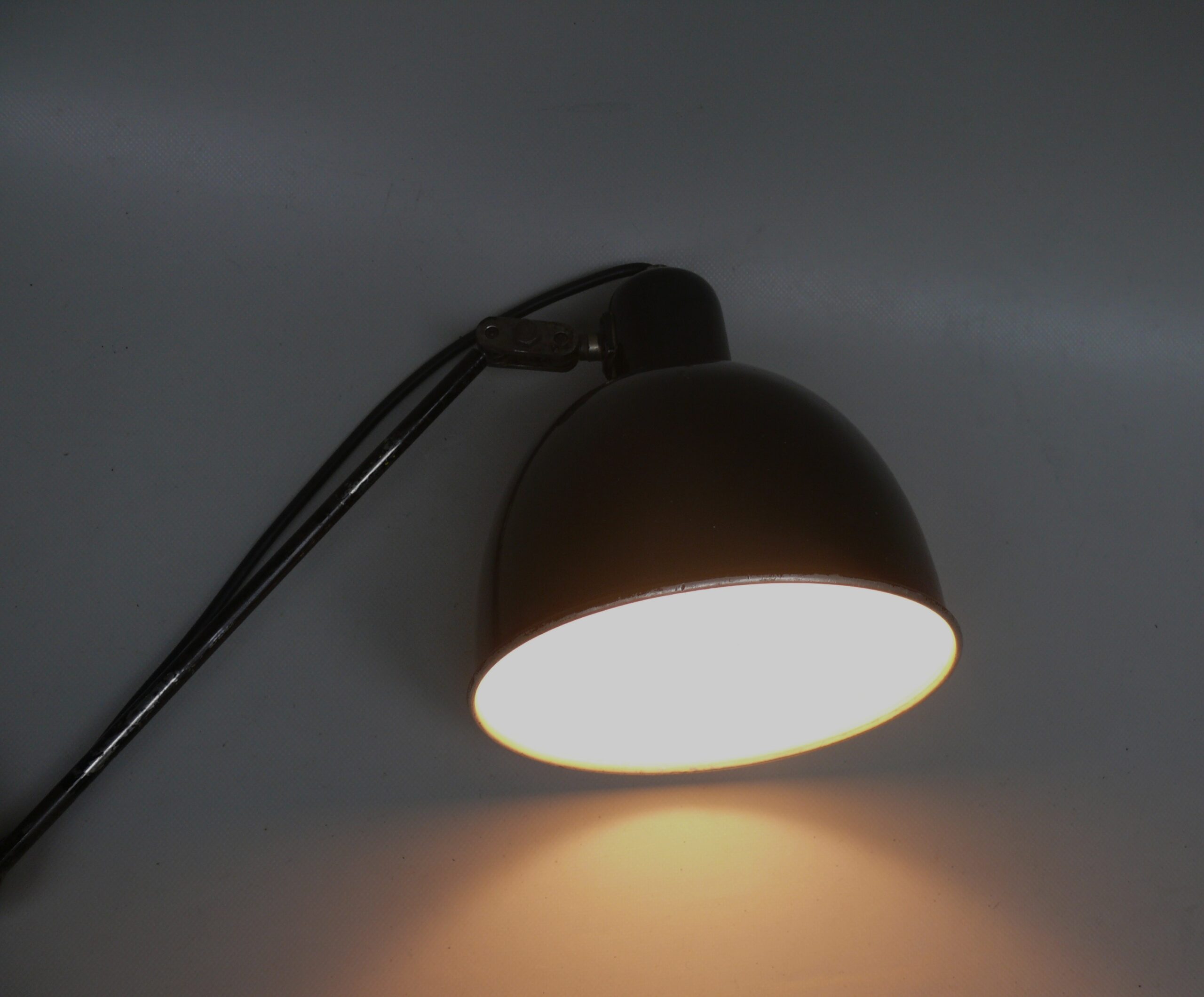 Die Leuchte ist in einem schönen Zustand in original beigem Lack. Der Lampenschirm ist außen beige, innen weiß emailliert mit einigen wenigen Fehlstellen im Email. Die Leuchte kann an der Wandhalterung geschwenkt und hoch und runter gefahren werden. Durch das Kugelgelenk am Lampenschirm kann dieser geneigt und gedreht werden. Sie verfügt über eine E27-Fassung mit Drehschalter.