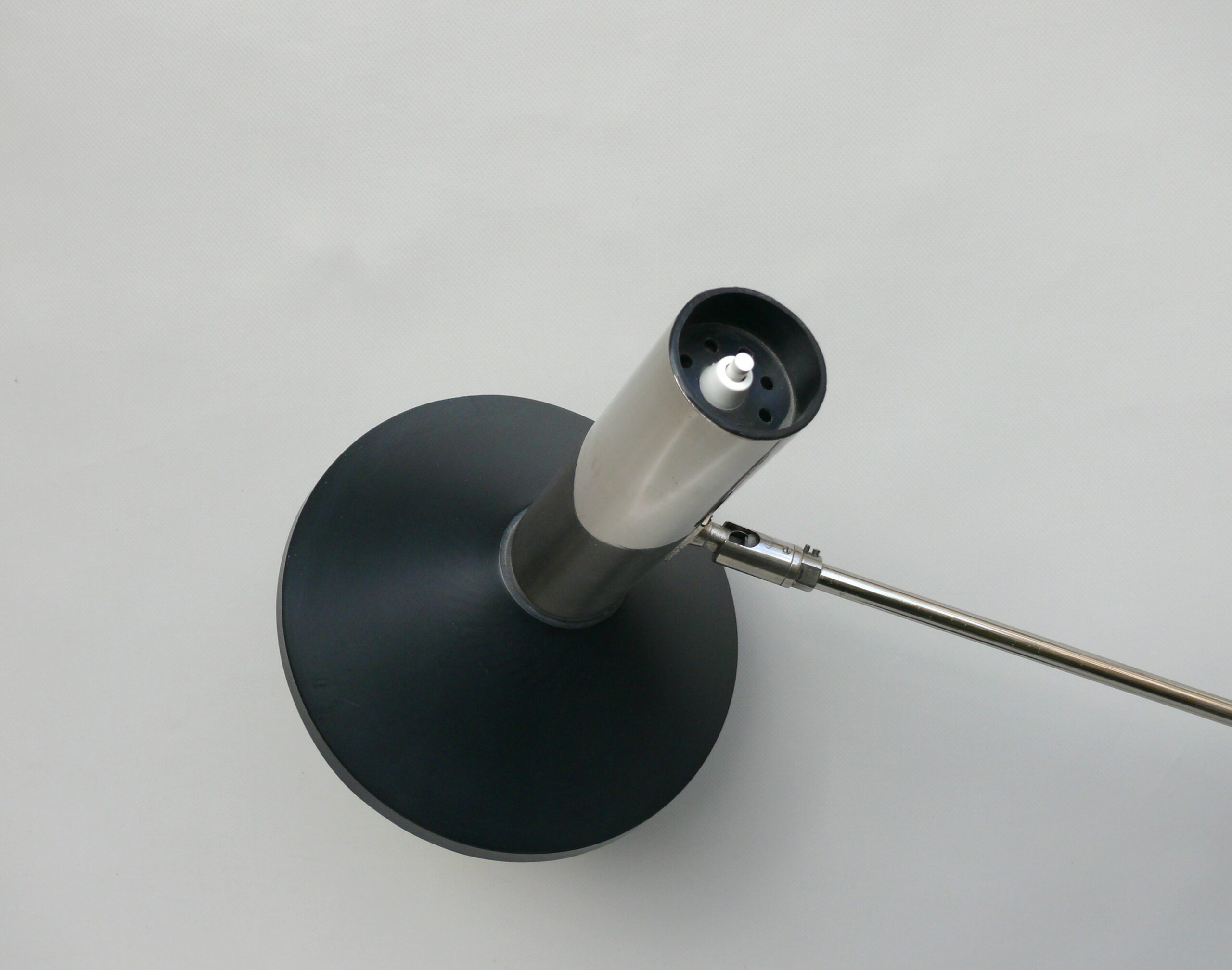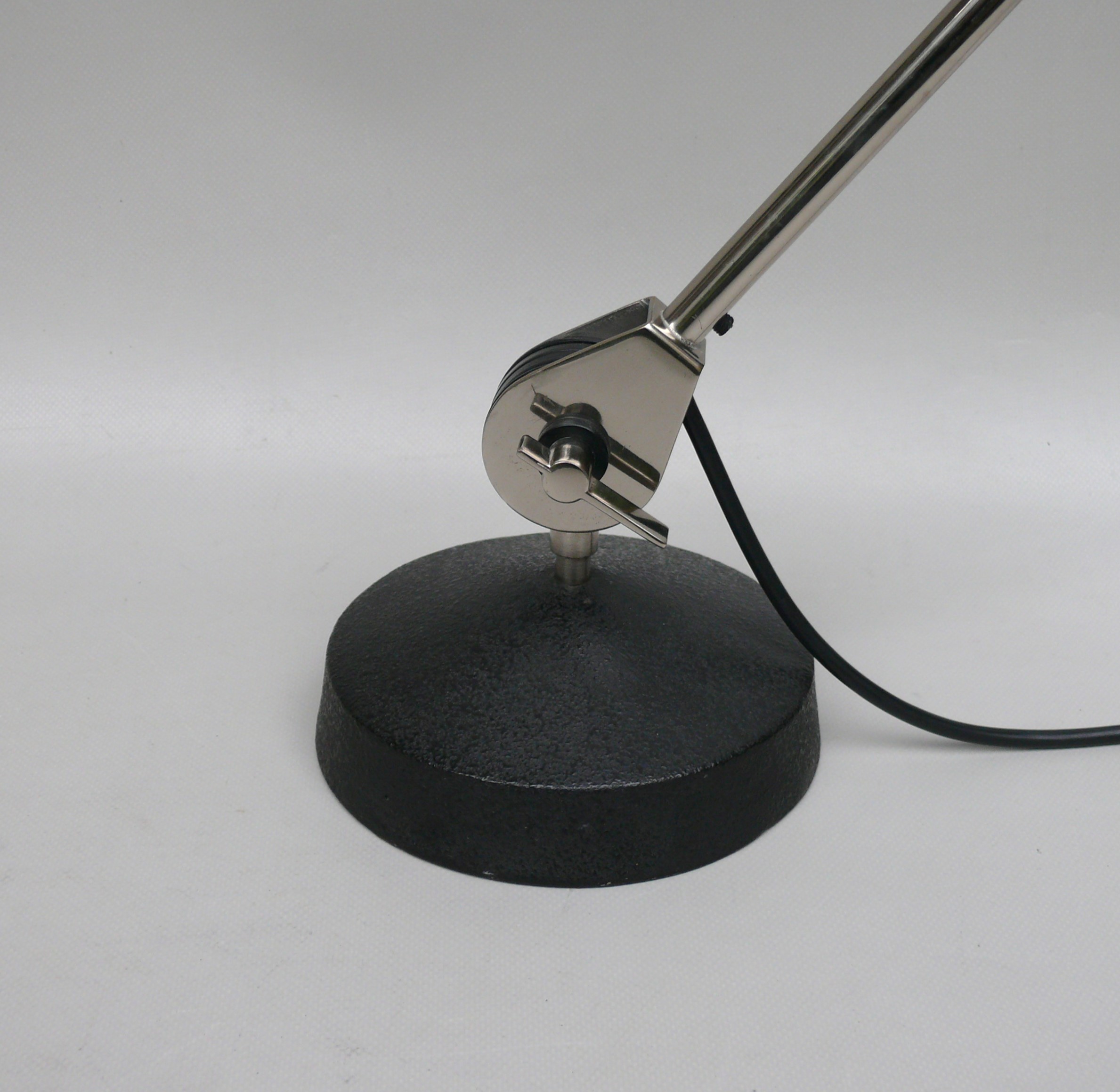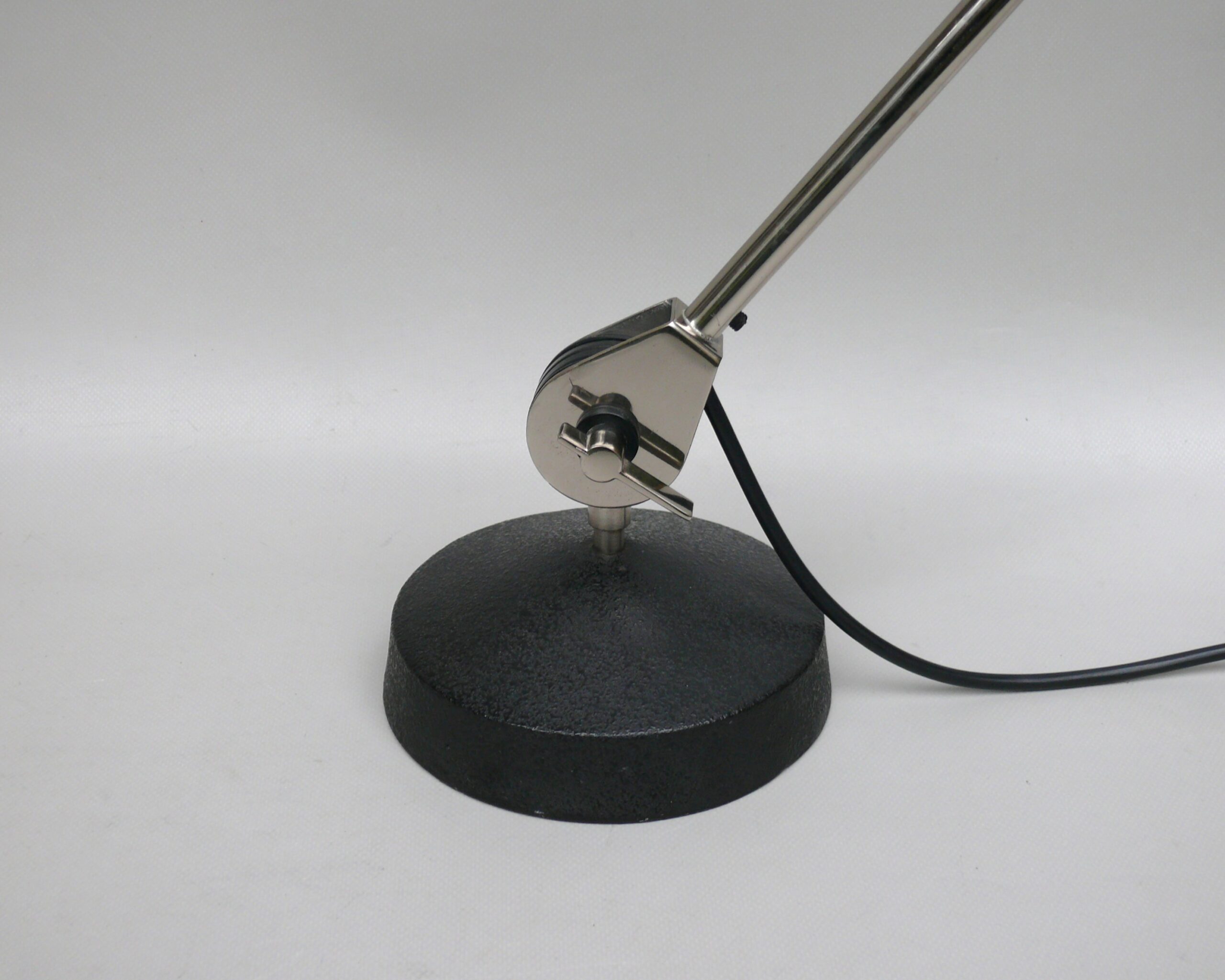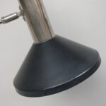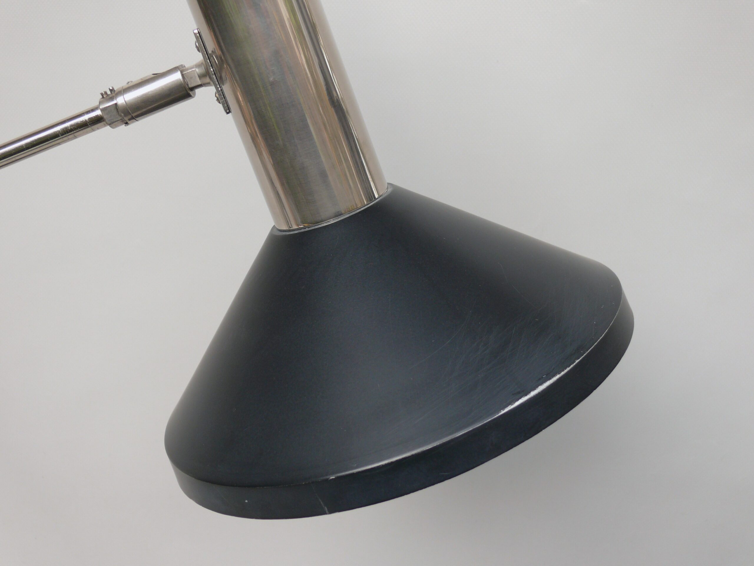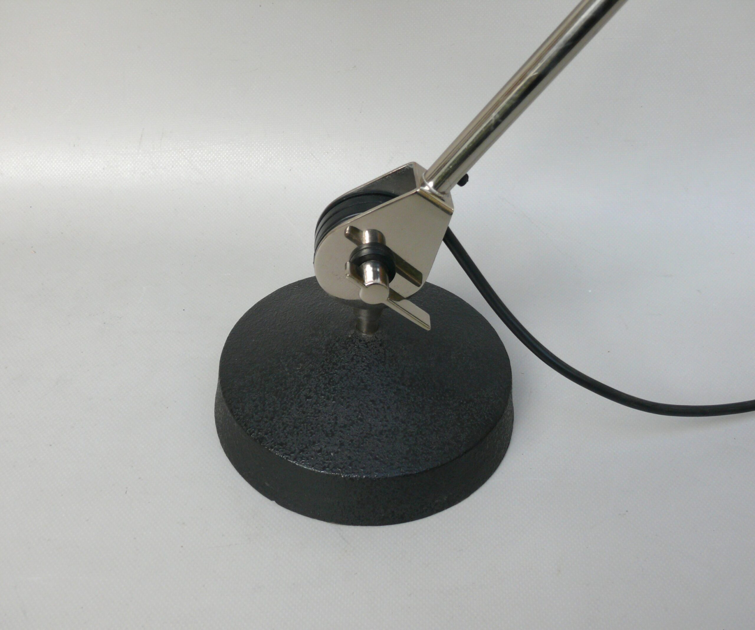 Der Lampenschirm läßt sich über einen Bajonett-Verschluß abnehmen. Der Griff am verchromten Lampenarm ist aus schwarz lackiertem Metall, der Schirm ist aus Aluminium. Die Farbe am Sockel ist schwarzer Schrumpflack.