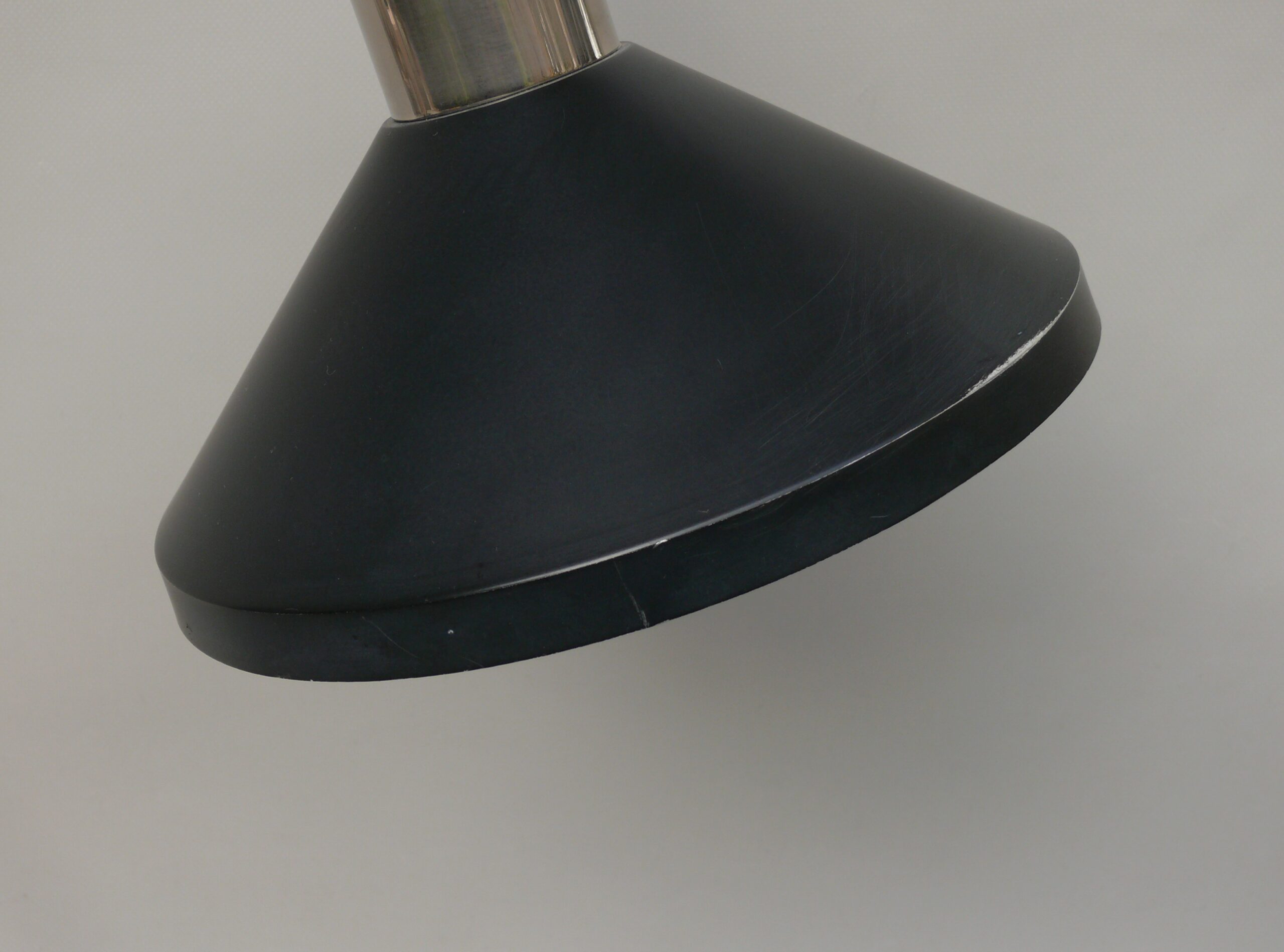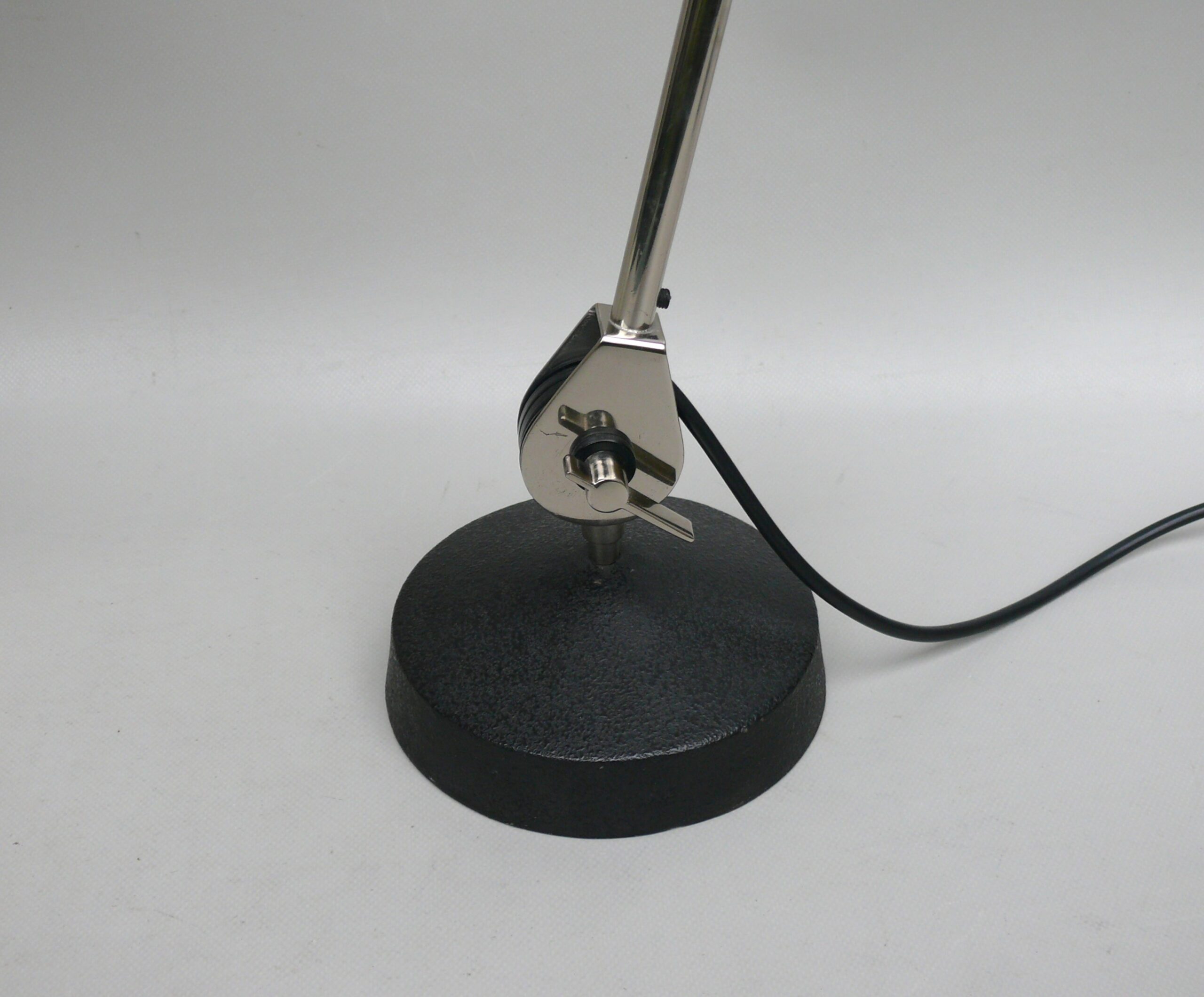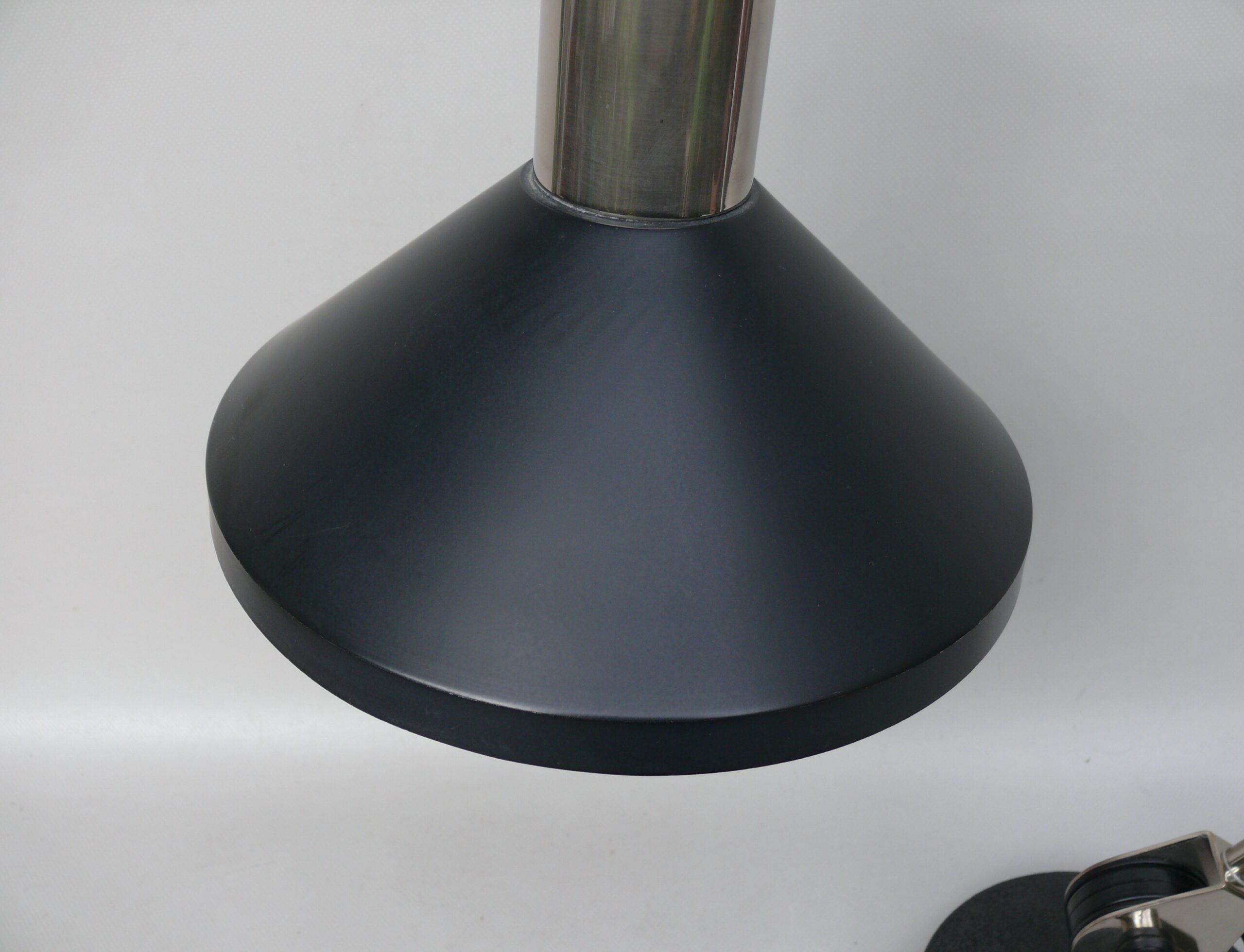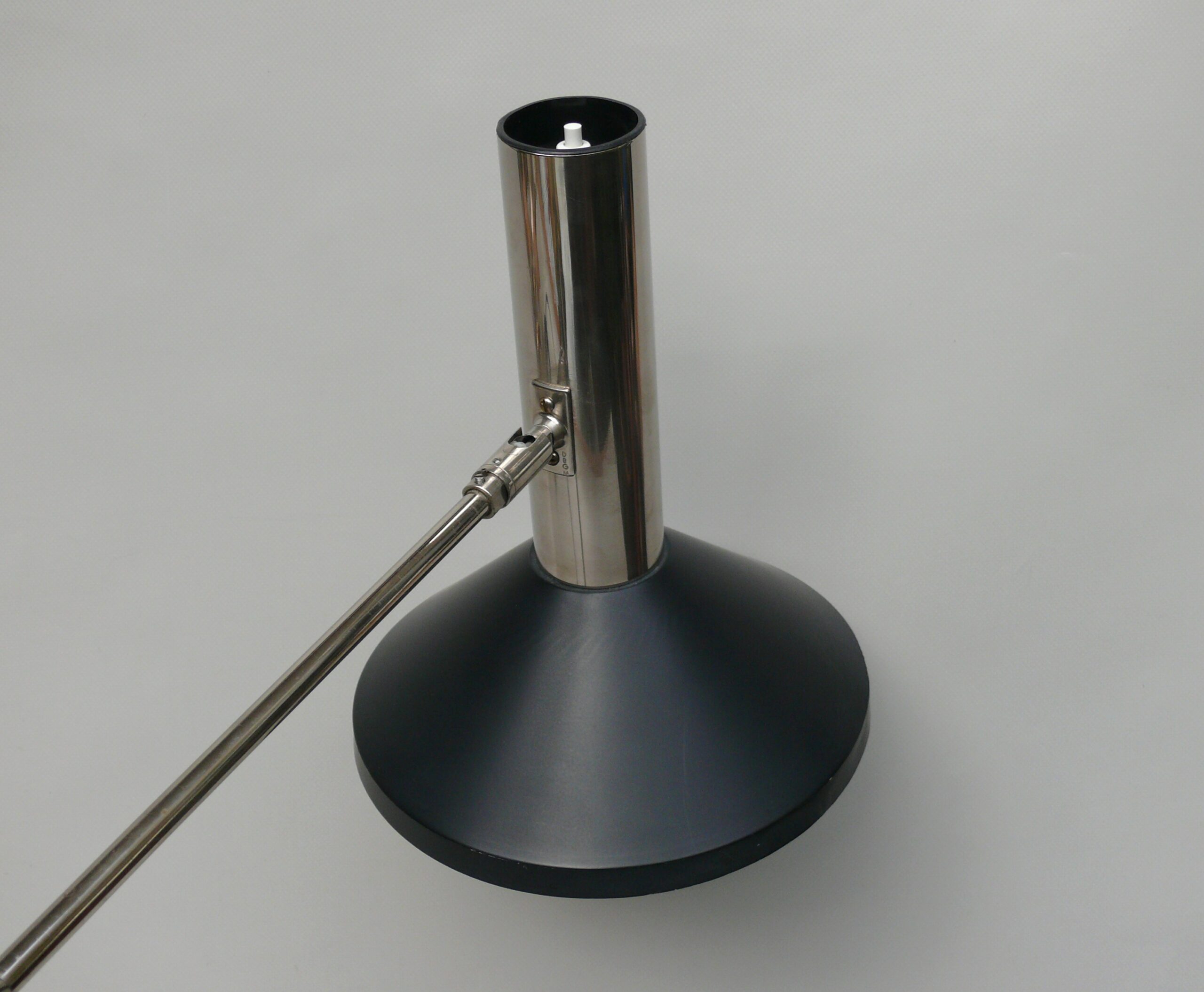Der Lampenschirm läßt sich über einen Bajonett-Verschluß abnehmen. Der Griff am verchromten Lampenarm ist aus schwarz lackiertem Metall, der Schirm ist aus Aluminium. Die Farbe am Sockel ist schwarzer Schrumpflack.