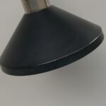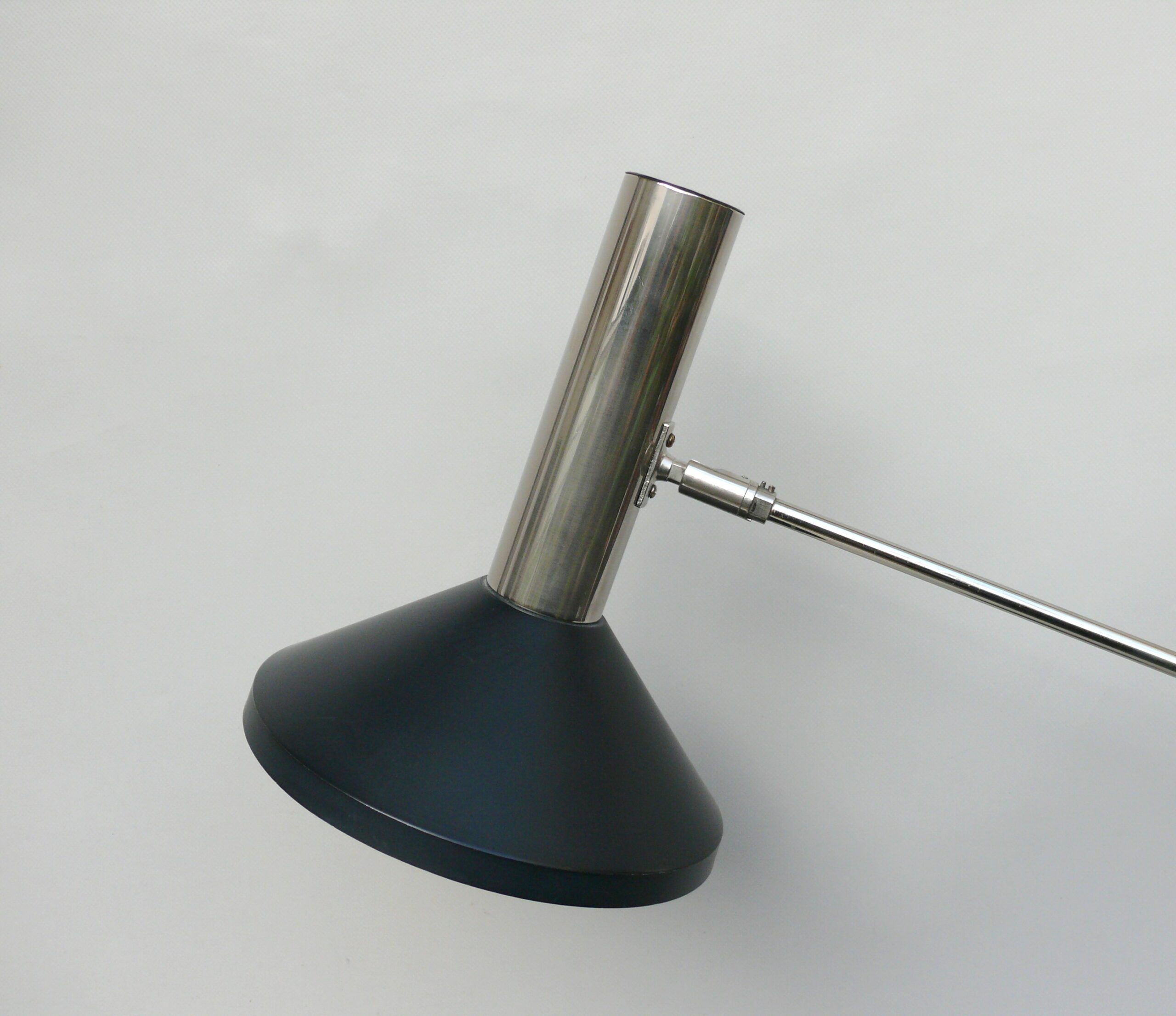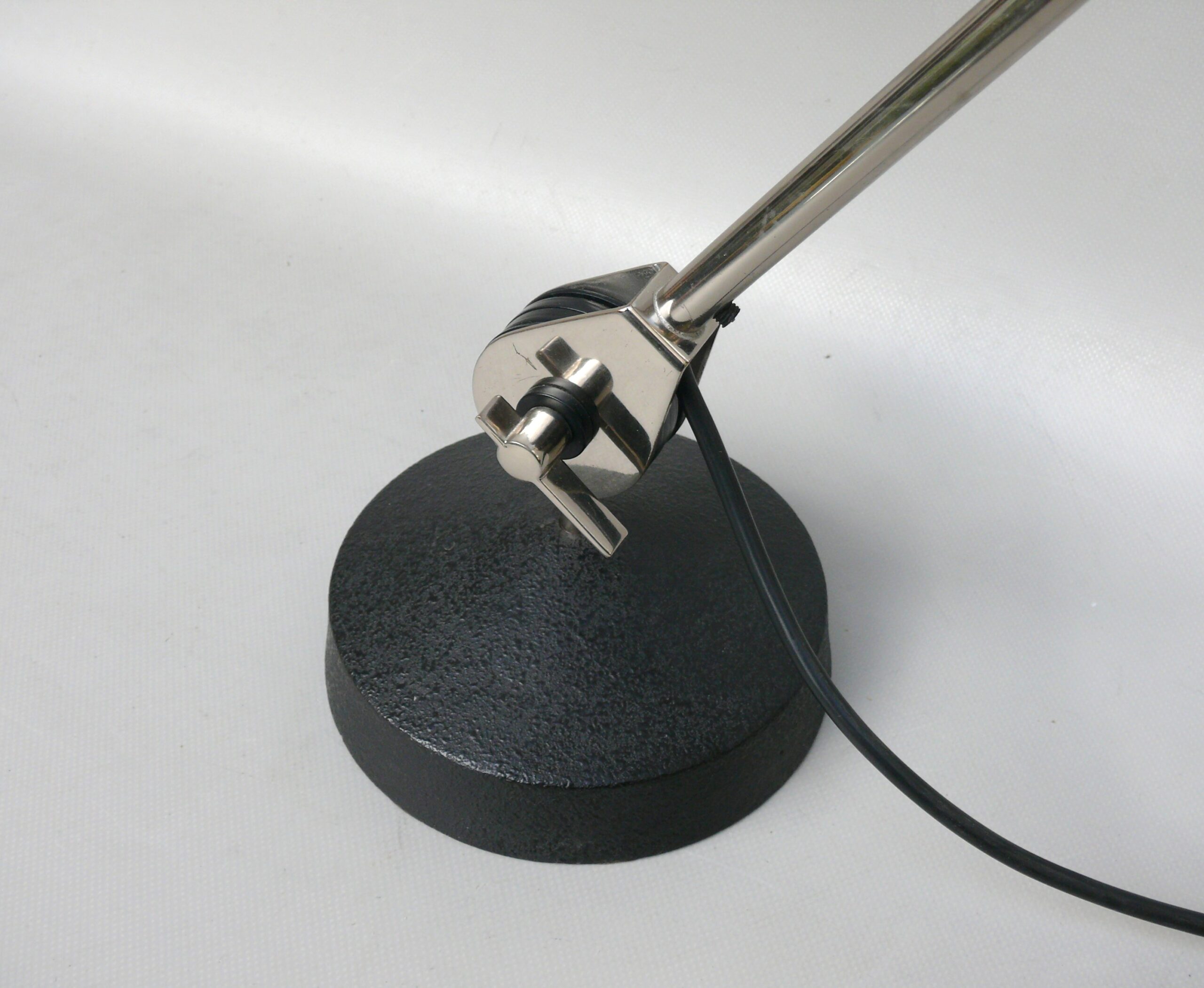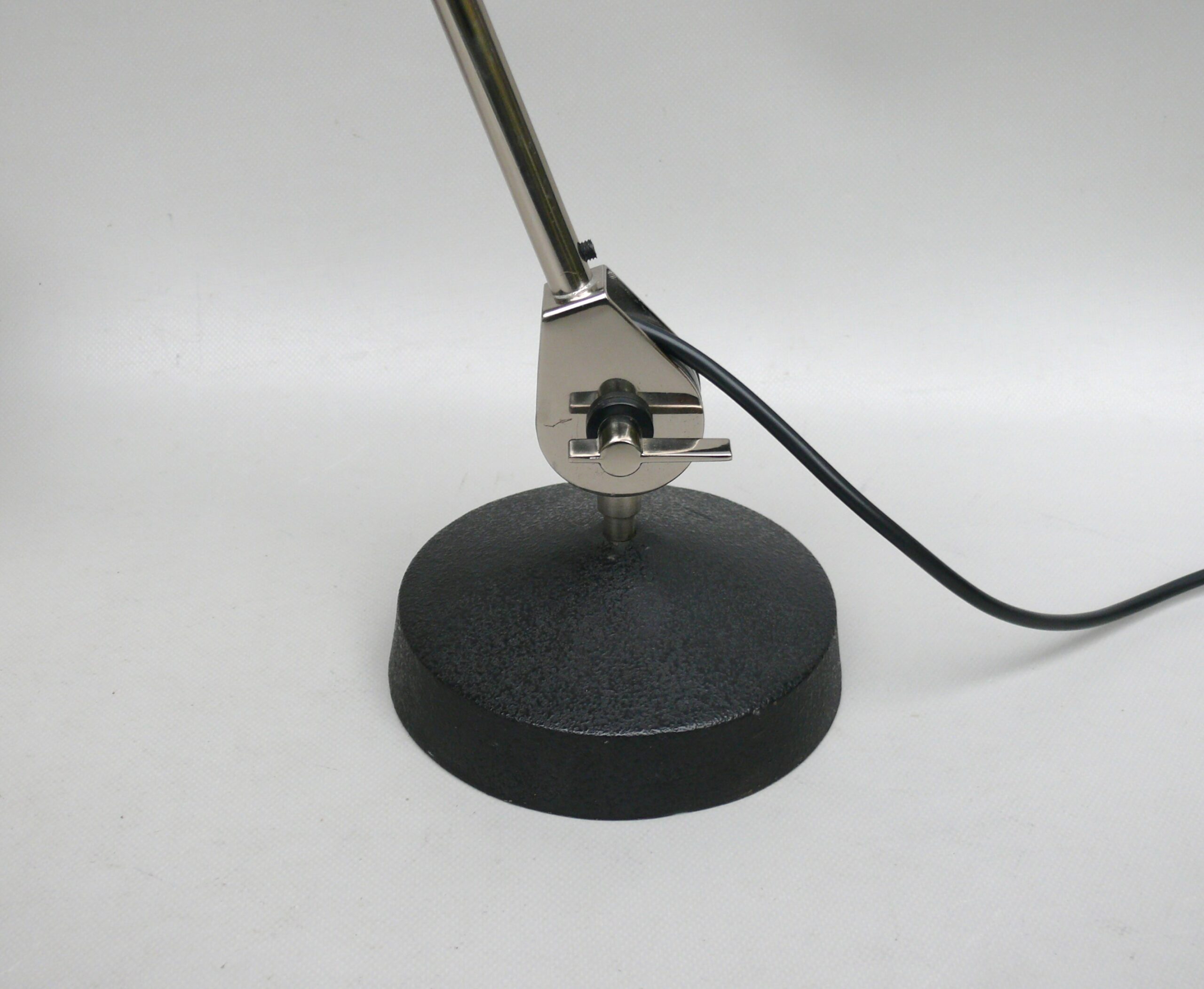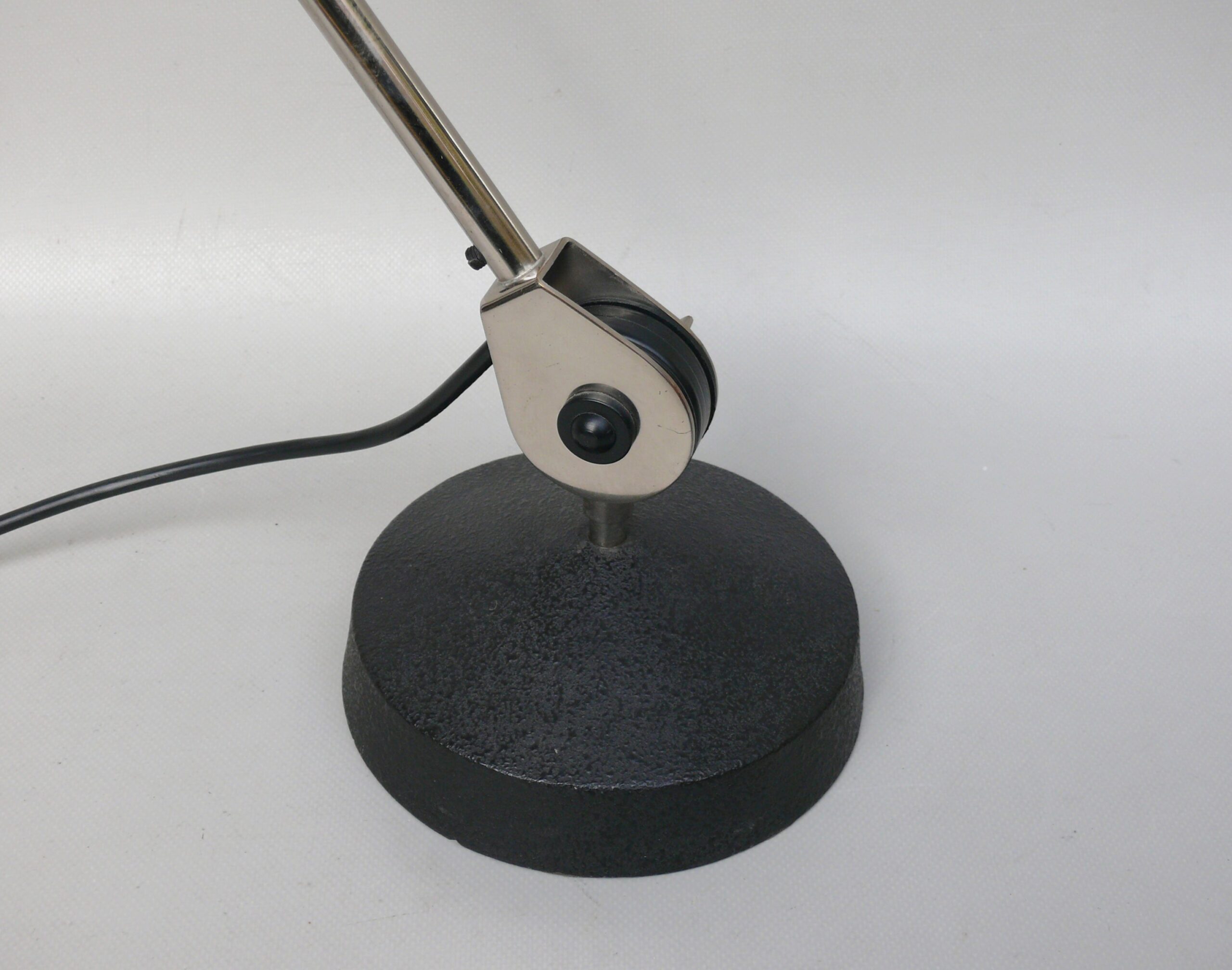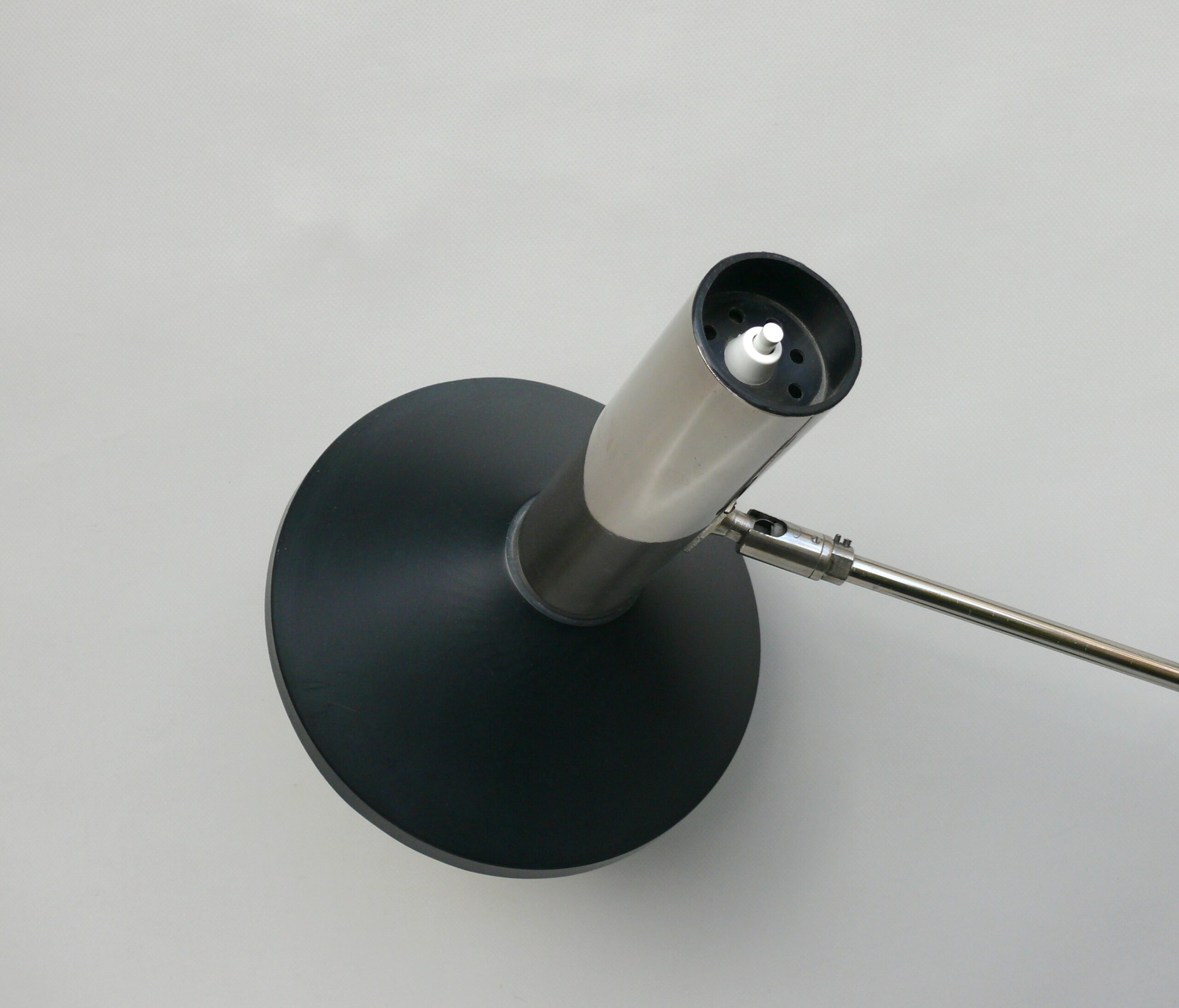 Der Lampenschirm läßt sich über einen Bajonett-Verschluß abnehmen. Der Griff am verchromten Lampenarm ist aus schwarz lackiertem Metall, der Schirm ist aus Aluminium. Die Farbe am Sockel ist schwarzer Schrumpflack.