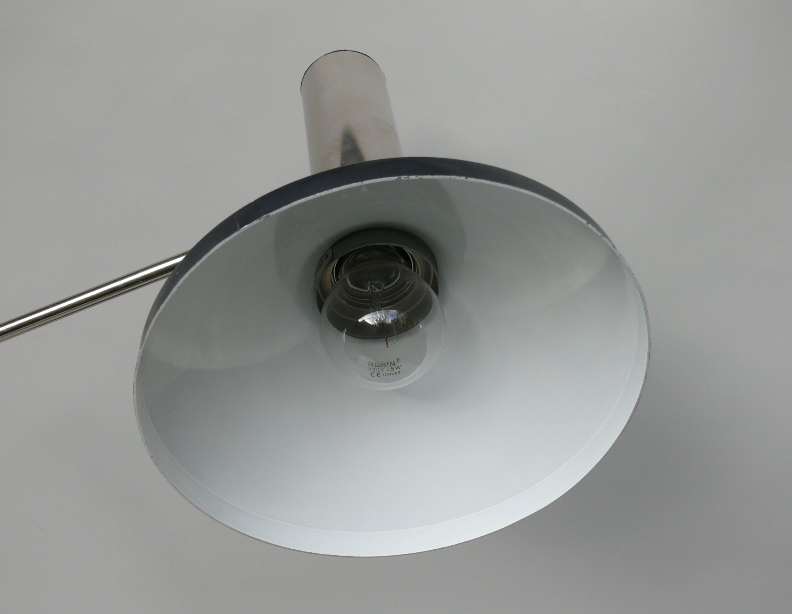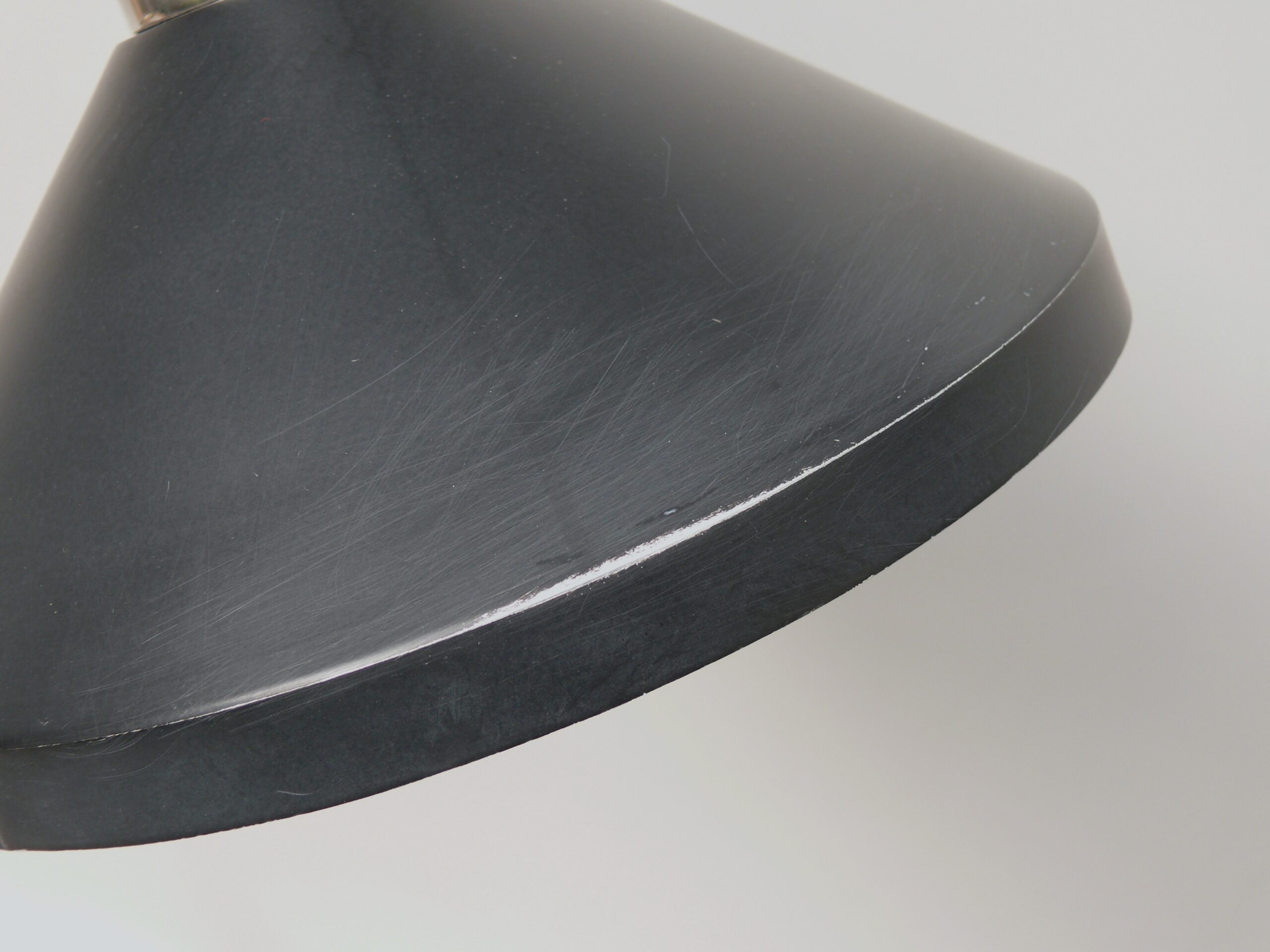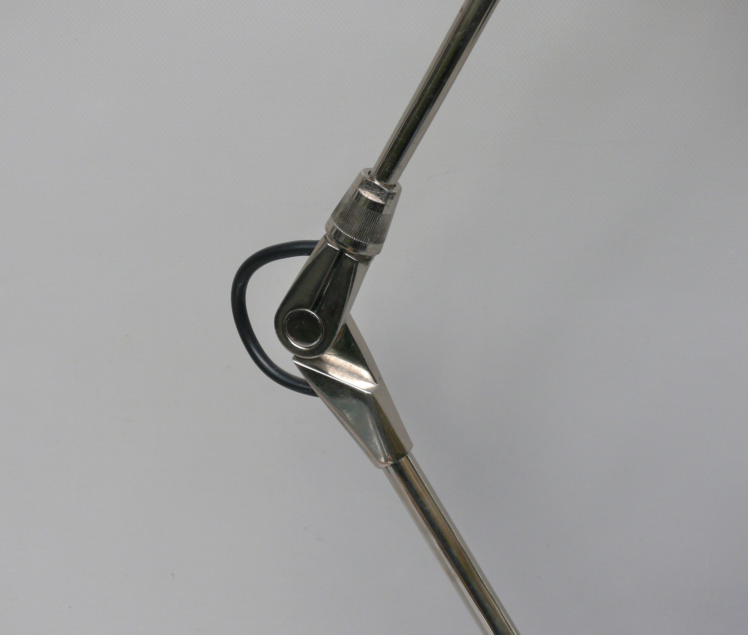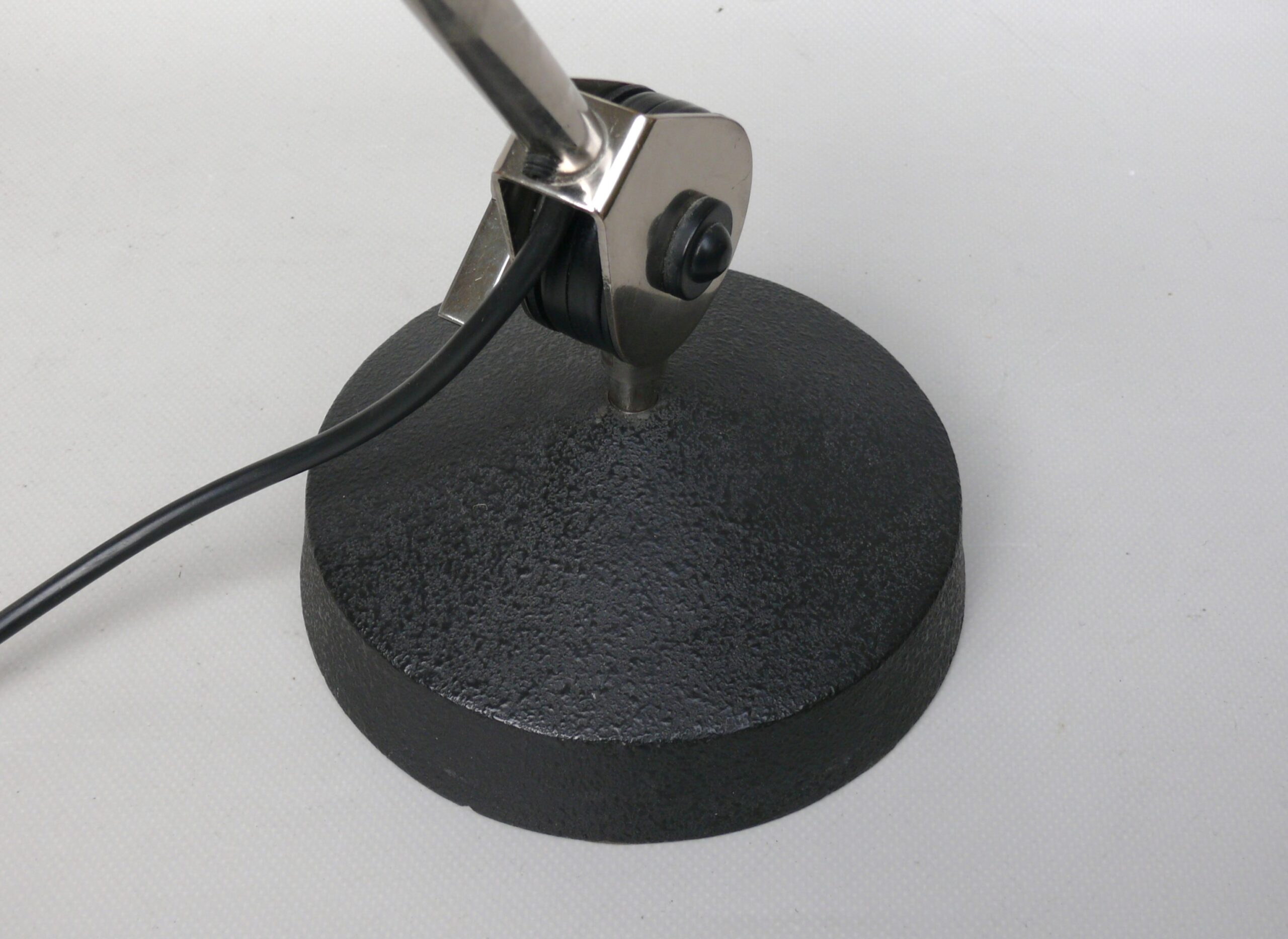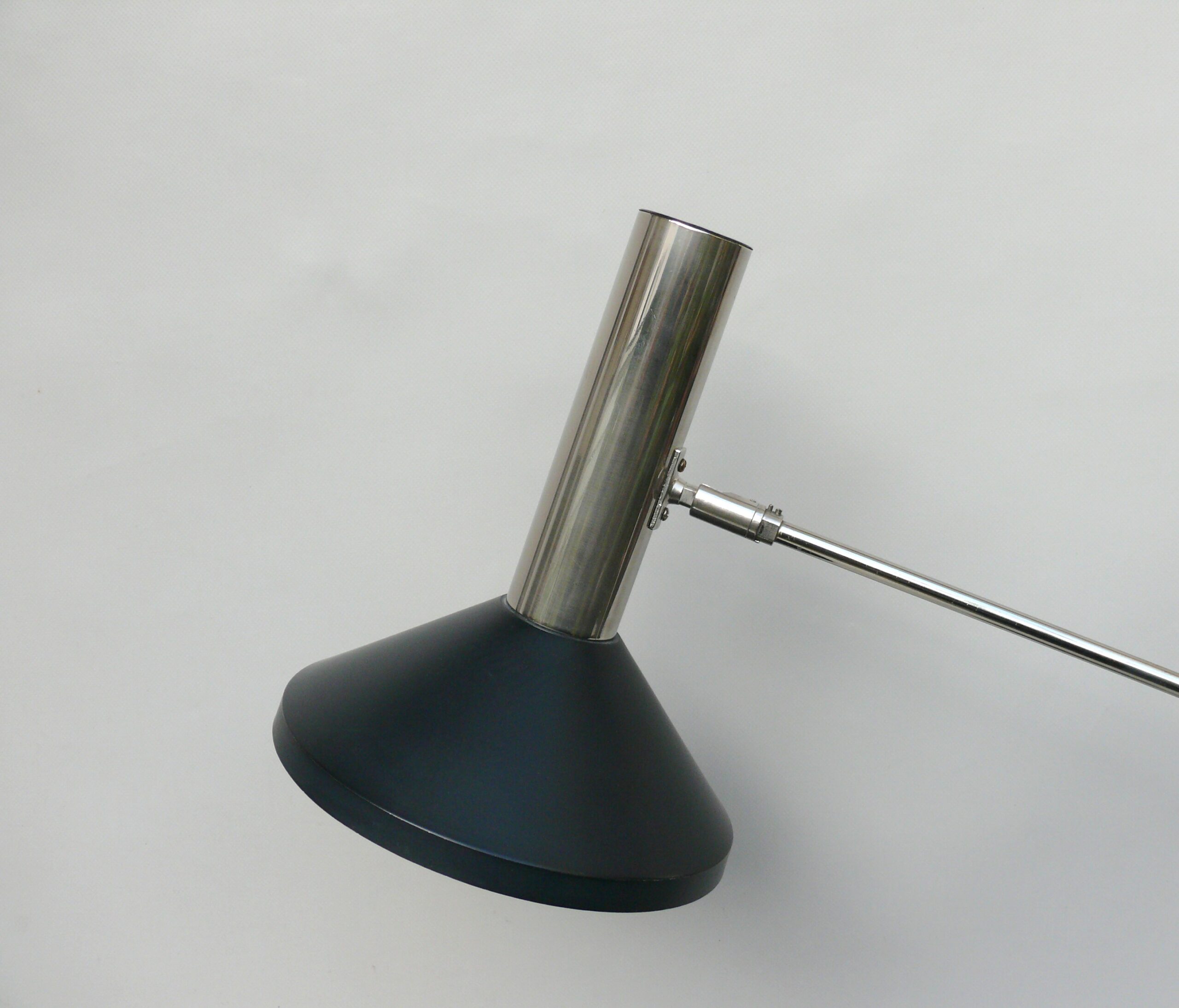 Der Lampenschirm läßt sich über einen Bajonett-Verschluß abnehmen. Der Griff am verchromten Lampenarm ist aus schwarz lackiertem Metall, der Schirm ist aus Aluminium. Die Farbe am Sockel ist schwarzer Schrumpflack.