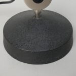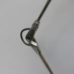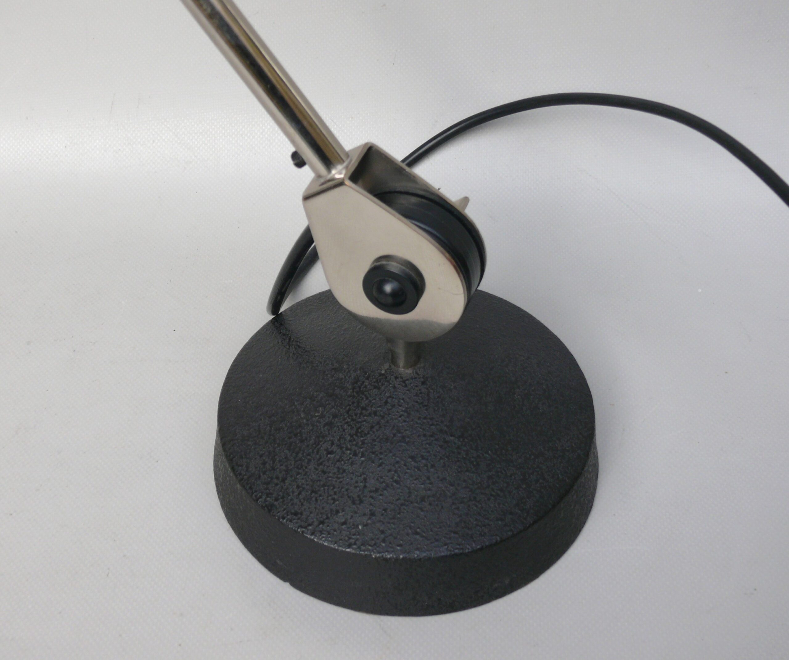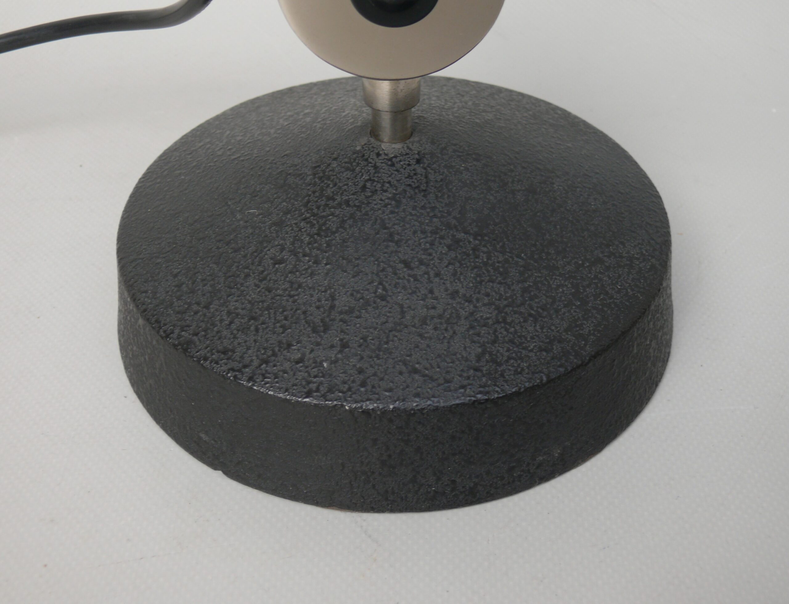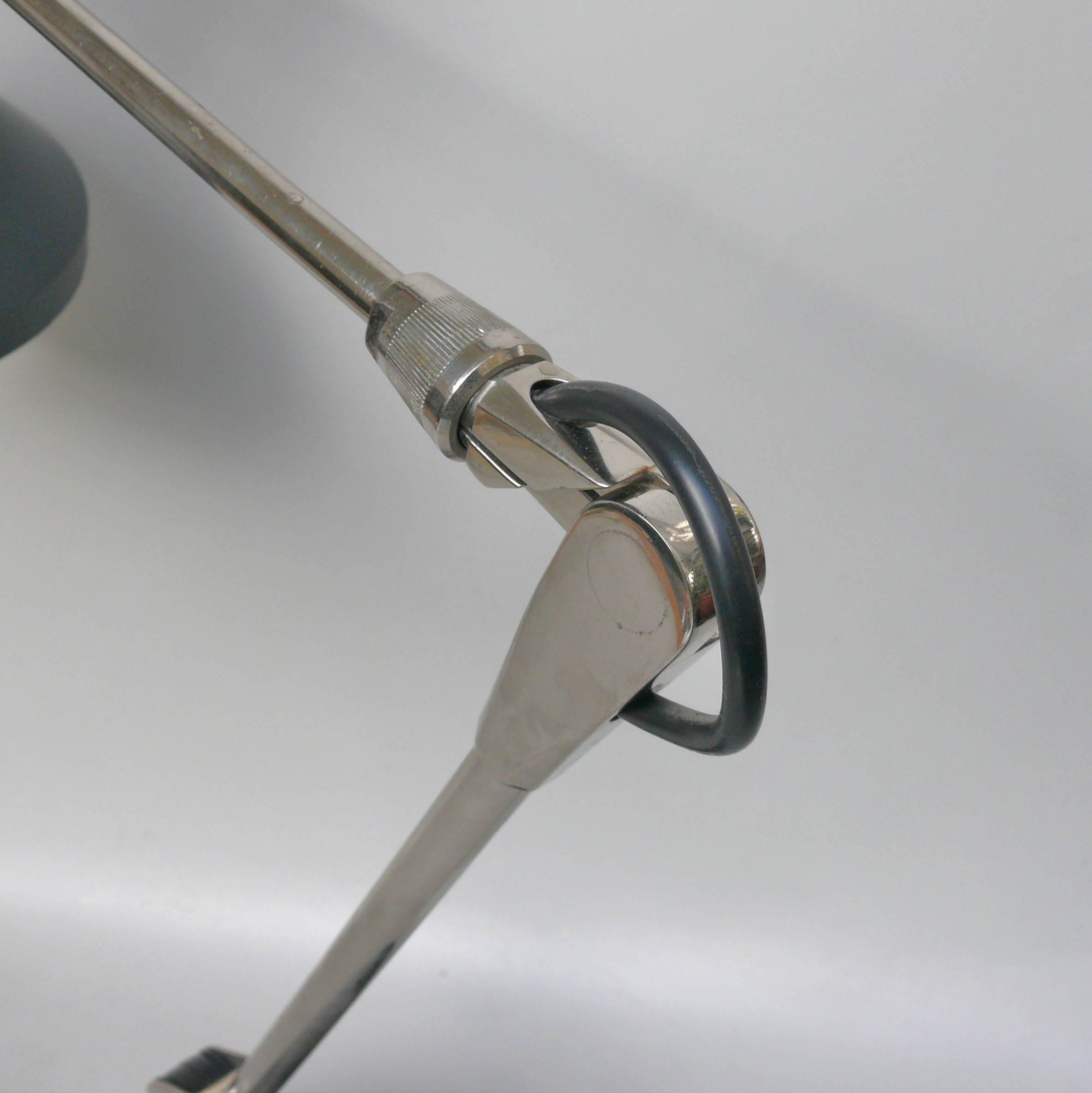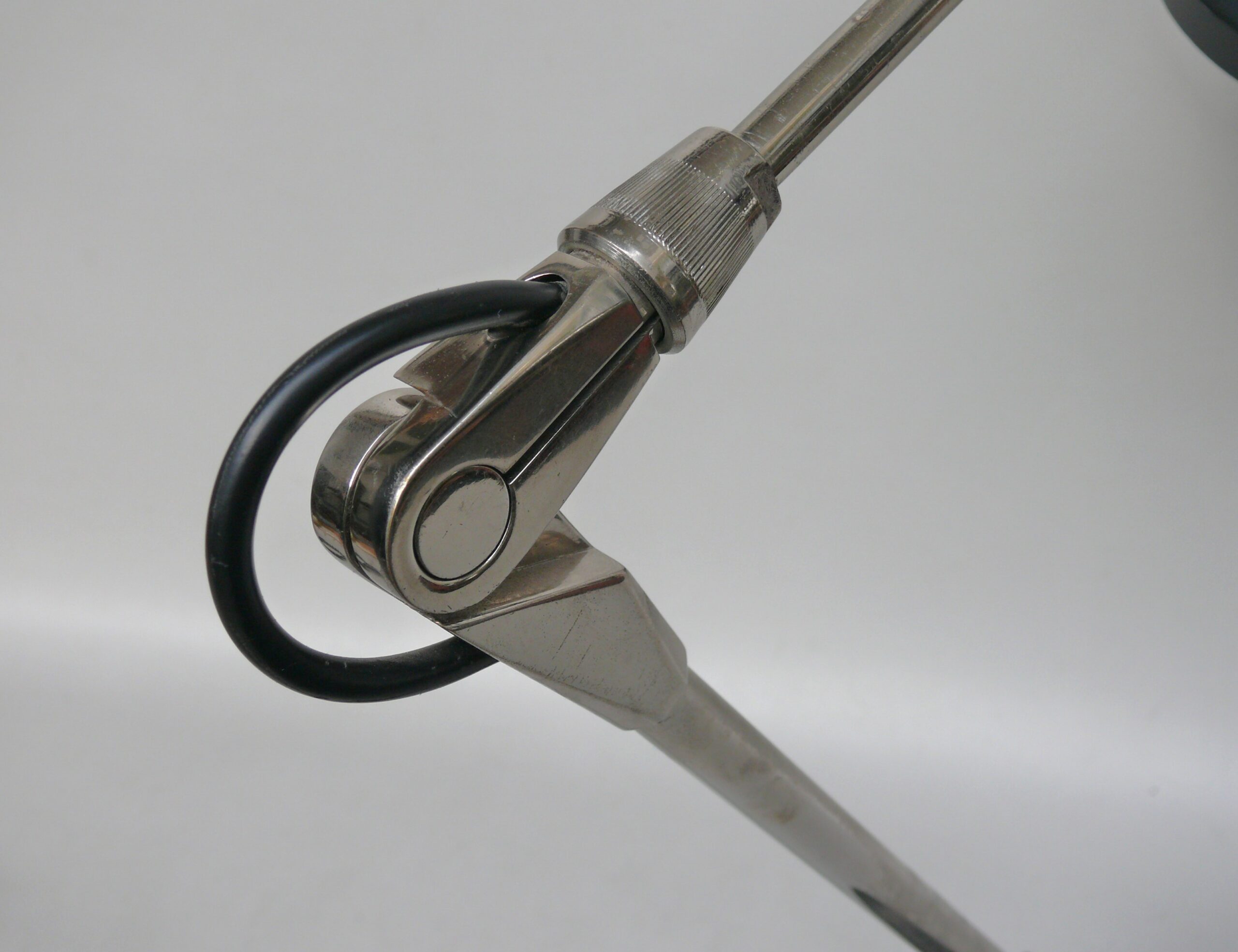Der Lampenschirm läßt sich über einen Bajonett-Verschluß abnehmen. Der Griff am verchromten Lampenarm ist aus schwarz lackiertem Metall, der Schirm ist aus Aluminium. Die Farbe am Sockel ist schwarzer Schrumpflack.