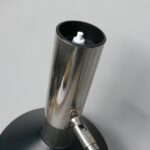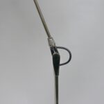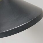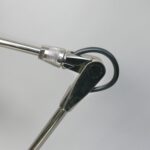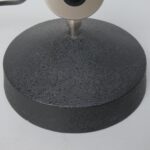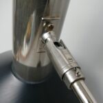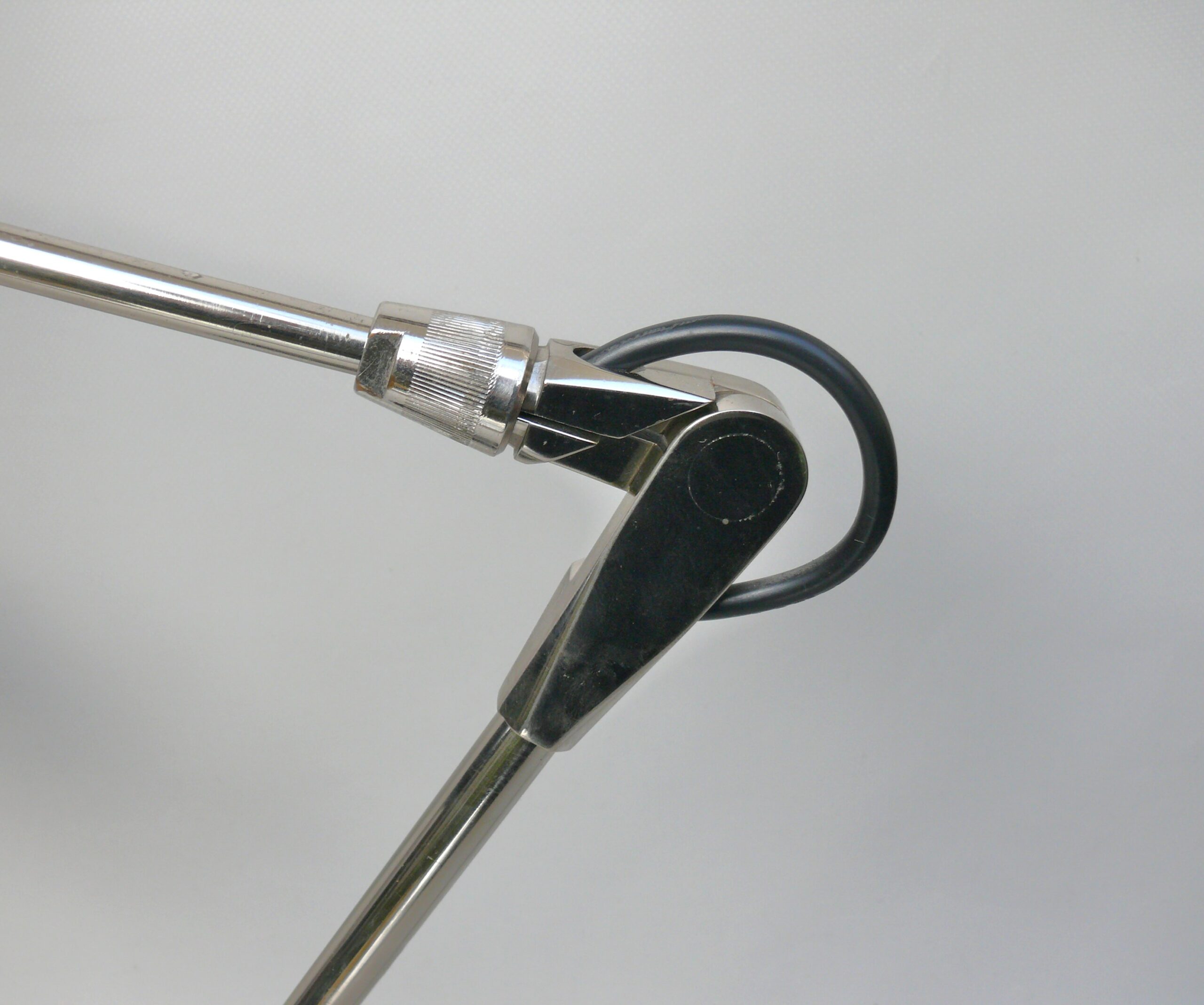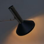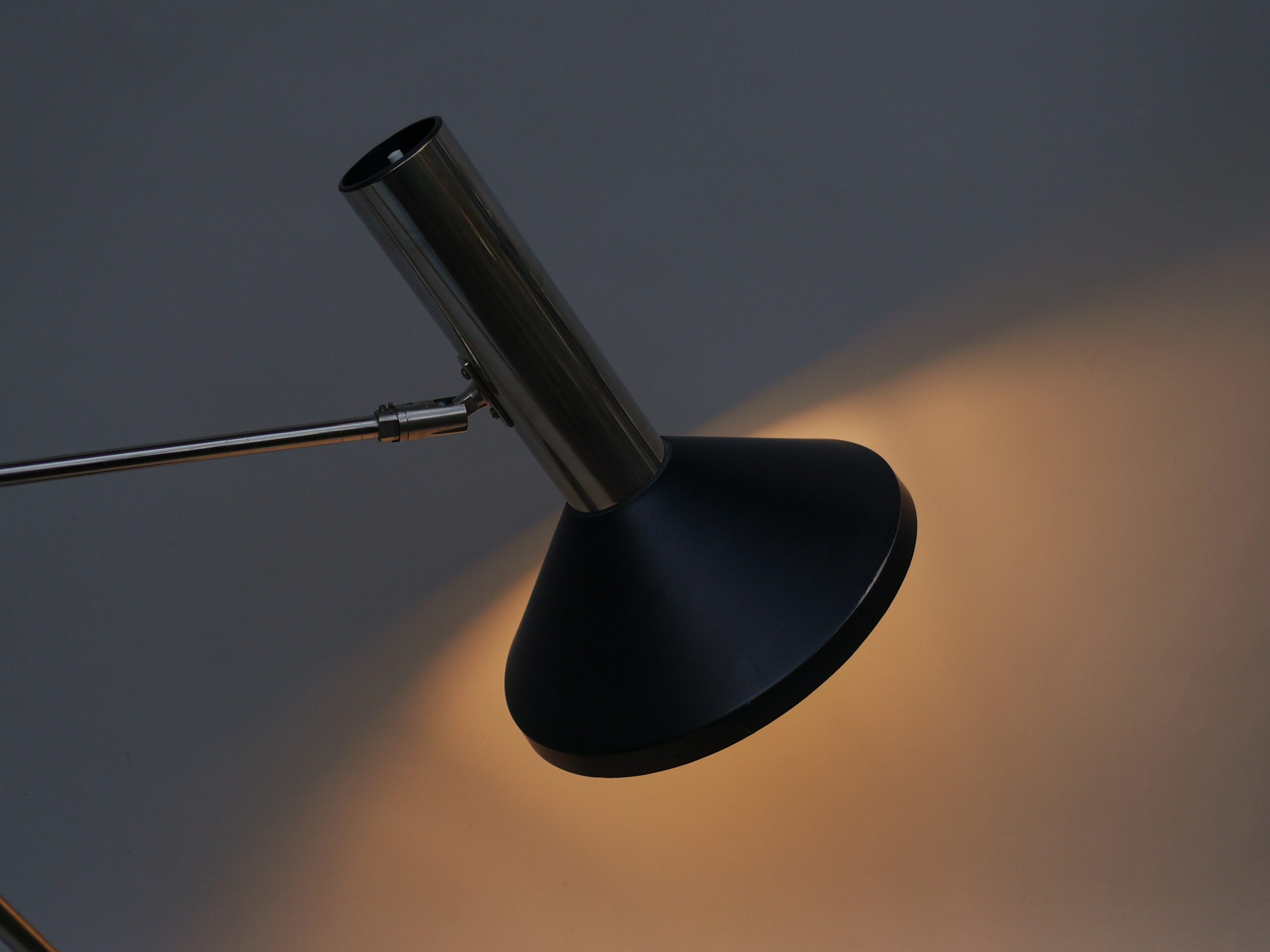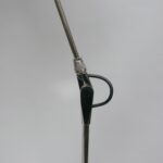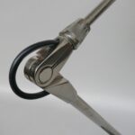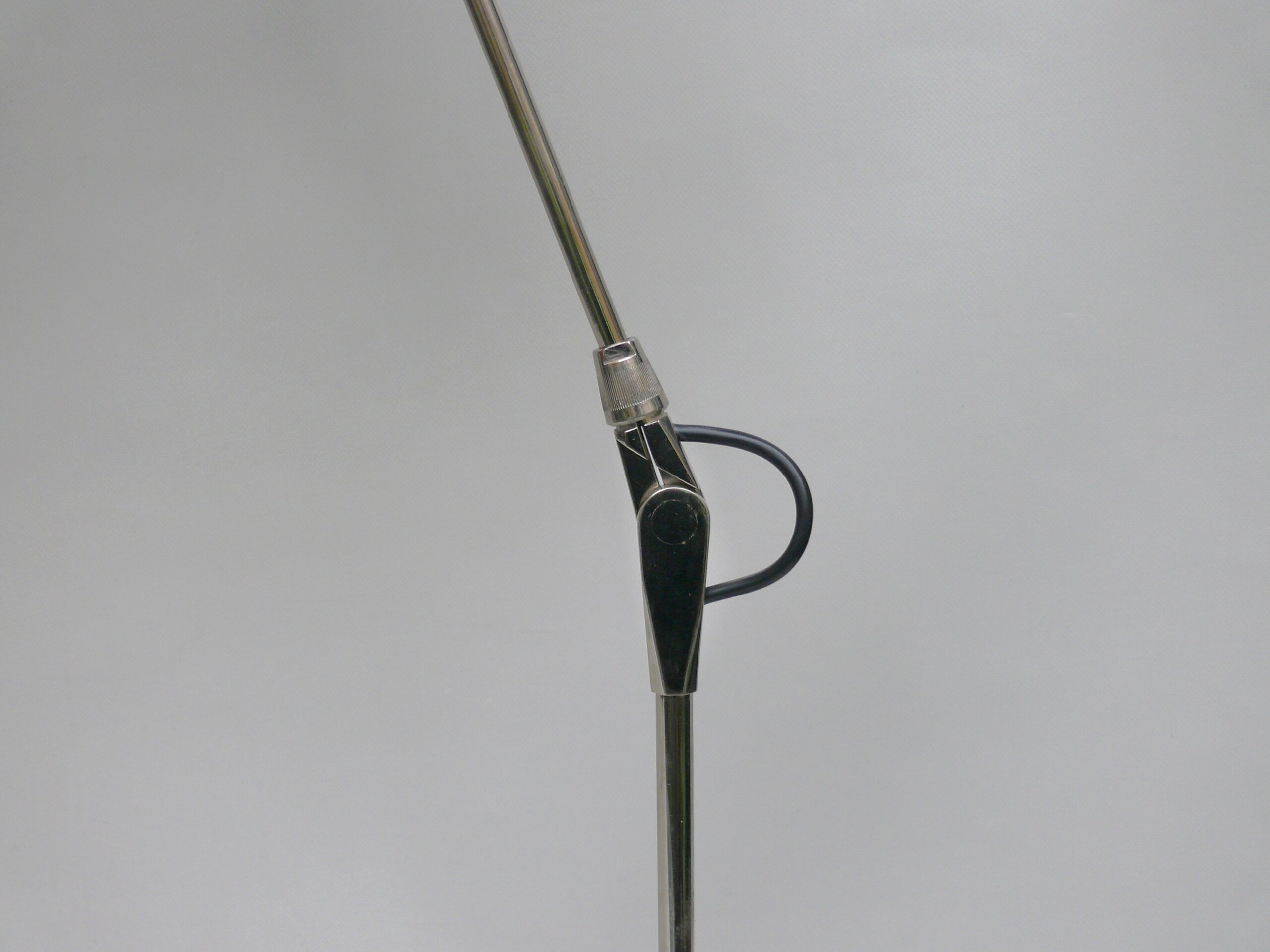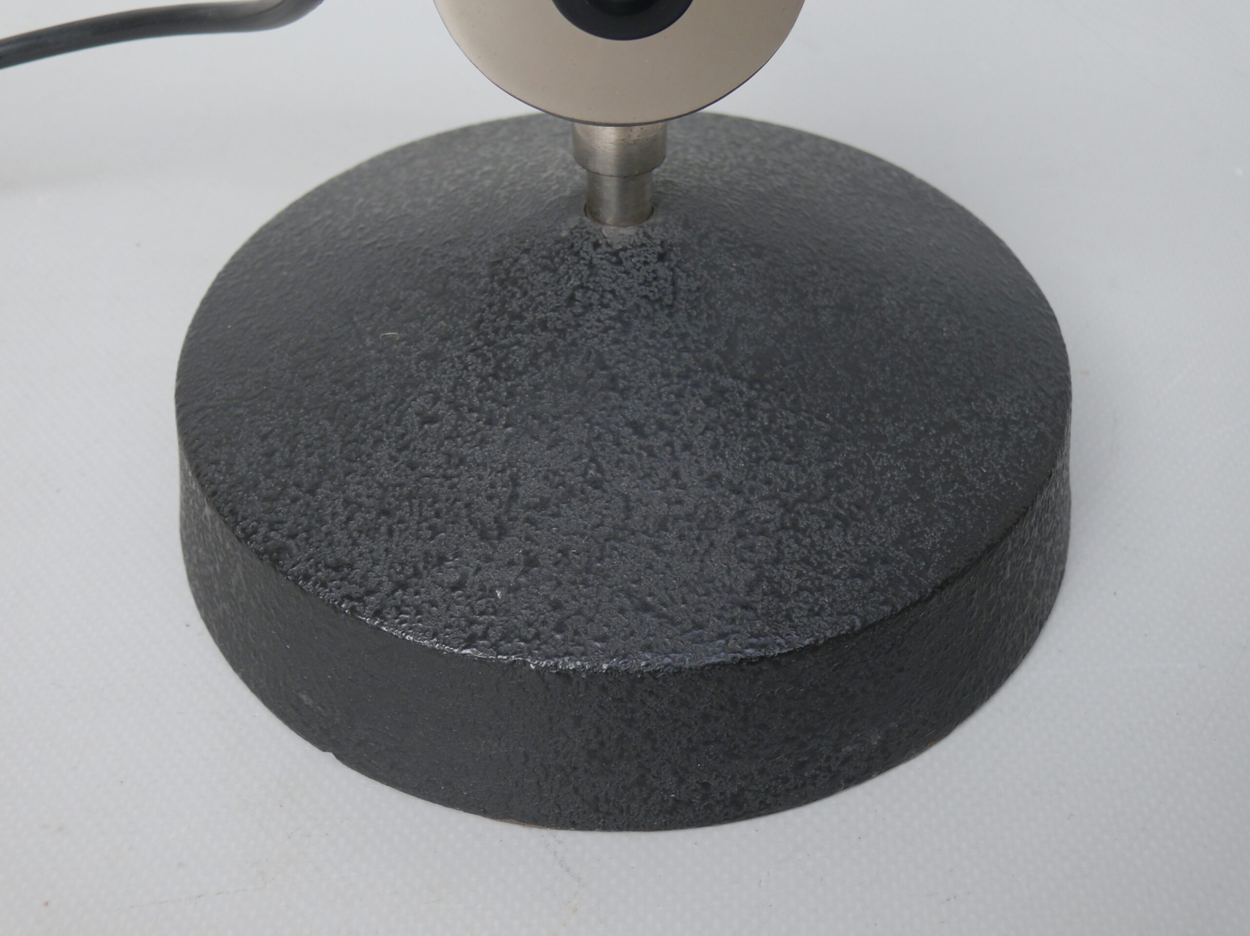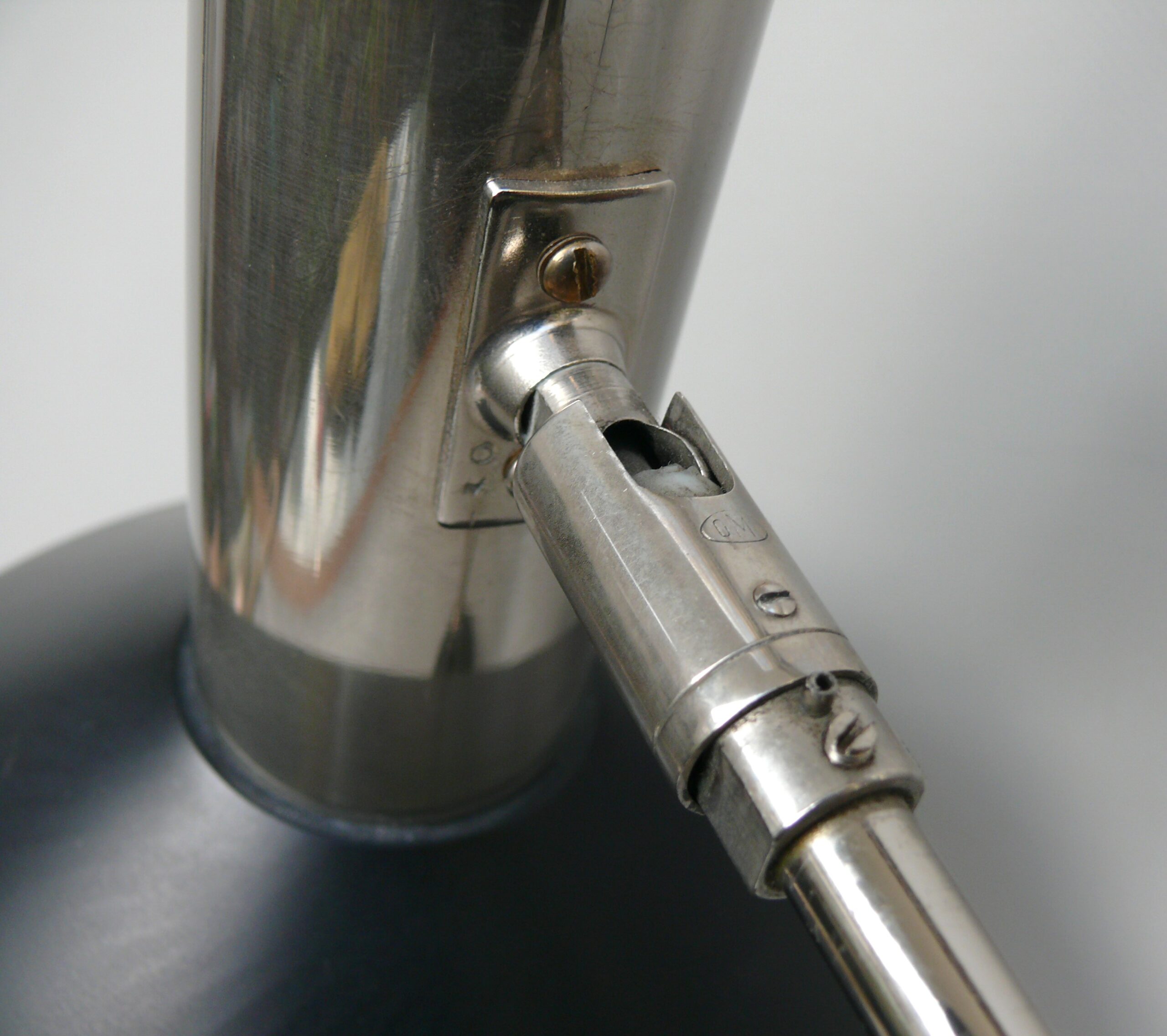 Der Lampenschirm läßt sich über einen Bajonett-Verschluß abnehmen. Der Griff am verchromten Lampenarm ist aus schwarz lackiertem Metall, der Schirm ist aus Aluminium. Die Farbe am Sockel ist schwarzer Schrumpflack.
