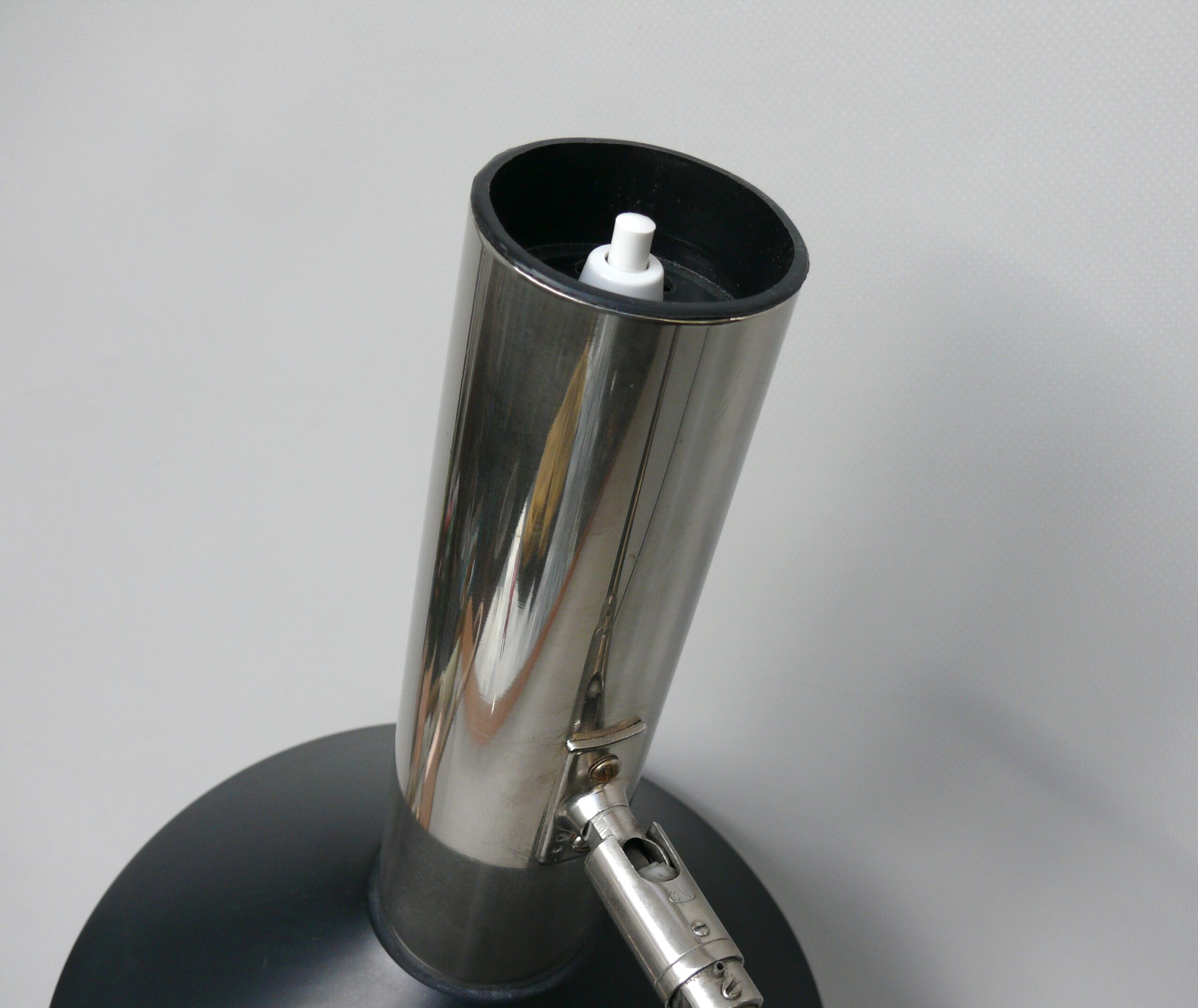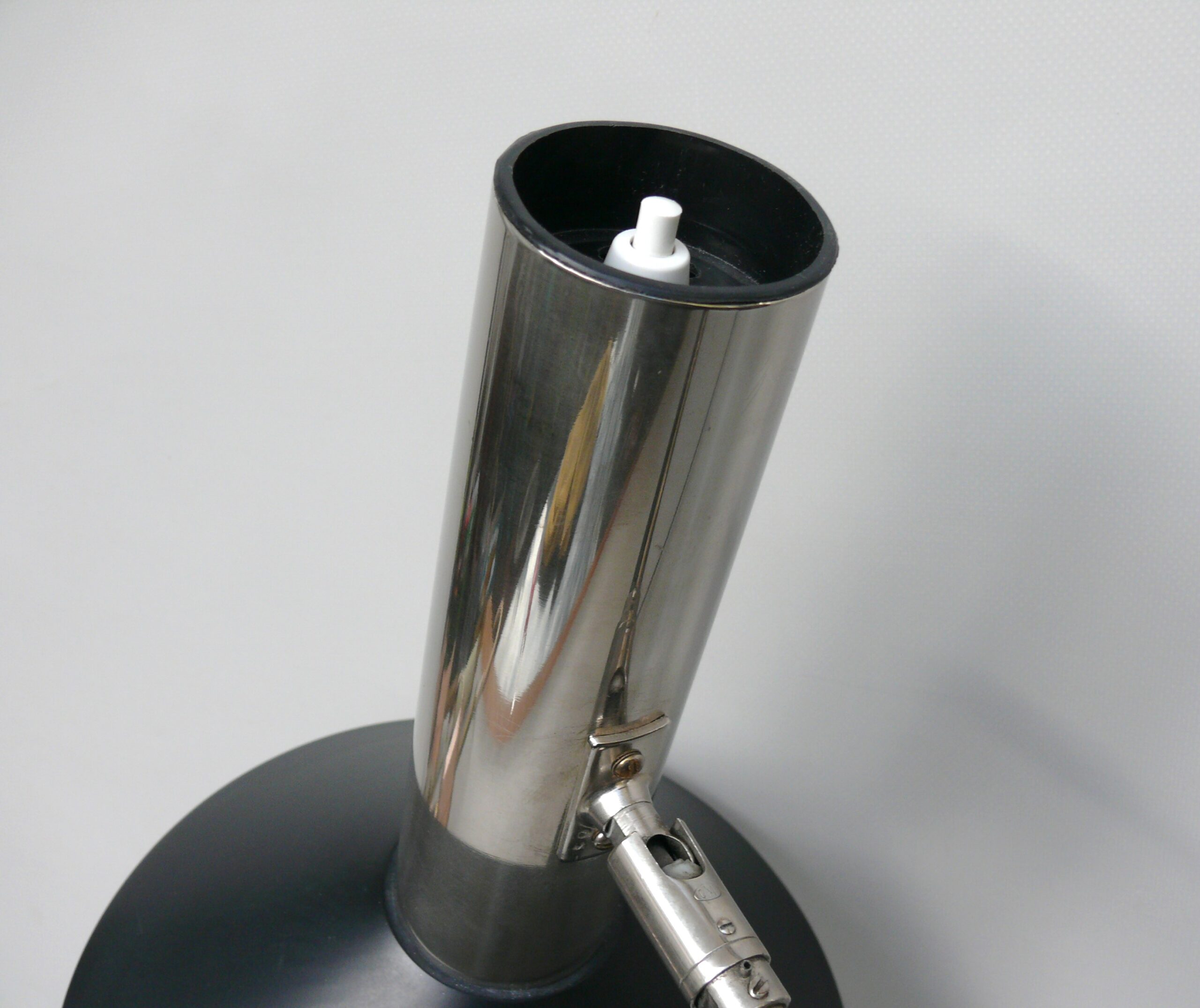 T93 – kleine Tischleuchte, Pilzleuchte,  60er Jahre, schwarz/verchromt