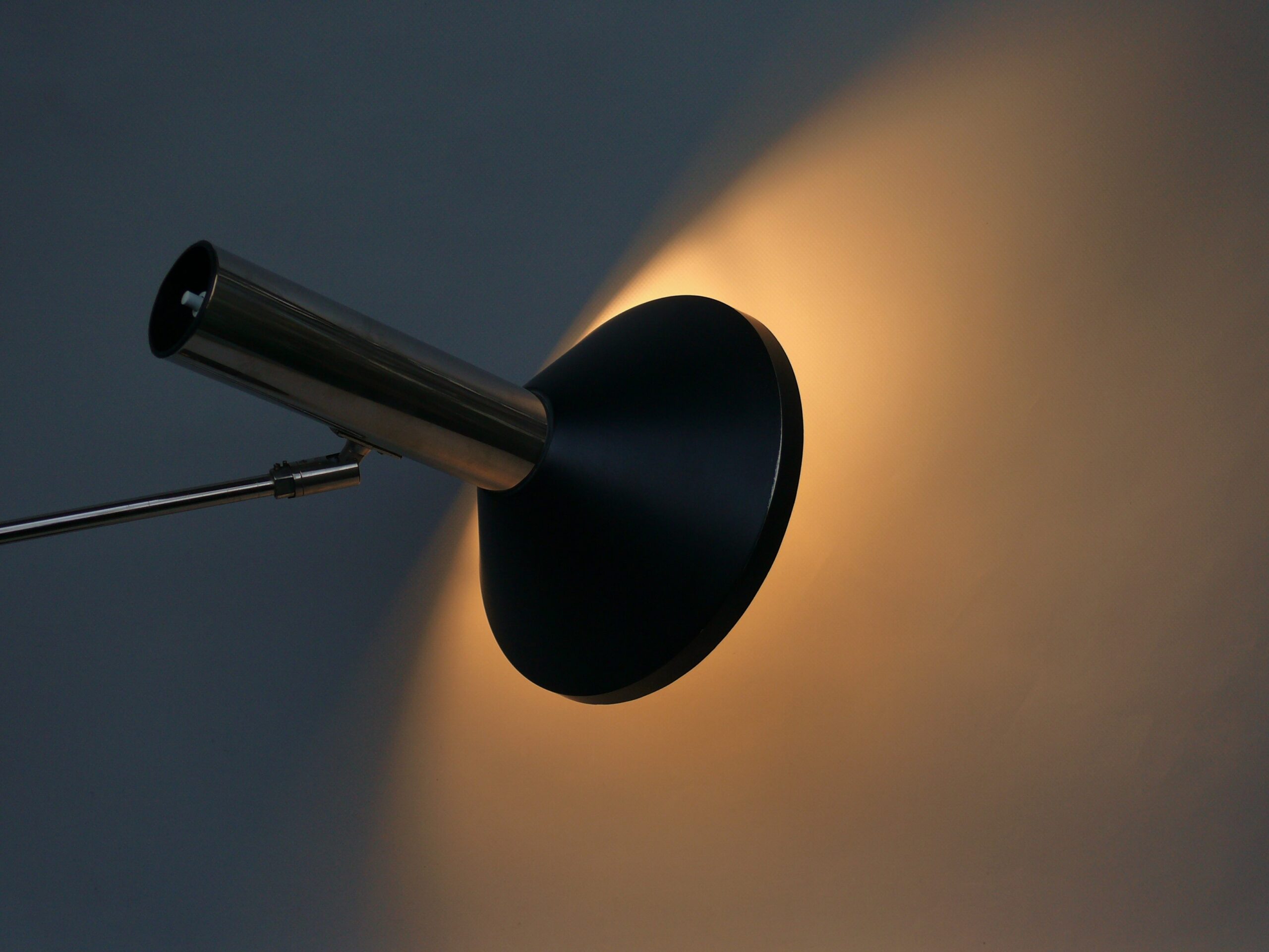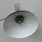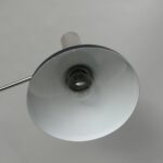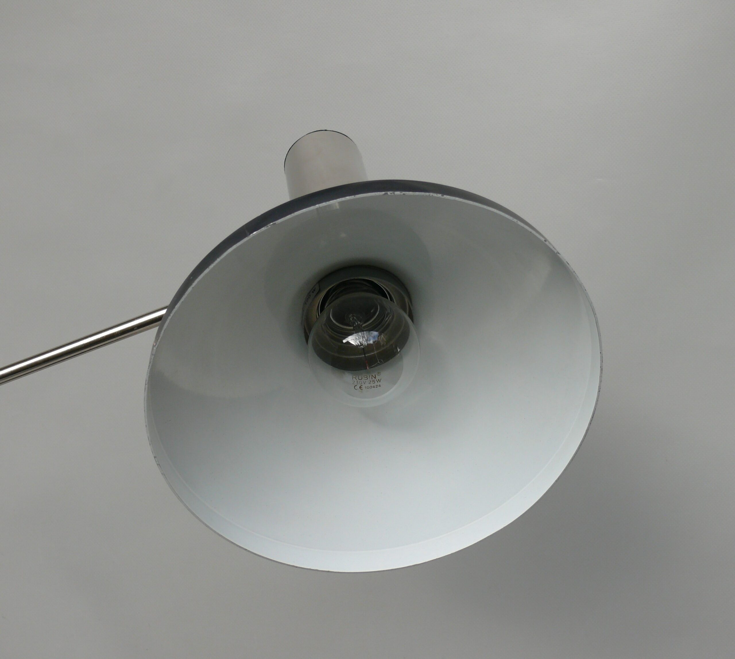 Der Chrom des Lampenarmes ist schön erhalten. Wahrscheinlich wurde die Leuchte früher einmal neu lackiert. Am Lampenschirm sind am Rand an einer Stelle von 5 cm Druckstellen vorhanden.