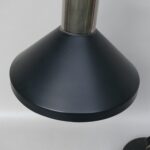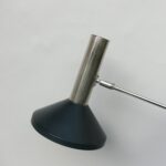 Lampenfuß und Schirm im Originallack dunkelgrau, Gebrauchsspuren am Schirm – siehe Fotos. Schaft konisch, verchromt