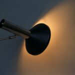 Die Leuchte hat eine ausgefallene Mechanik, die an die Leuchten von Baltensweiler und Knoll International – Clay Michie erinnert: