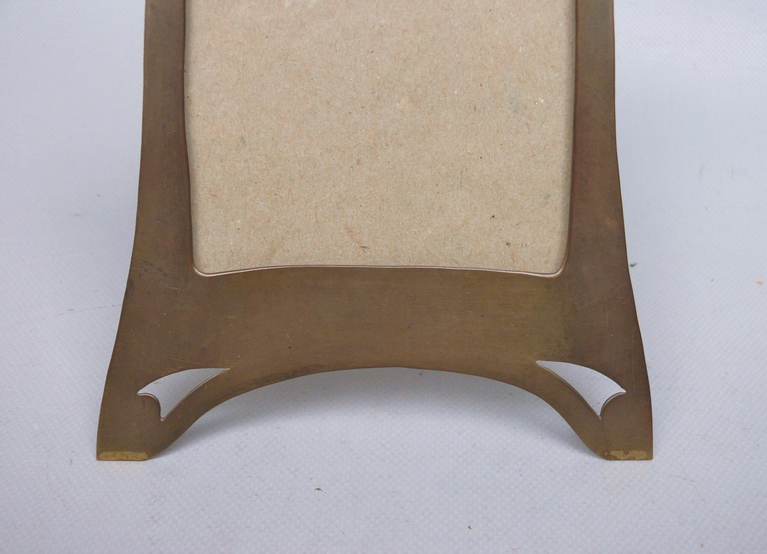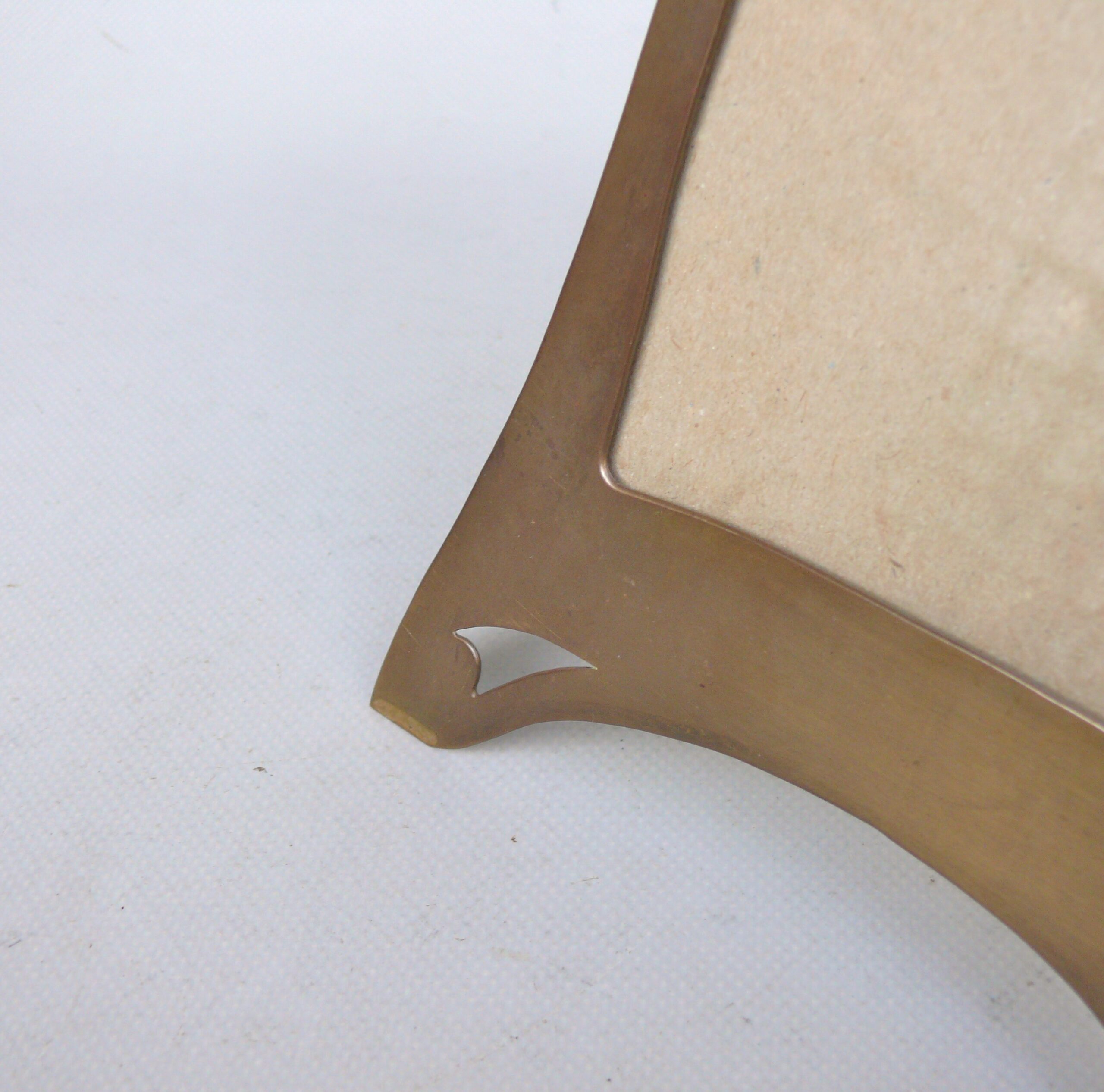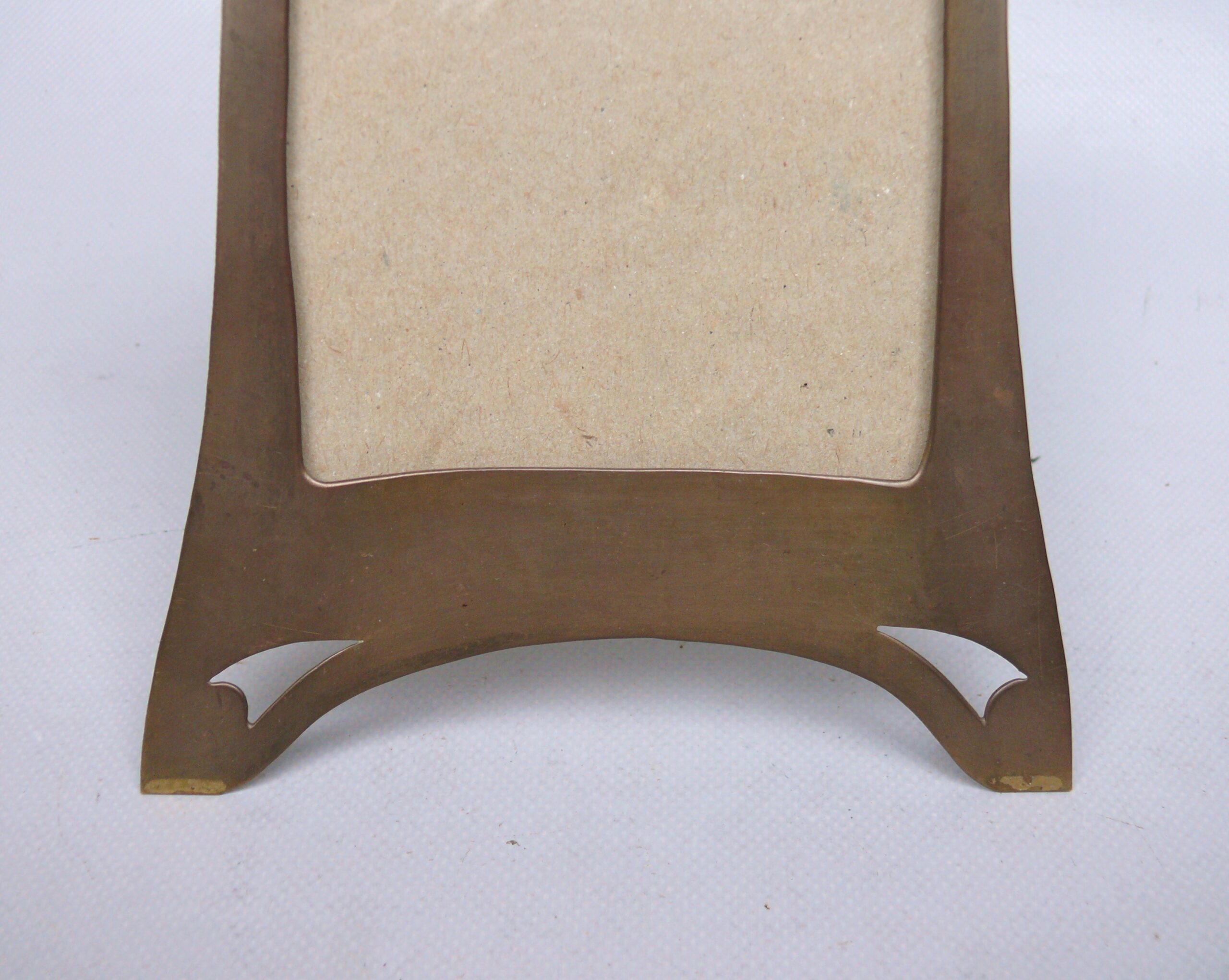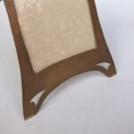 Der Bilderrahmen ist qualitativ hochwertig gefertig. Er wurde hergestellt in Handarbeit – Messing ziseliert. Die Front zeigt ein Hammerschlagdekor in Kombination mit Silelementen des Jugendstil. Das Hammerschlagdekor wurde genutzt, um die Oberfläche zu beleben und signalisiert zugleich eine handwerkliche Ausführung.
