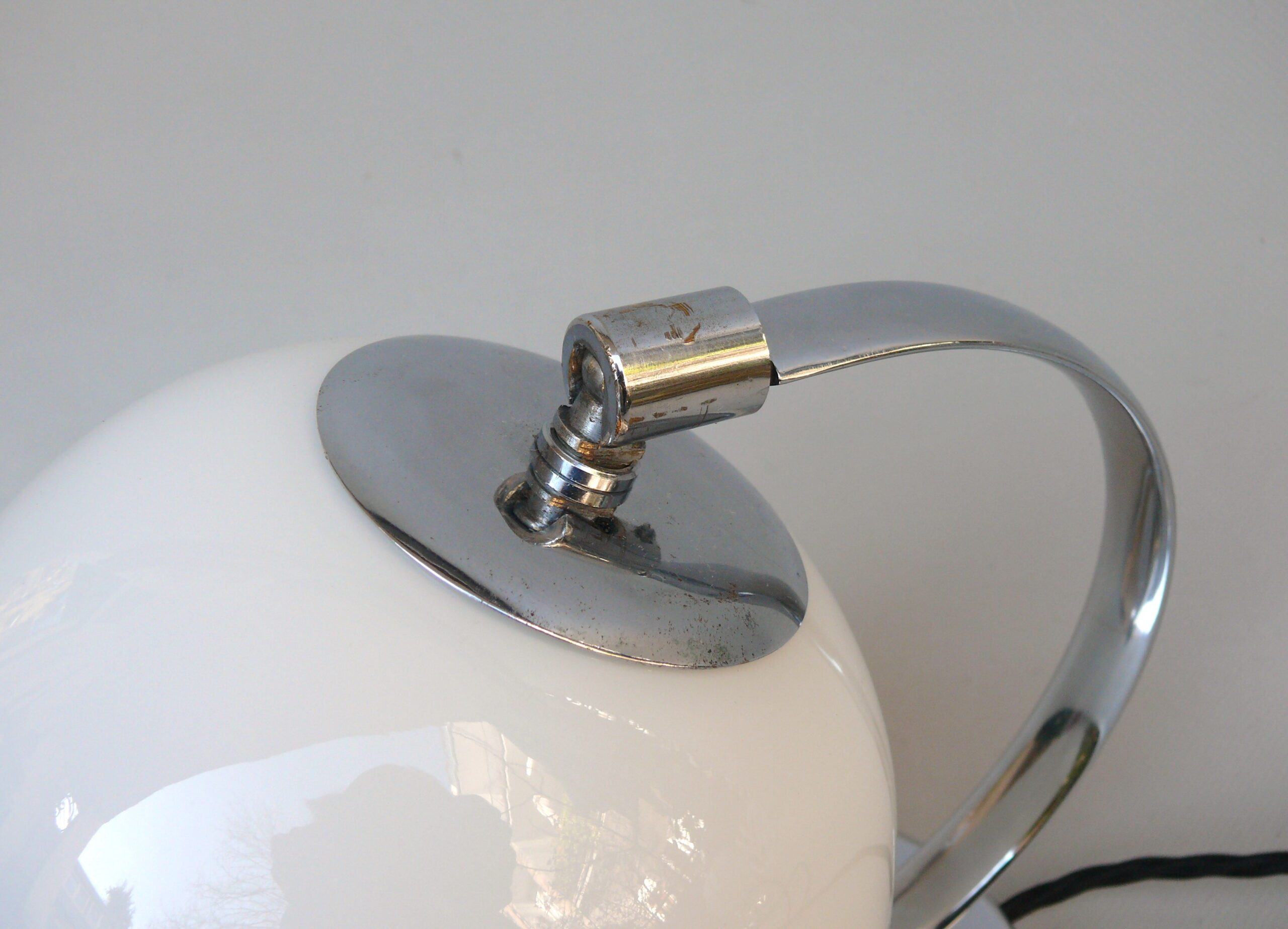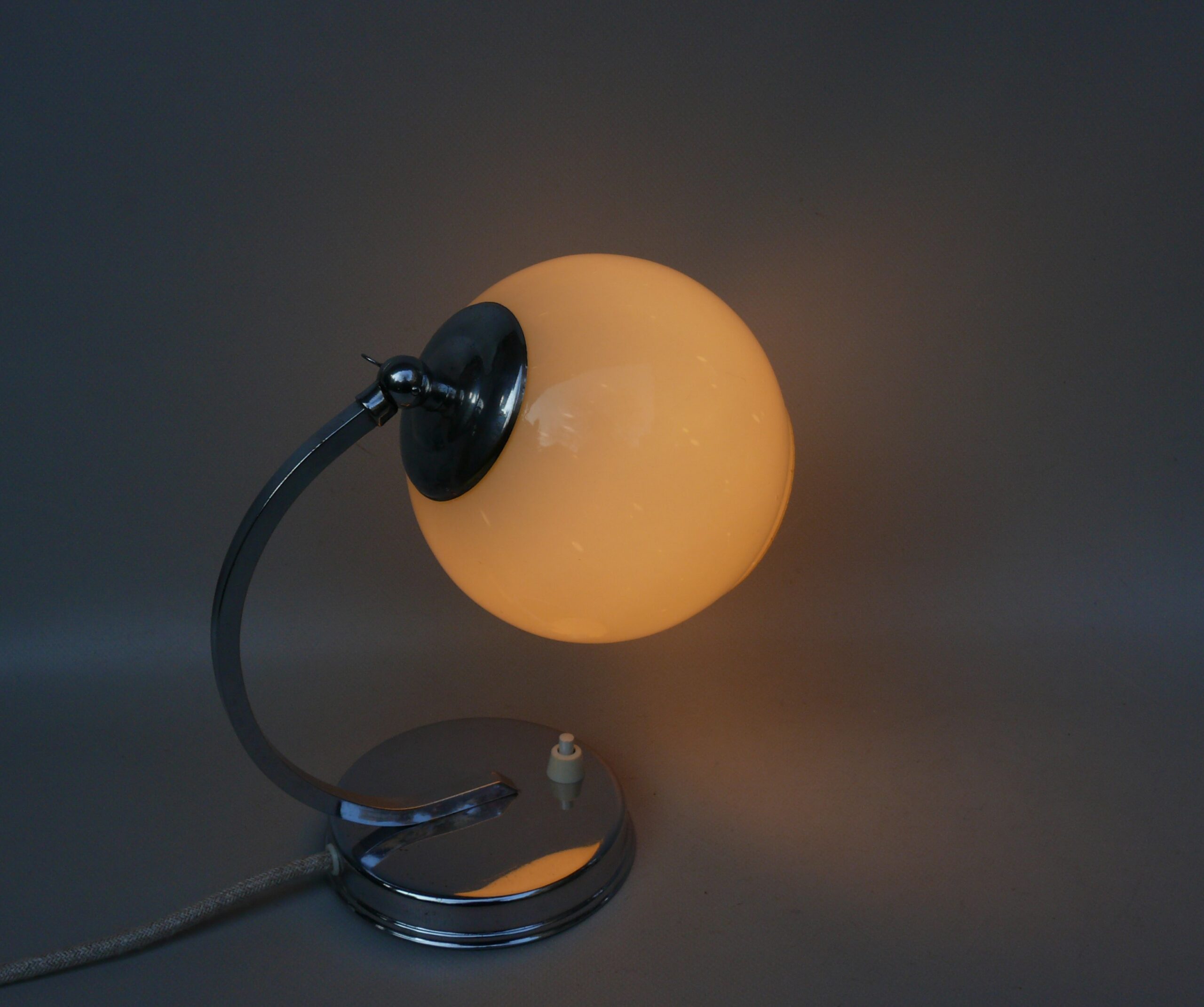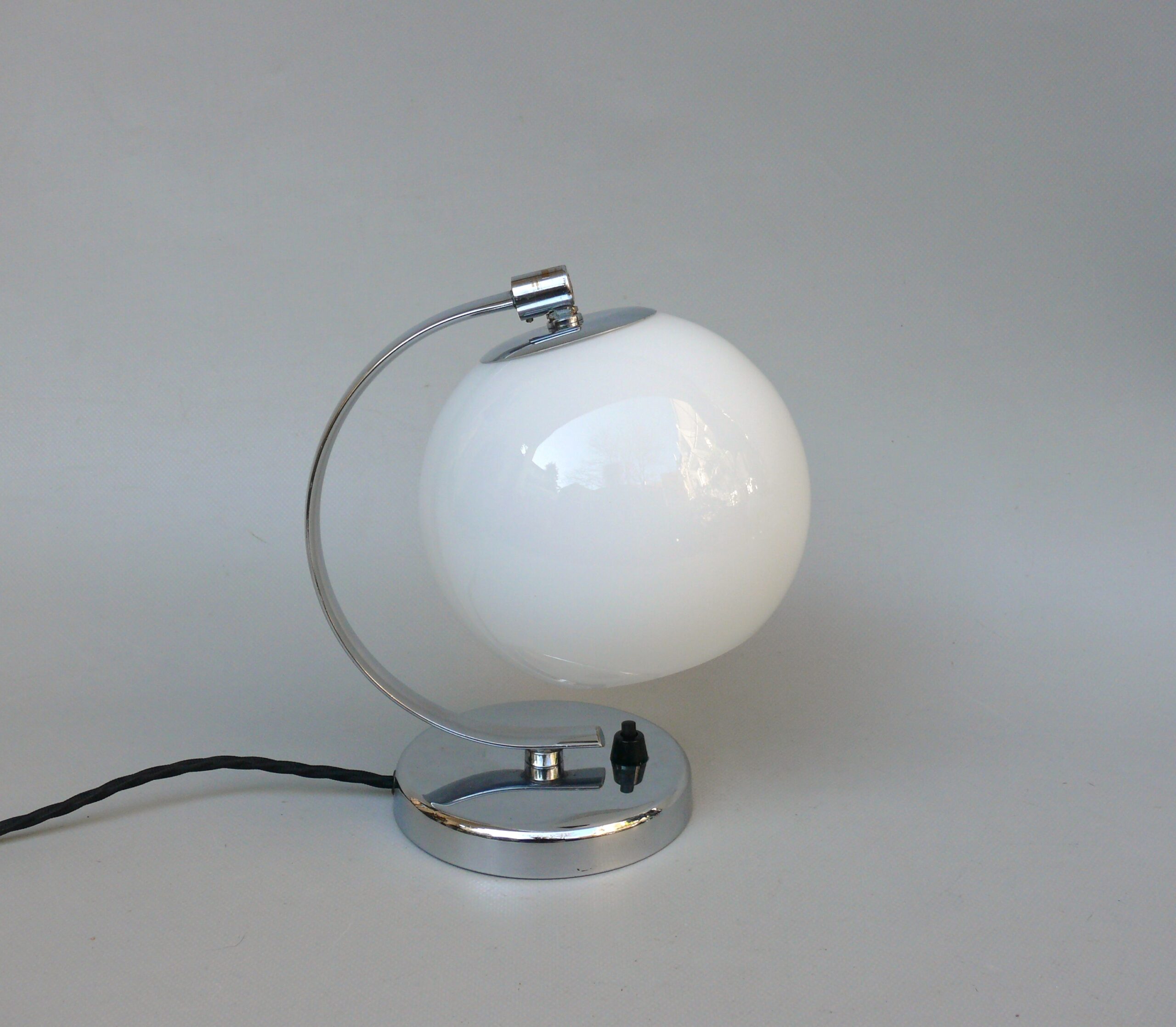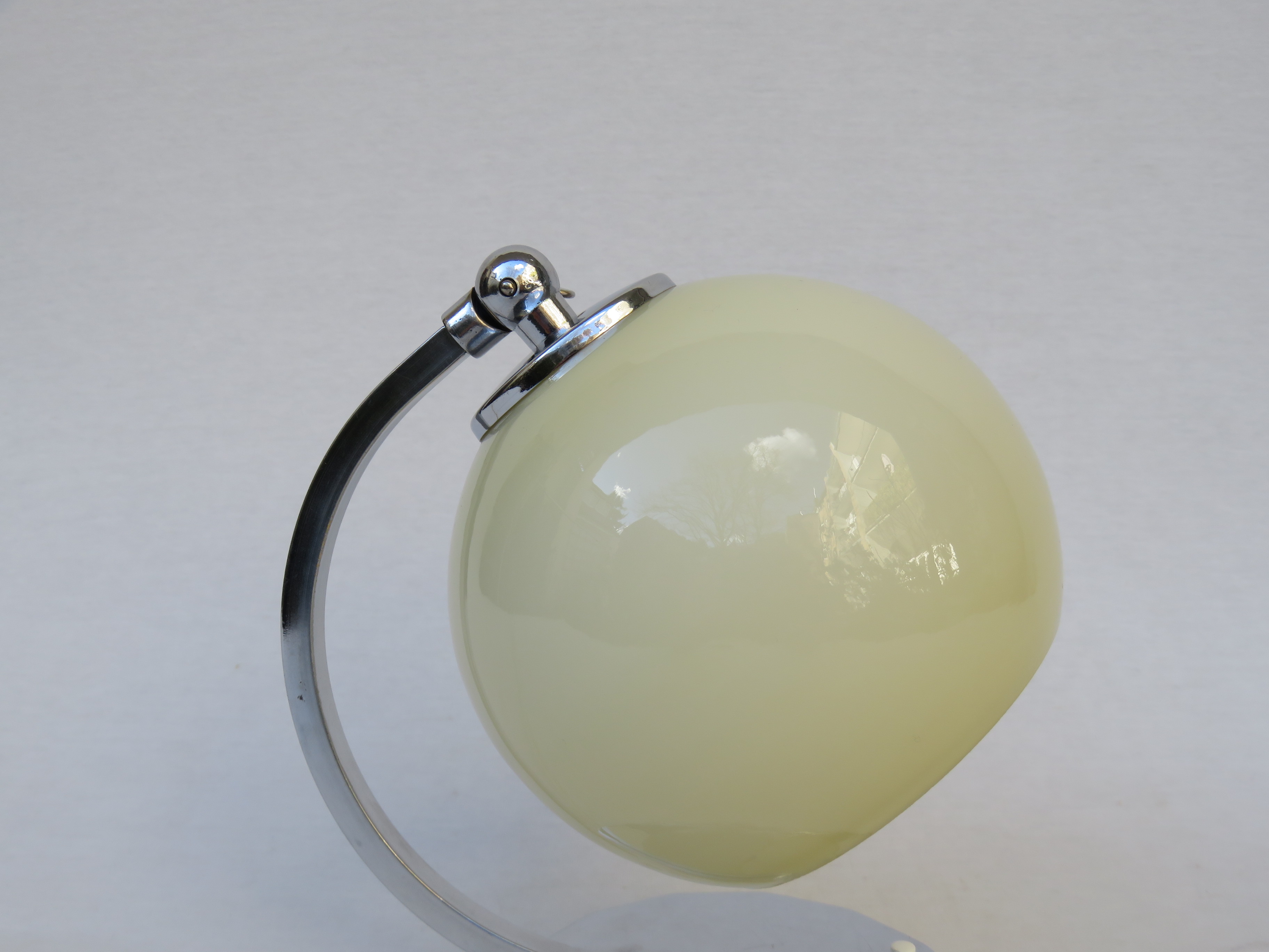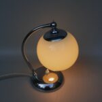 N7 – Nachttischleuchte, Art Deco, verchromt, seltener weißer Überfangglasschirm, Österreich