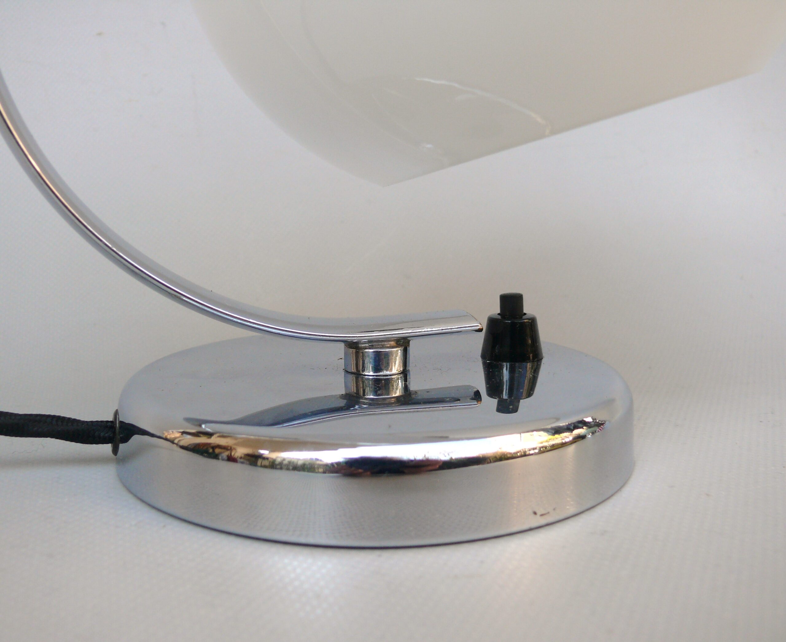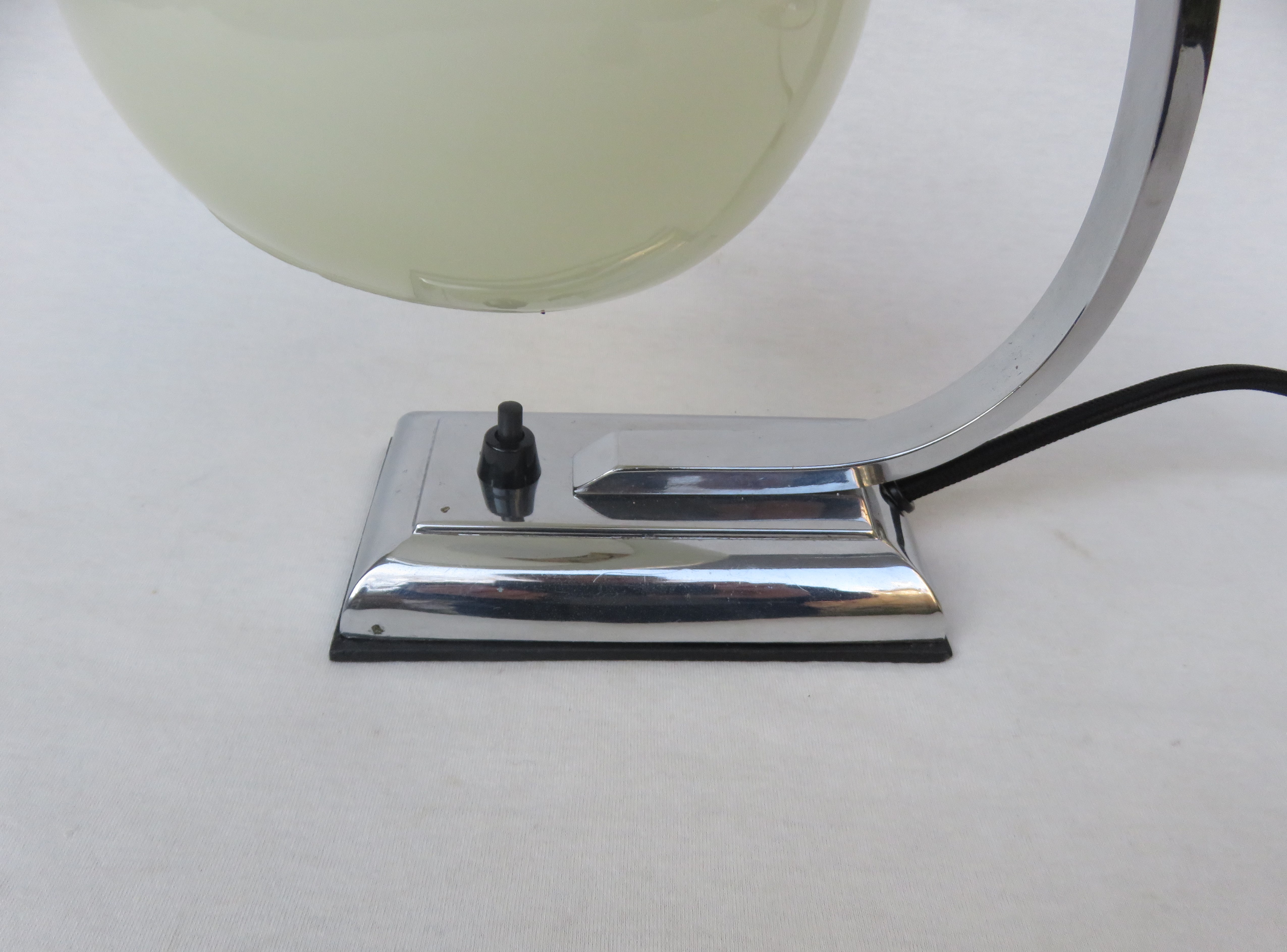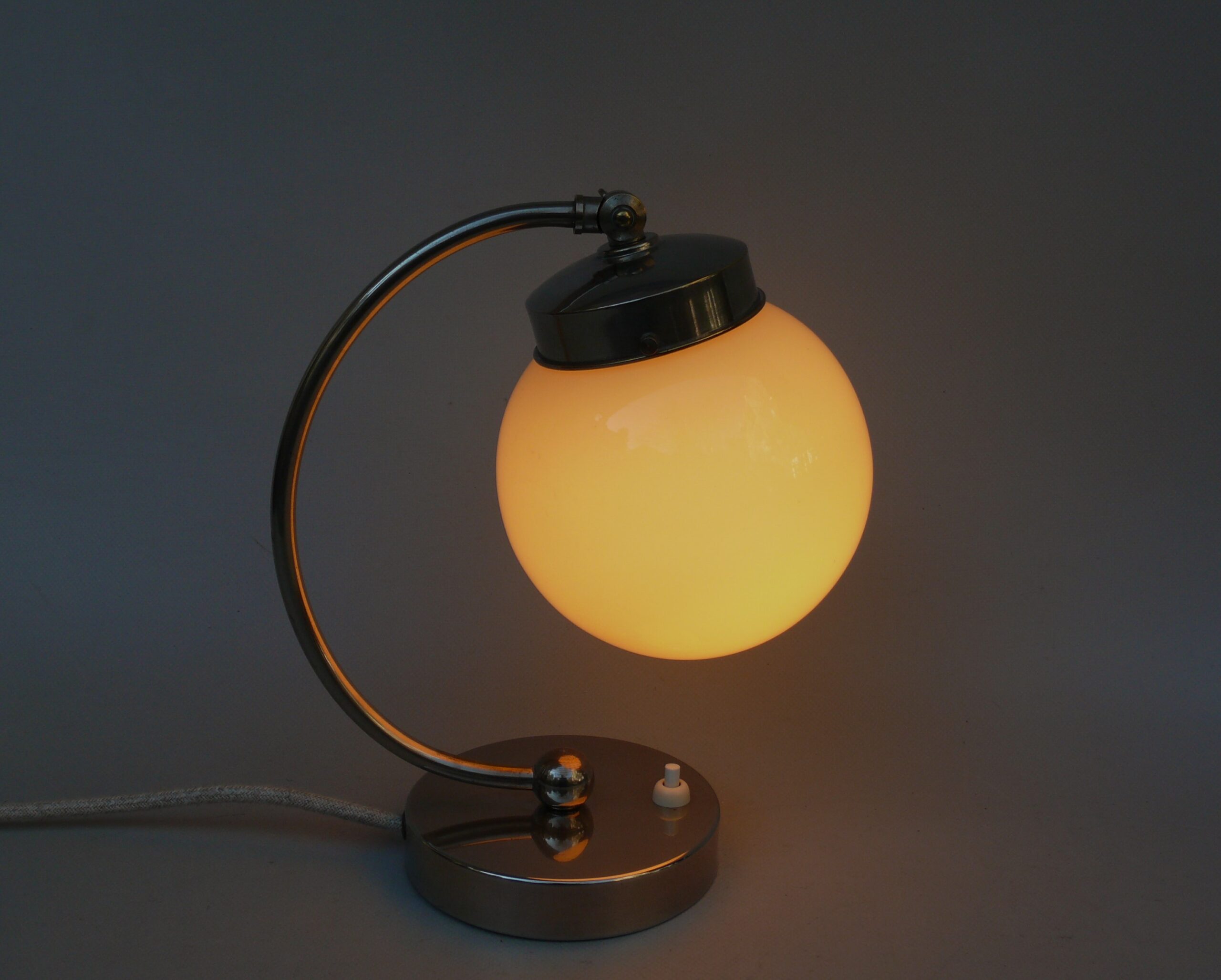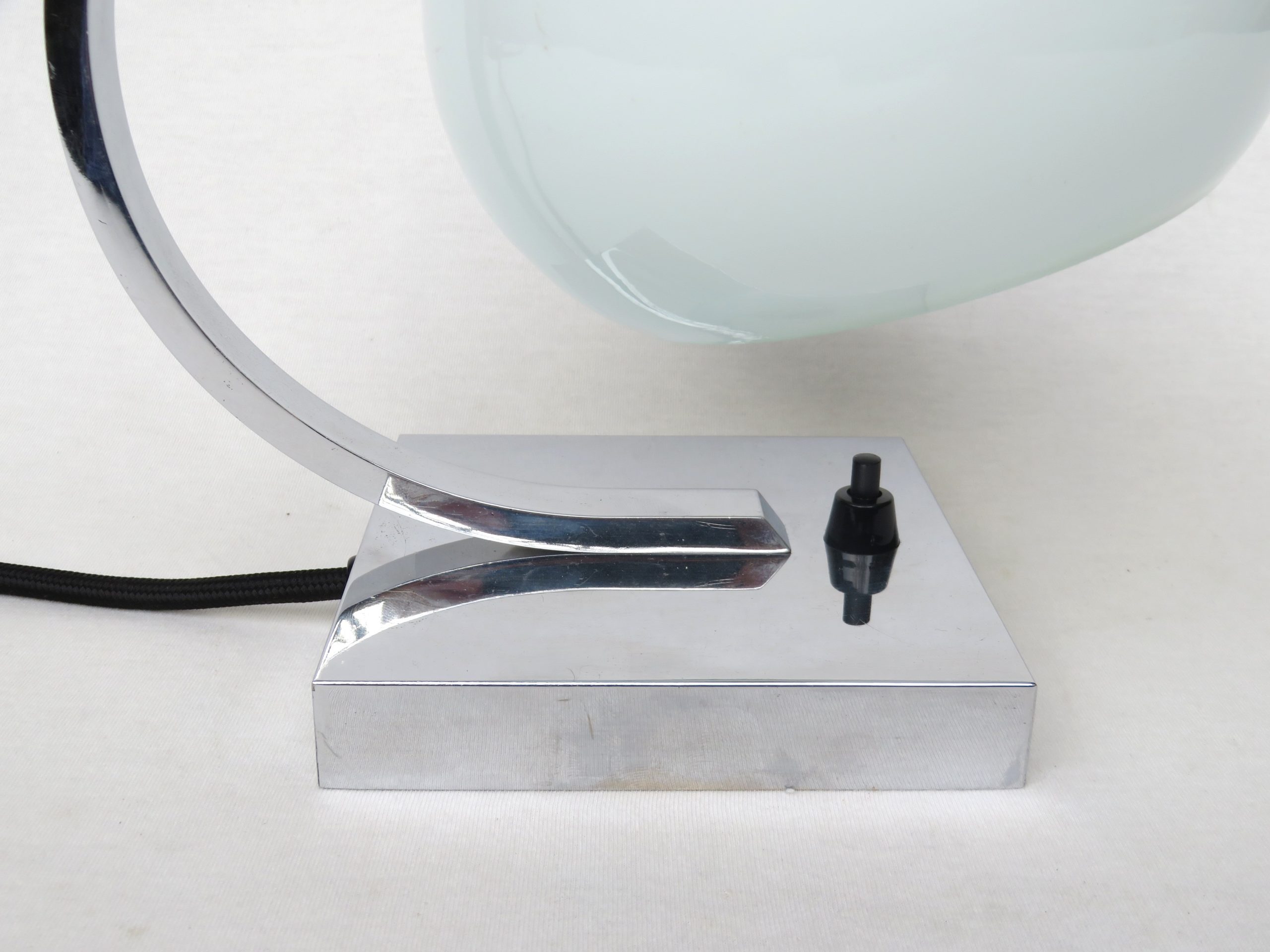 N7 – Nachttischleuchte, Art Deco, verchromt, seltener weißer Überfangglasschirm, Österreich