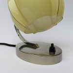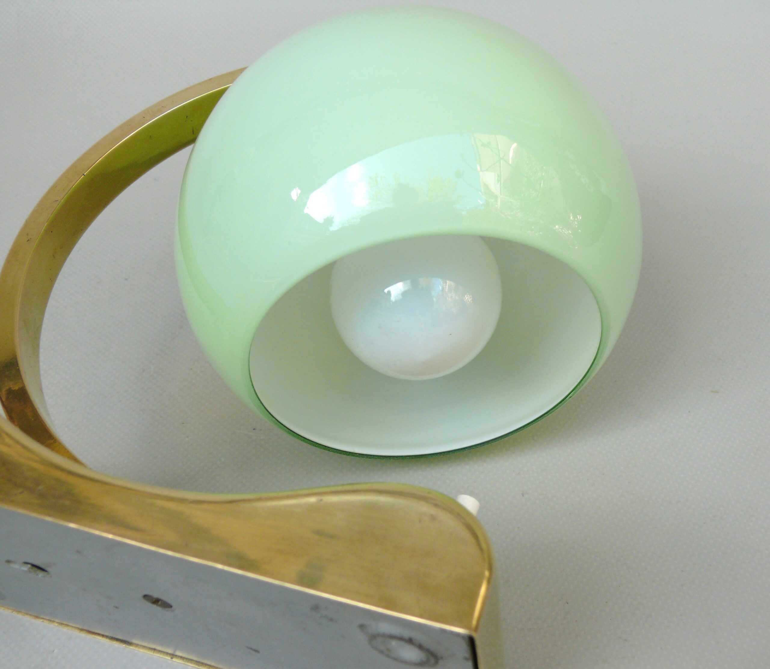 Der Lampenschirm ist Überfangglas grün braun geflammt, der Sockel Messing verchromt. Der Schirm ist über ein Gelenk neigbar und mittels einer Arretierungsschraube zu fixieren. . Die Leuchte kann auch als Wandleuchte eingesetzt werden.