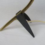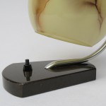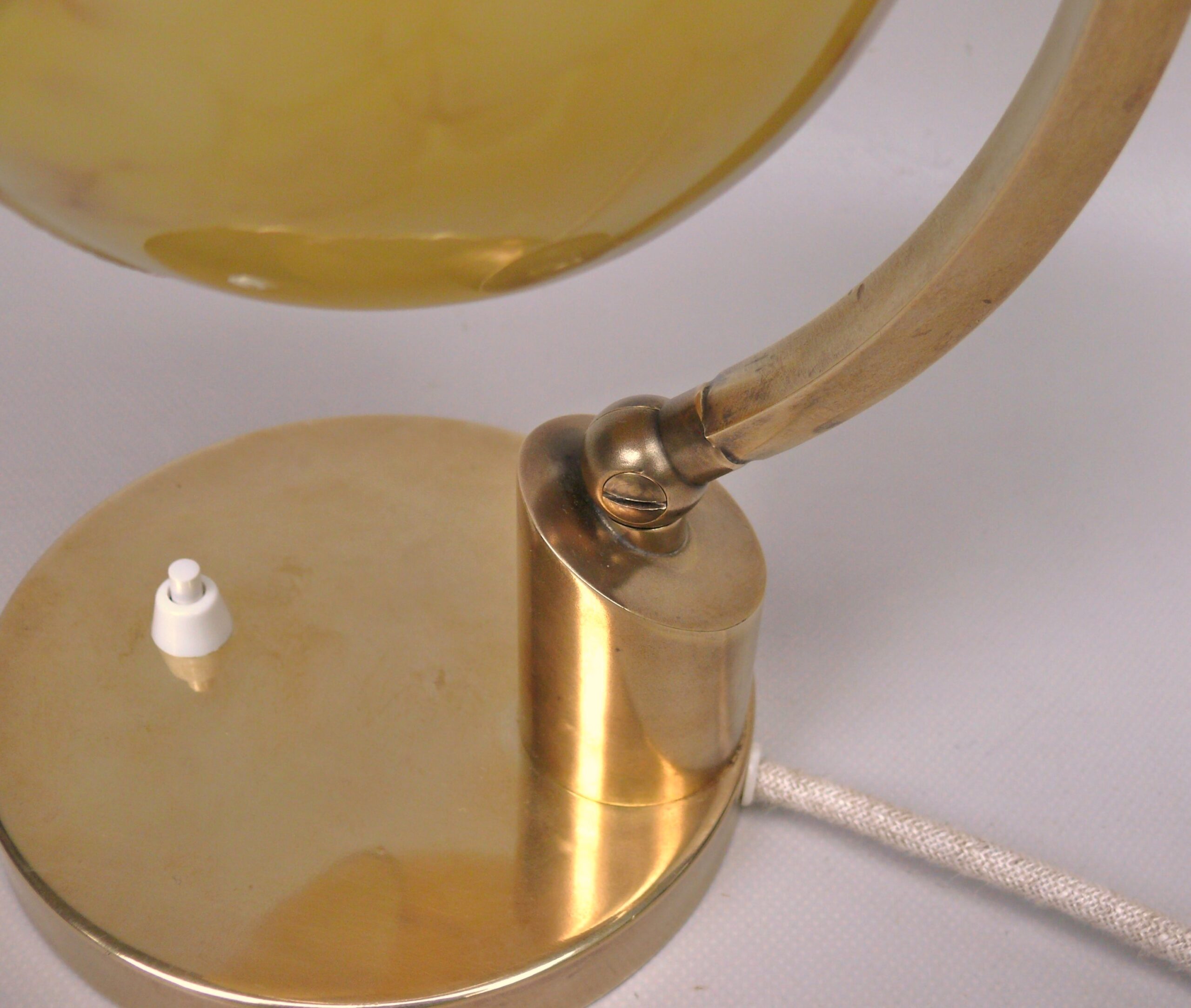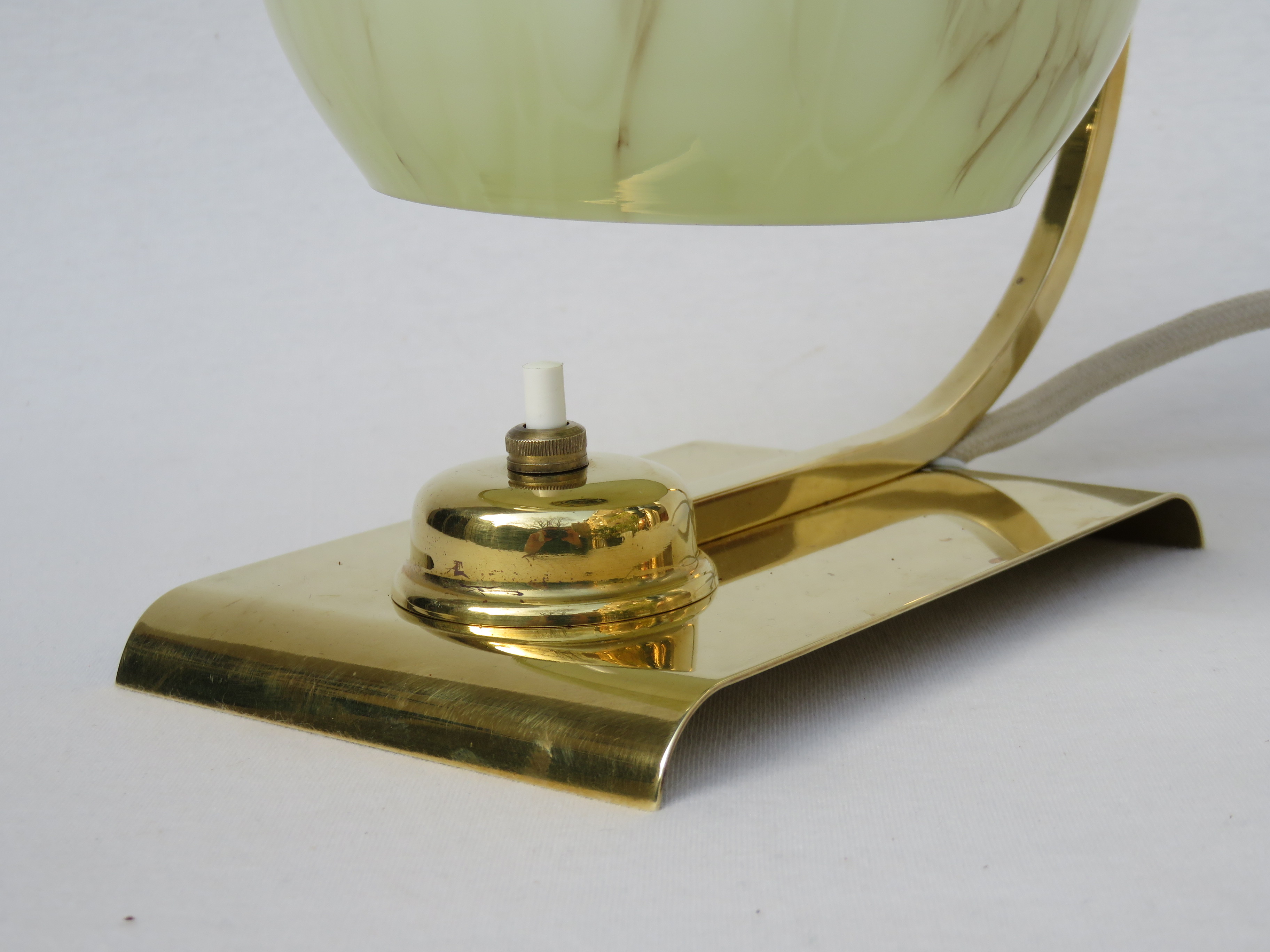 Die Leuchte ist detailverliebt gearbeitet, sie erinnert in der Qualität der Ausführung an Leuchten von WMF. Der Sockel ist poliertes Messing, der Lampenschirm beige braun-geflammes Überfangglas.Der Lampenarm ist ein gebogenes dreieckiges Profil und läuft halbrund über den Lampenschirm.