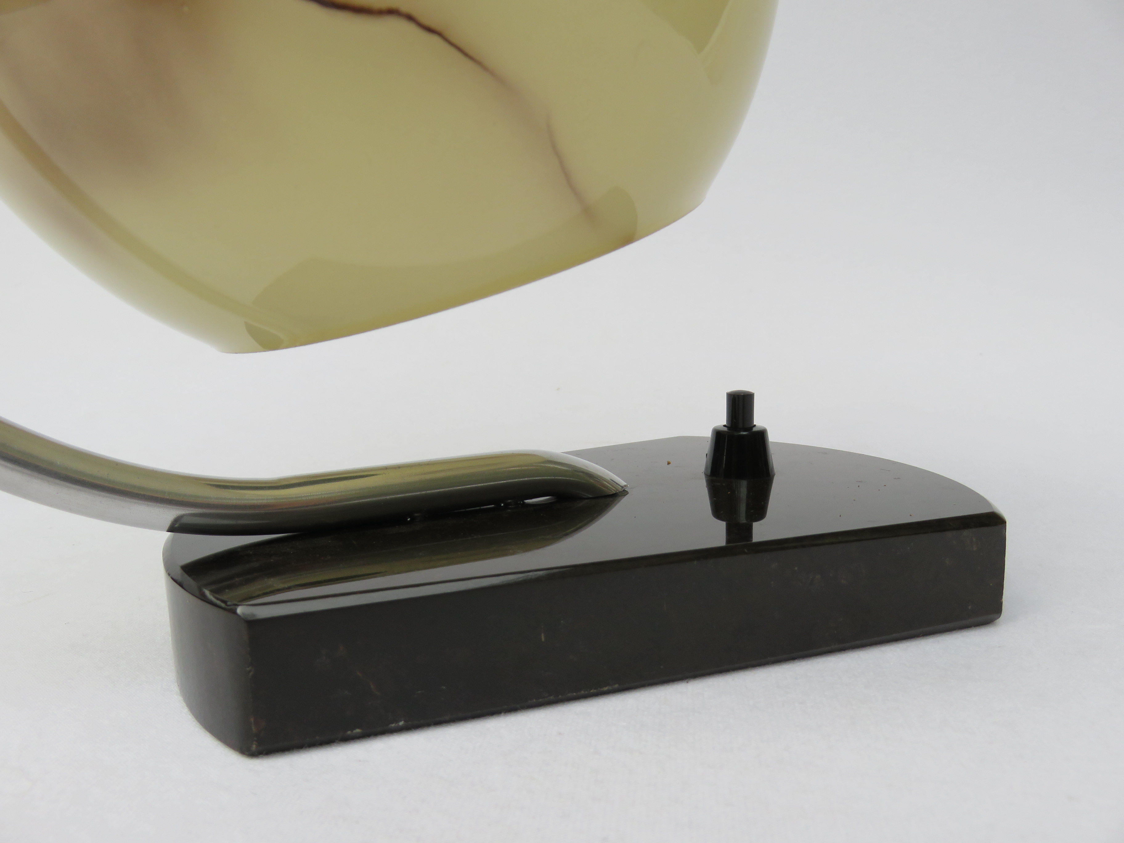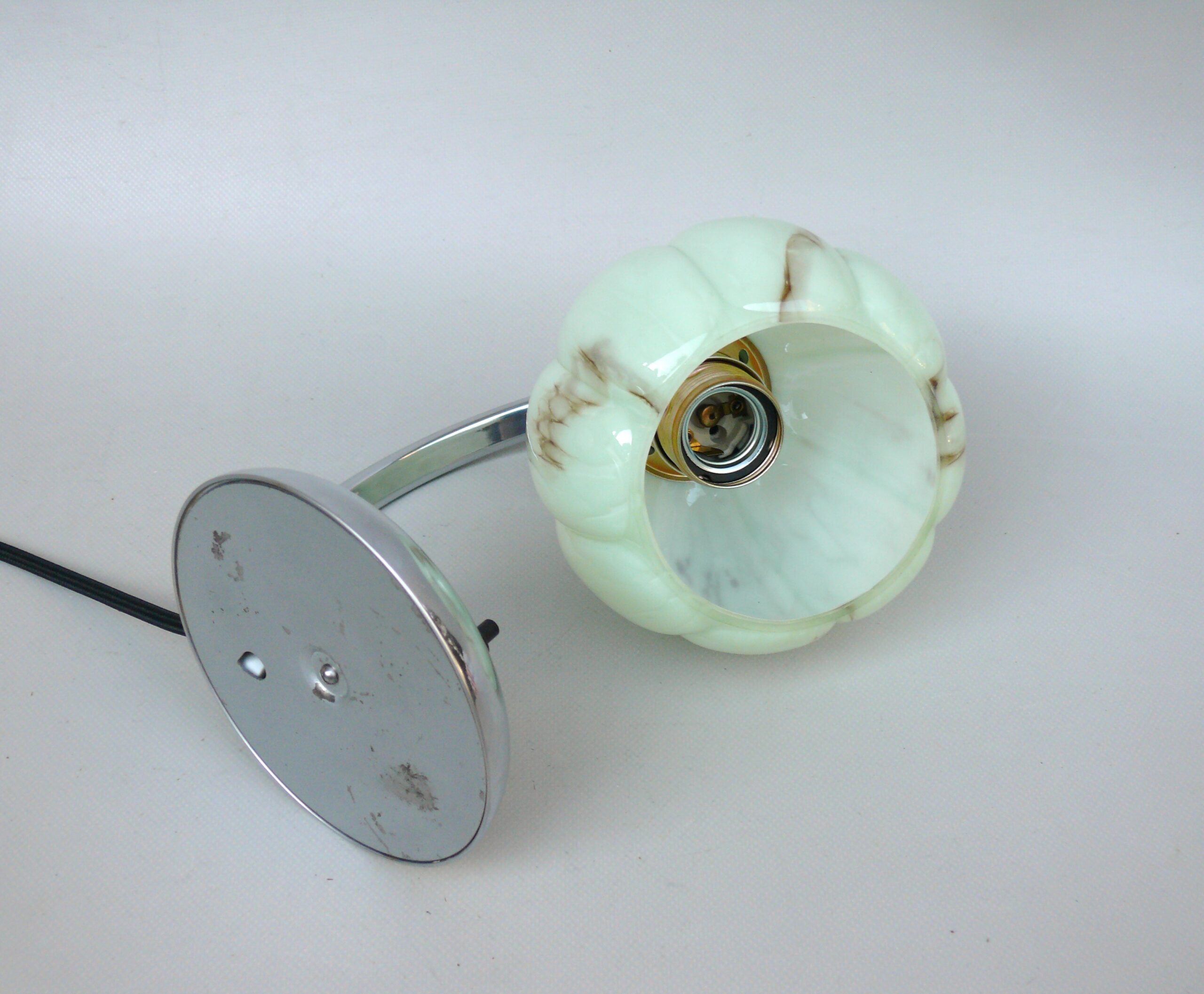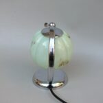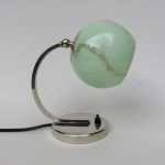 N15 – Nachttischleuchte Art Deco, verchromt, teilweise mintgrün lackiert, ausgefallener Überfang-Glasschirm grün-braun geflammt
