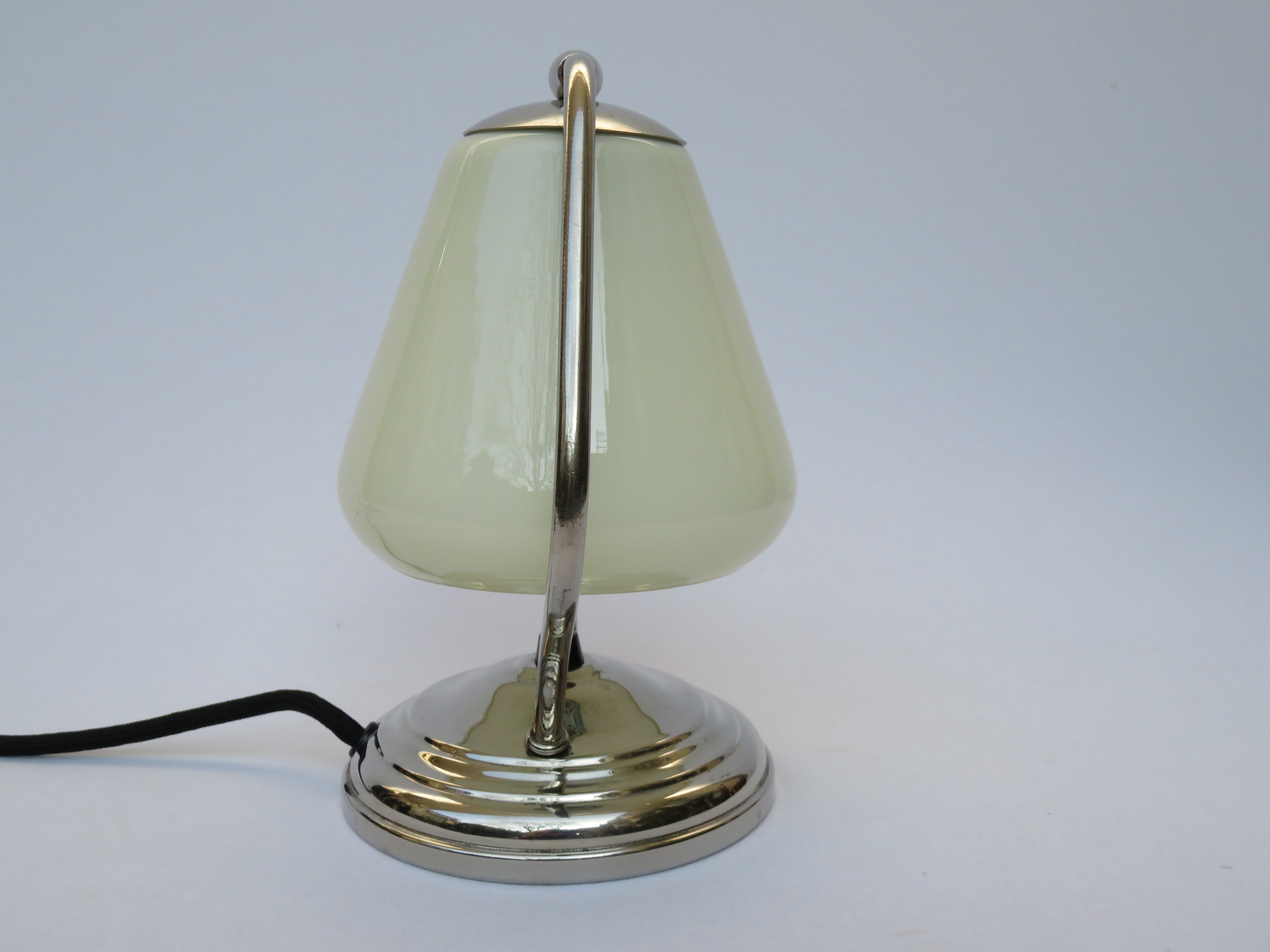 N19 – Nachttischleuchte, Art Deco, vernickelt, beiger Glasschirm in außergewöhnlicher Form – Überfangglas