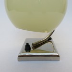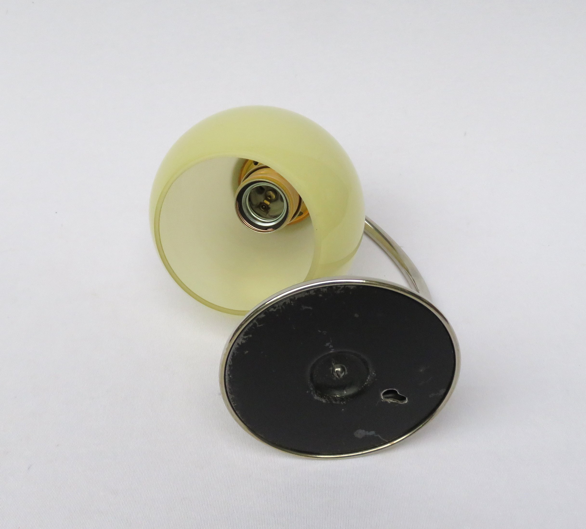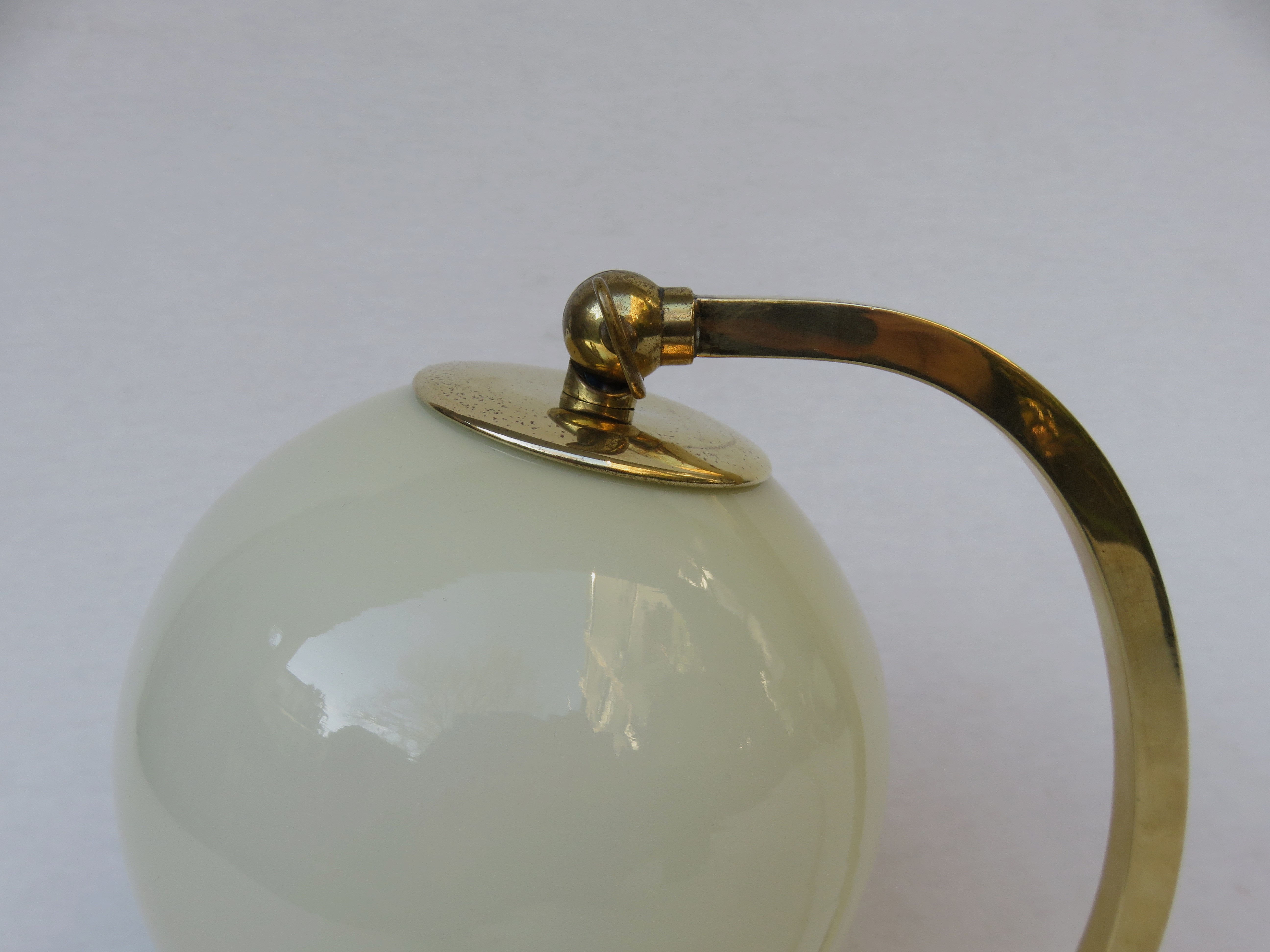 Der Lampenschirm ist Überfangglas beige, der Sockel Messing verchromt. Der Schirm ist über ein Gelenk neigbar. Die Leuchte kann auch als Wandleuchte eingesetzt werden.