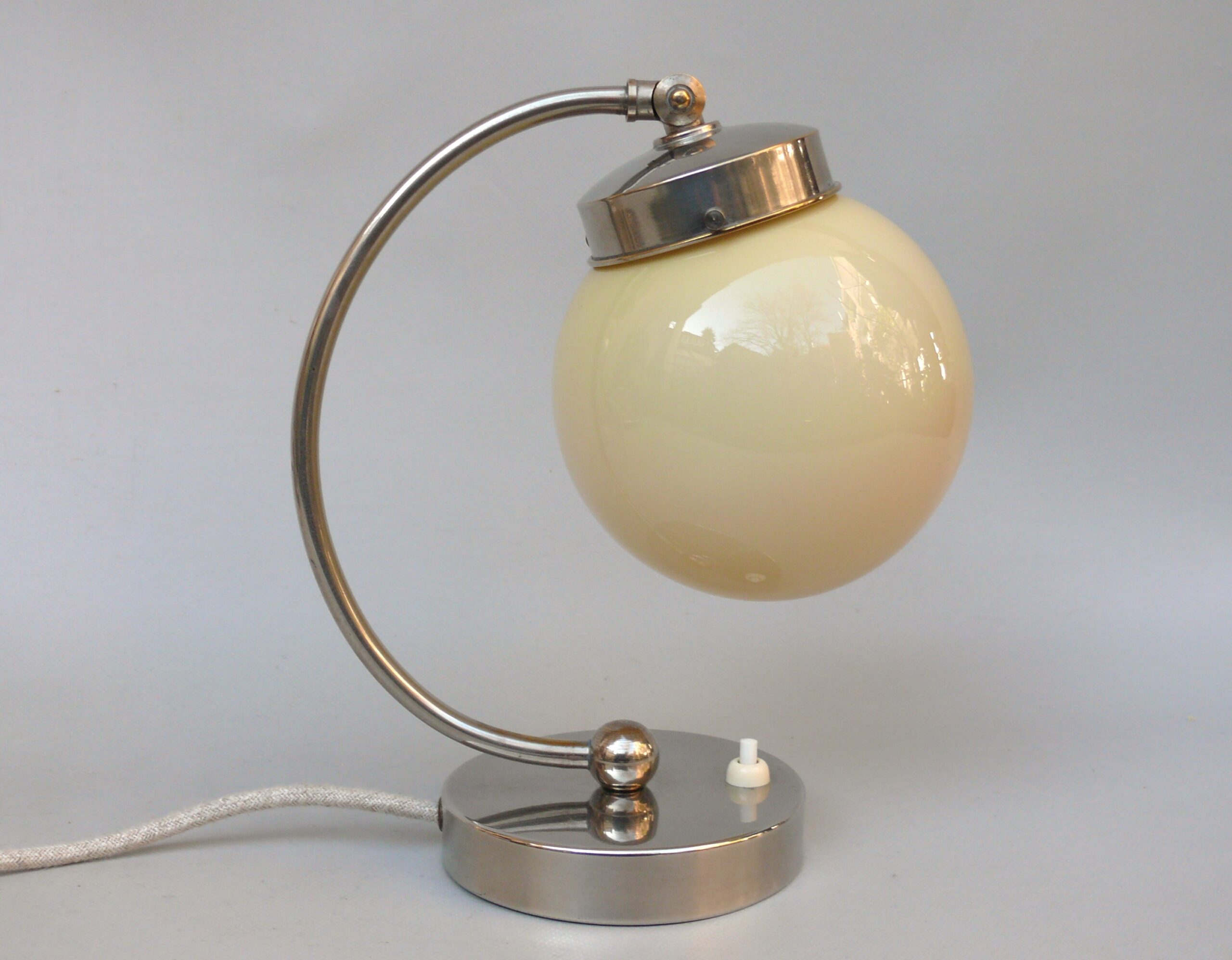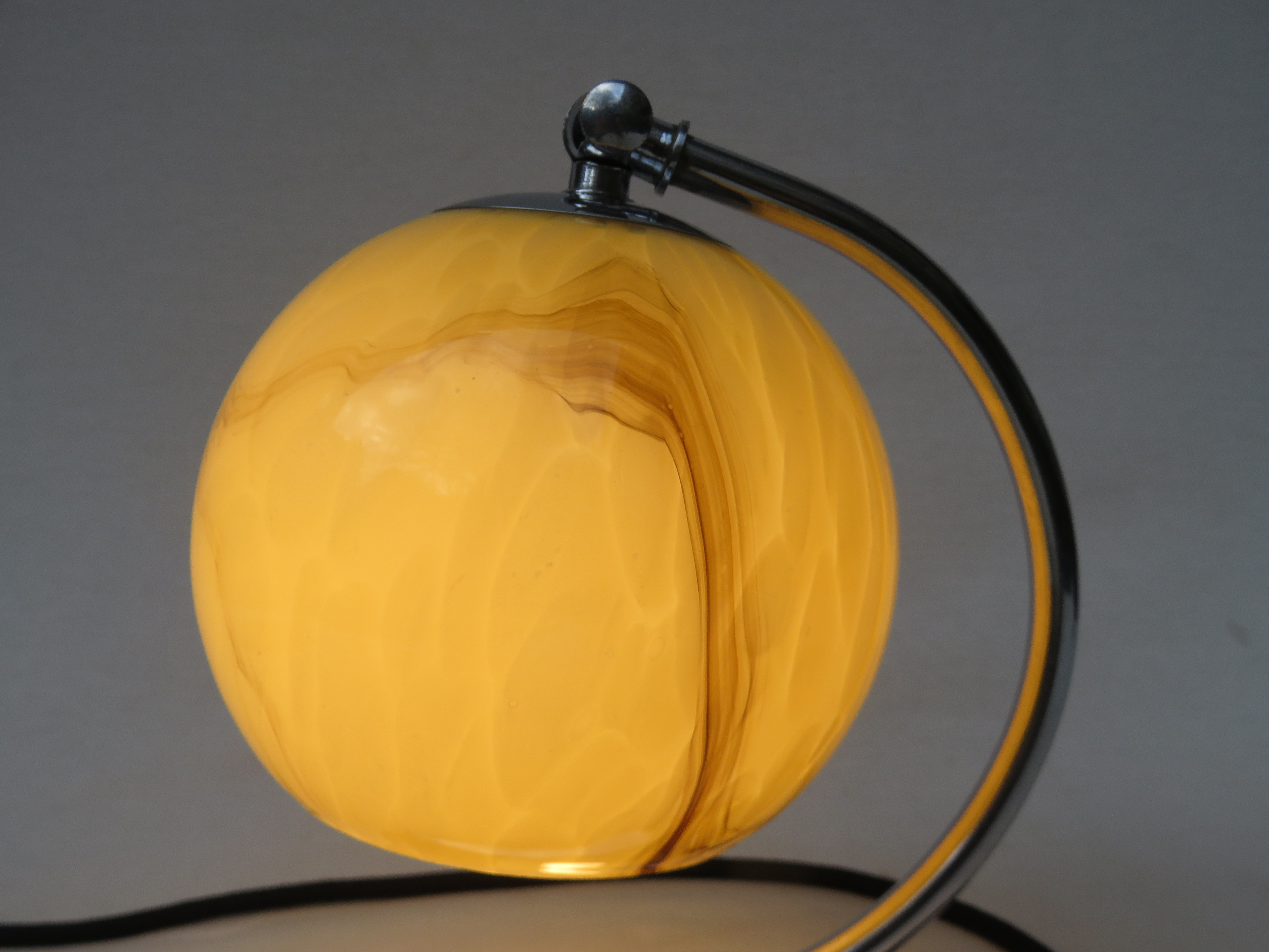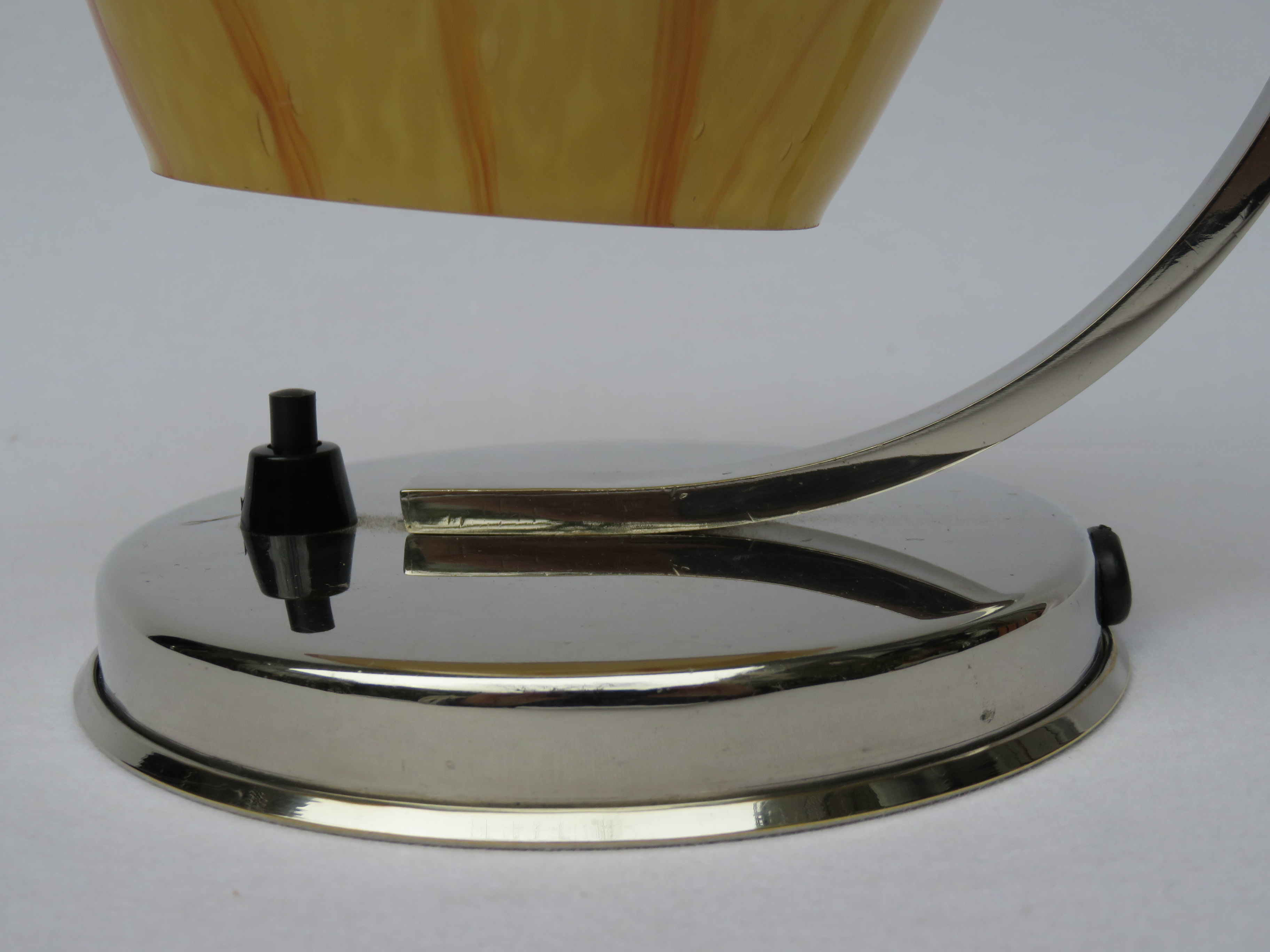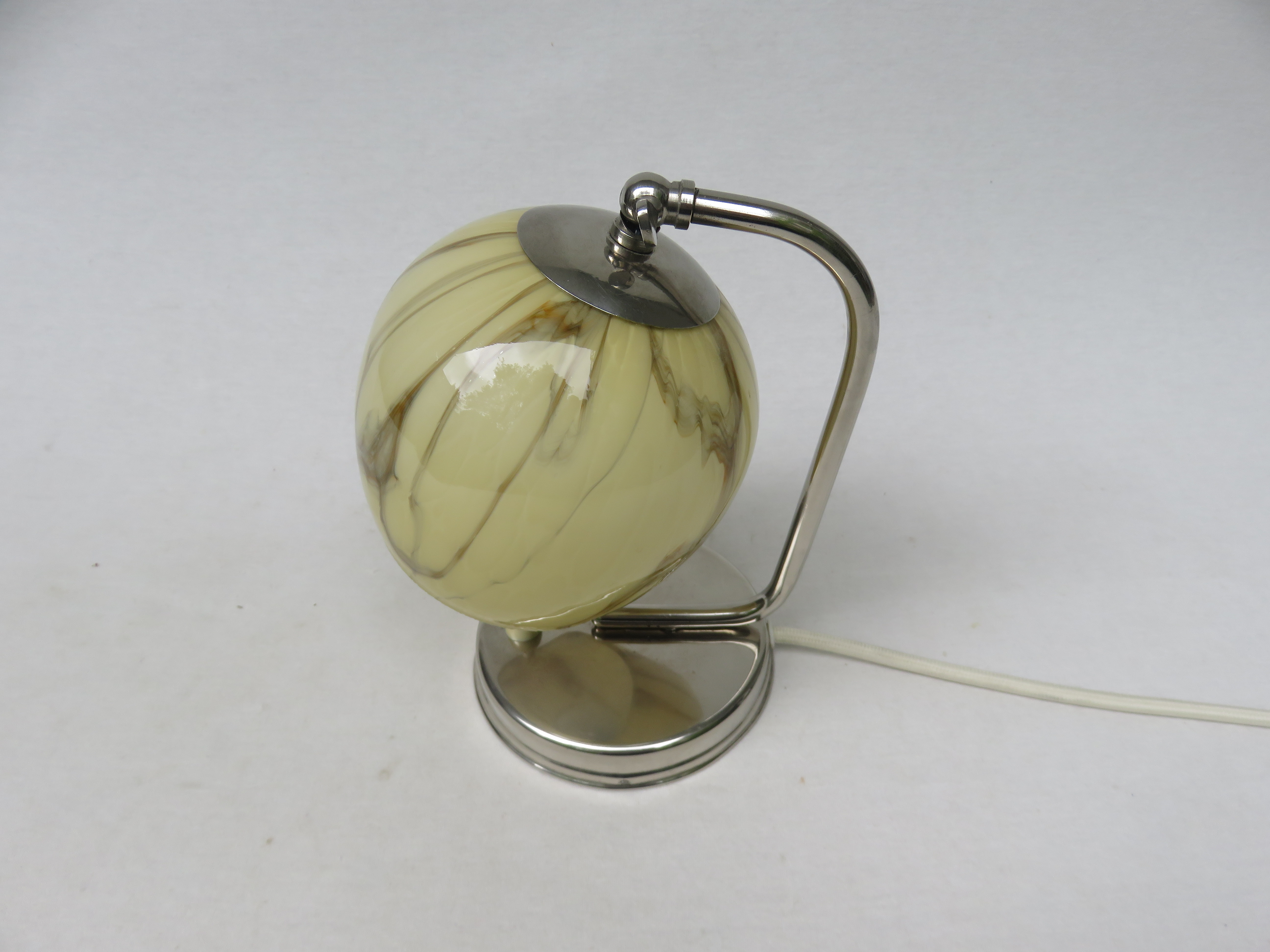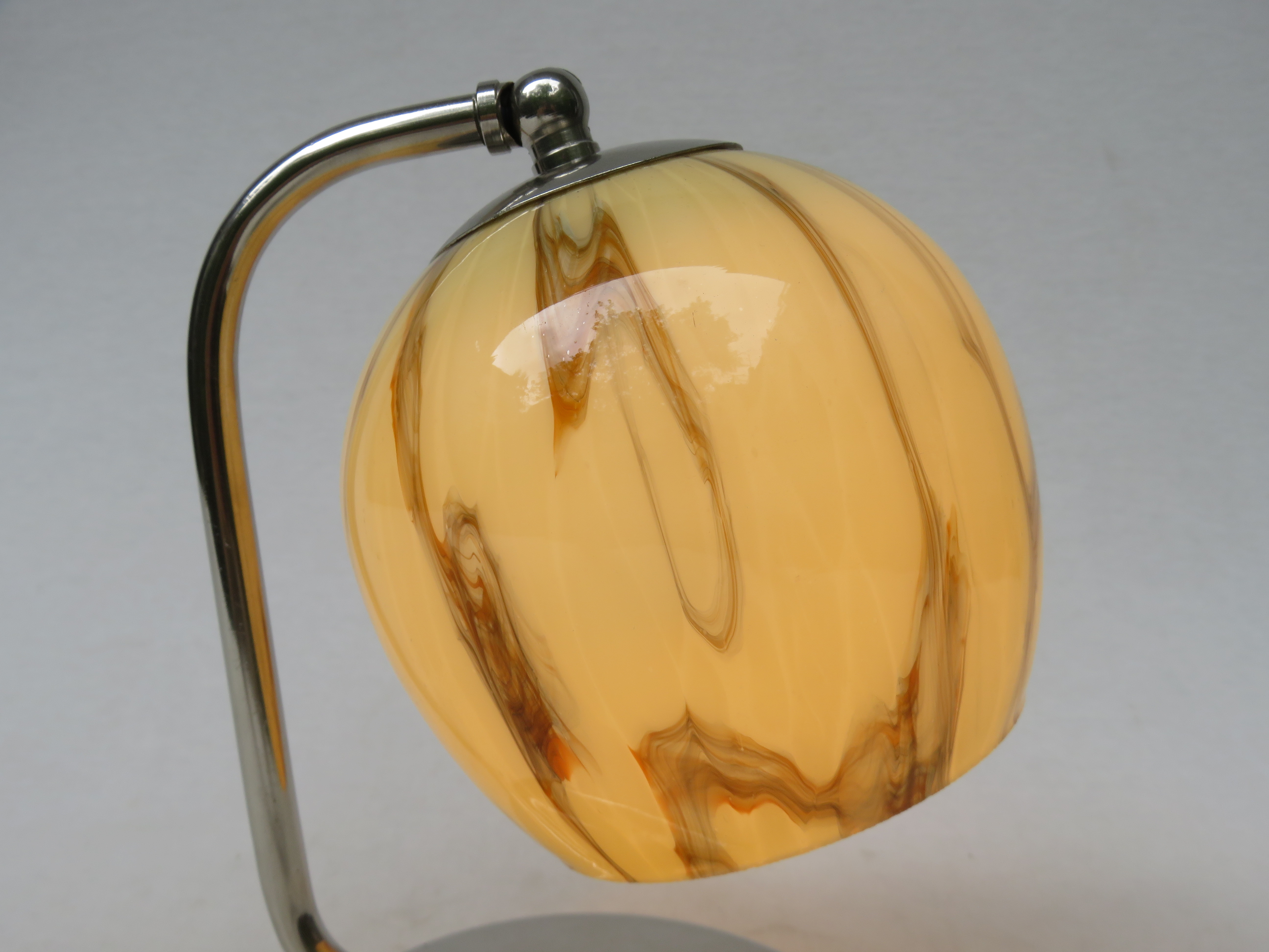 N14 – Nachttischleuchte, Art Deco, verchromt, Messing, Lampenschirm Überfangglas beige, ausgefallene Form