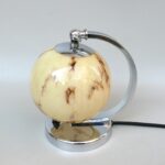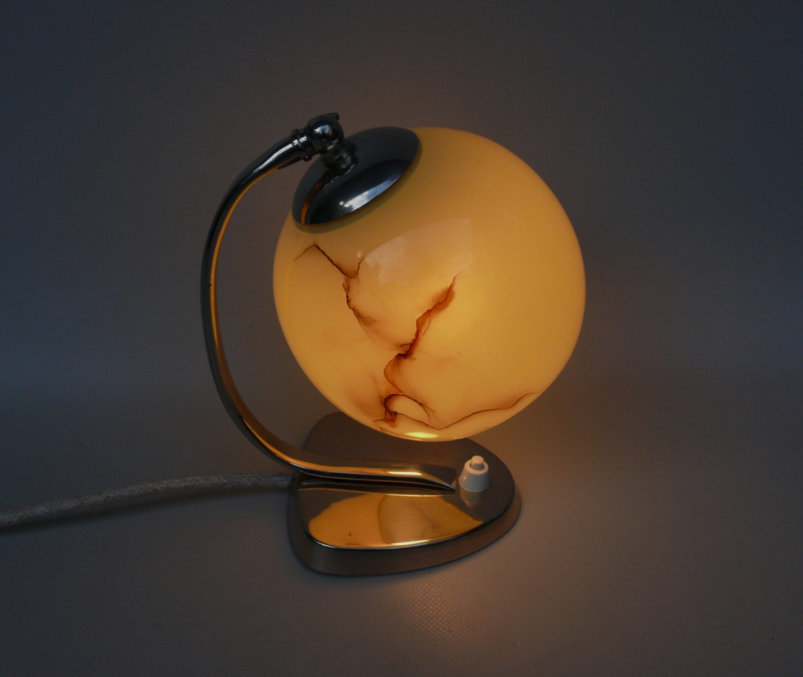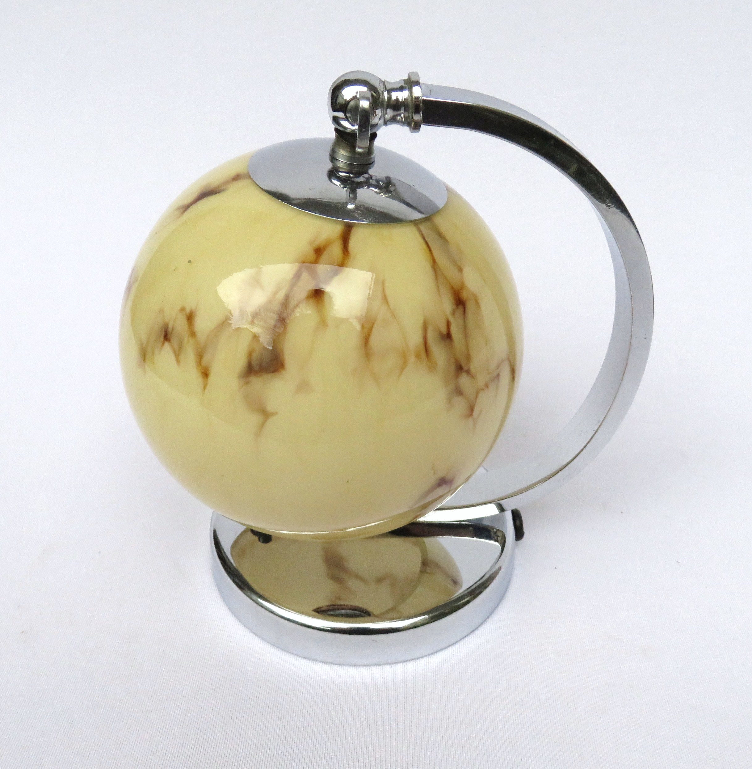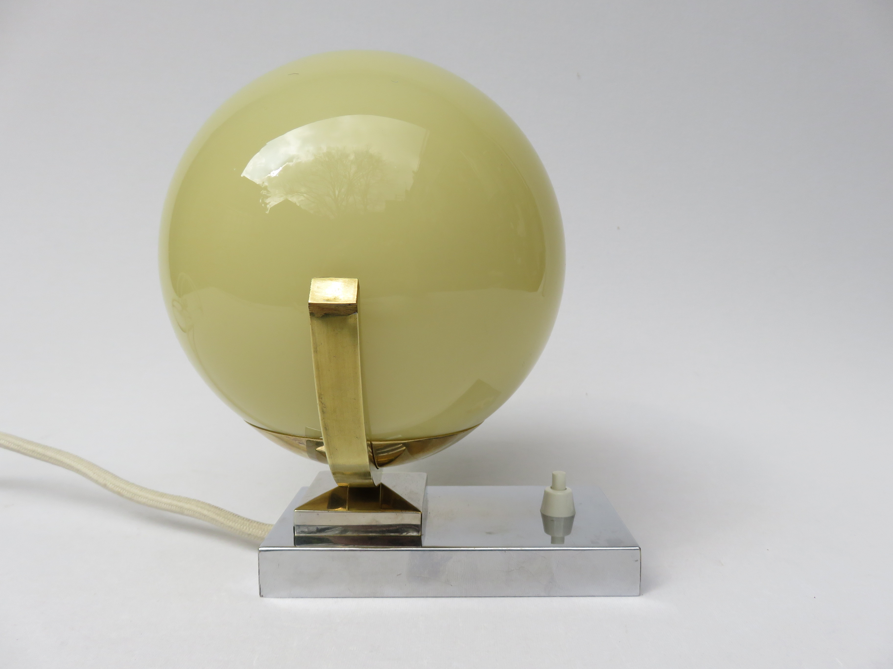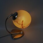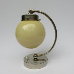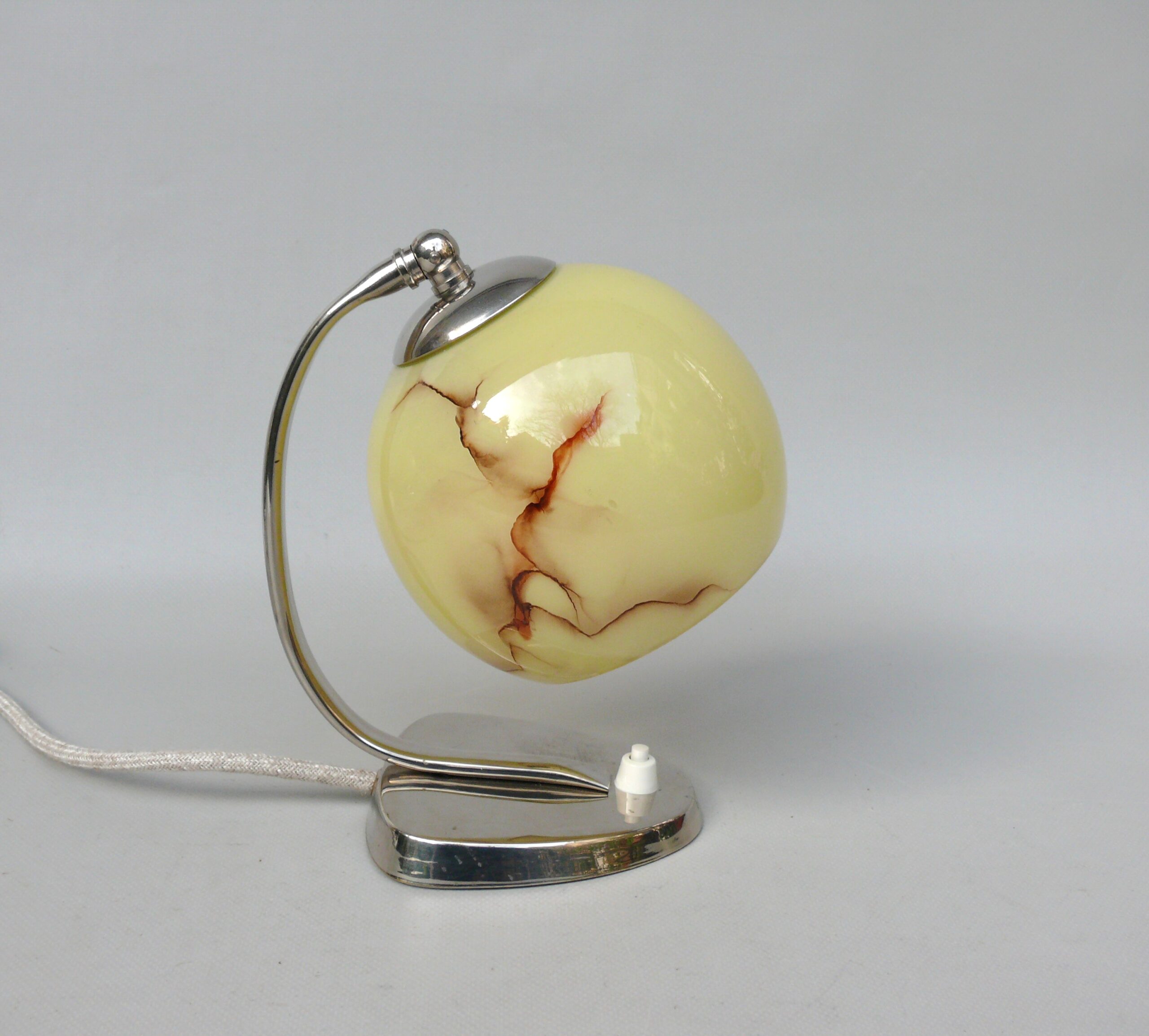 N14 – Nachttischleuchte, Art Deco, verchromt, Messing, Lampenschirm Überfangglas beige, ausgefallene Form