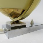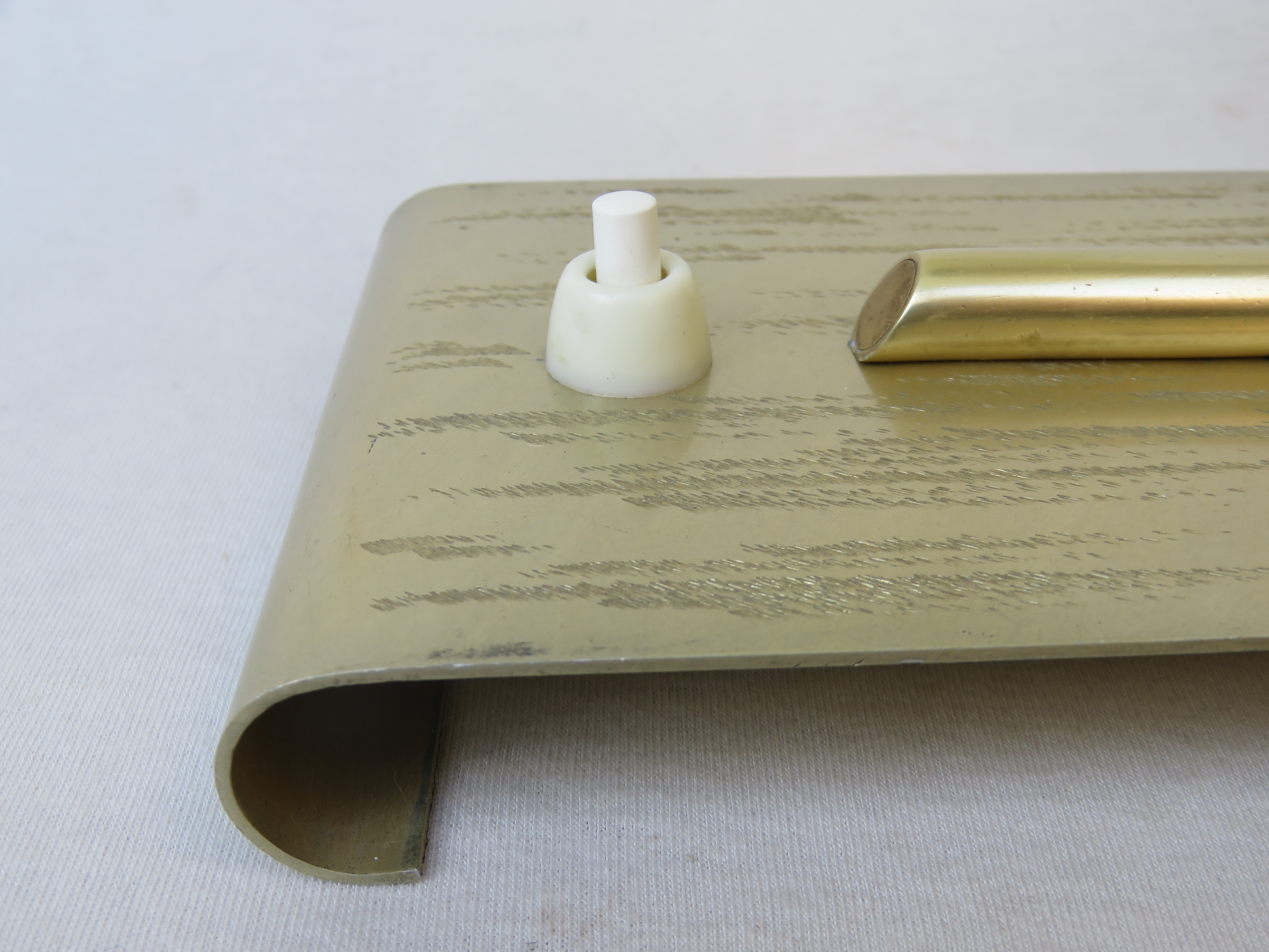 Der Sockel ist Gußeisen, lackiert in Schrumpflack beige. Der Arm ist Messing, der Lampenschirm weißes Plexiglas.