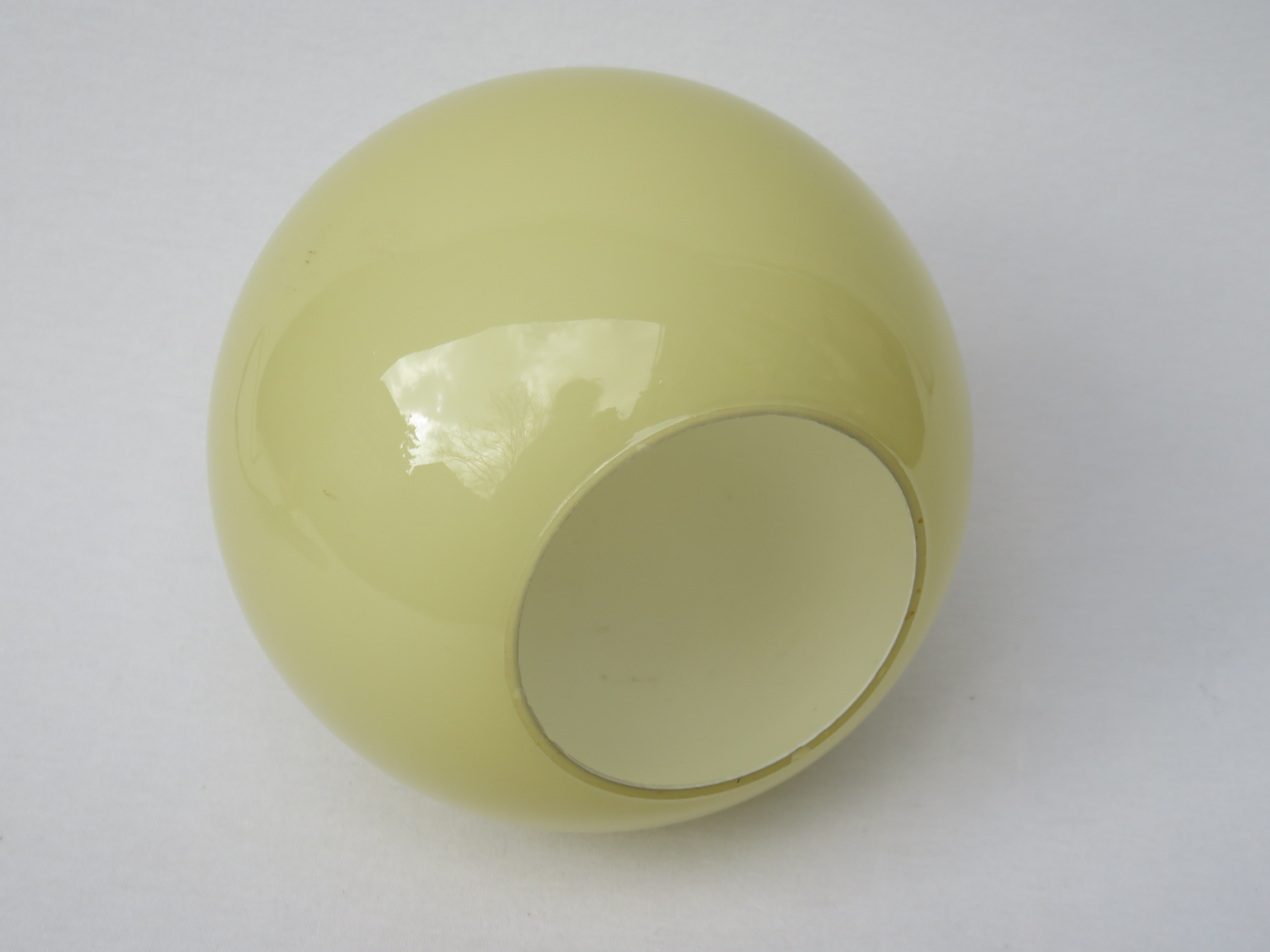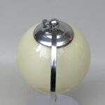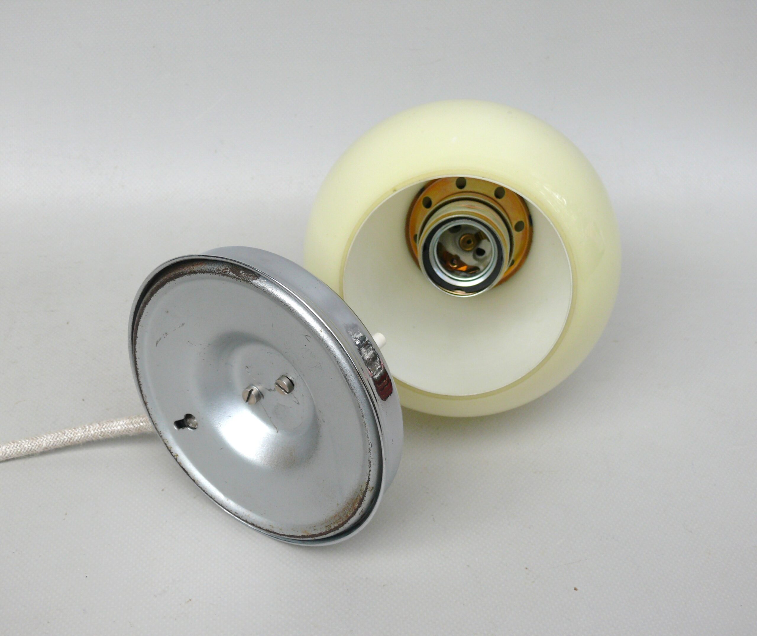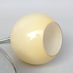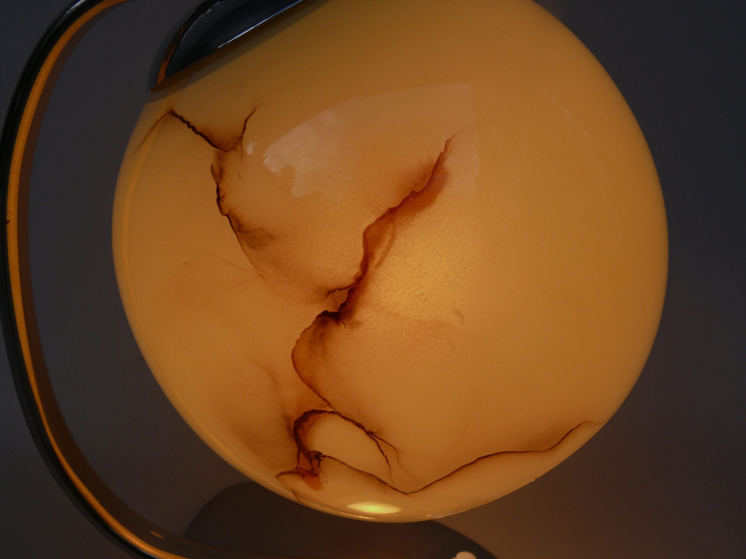 Der Sockel ist verchromt, der Lampenschirm aus beigem Überfangglas. Der Lampenschirm ist mundgeblasen und zeigt an einer Stelle mehrere eingeschlossene Luftblasen. Die Leuchte gibt ein angenehmes und blendfreies Raumlicht ab.