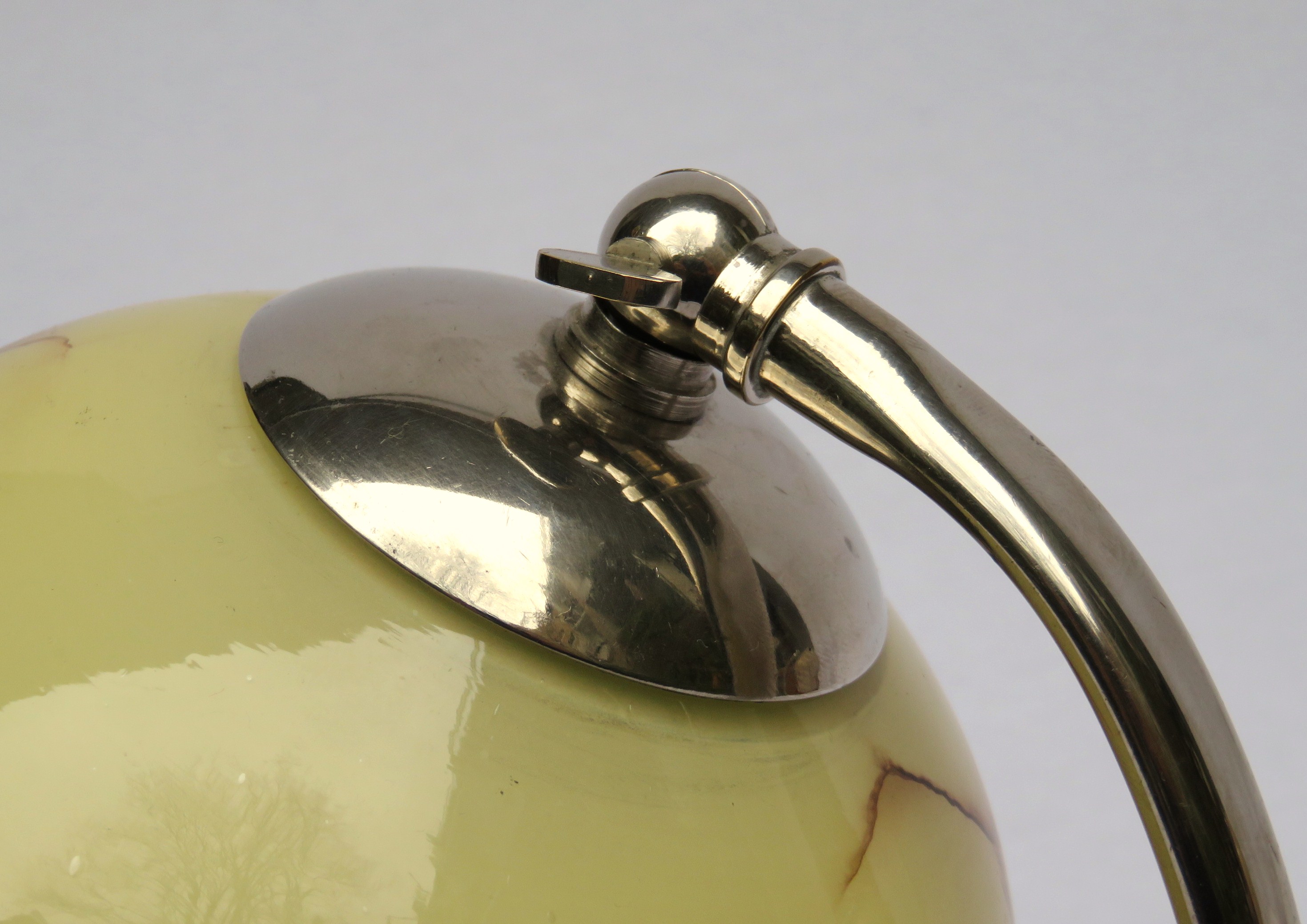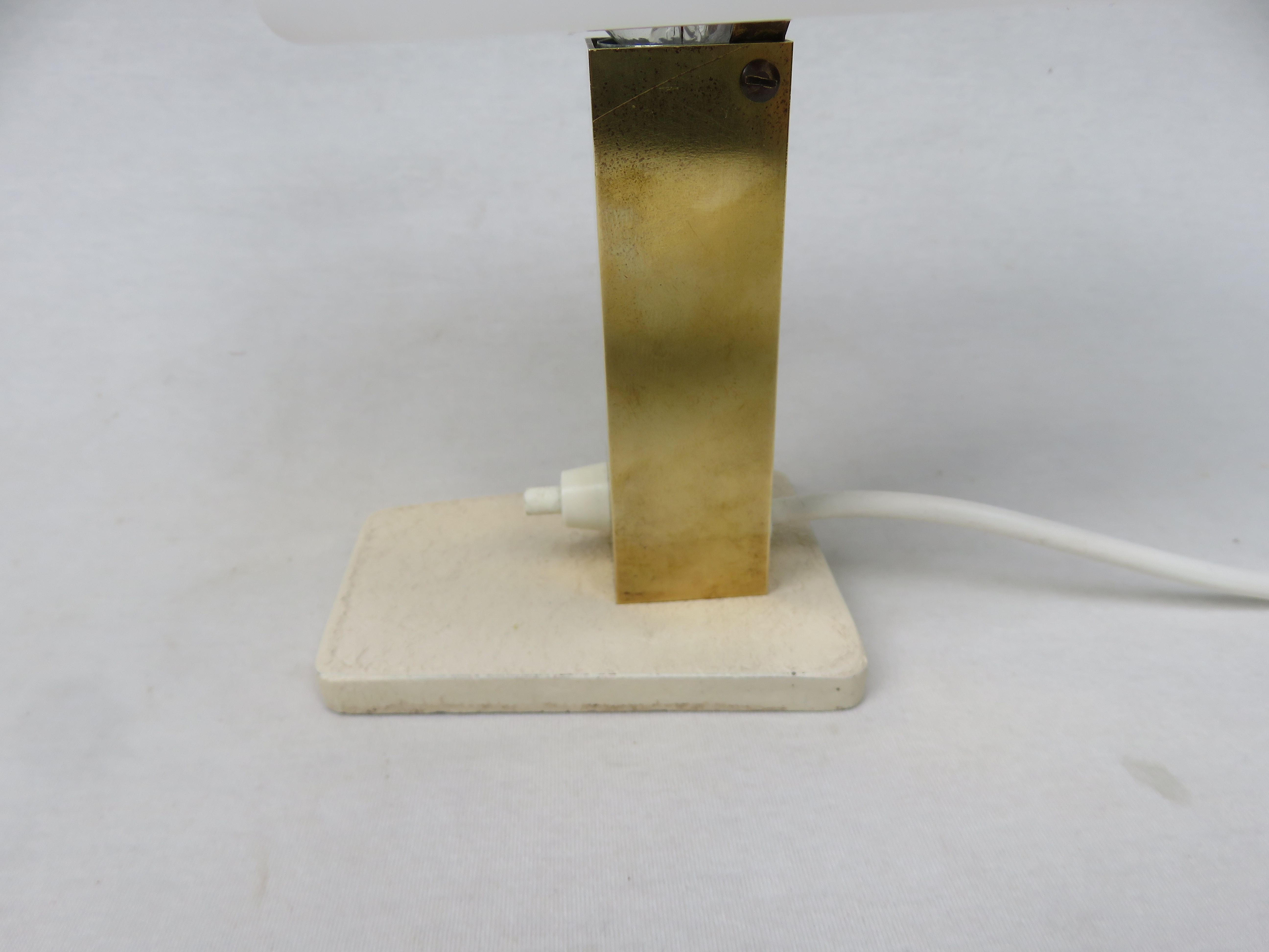 Der Lampenschirm ist aus beigem Überfangglas, der Sockel und Lampenarm sind Messing vernickelt. Der Schirm ist über ein Gelenk neigbar und mittels einer Arretierungsschraube zu fixieren.