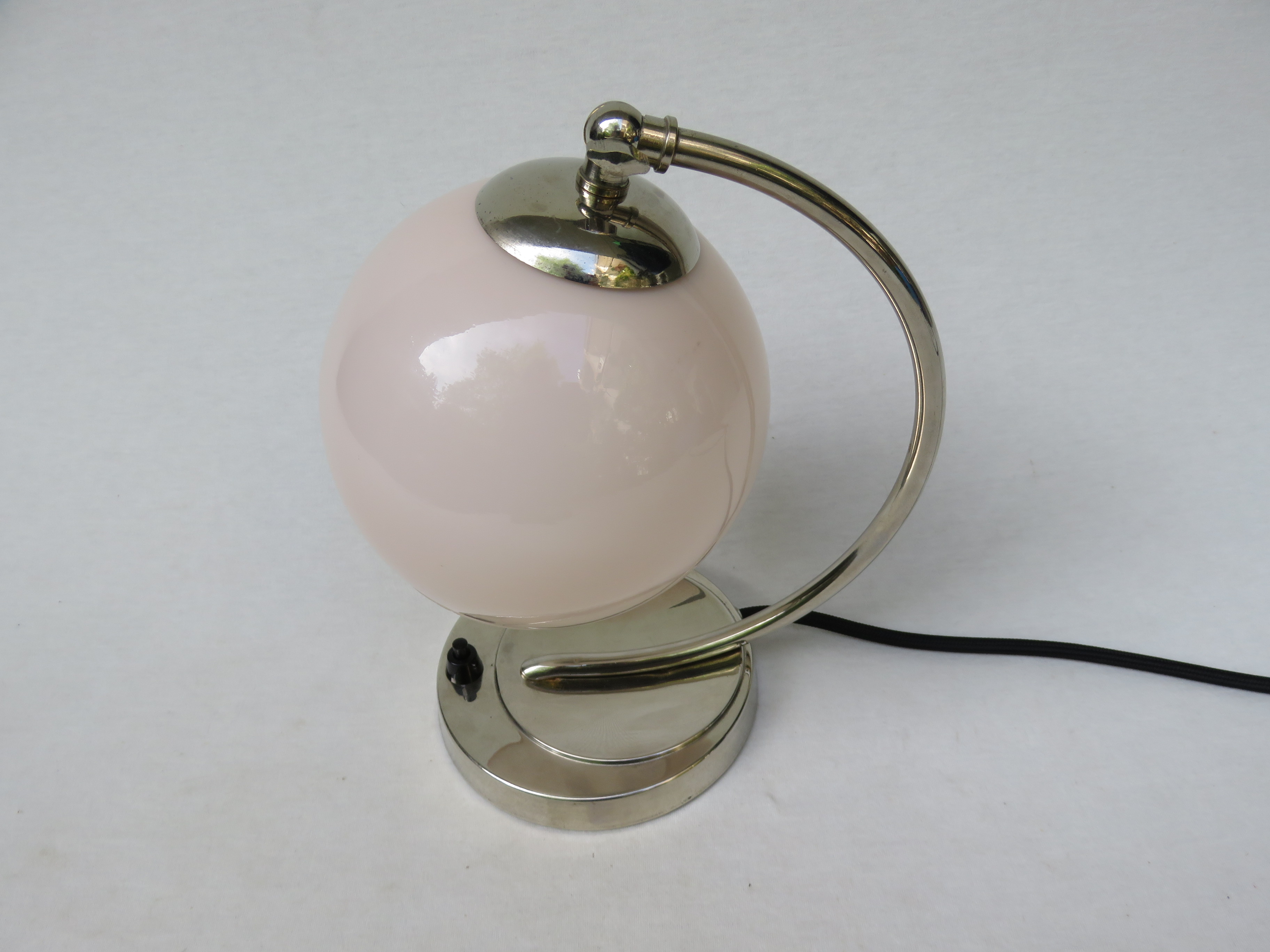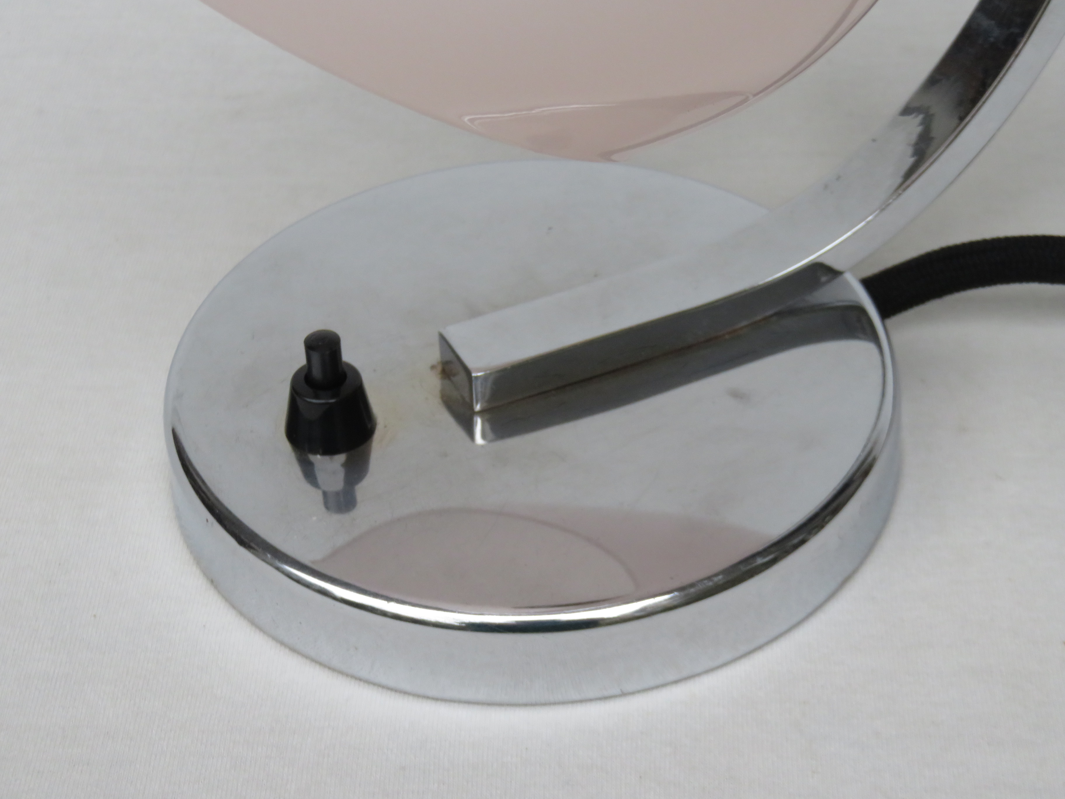 N5 – Nachttischleuchte, Art Deco, verchromt, rosé Glasschirm Überfangglas