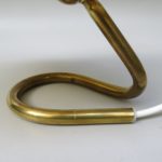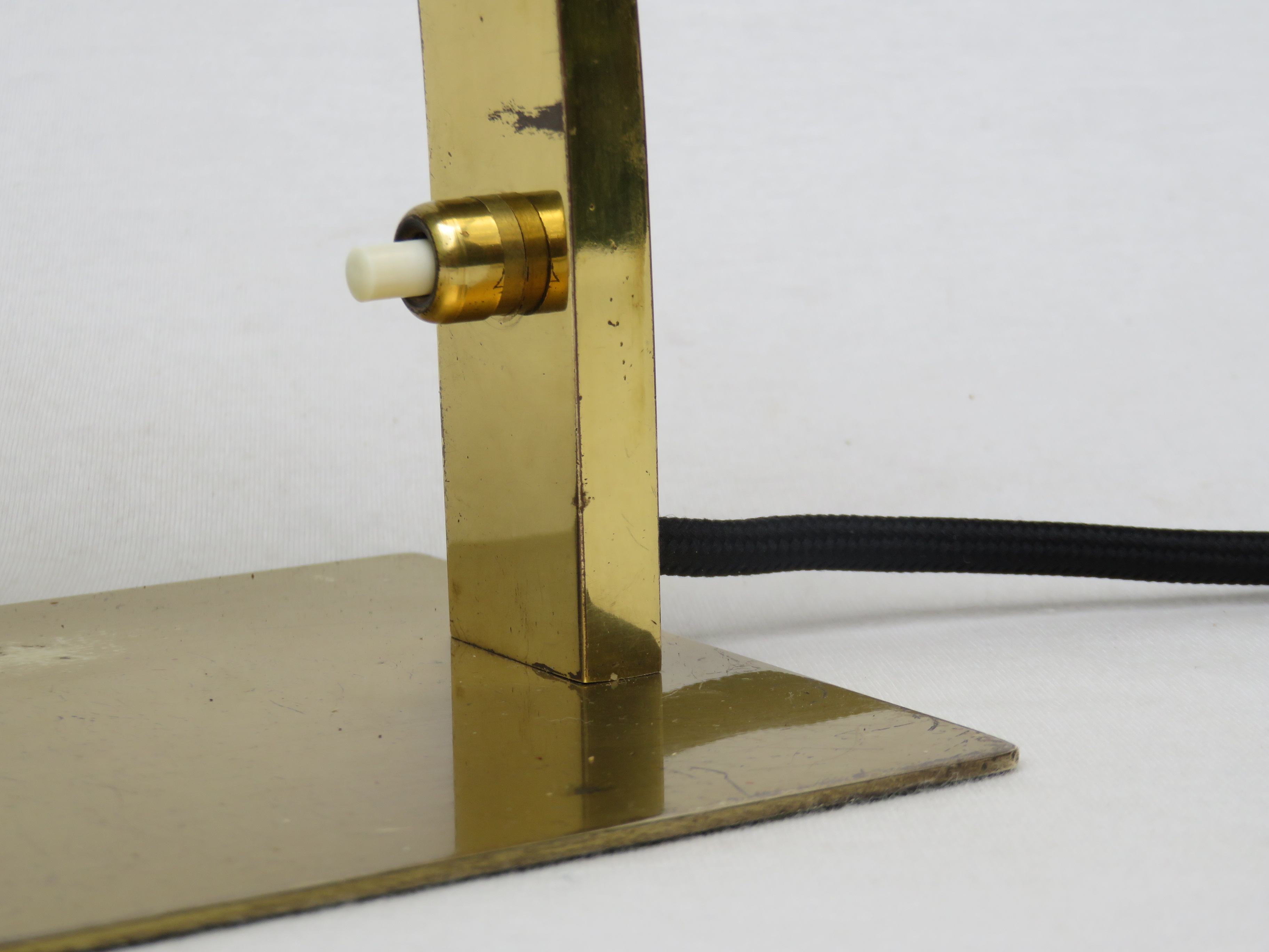 Das Messing zeigt eine authentische Patina, es sind stellenweise leichte Druckstellen am dreieckigen Lampenarm vorhanden.