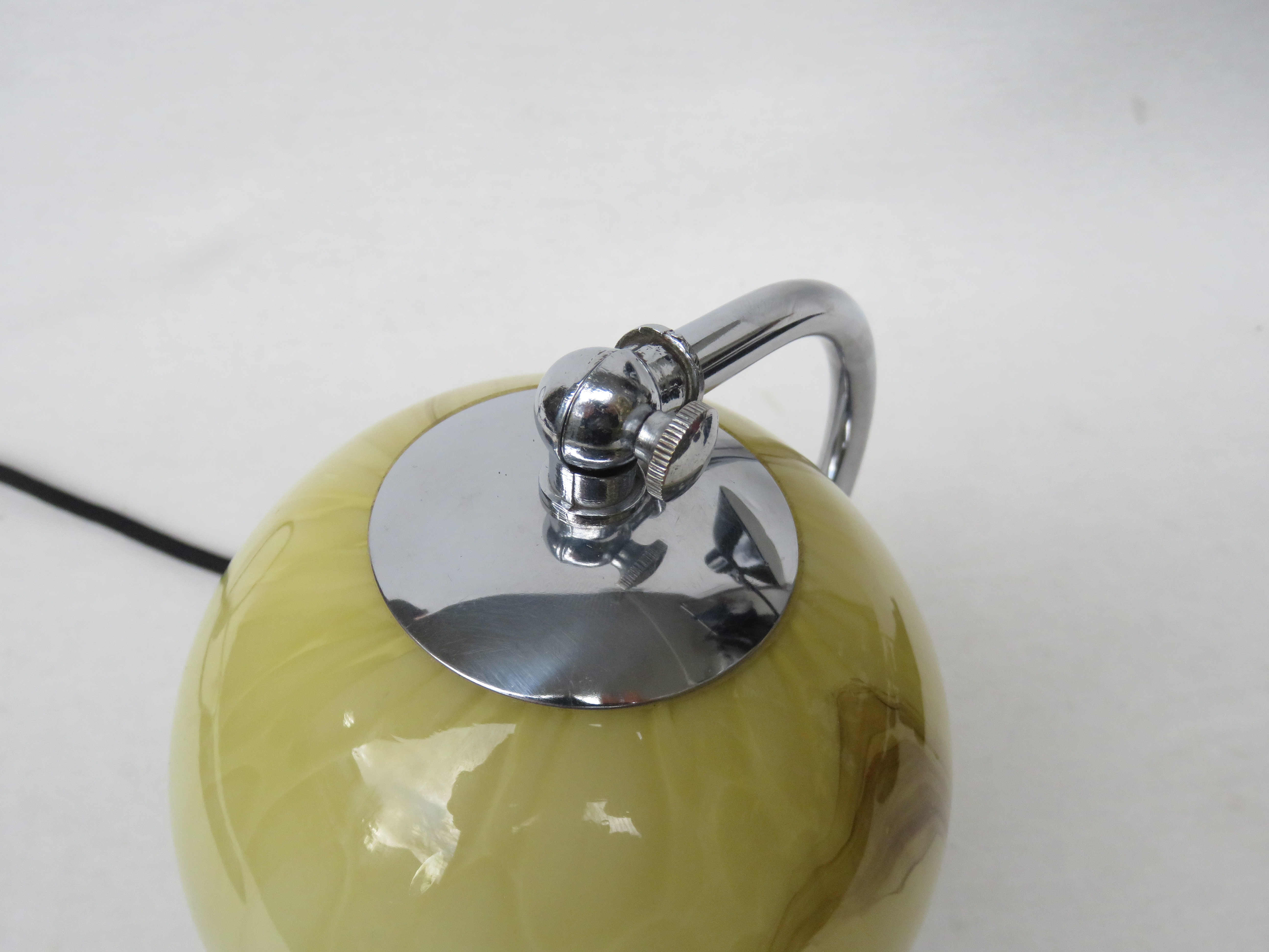 Eine außergewöhnliche Nachttischleuchte aus der Zeit des Art Deco, verchromt, mit mintgrüner Lackierung und einem ausgegefallenen Überfang-Glasschirm in grün-braun geflammt