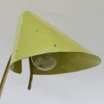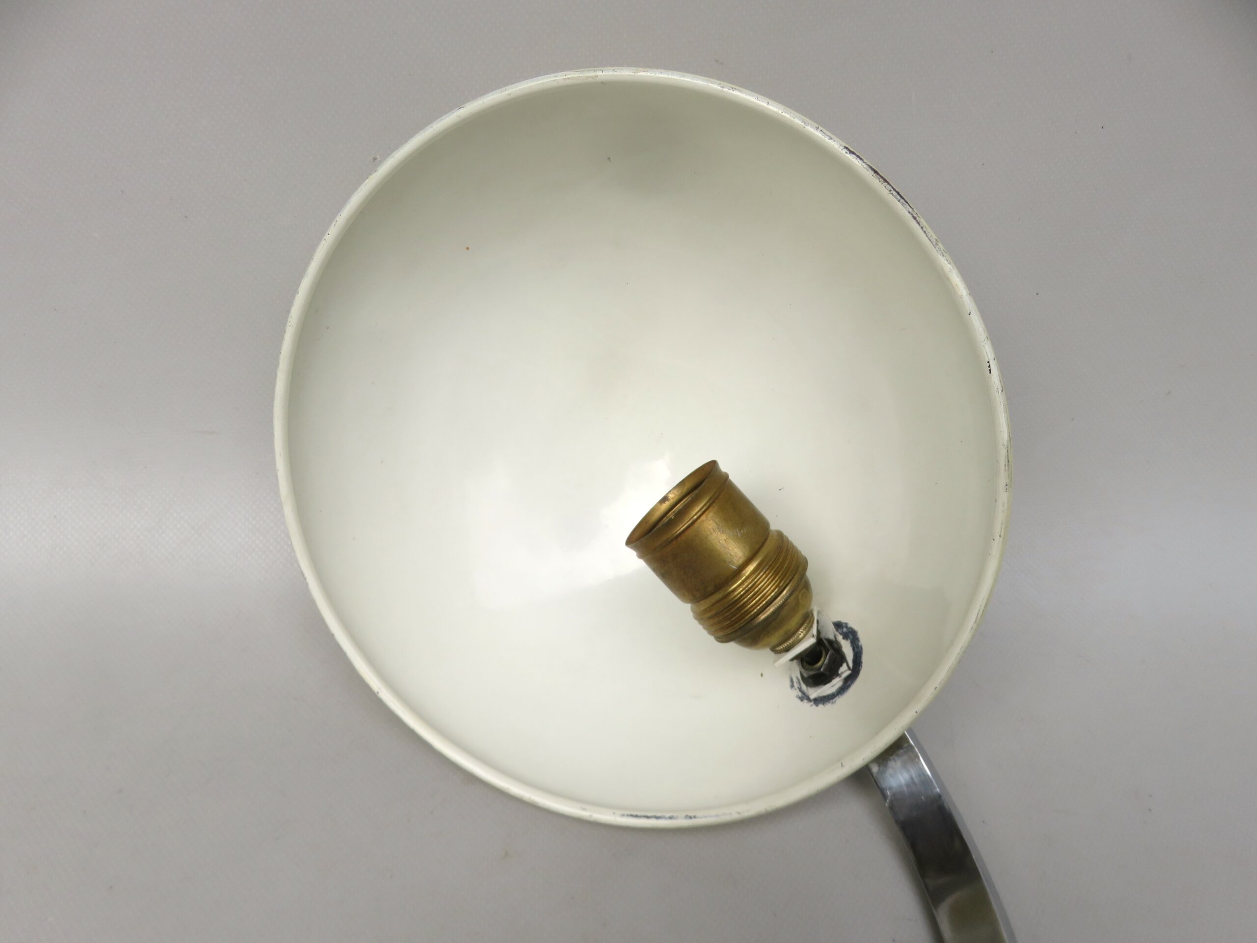 Der Lampenschirm hat einen eingesetzten Reflektor, der weiß lackiert ist und eine E14-Fassung. Der hellbraune Originallack hat einige Gebrauchsspuren. Der Lampenschirm ist im Gelenk neigbar.