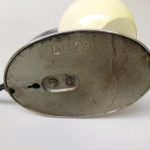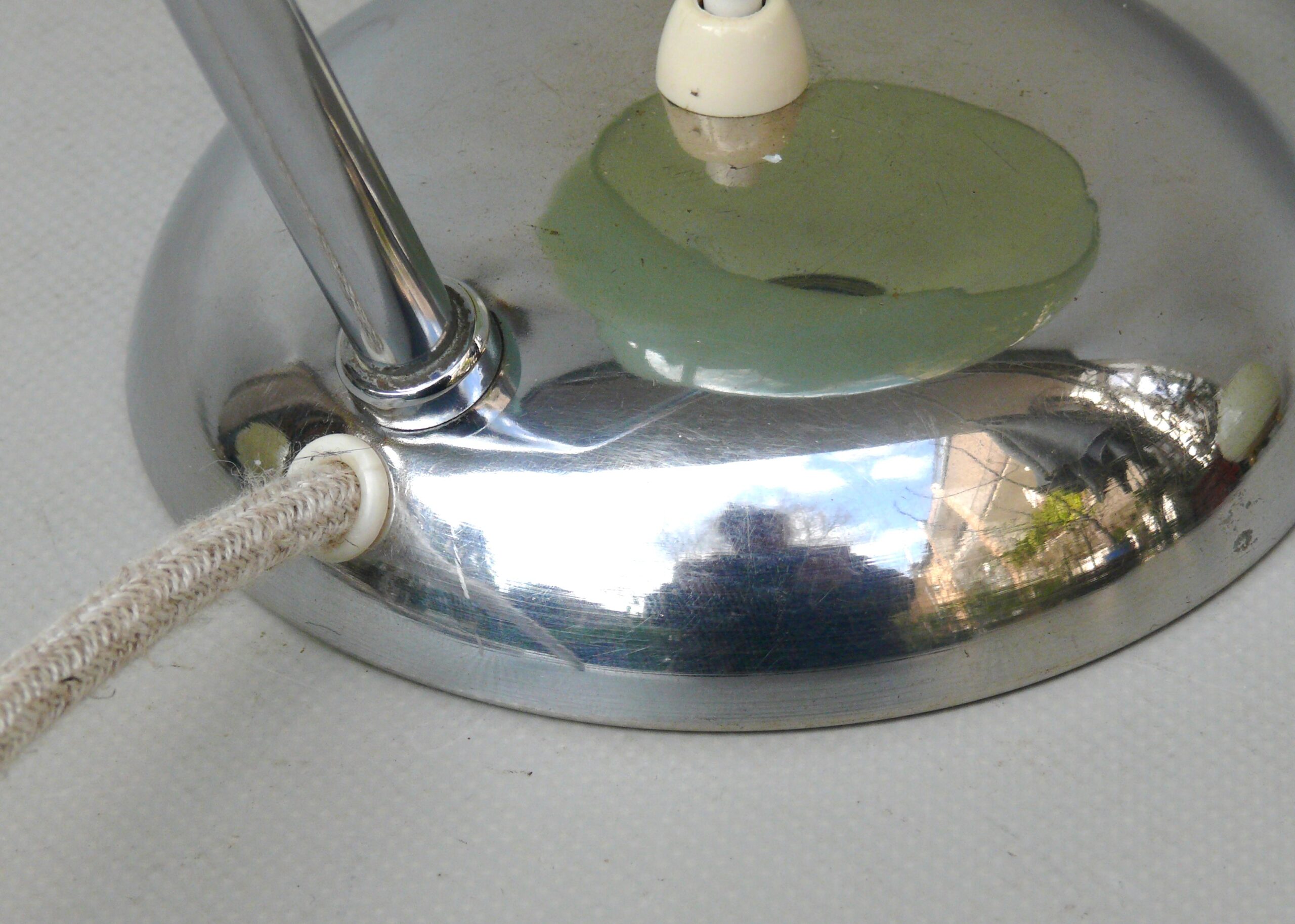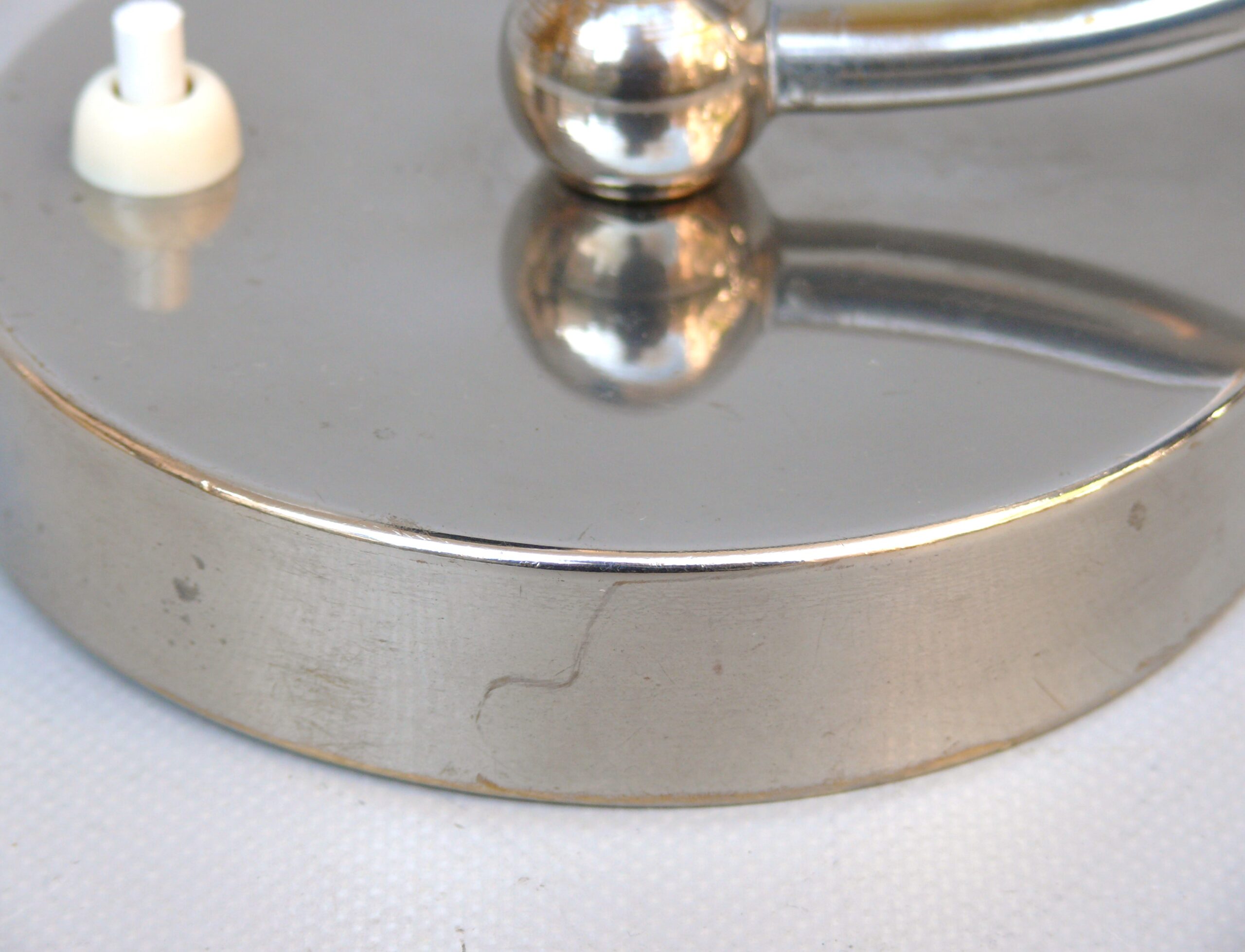 Die Vernickelung weist leichte Spuren der Zeit auf, am Lampenarm sind Druckstellen vorhanden.