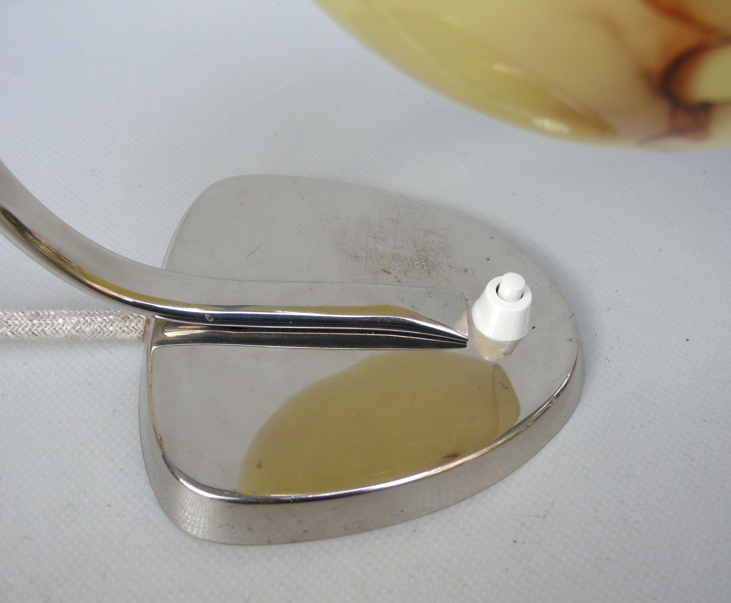 Sie ist hergestellt aus verchromtem Messing. Der in Form und Farbe seltene Lampenschirm ist aus mintgrün-braun geflammten Überfangglas.