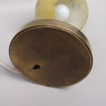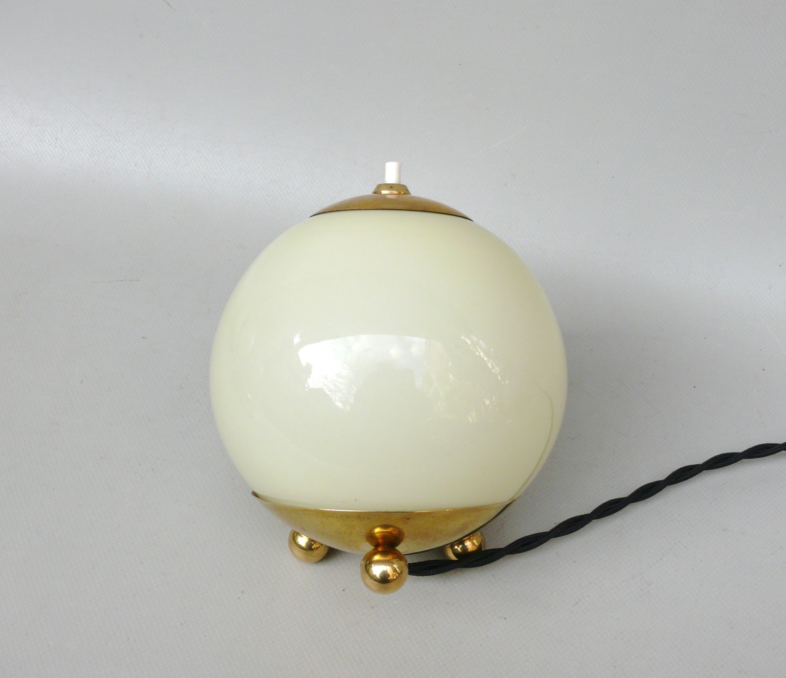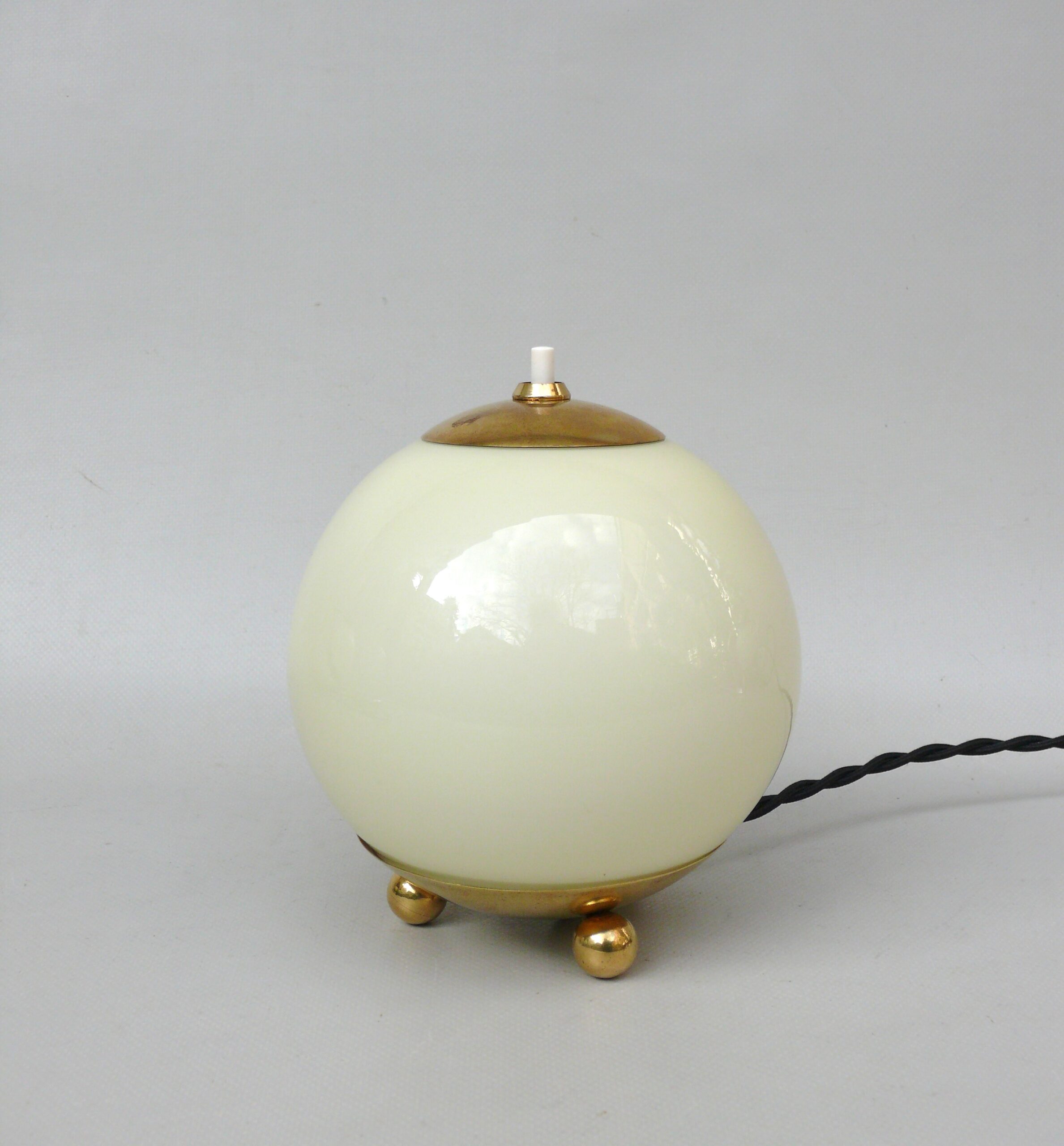 Der Lampenschirm aus beigem Überfangglas sitzt auf einer Messingschale, die auf 3 Kugelfüßen ruht. Der Schalter sitzt oben auf dem Lampenschirm auf einer kleinen Messingschale.