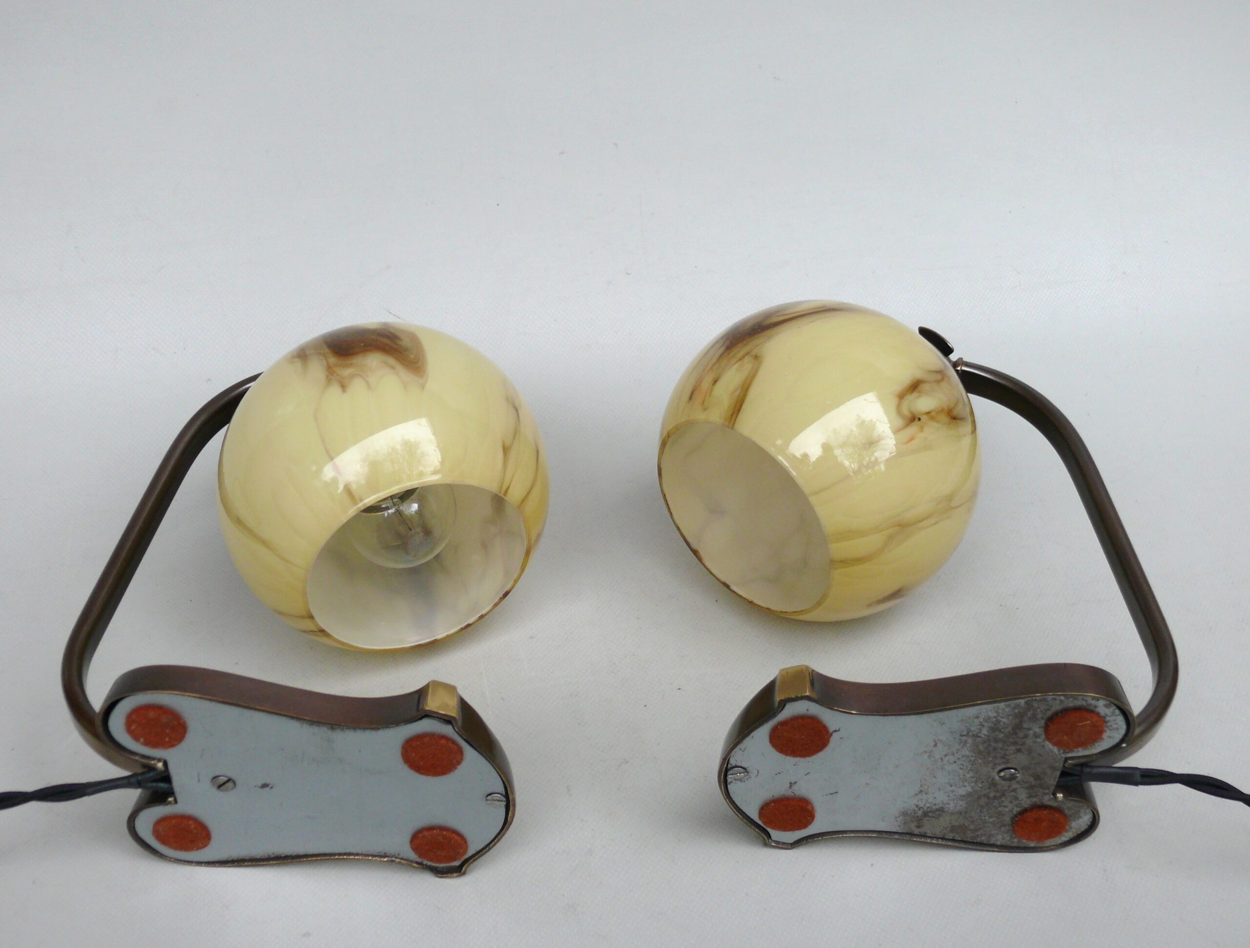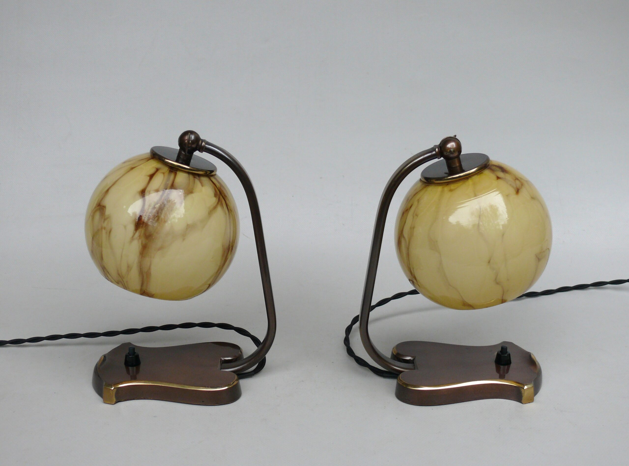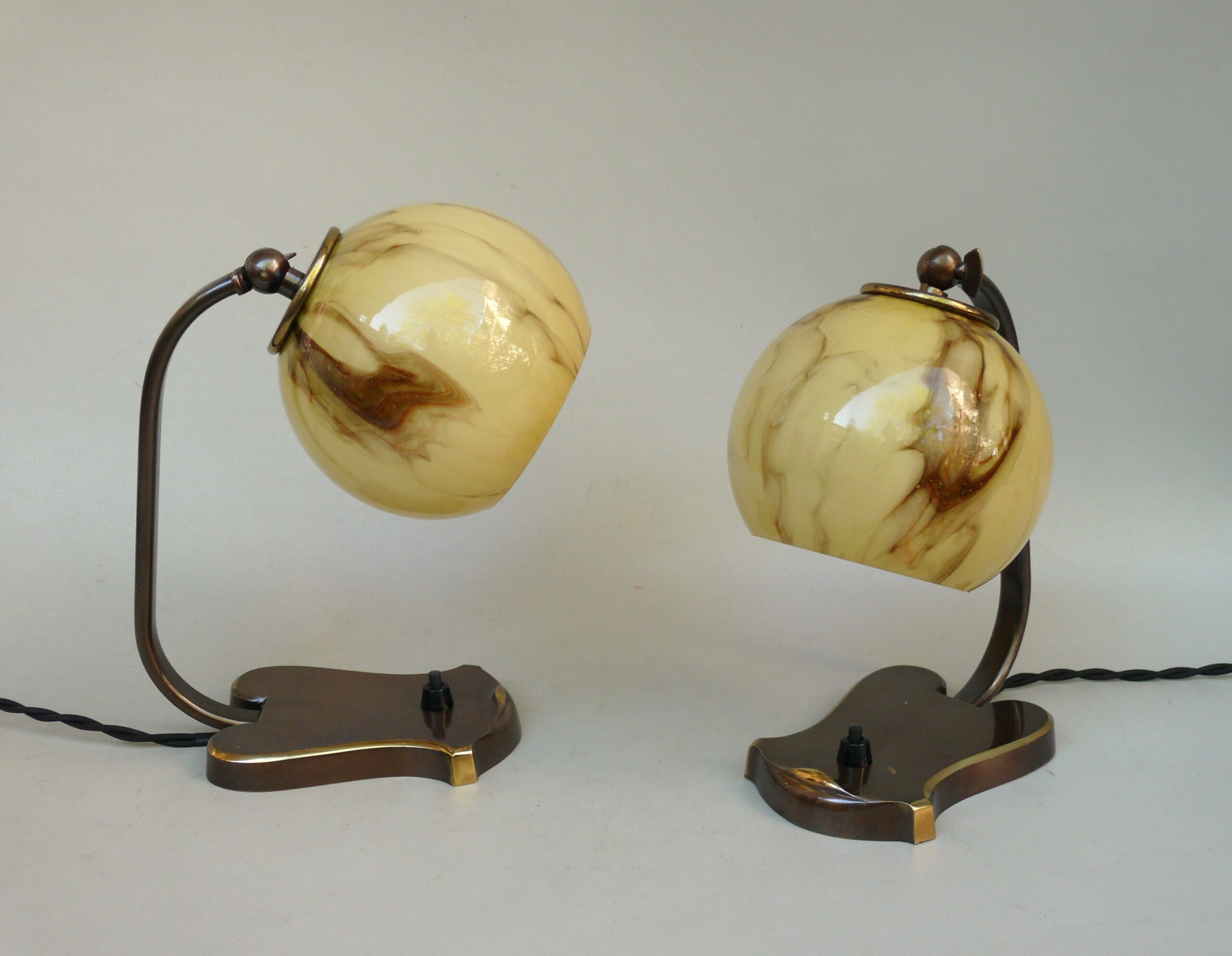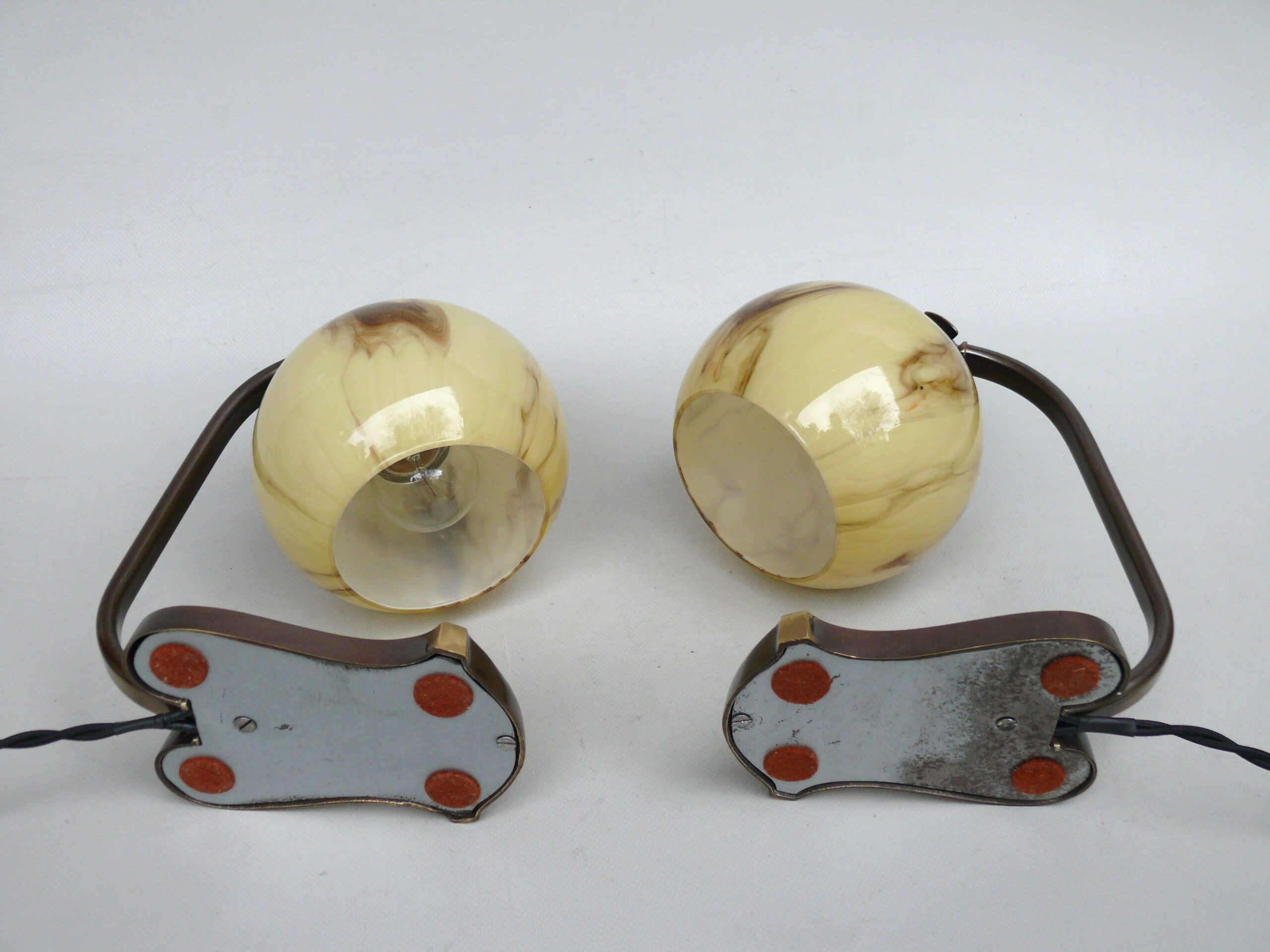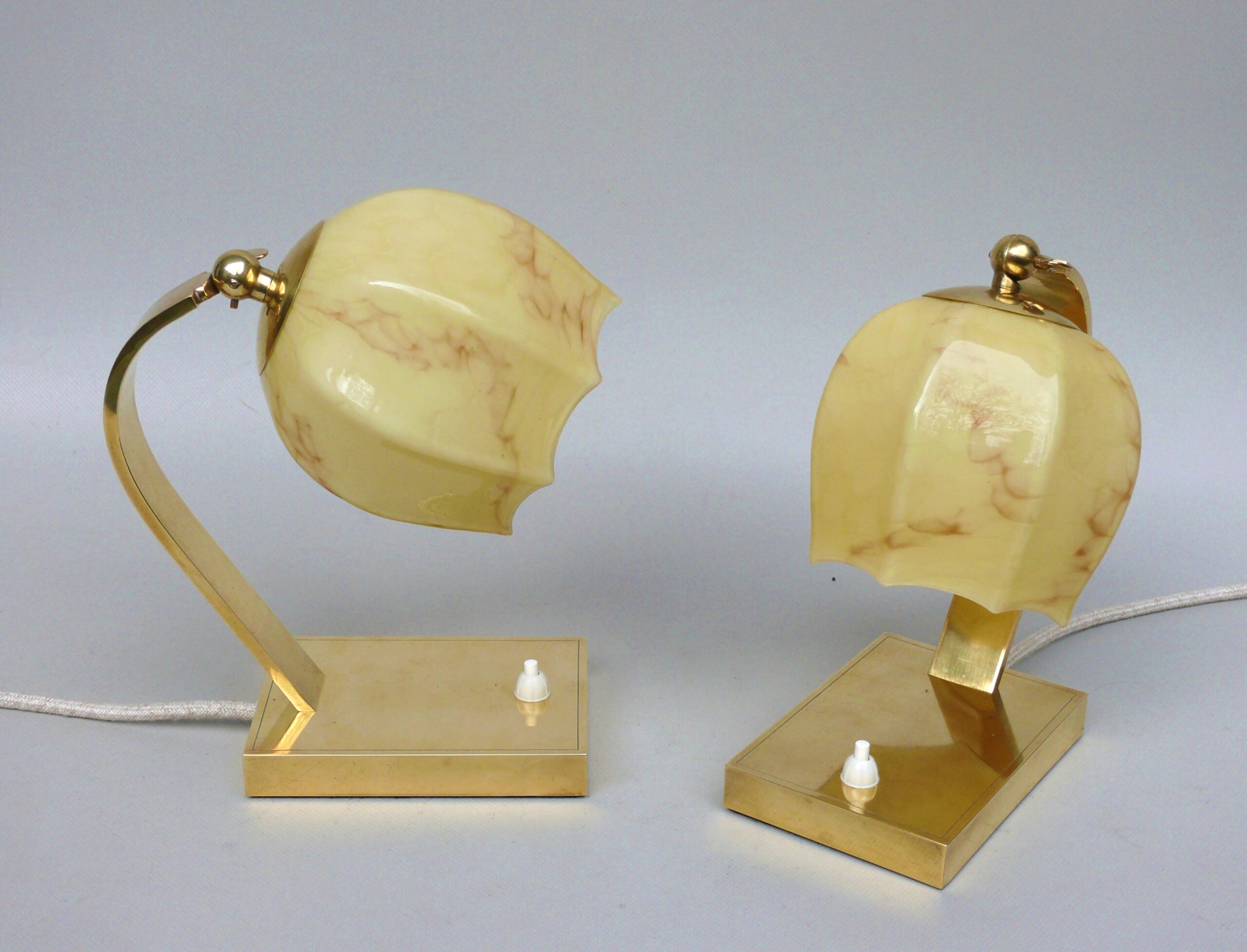 Ein Paar außergewöhnliche Nachttischleuchten aus der Zeit des Art Deco. Außergewöhnlich sind die Ausformung der Lampenschirme aus beigem Überfangglas, die an einen Blütenkelch erinnern. Diese werden umschlossen von 2 Armen, die sie an einem Gelenk halten und die Schirme dadurch schwenkbar sind.