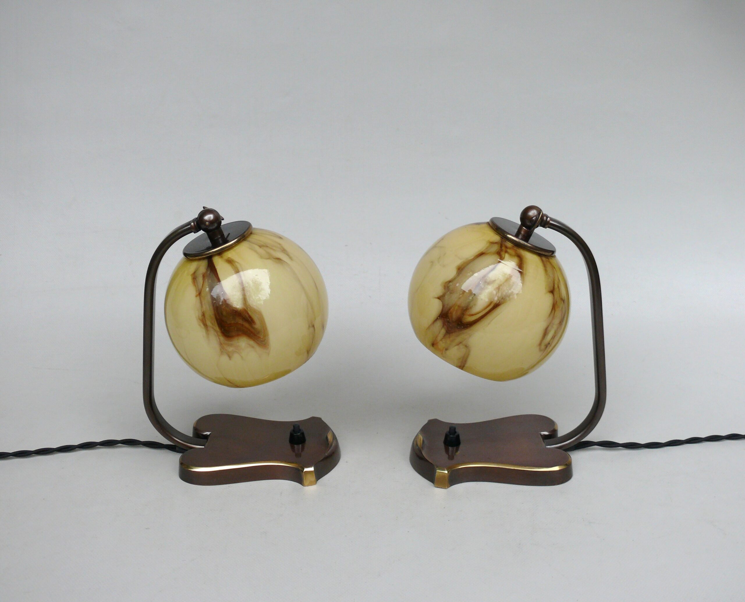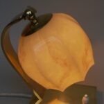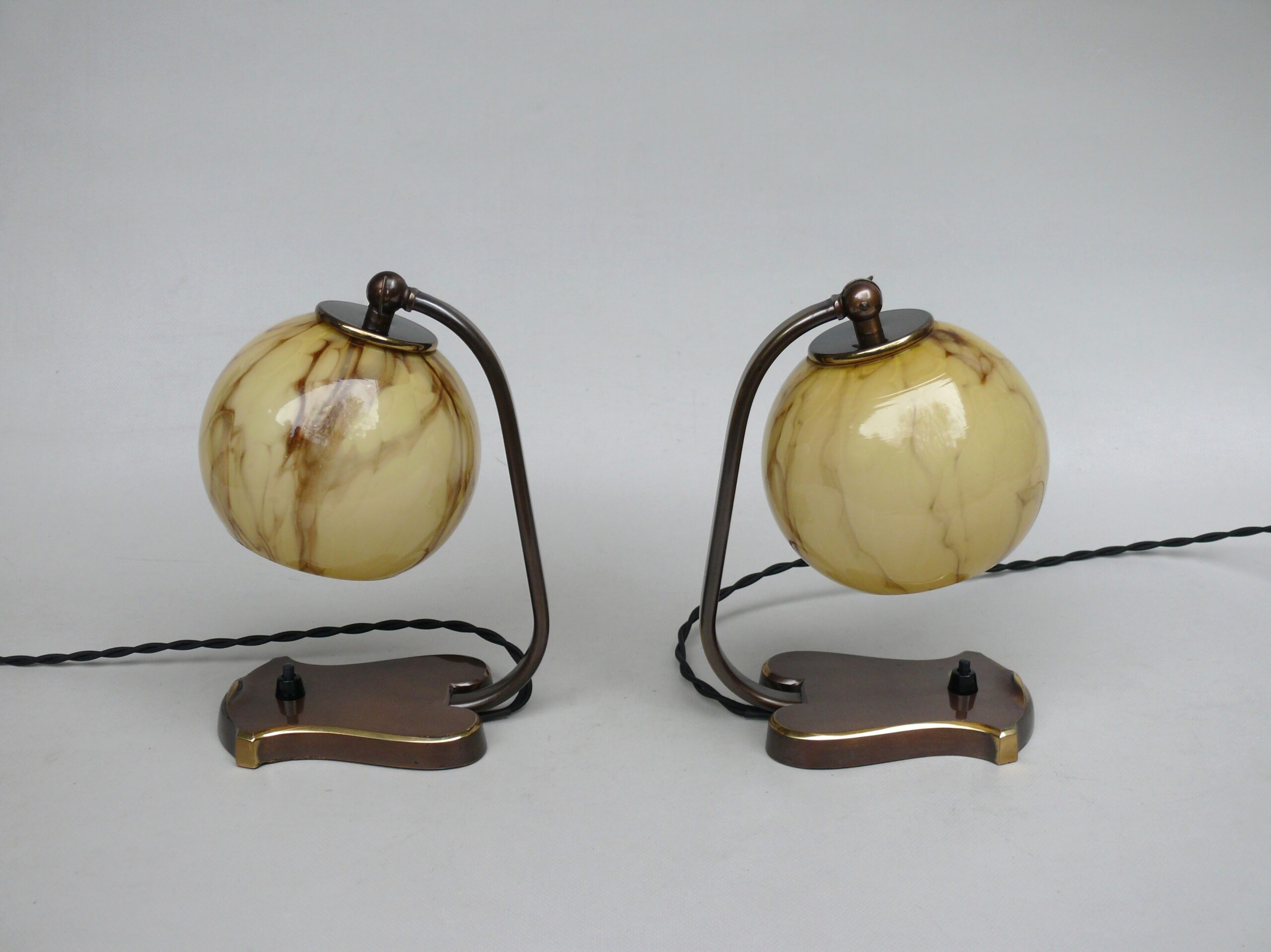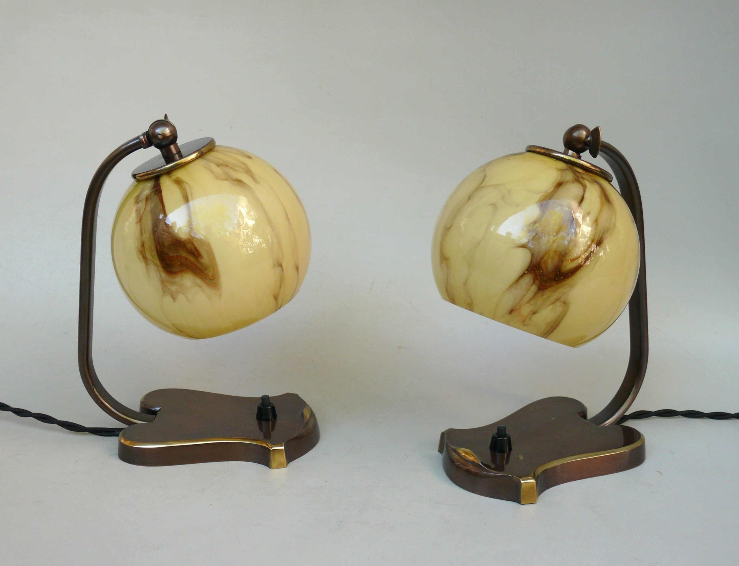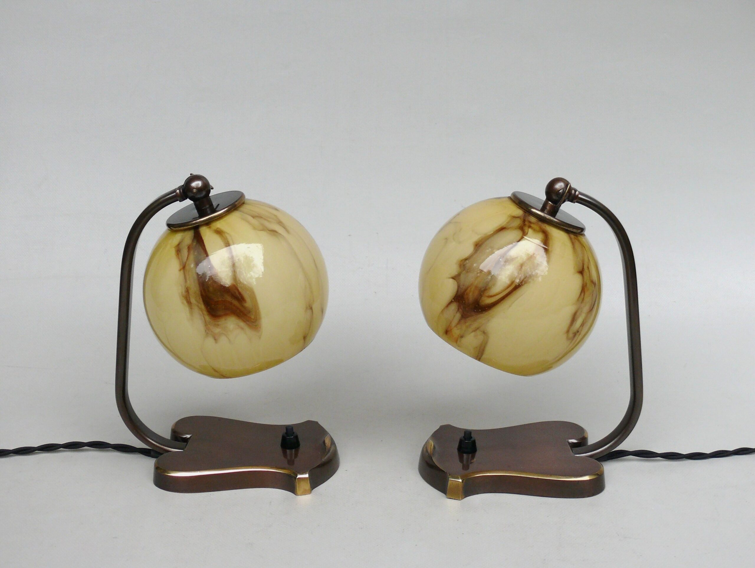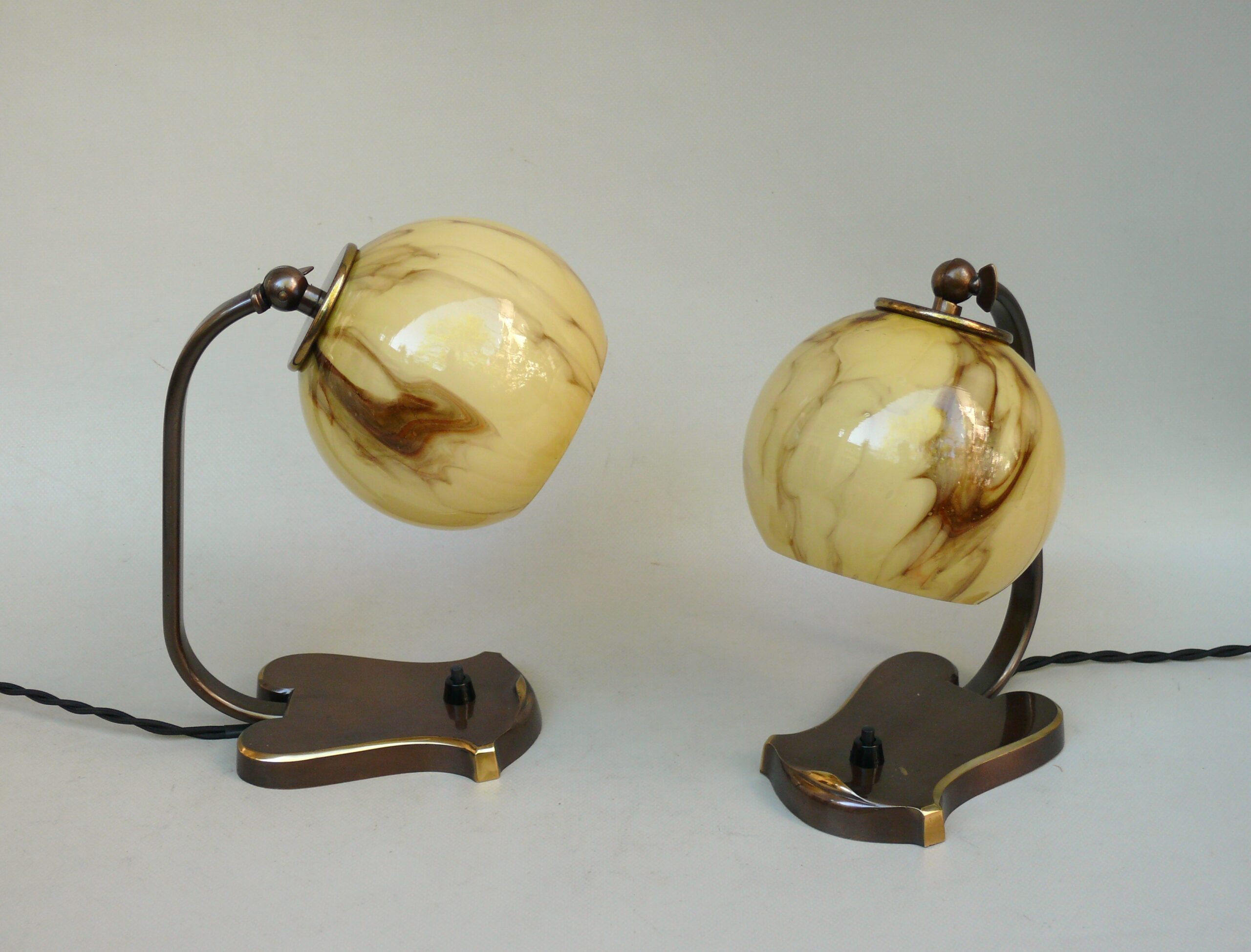Ein Paar außergewöhnliche Nachttischleuchten aus der Zeit des Art Deco. Außergewöhnlich sind die Ausformung der Lampenschirme aus beigem Überfangglas, die an einen Blütenkelch erinnern. Diese werden umschlossen von 2 Armen, die sie an einem Gelenk halten und die Schirme dadurch schwenkbar sind.