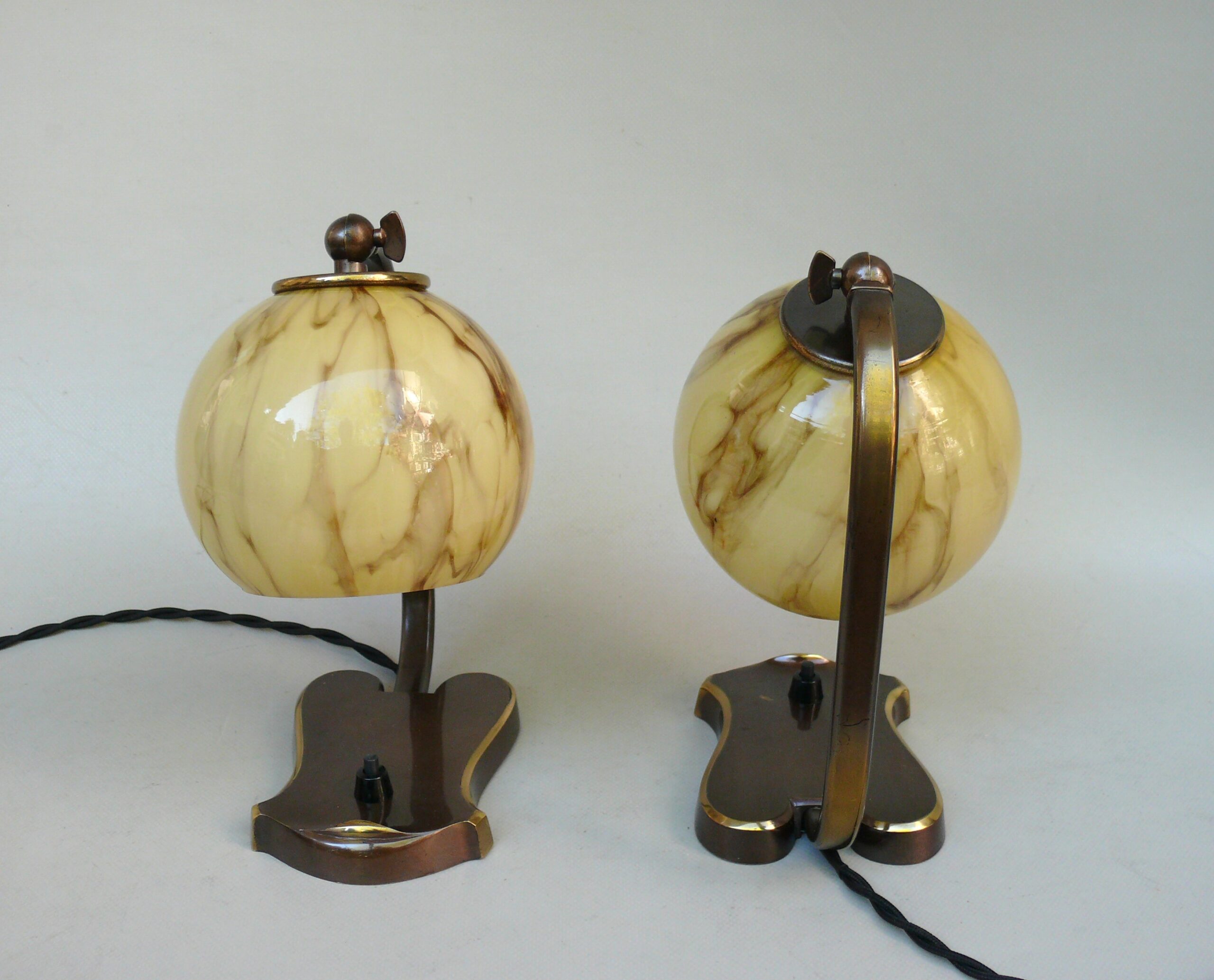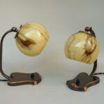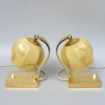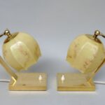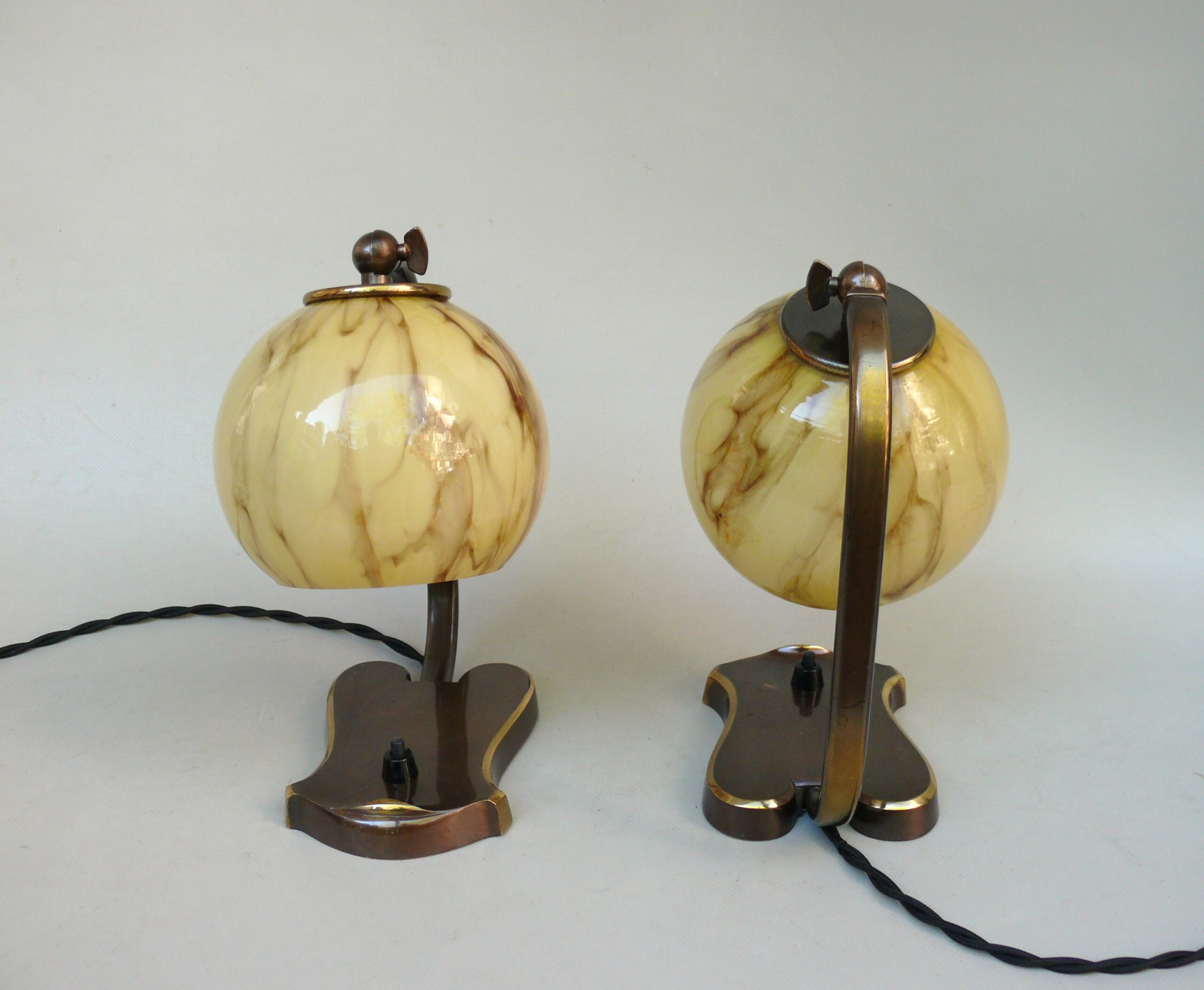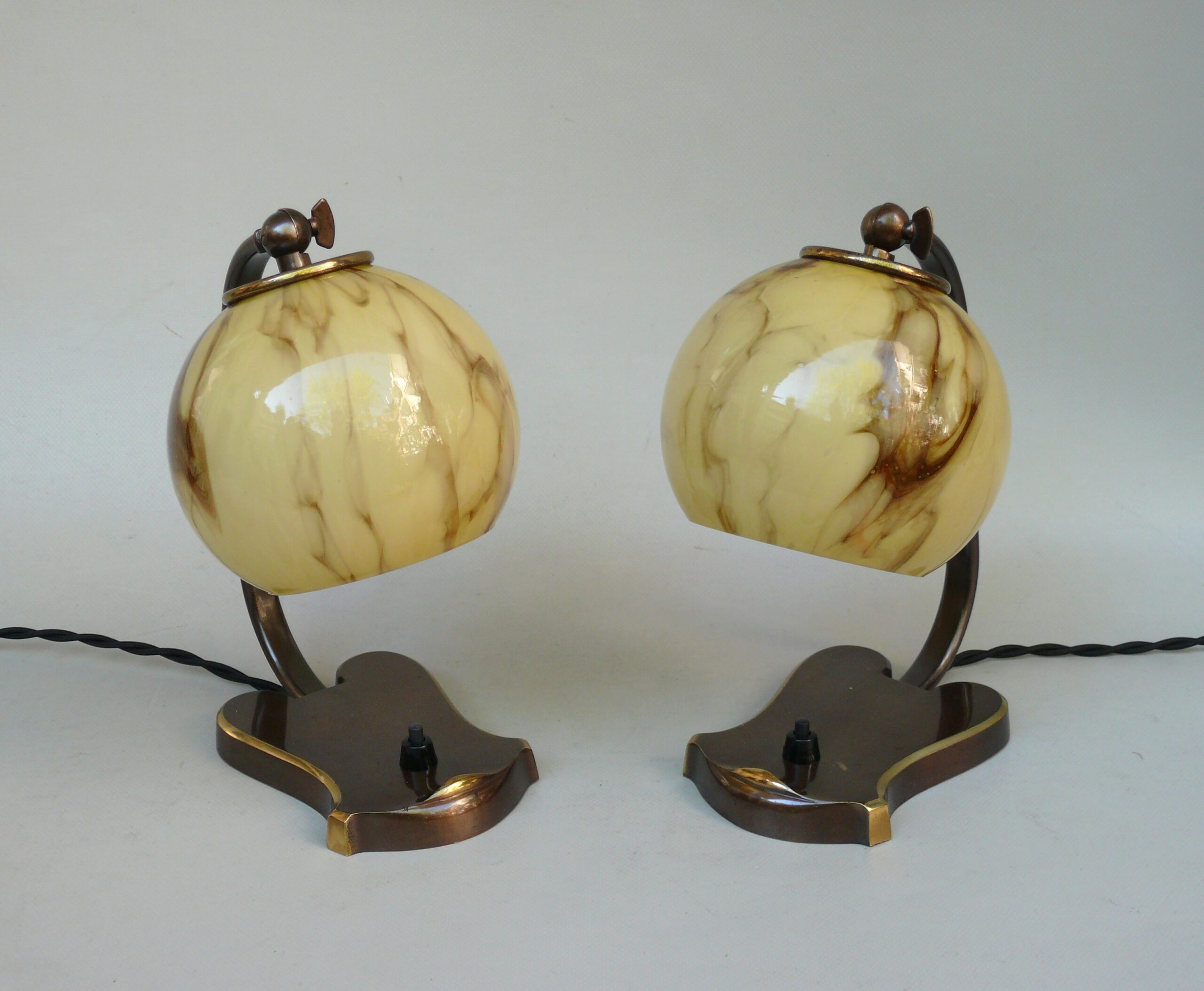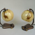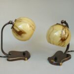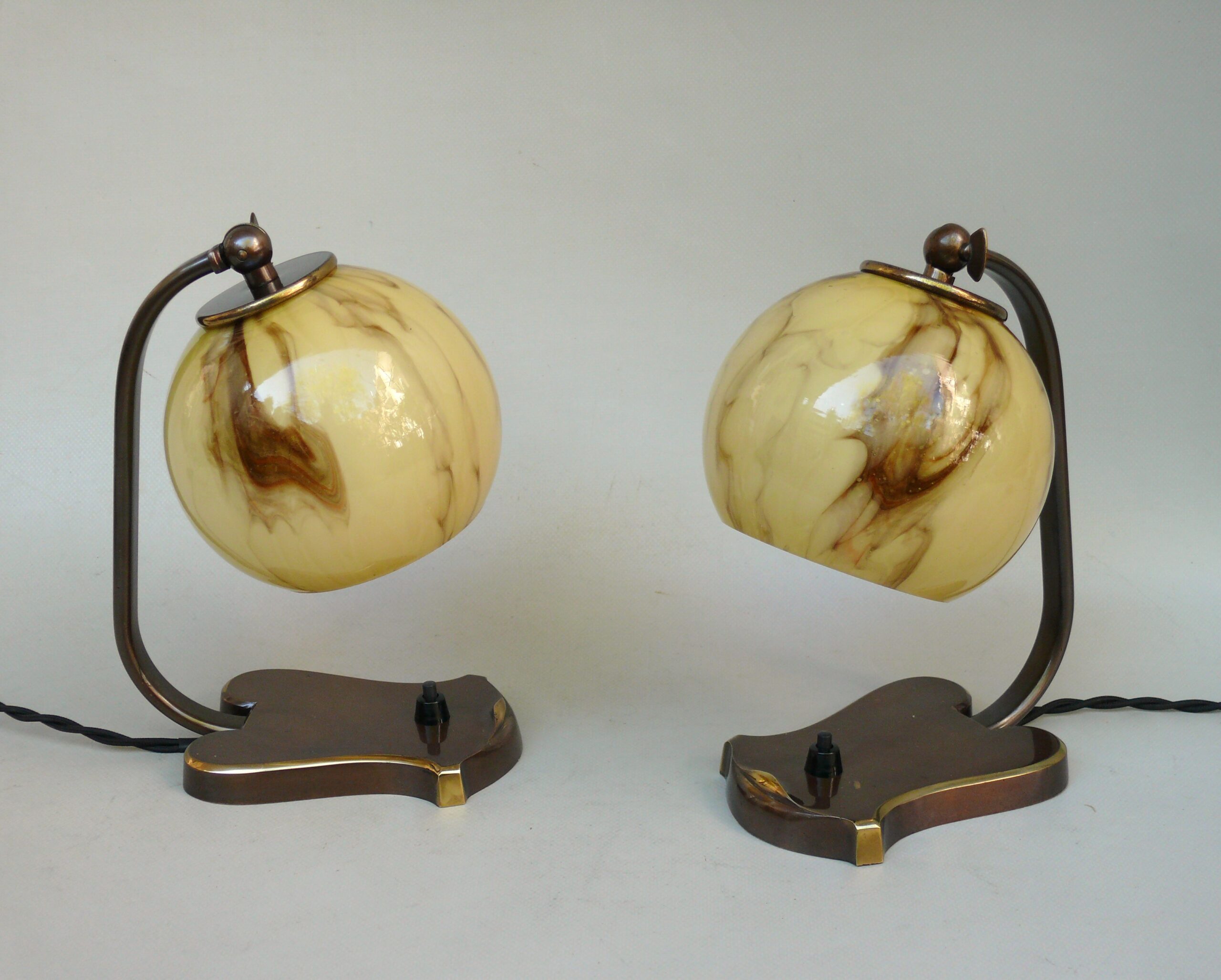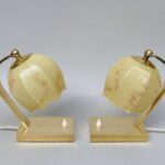 Ein Paar außergewöhnliche Nachttischleuchten aus der Zeit des Art Deco. Außergewöhnlich sind die Ausformung der Lampenschirme aus beigem Überfangglas, die an einen Blütenkelch erinnern. Diese werden umschlossen von 2 Armen, die sie an einem Gelenk halten und die Schirme dadurch schwenkbar sind.