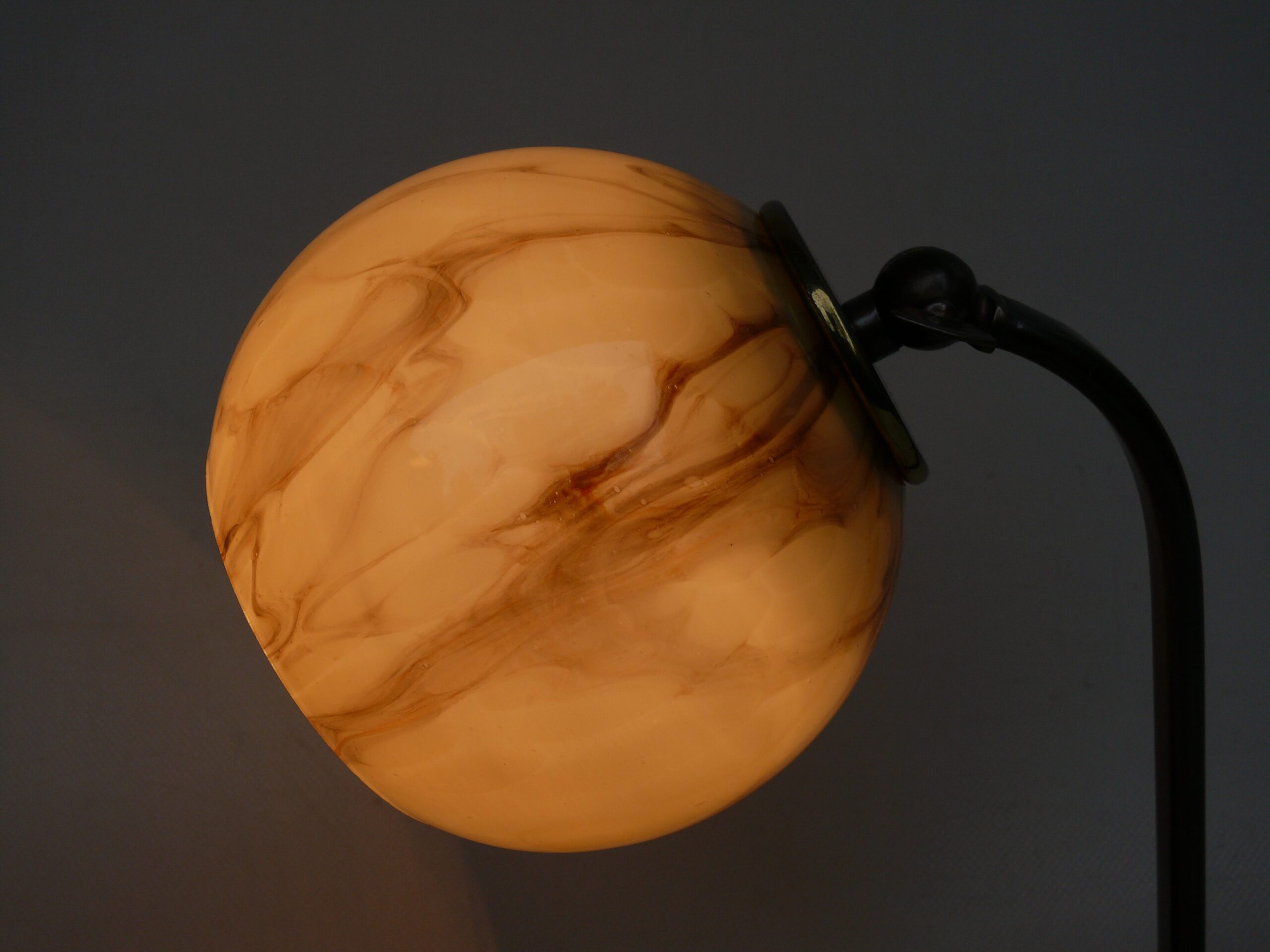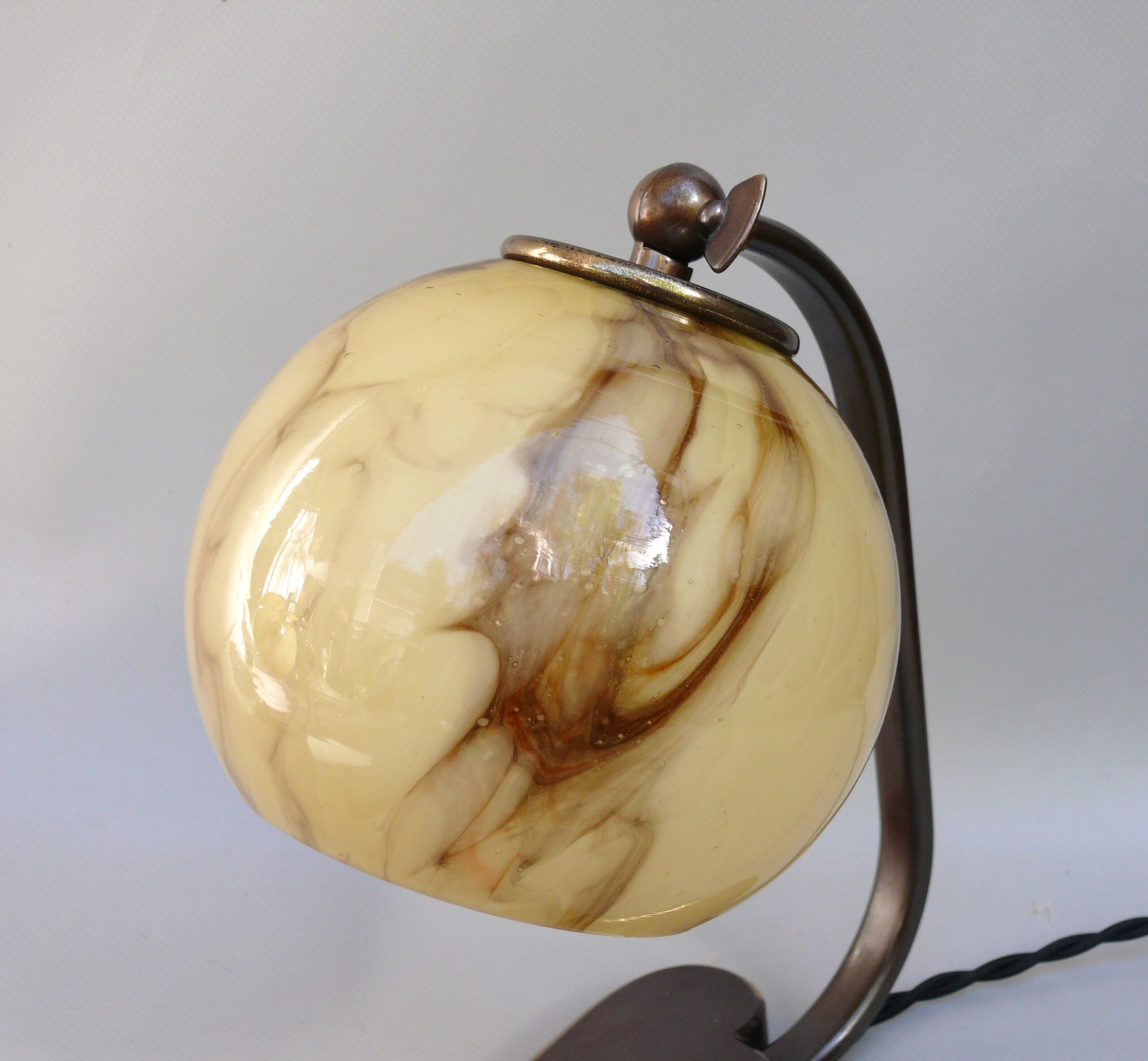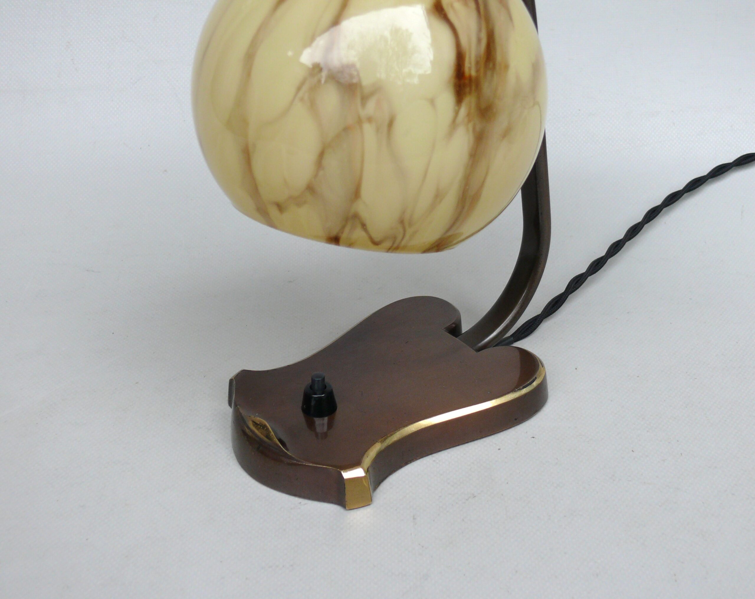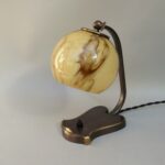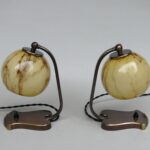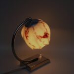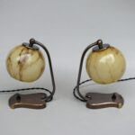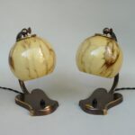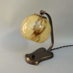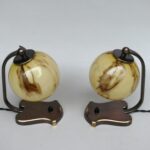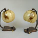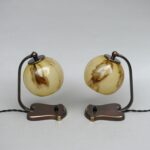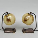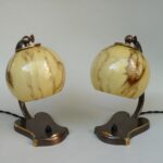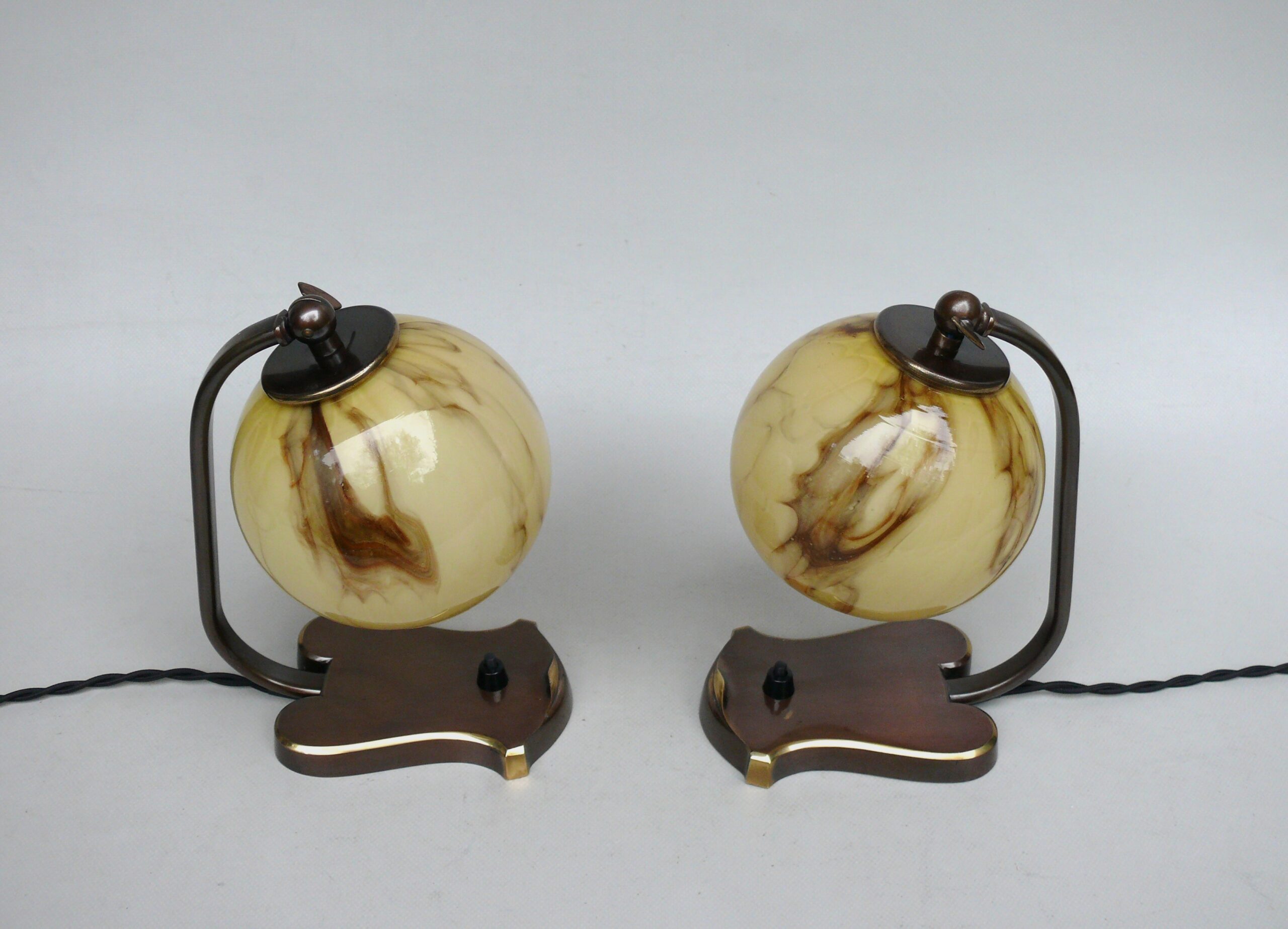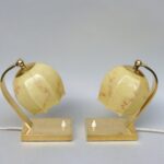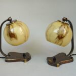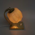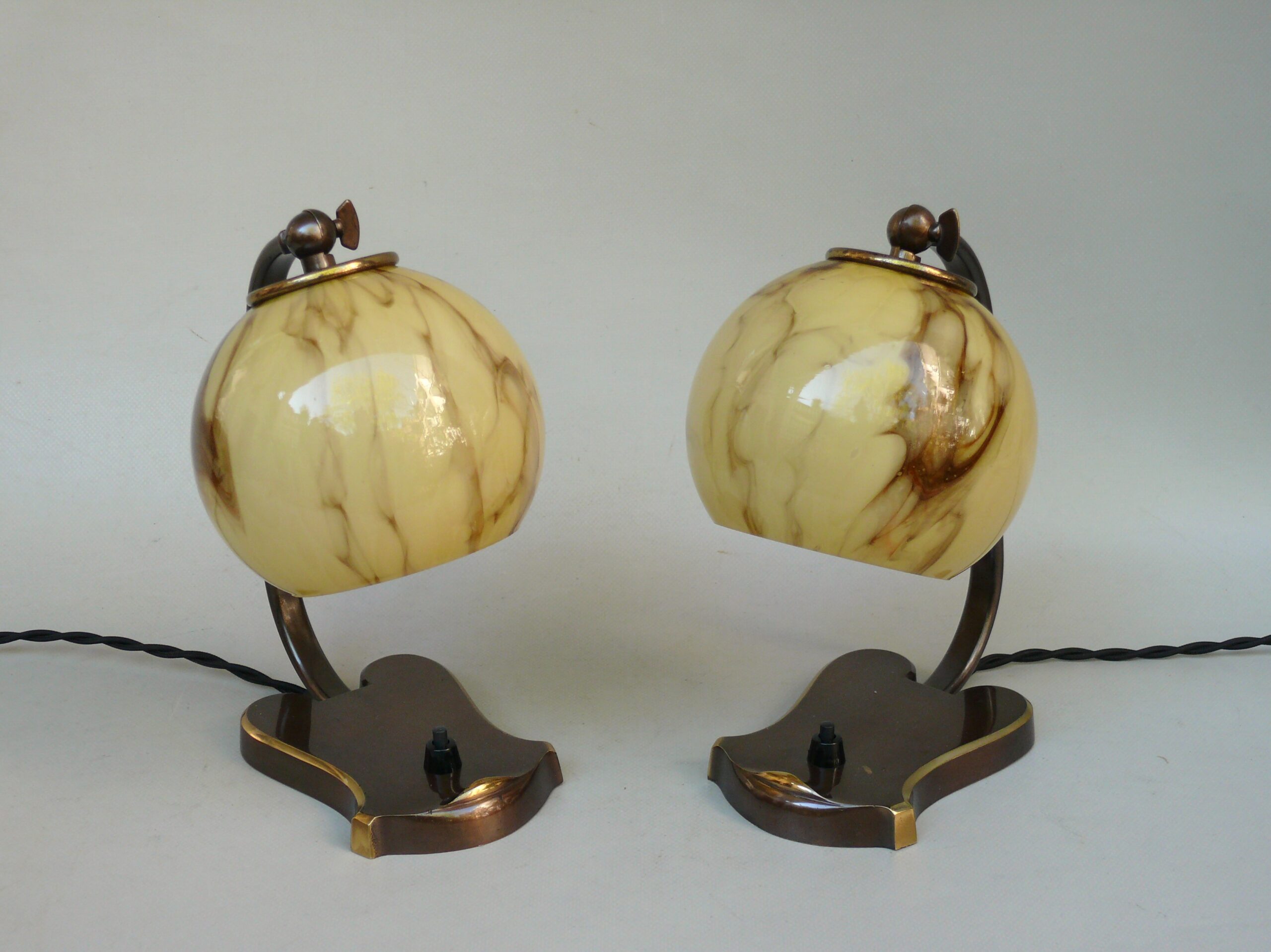 Ein Paar außergewöhnliche Nachttischleuchten aus der Zeit des Art Deco. Außergewöhnlich sind die Ausformung der Lampenschirme aus beigem Überfangglas, die an einen Blütenkelch erinnern. Diese werden umschlossen von 2 Armen, die sie an einem Gelenk halten und die Schirme dadurch schwenkbar sind.
