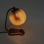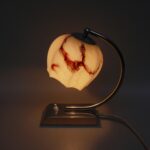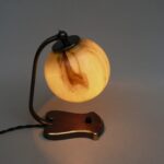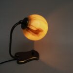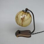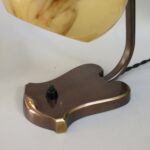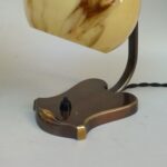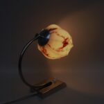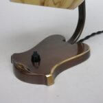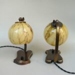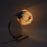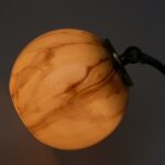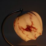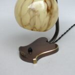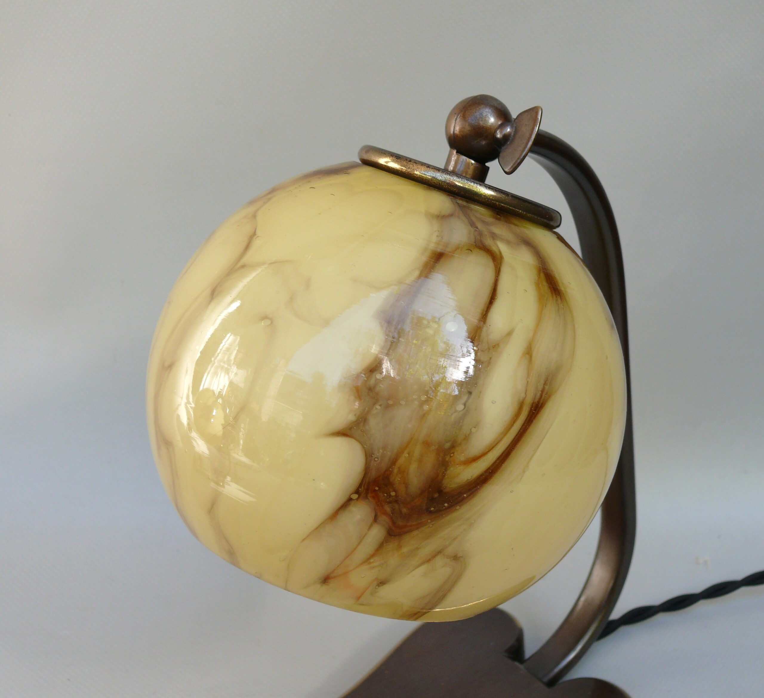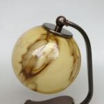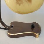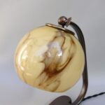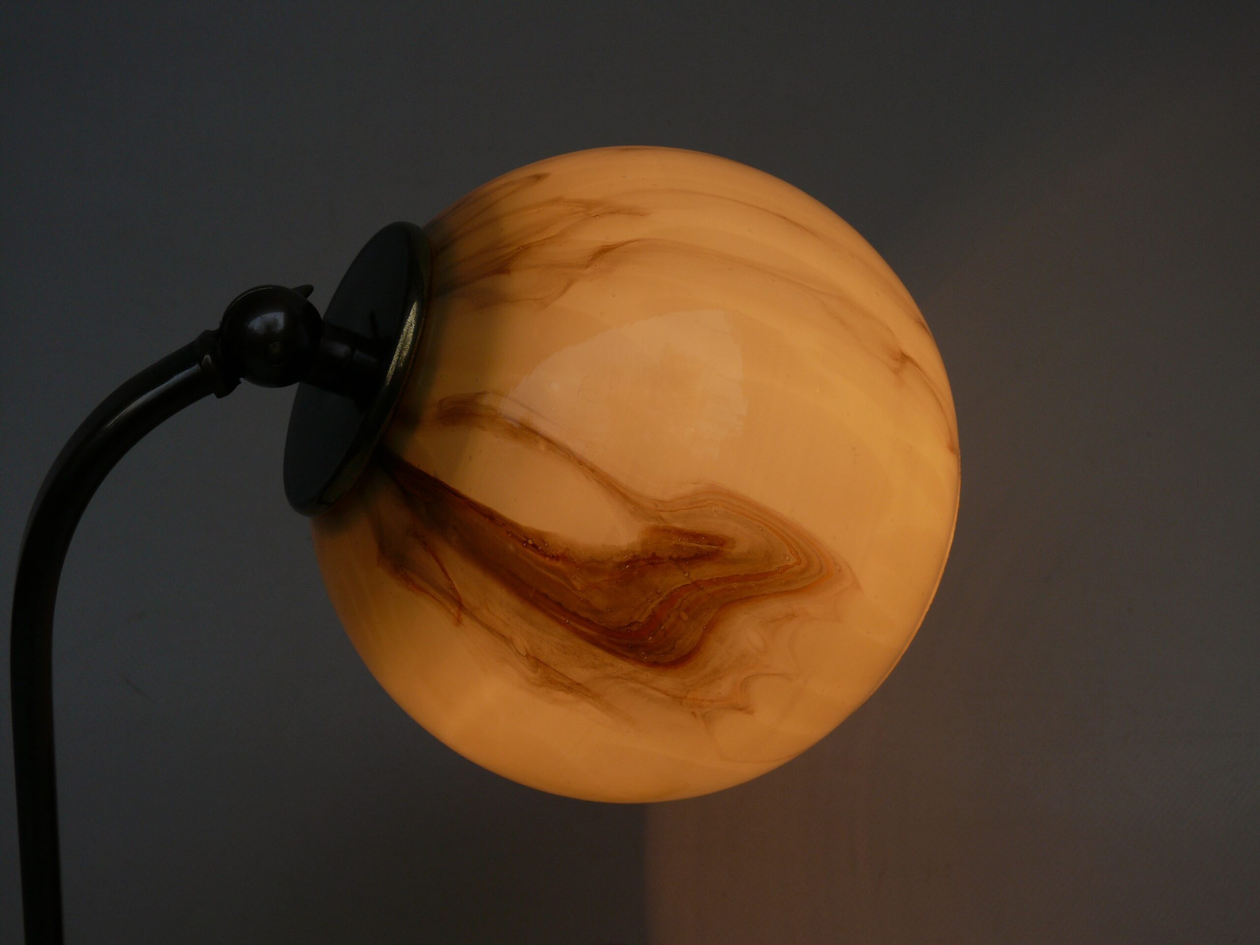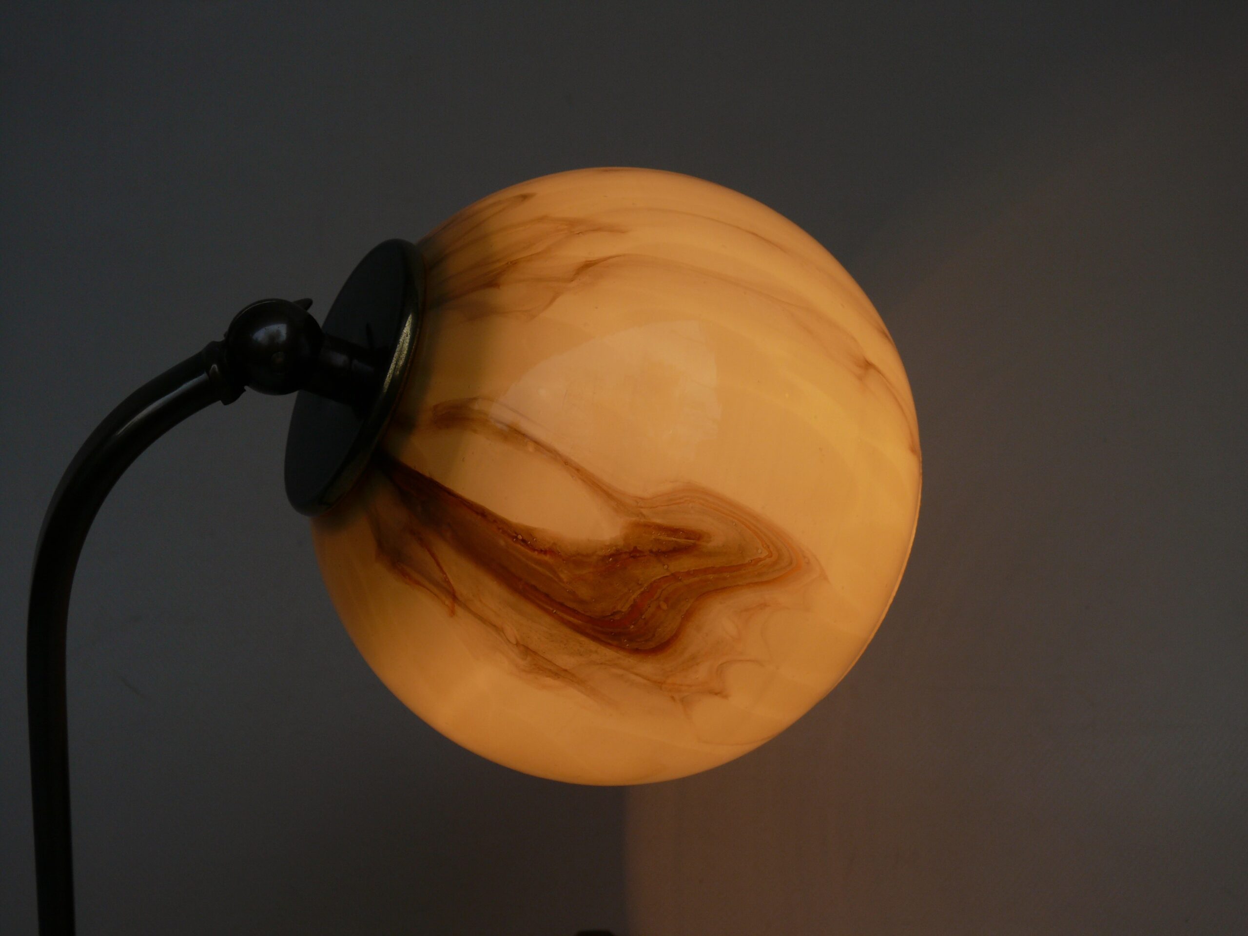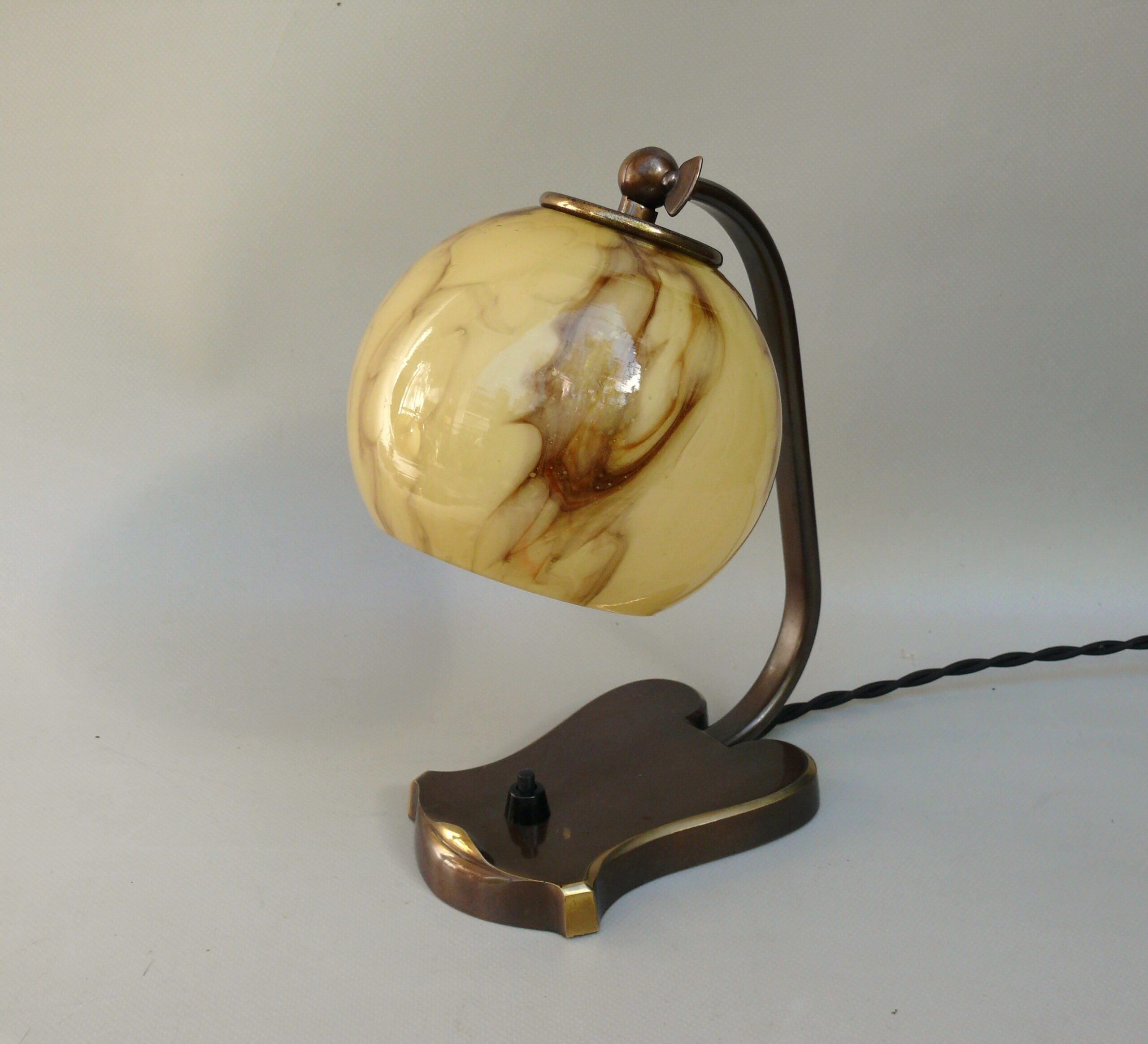 Ein Paar außergewöhnliche Nachttischleuchten aus der Zeit des Art Deco. Außergewöhnlich sind die Ausformung der Lampenschirme aus beigem Überfangglas, die an einen Blütenkelch erinnern. Diese werden umschlossen von 2 Armen, die sie an einem Gelenk halten und die Schirme dadurch schwenkbar sind.