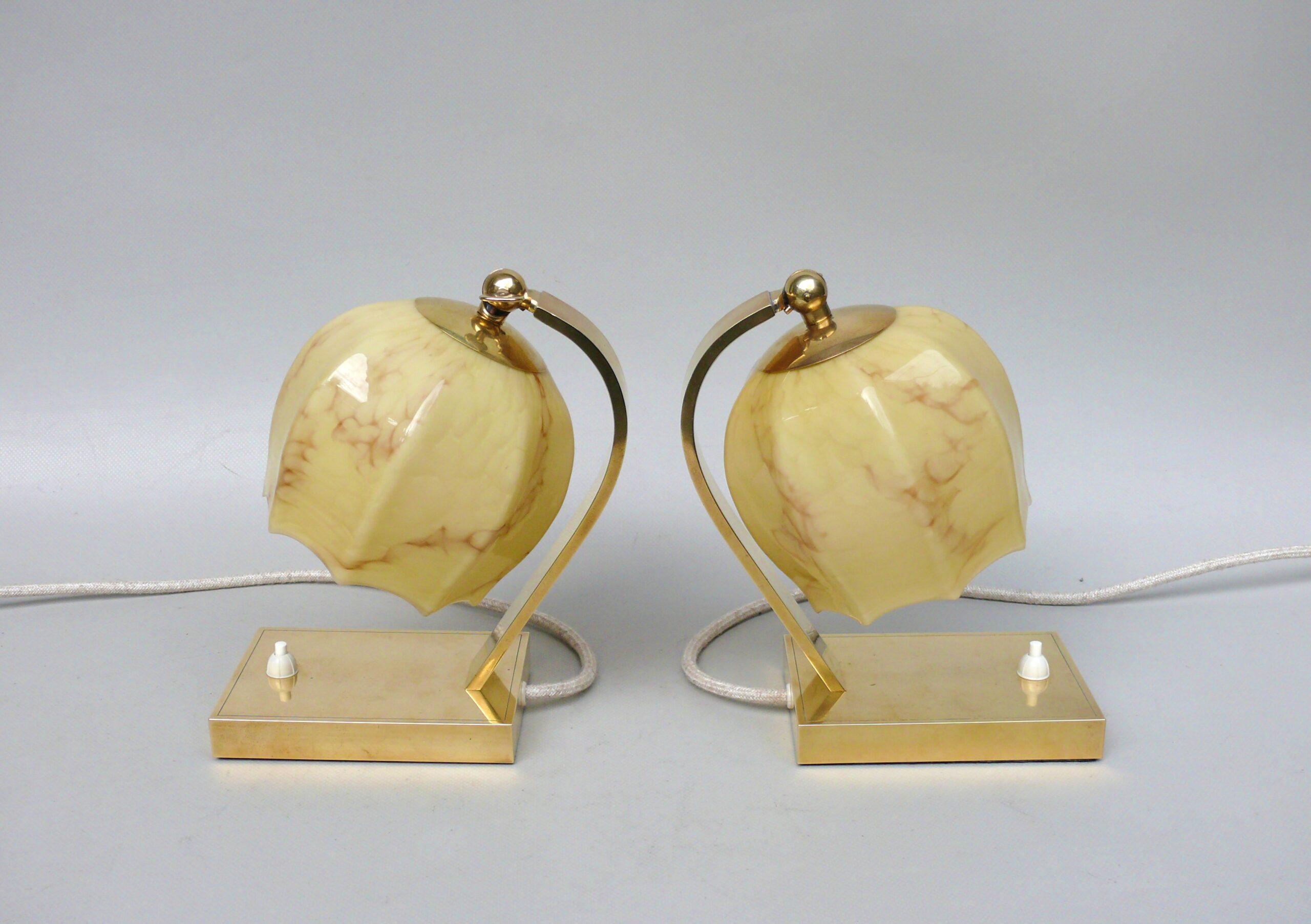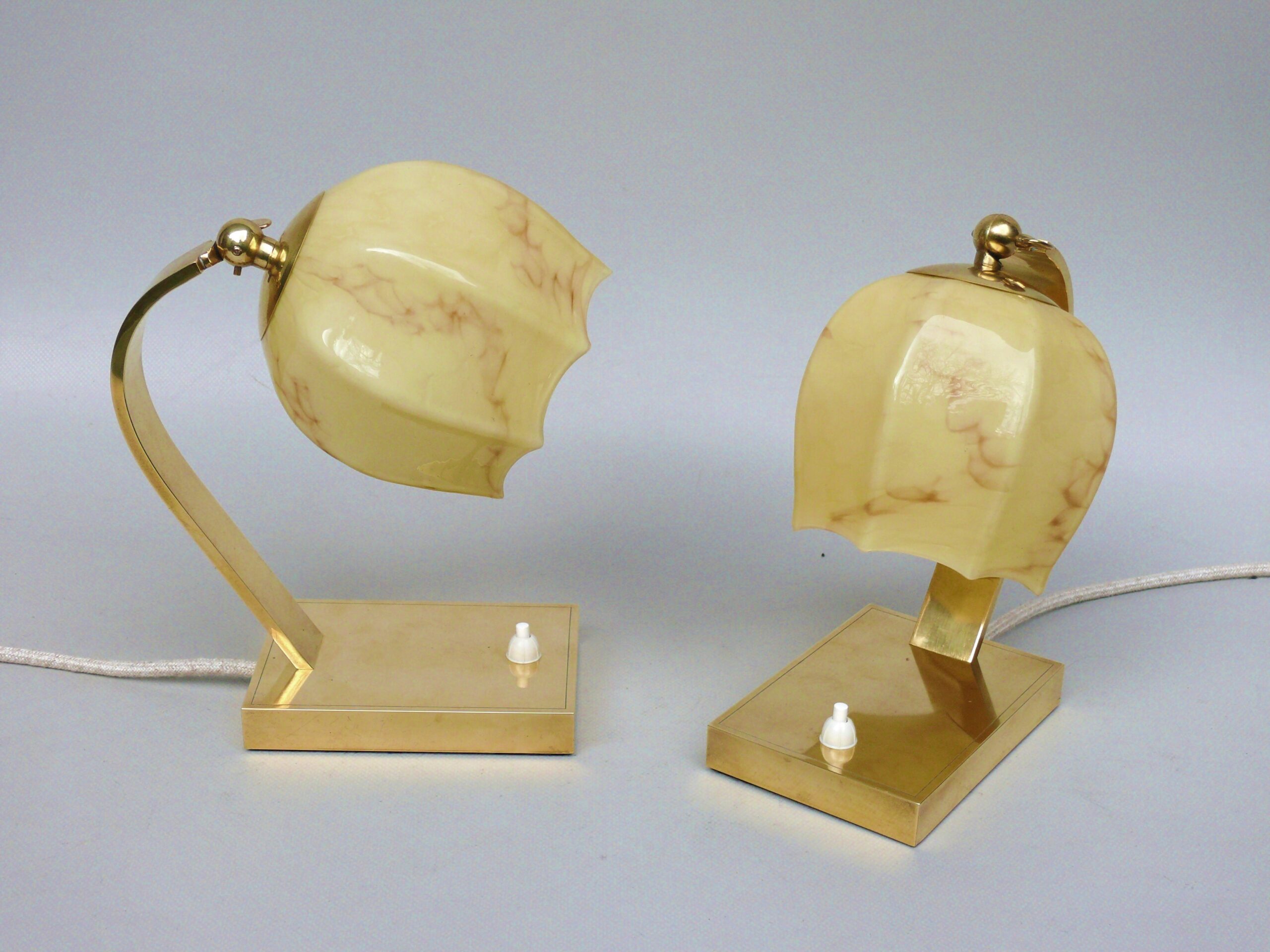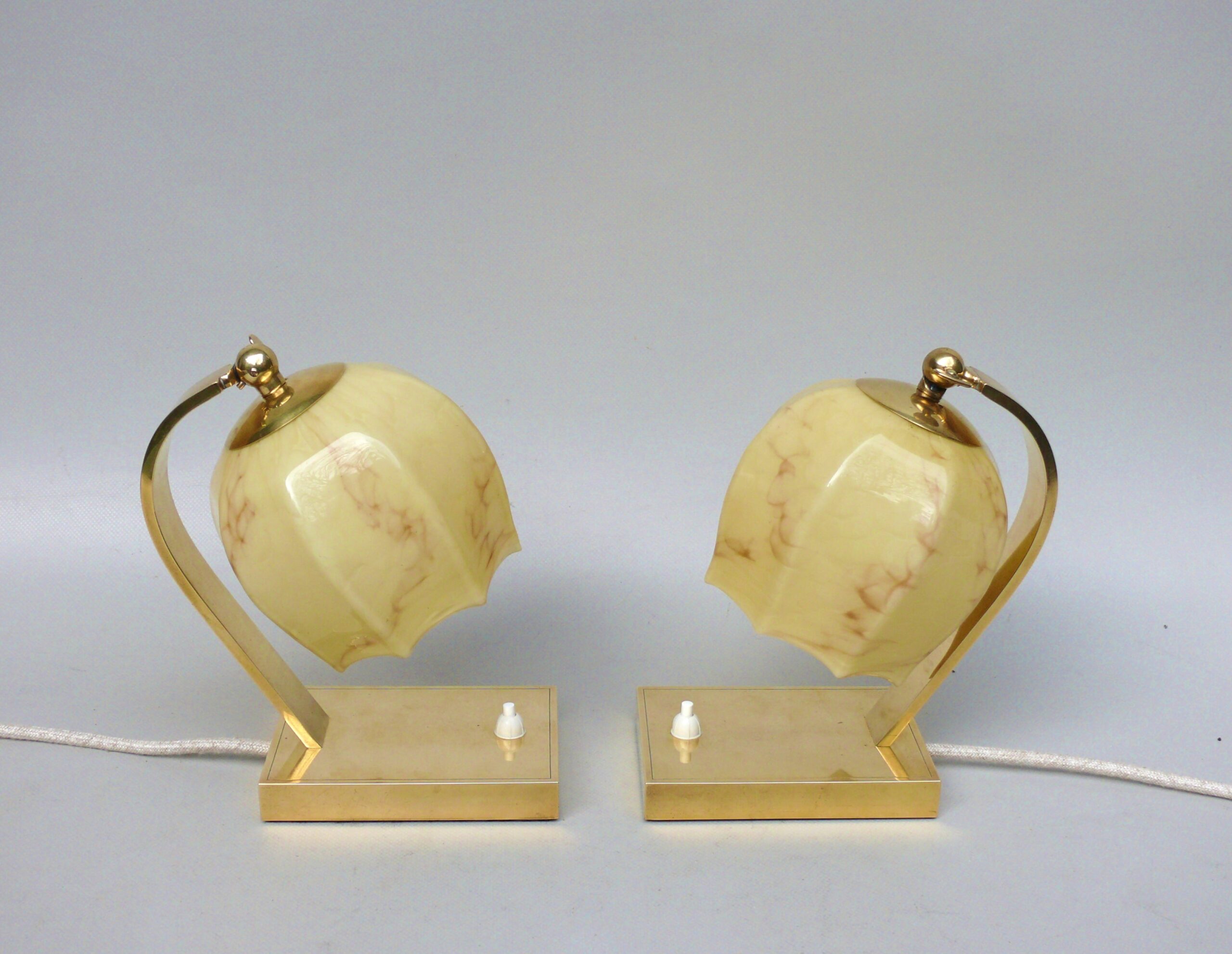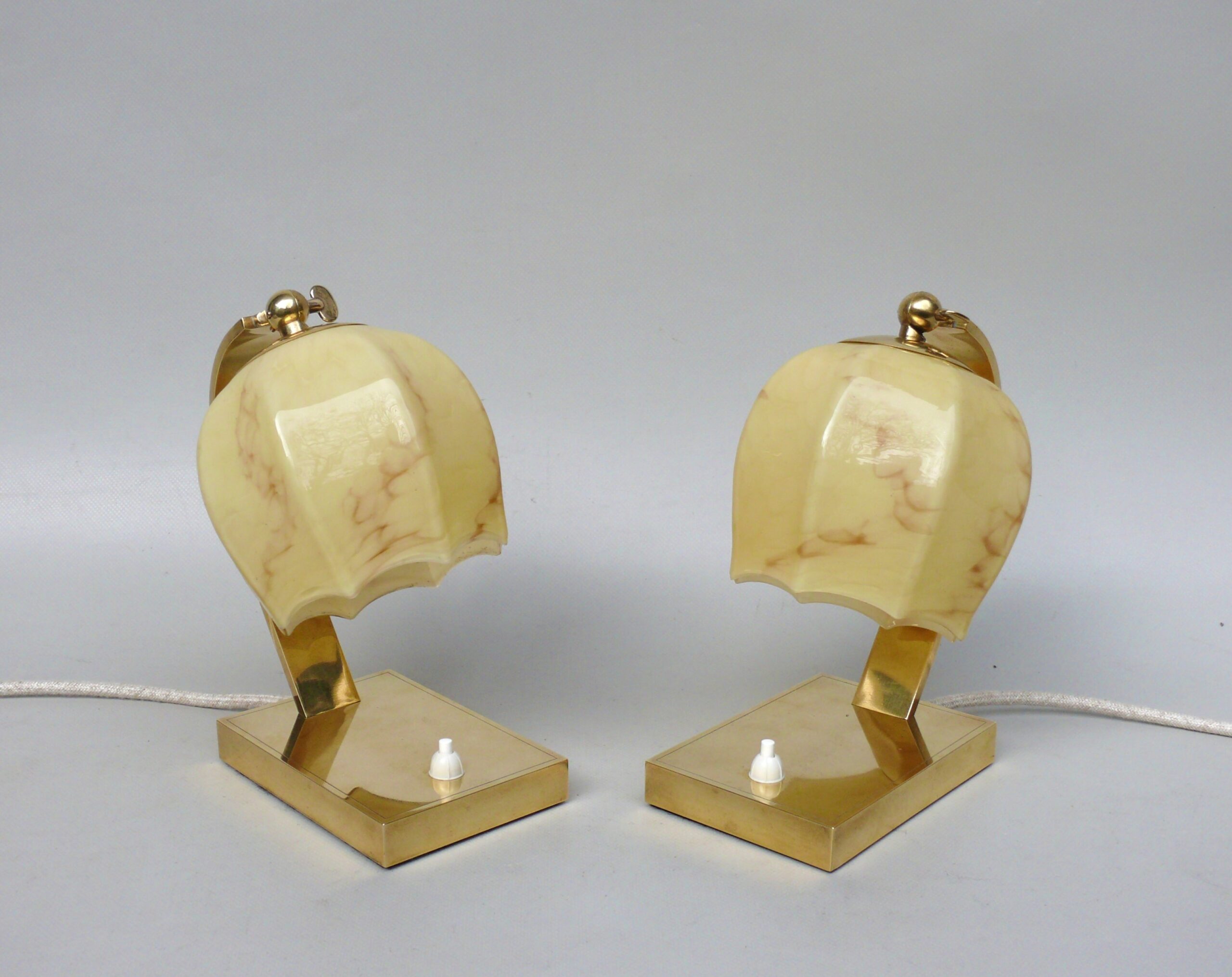 NP16 – 1 Paar Nachttischleuchten, Art Deco, Messing, Überfanglasschirme beige