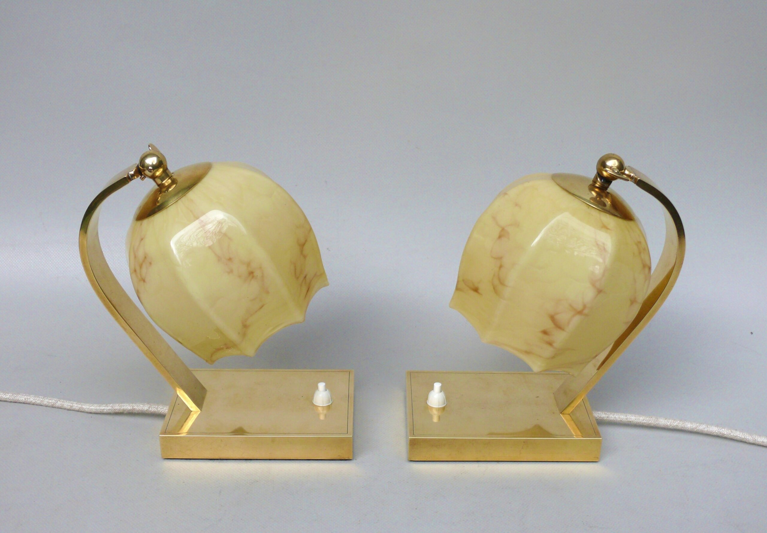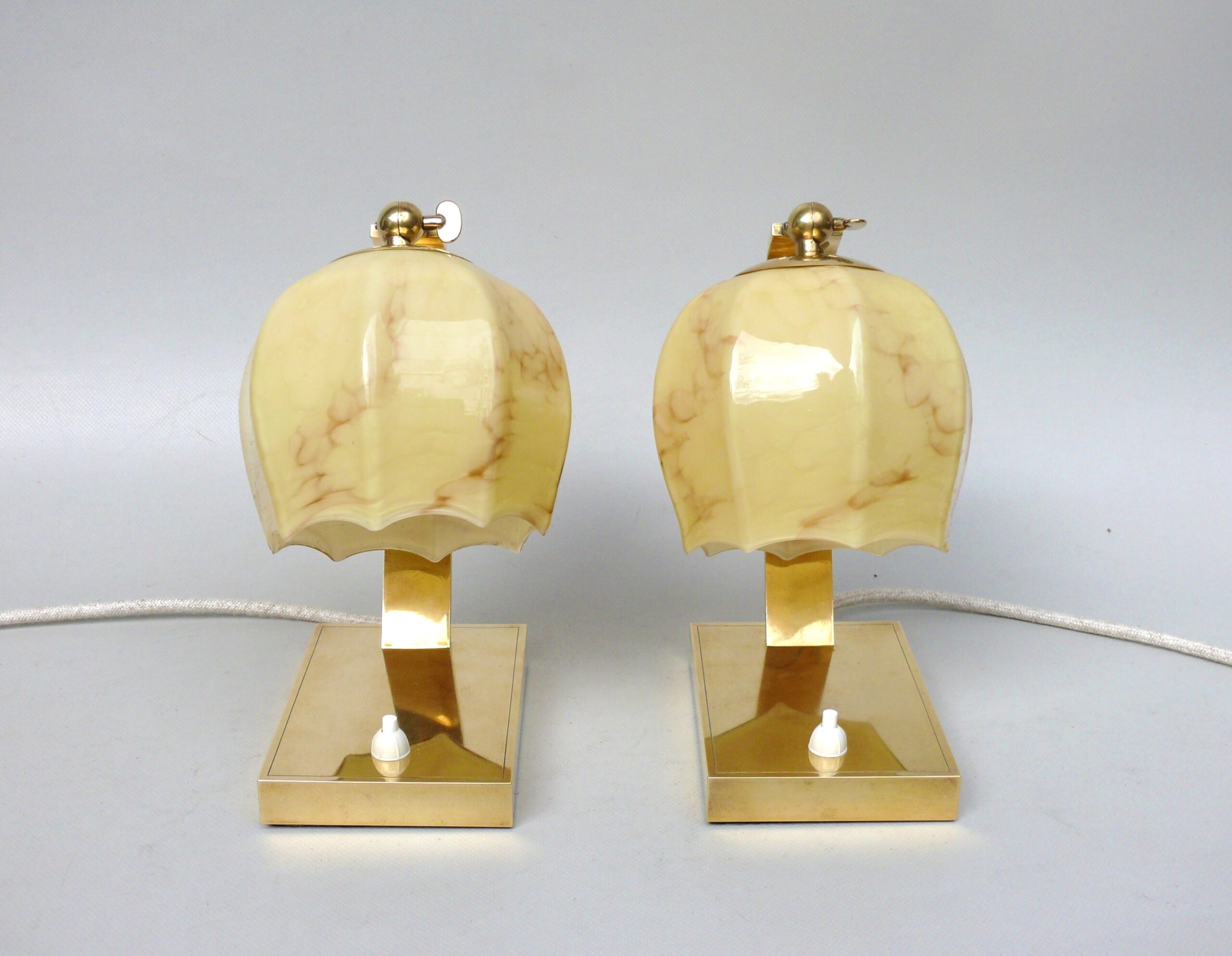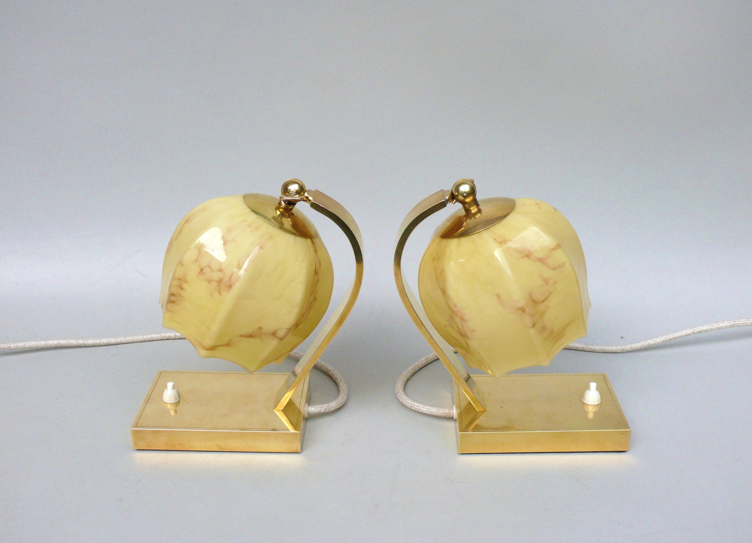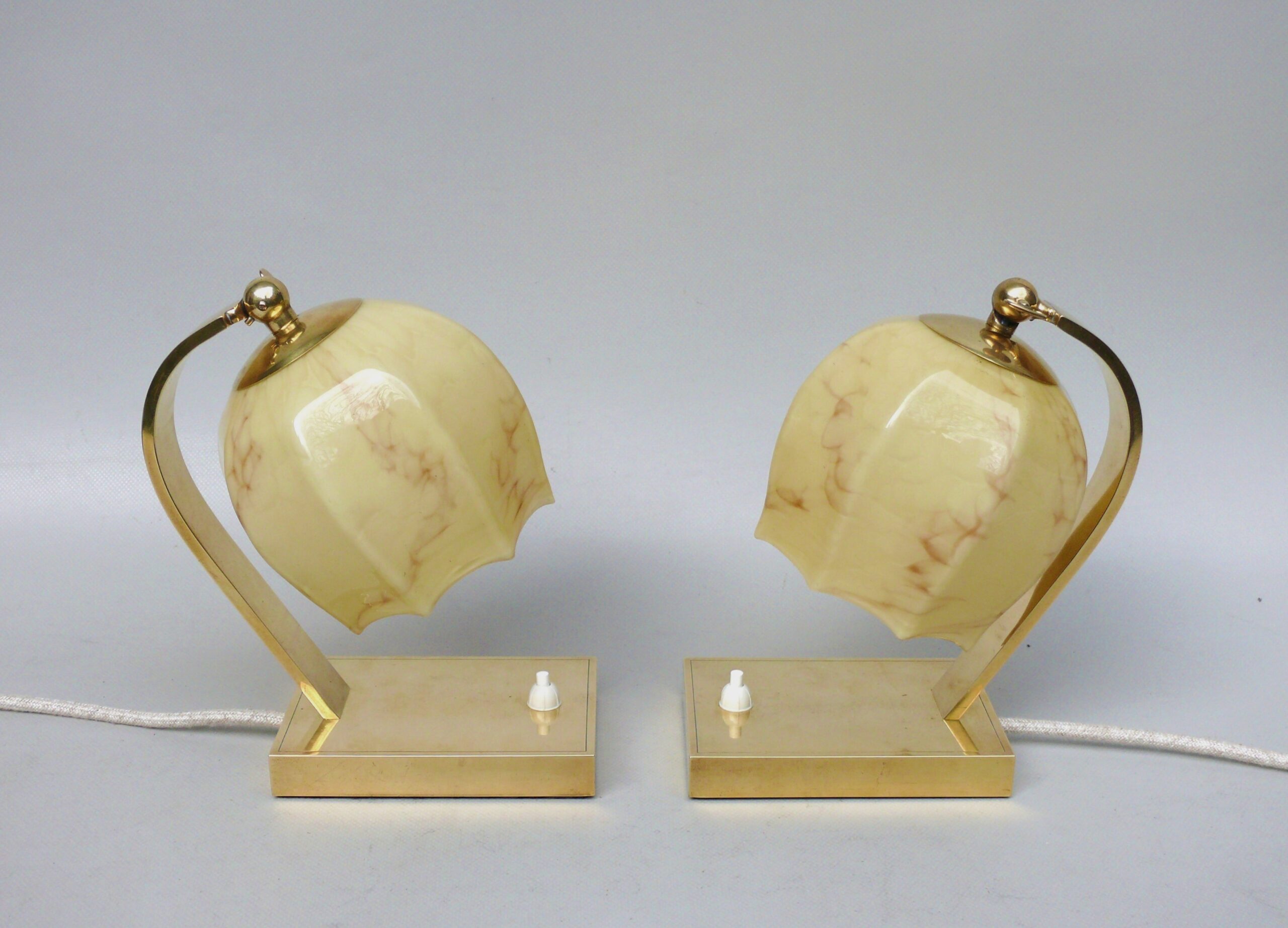NP16 – 1 Paar Nachttischleuchten, Art Deco, Messing, Überfanglasschirme beige