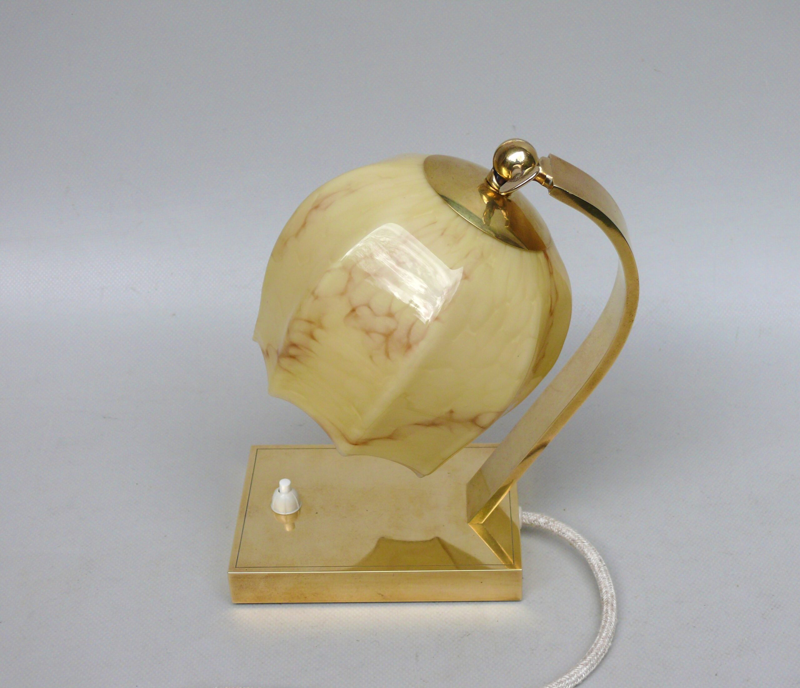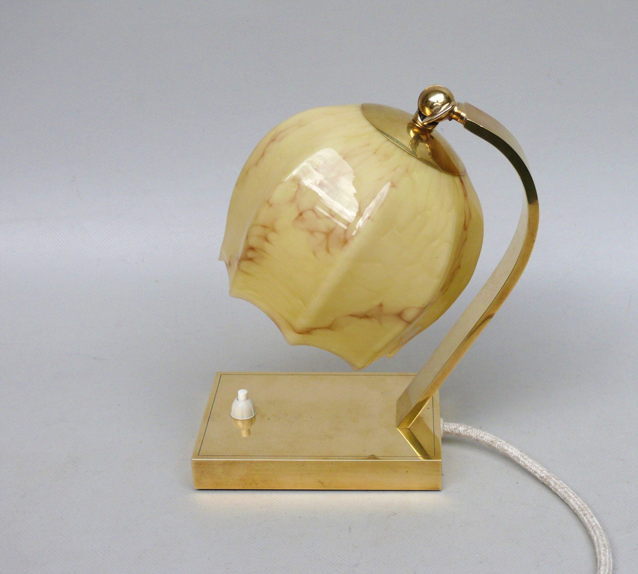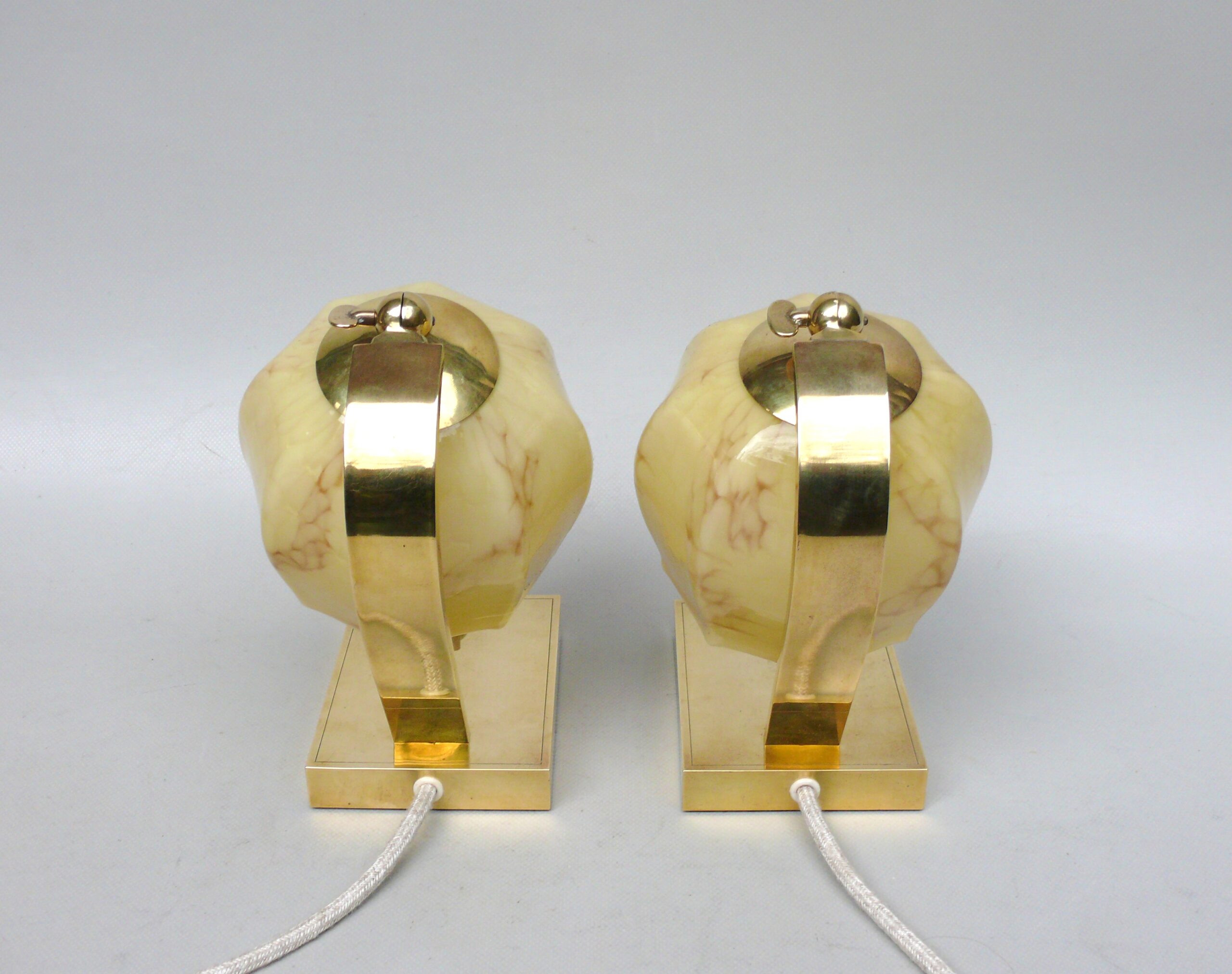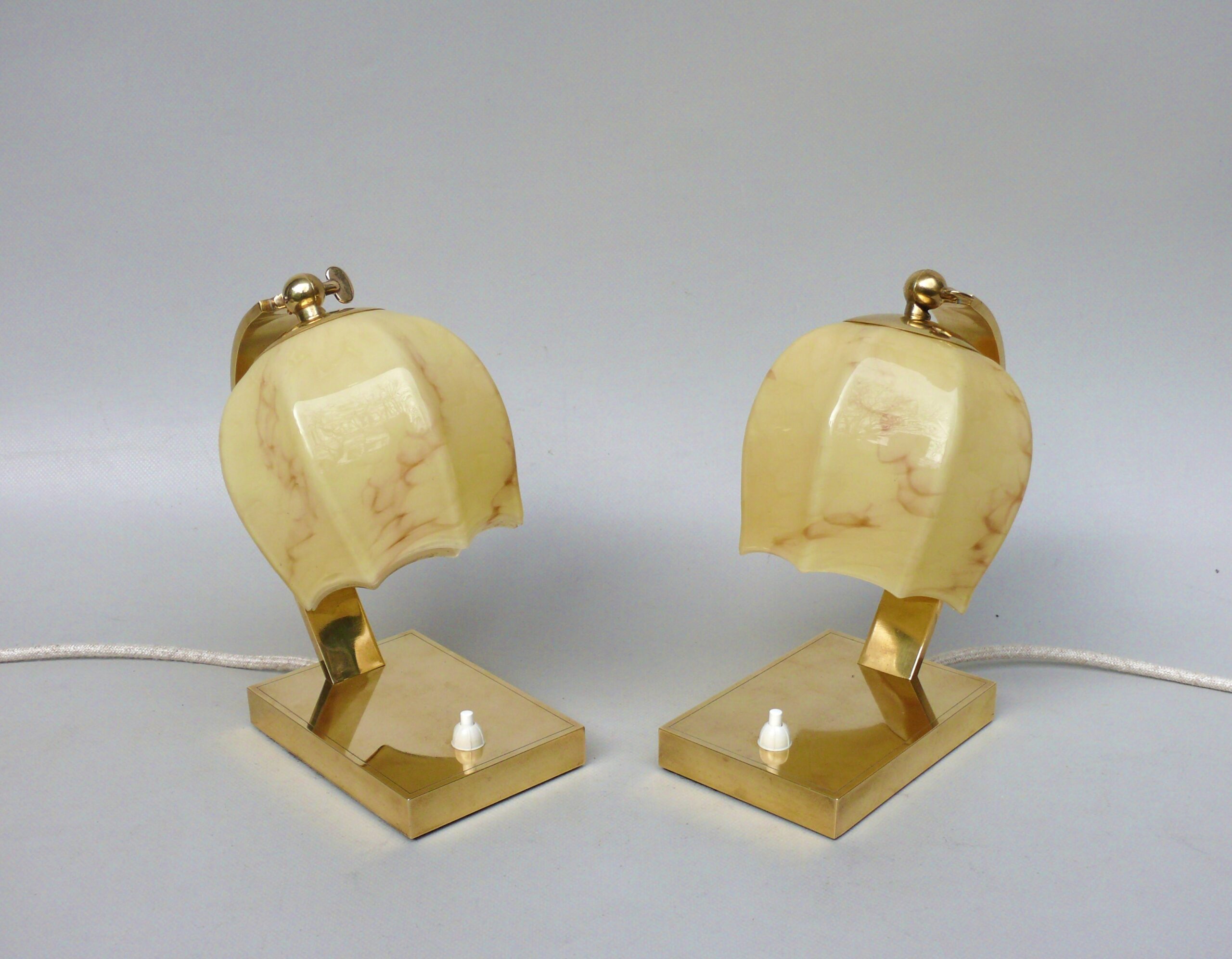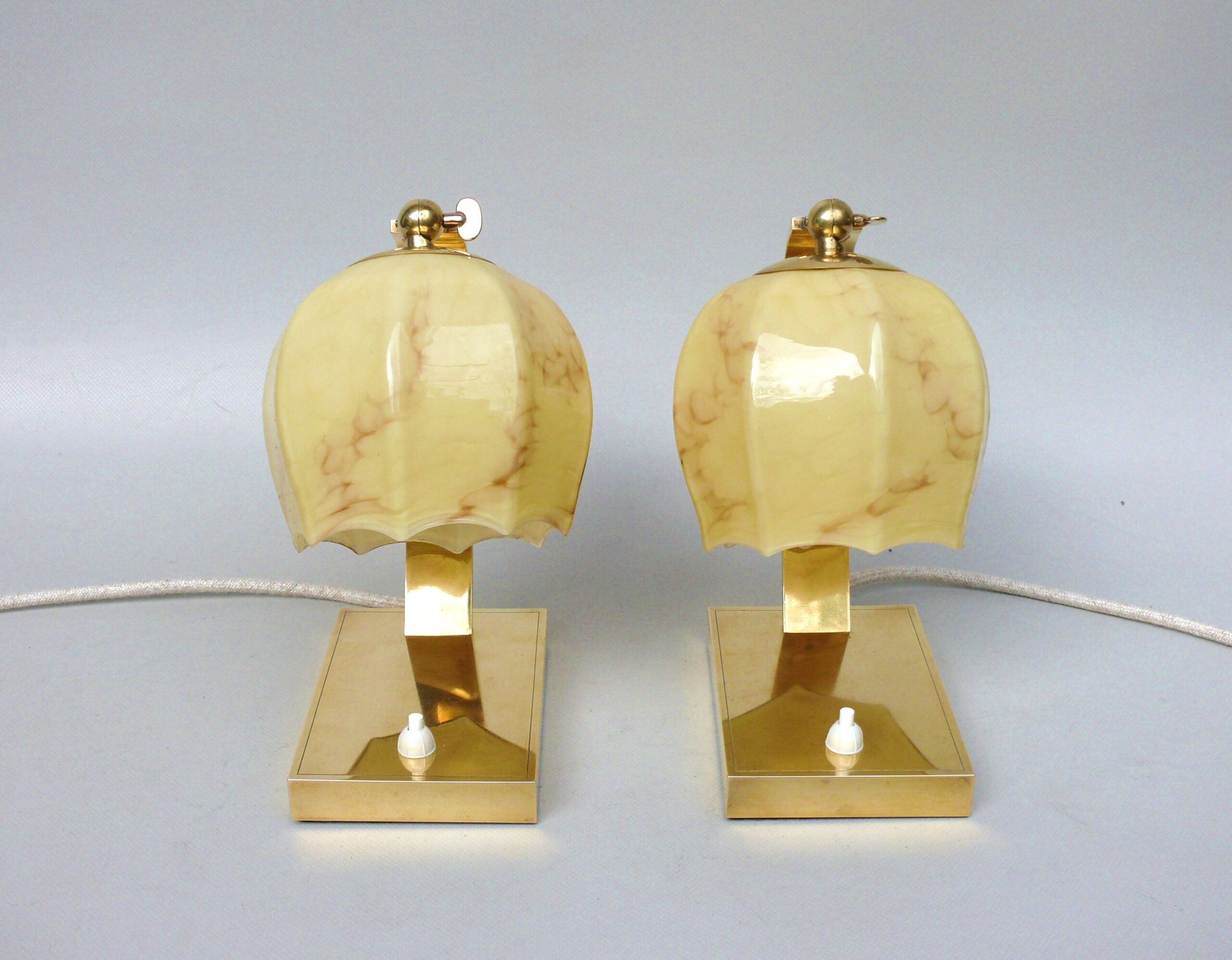 NP142 – 1 Paar Nachttischleuchten, Art Deco, Deutschland, Messing patiniert, Überfangglas beige