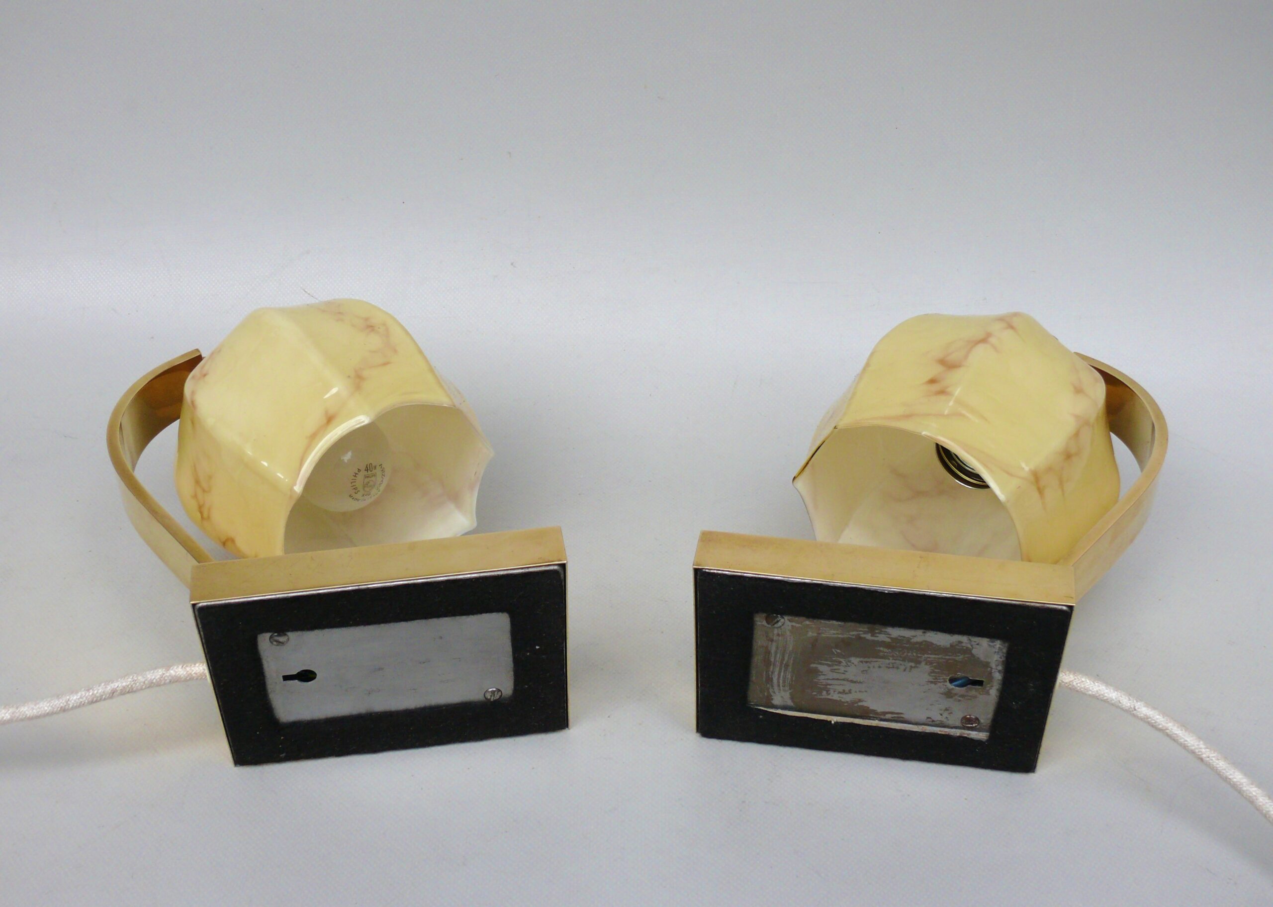 Die Schirme sind Metallblech, der Sockel ist Gußeisen, beides lackiert in beigem Schrumpflack. Die quadratischen Arme sind Messing patiniert.