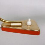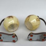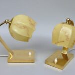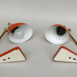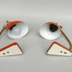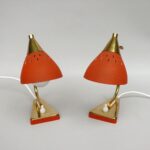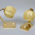 Ein Paar in der Formgebung außergewöhnliche Nachttischleuchten aus den 50er Jahren, hergestellt in Österreich. Die Leuchten sind in der Farbgebung unterschiedlich – eine Leuchte verfügt über einen dunkelgrauen Stand und gelben Schirm, die andere Leuchte über einen hellgrauen Stand und einen weißen gerillten Schirm. Die Arme der Leuchten sind jeweils aus Messing.