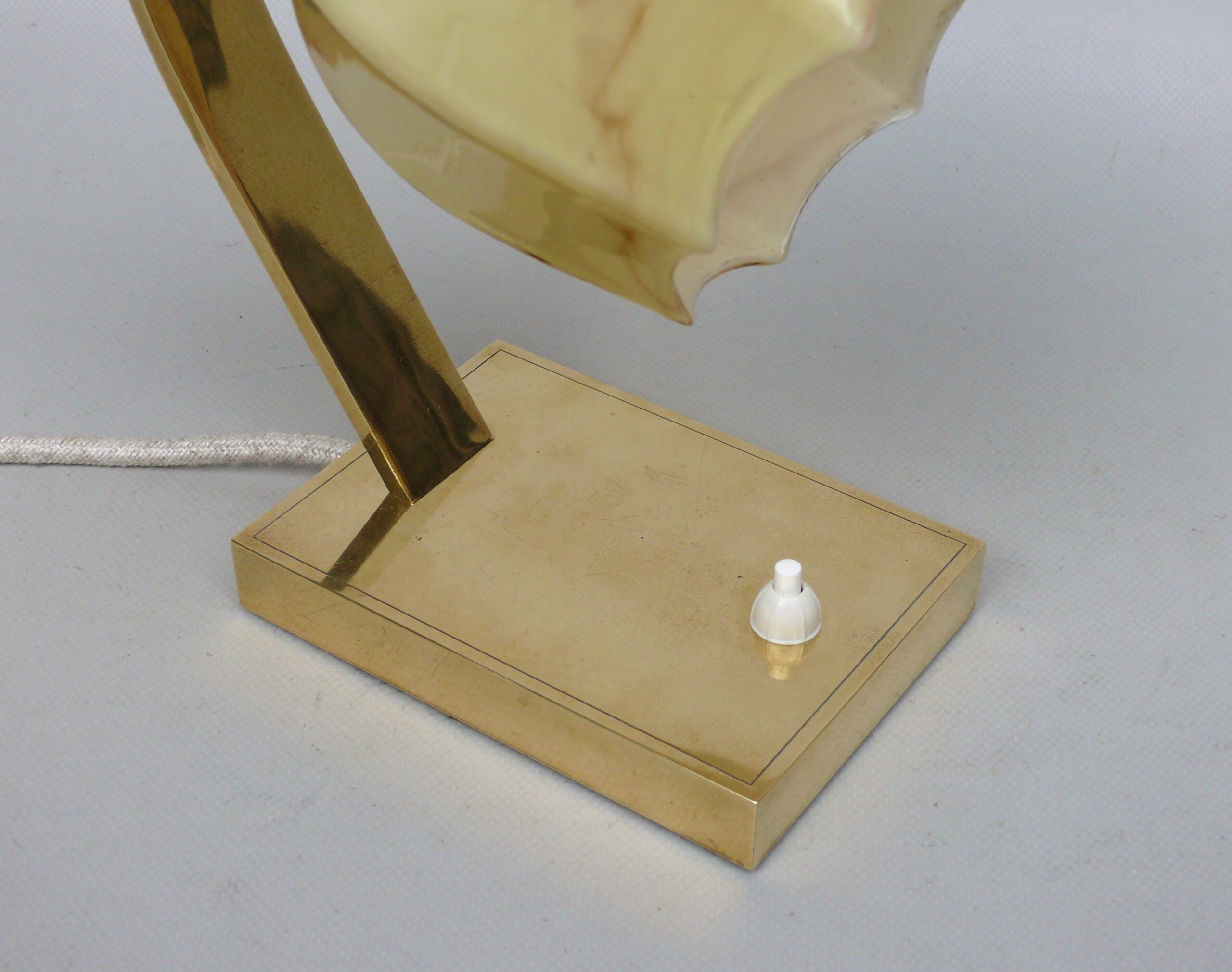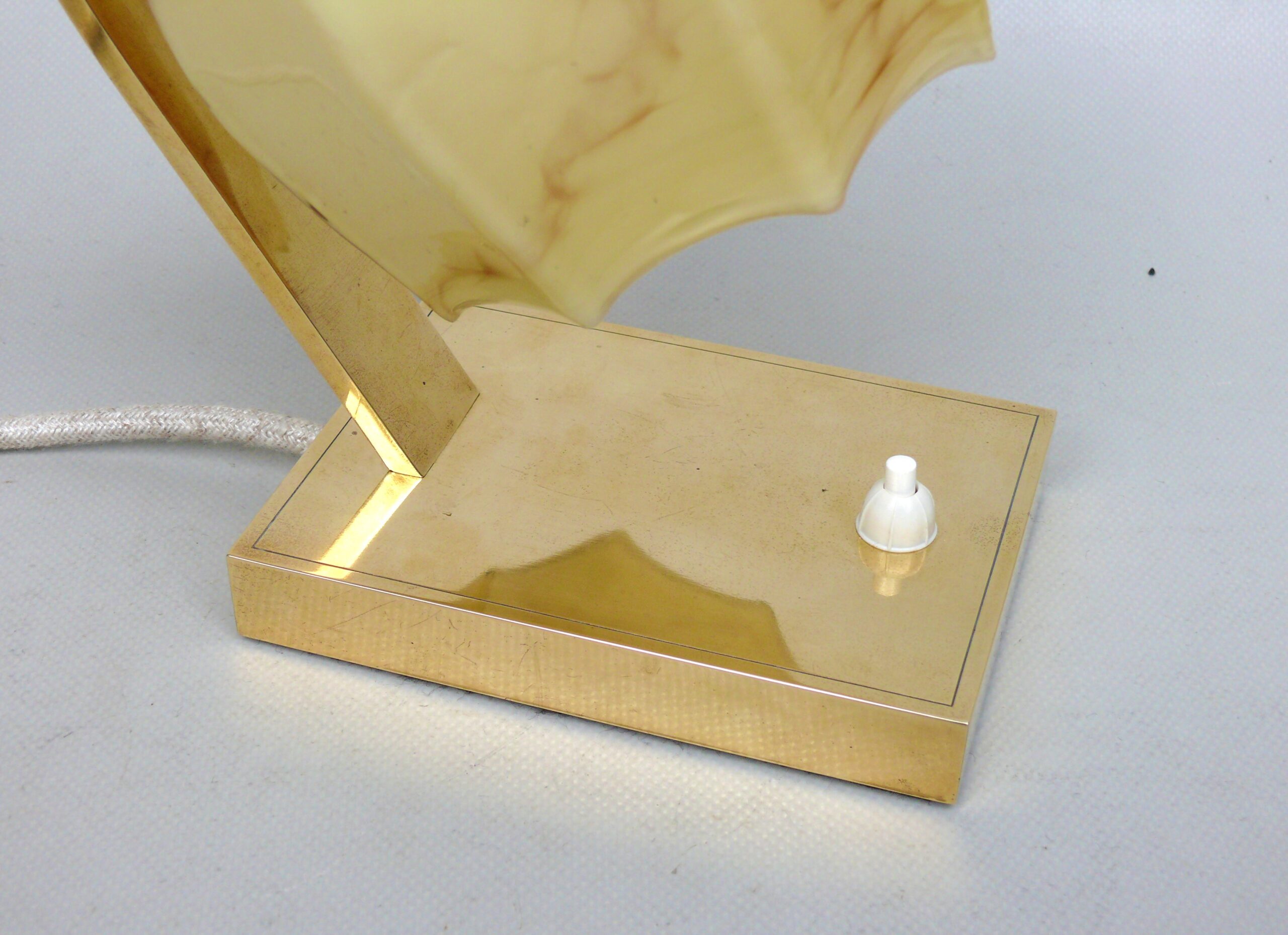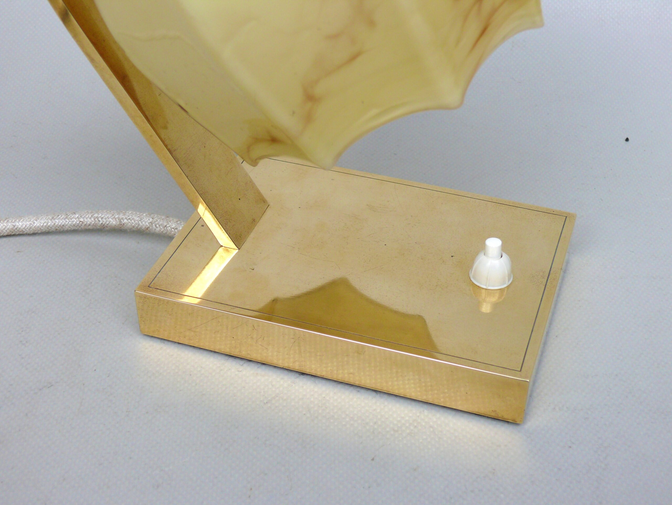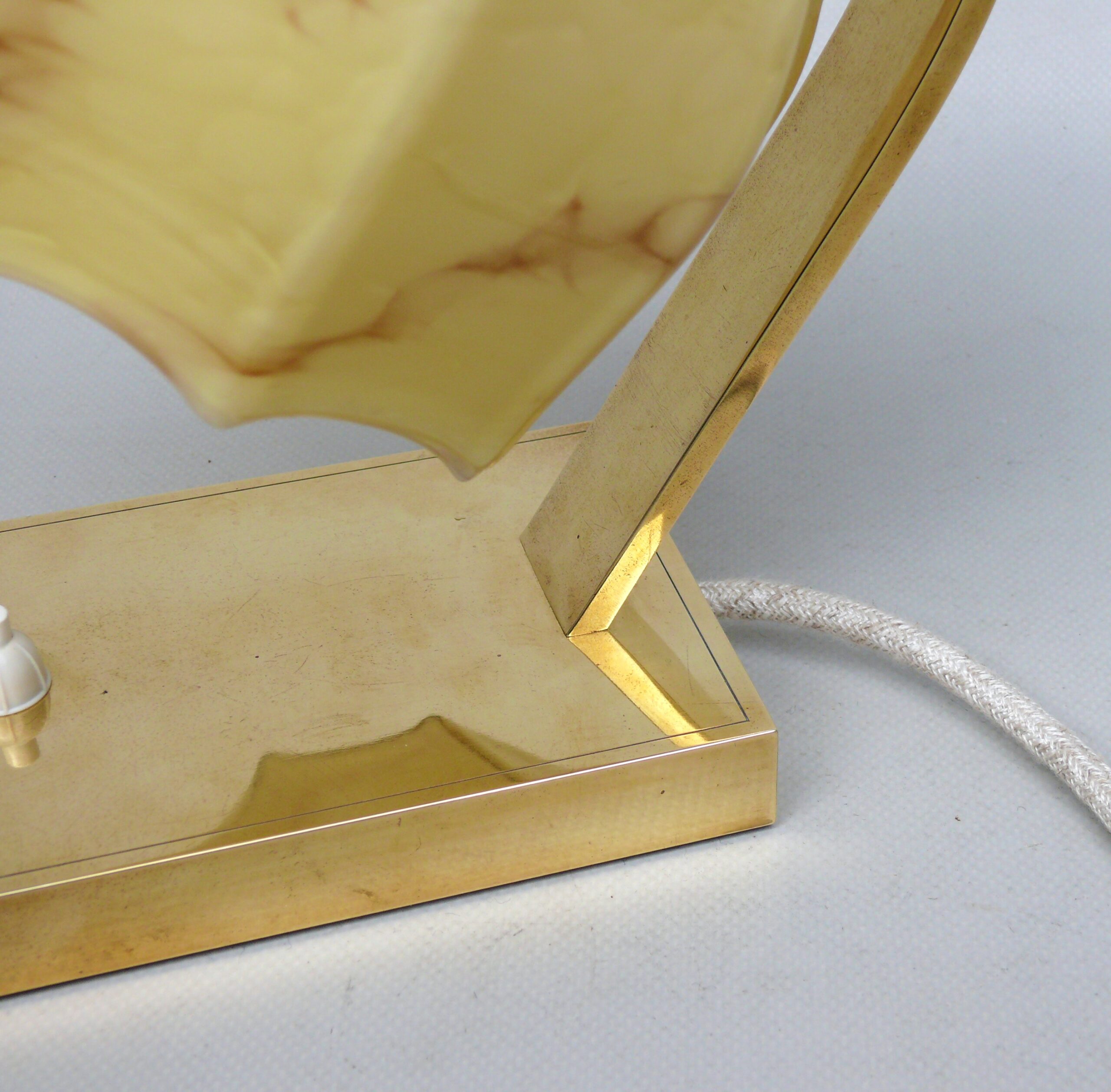 Die Leuchten sind hochwertig aus Messing hergestellt. Der Lampenarm ist aus rechteckigem Messingrohr, der Sockel hat ebenfalls eine rechteckige Grundform.