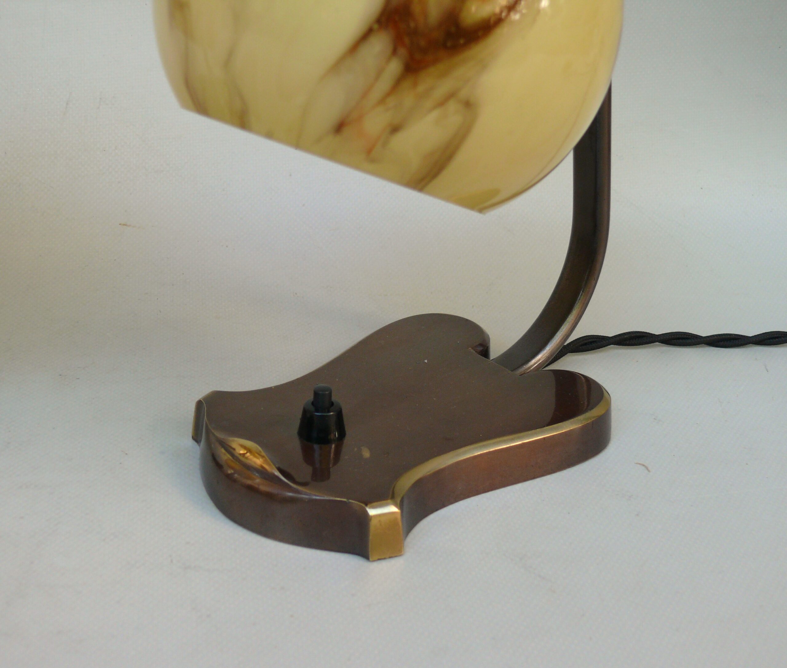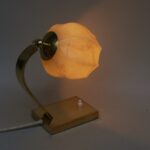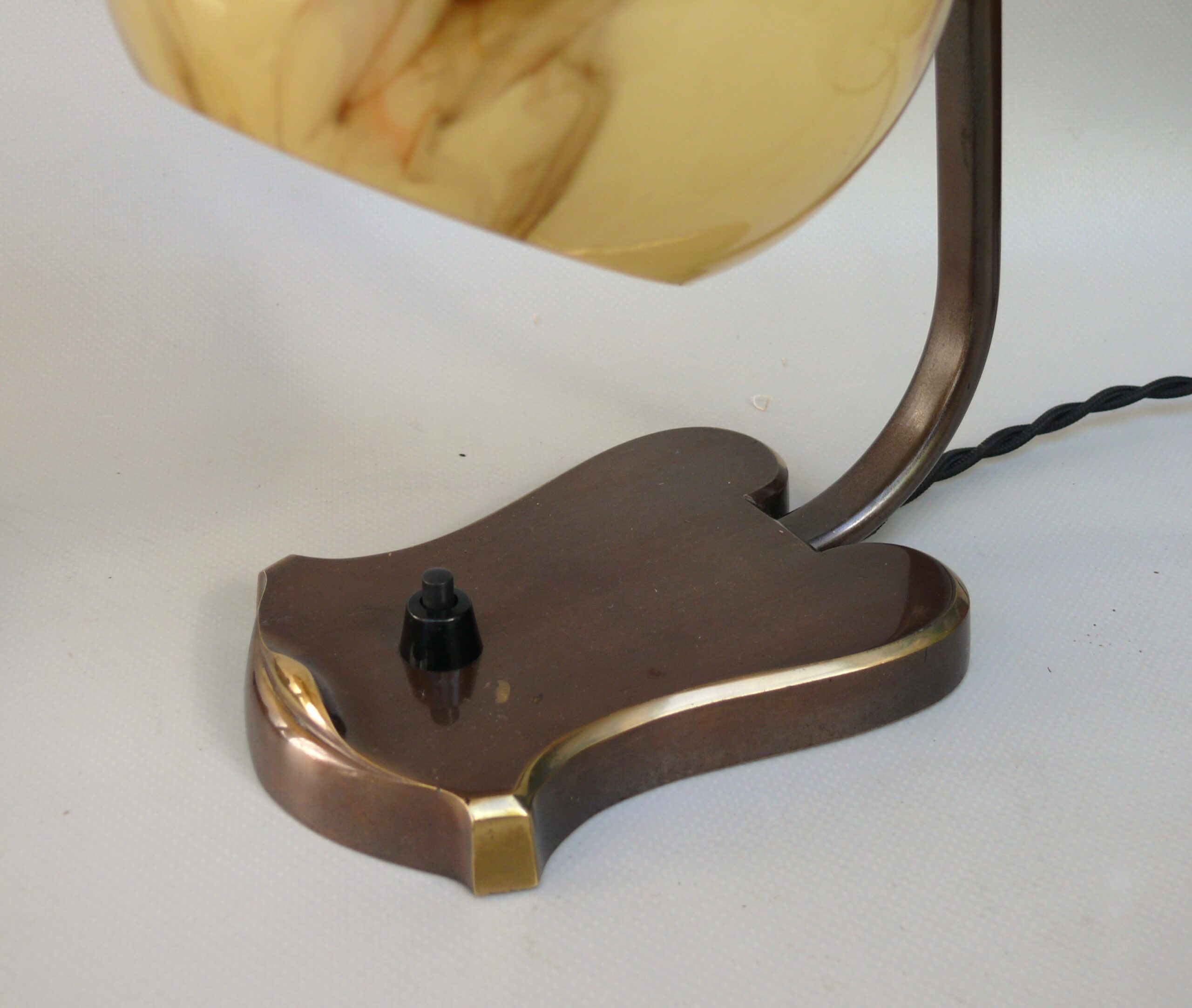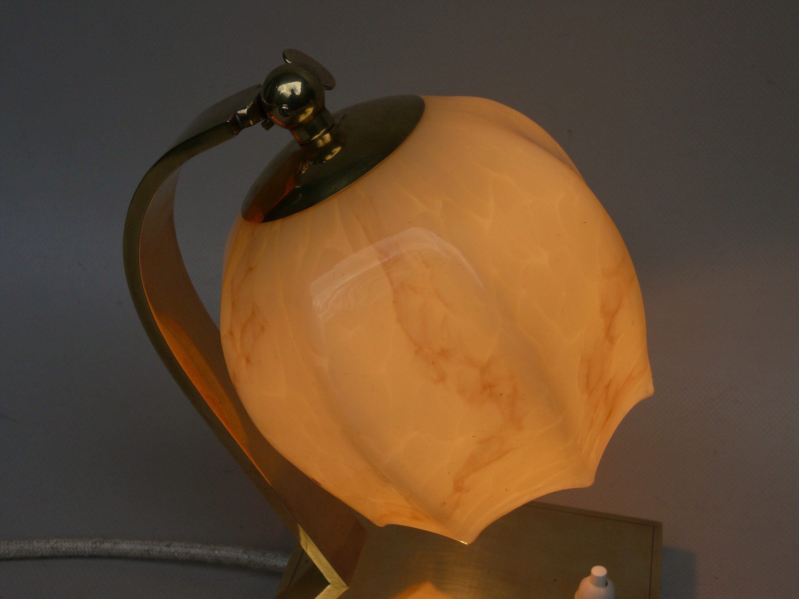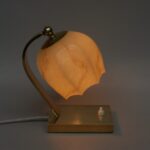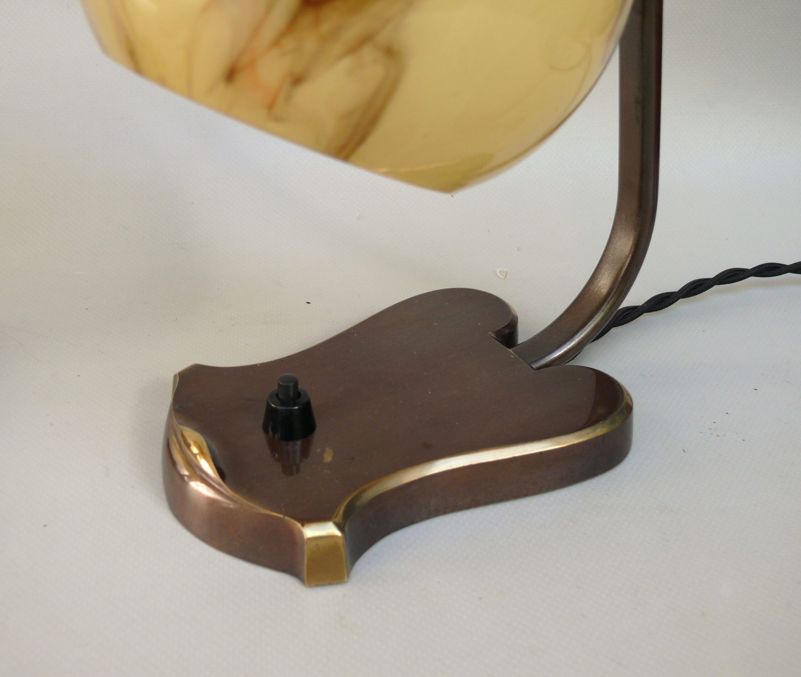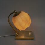 NP145 – 1 Paar Nachttischleuchten, Bauhaus-Ära, Messing, Lampenschirm „Blüte“ Überfangglas beige-hellbraun geflammt