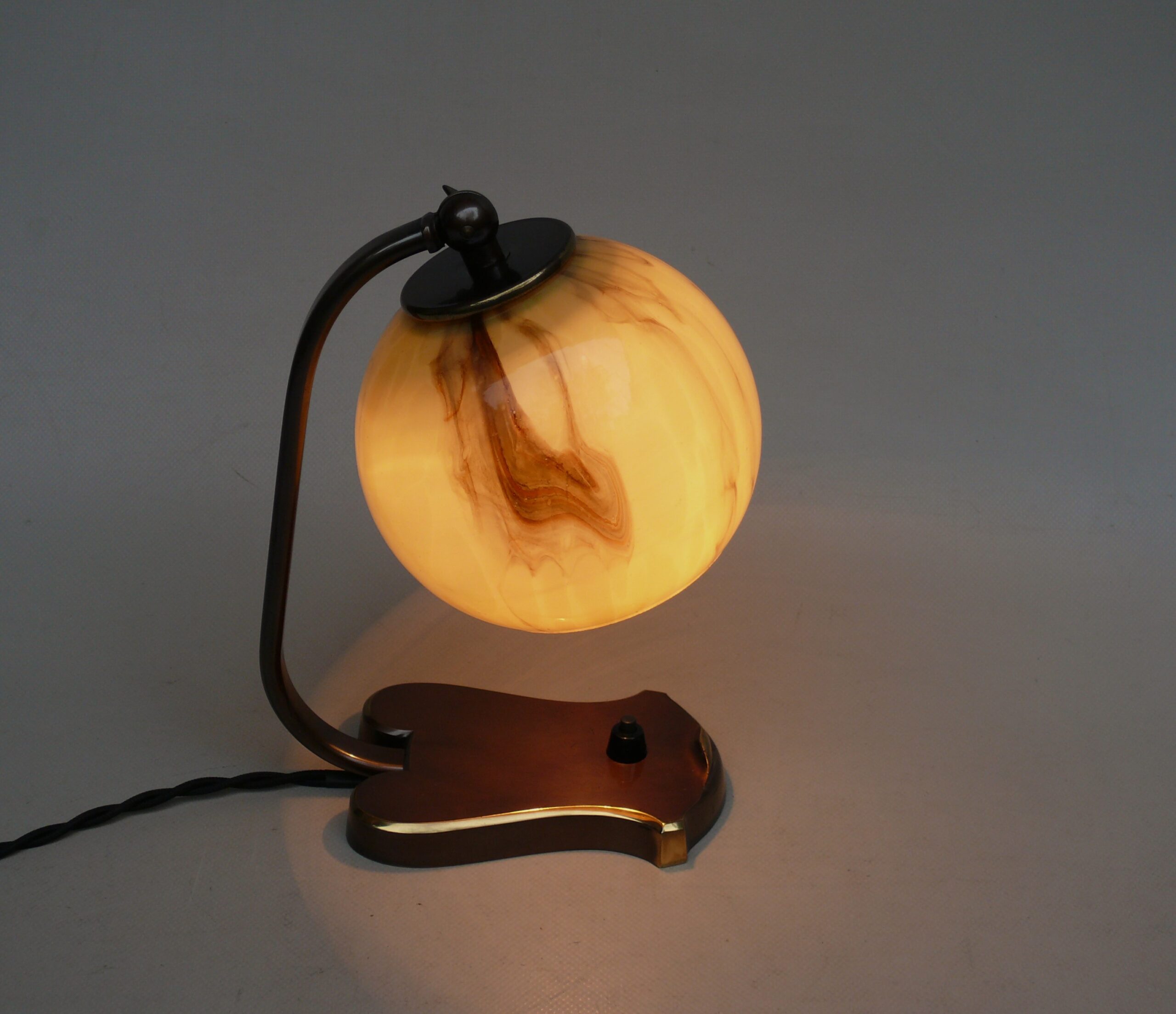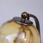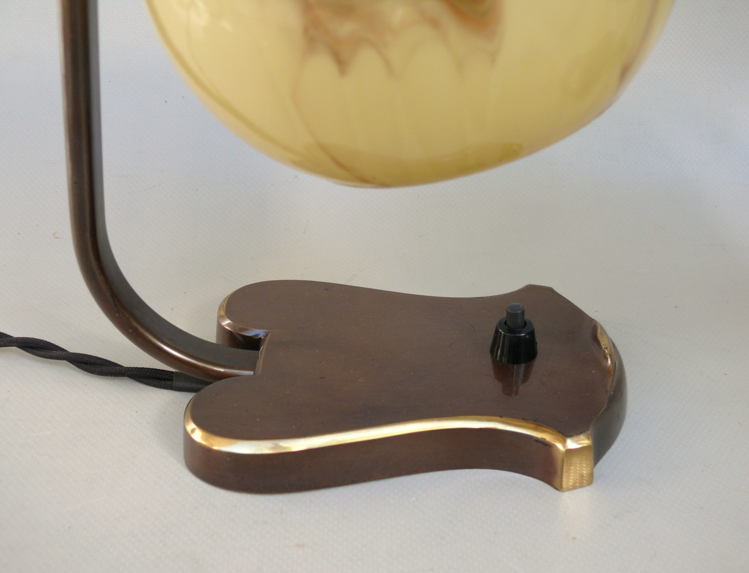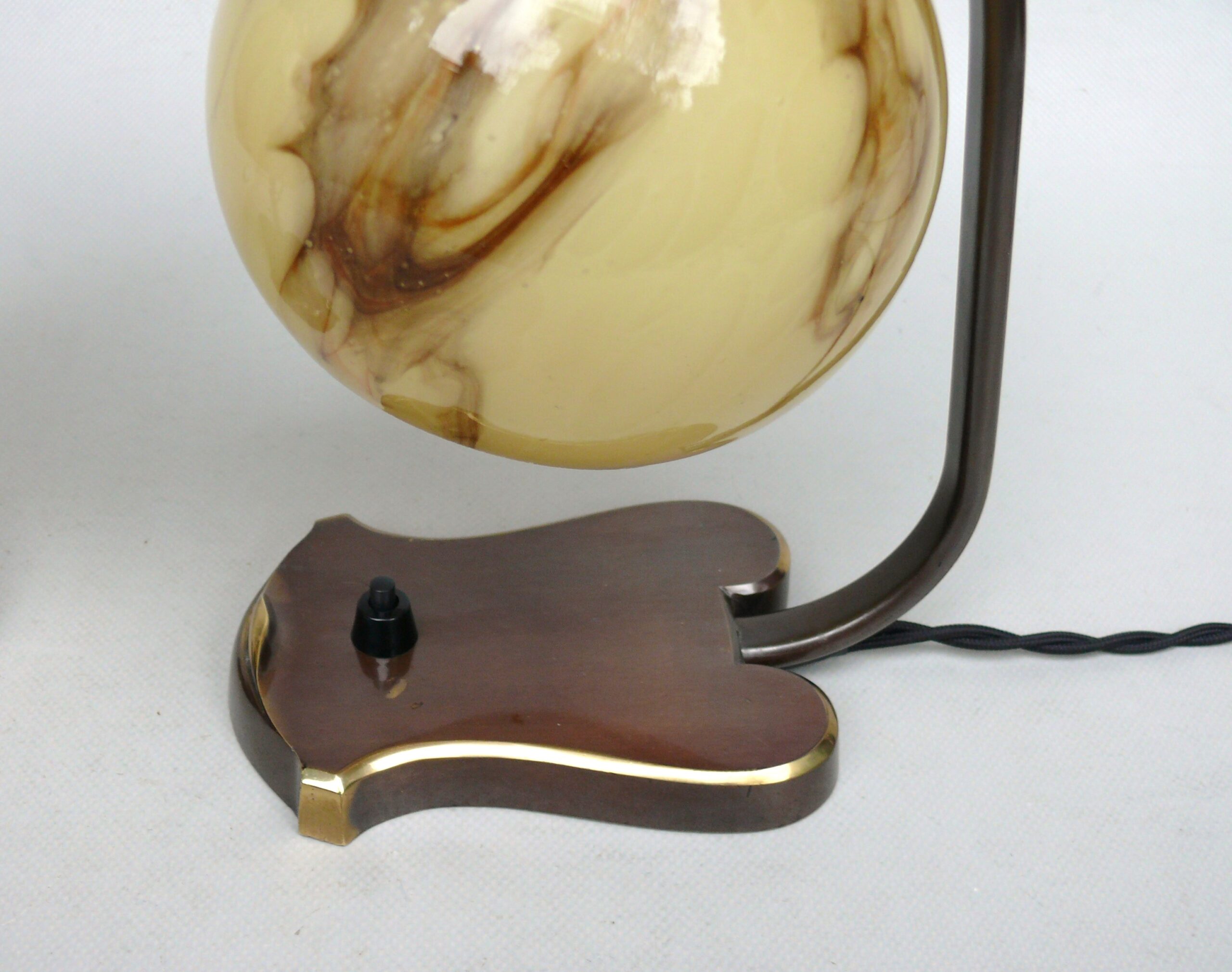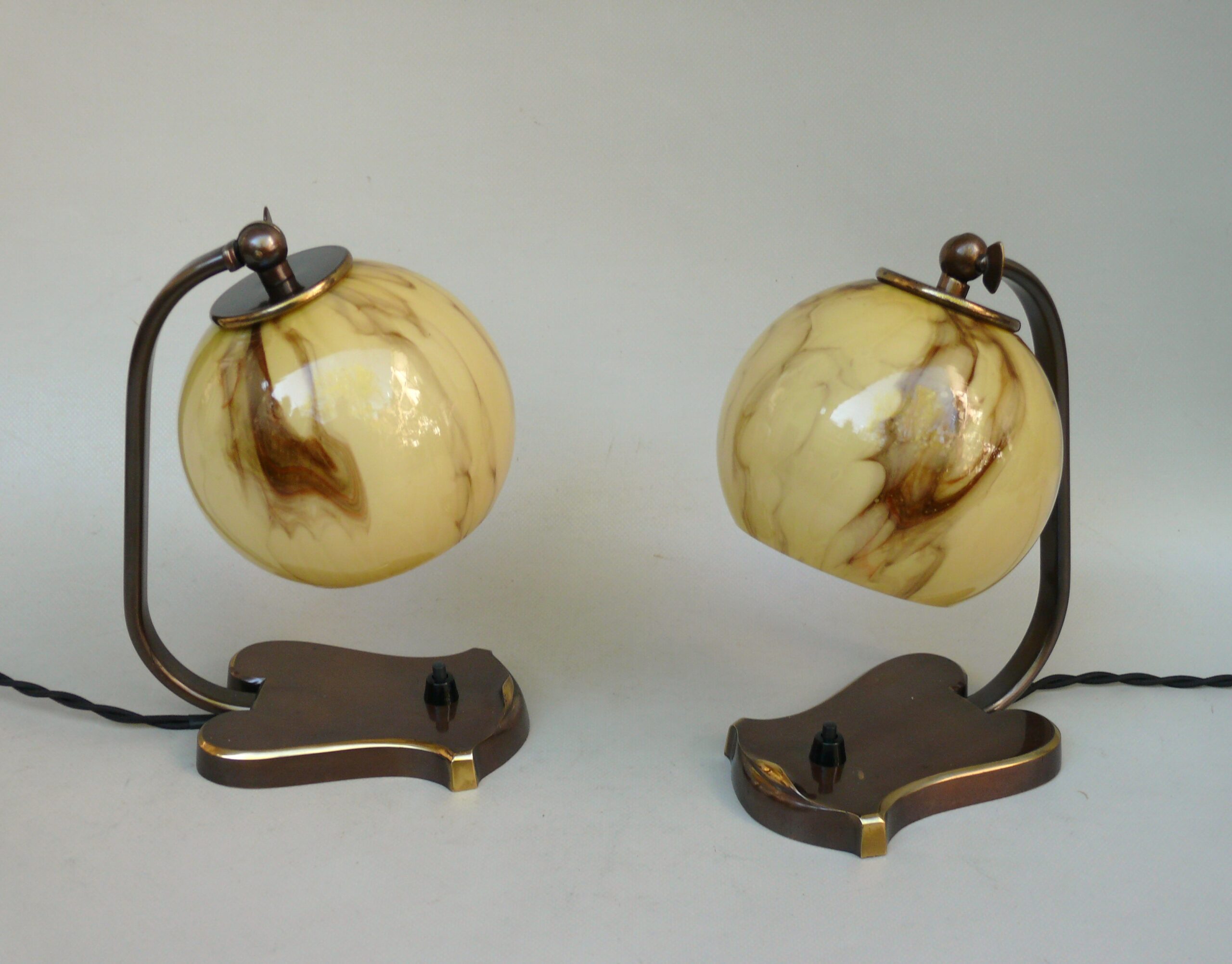 NP7 – 1 Paar Nachttischleuchten, Art Deco, Messing, Lampenschirme Überfangglas beige/braun geflammt