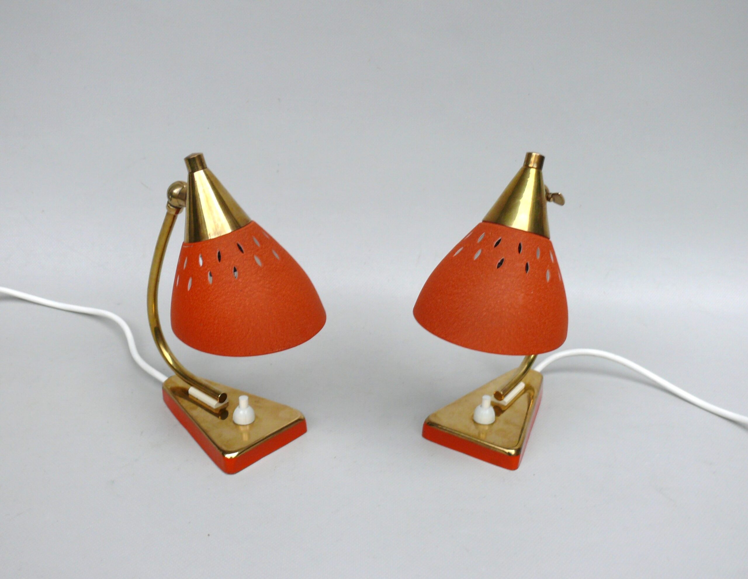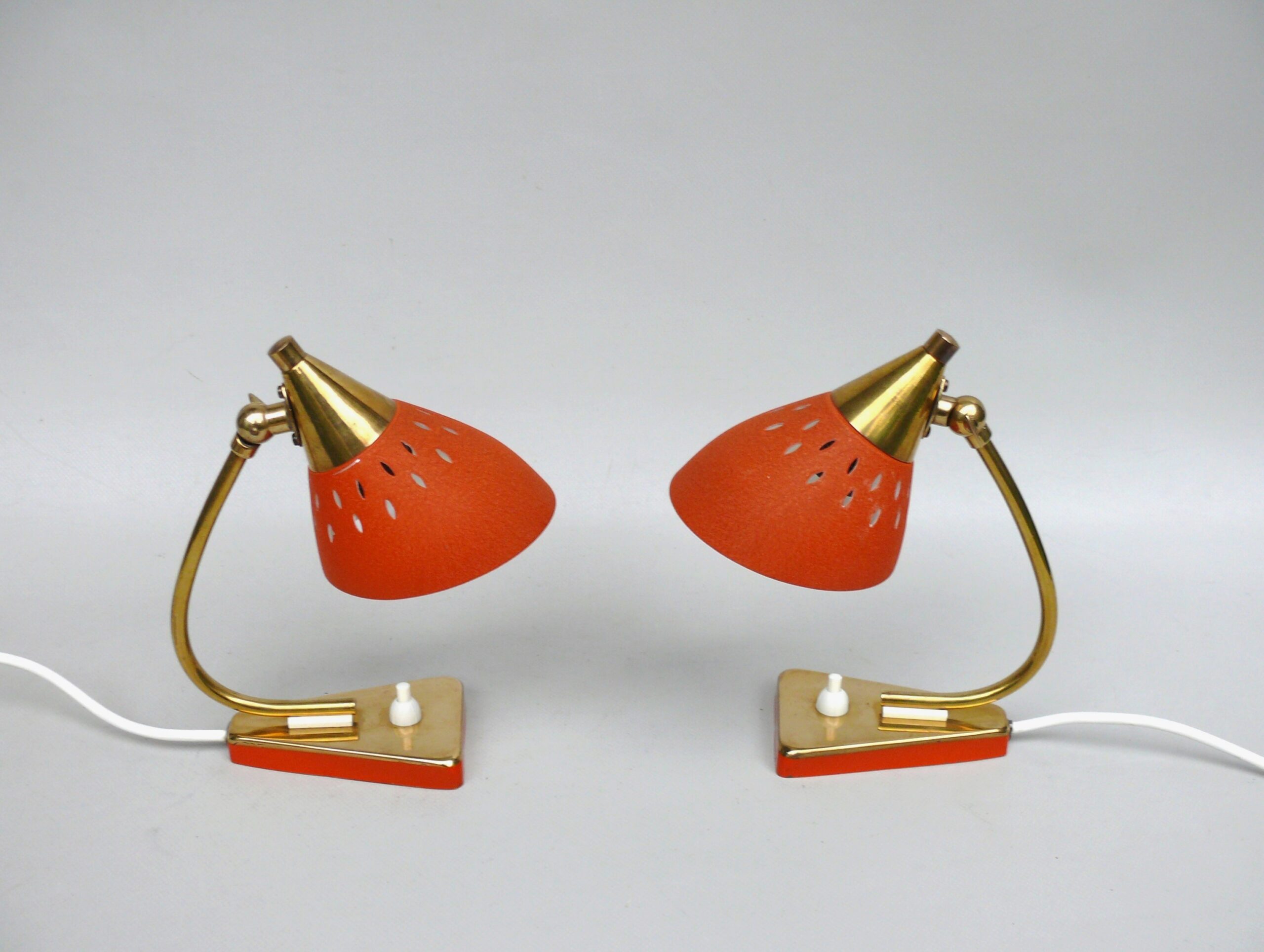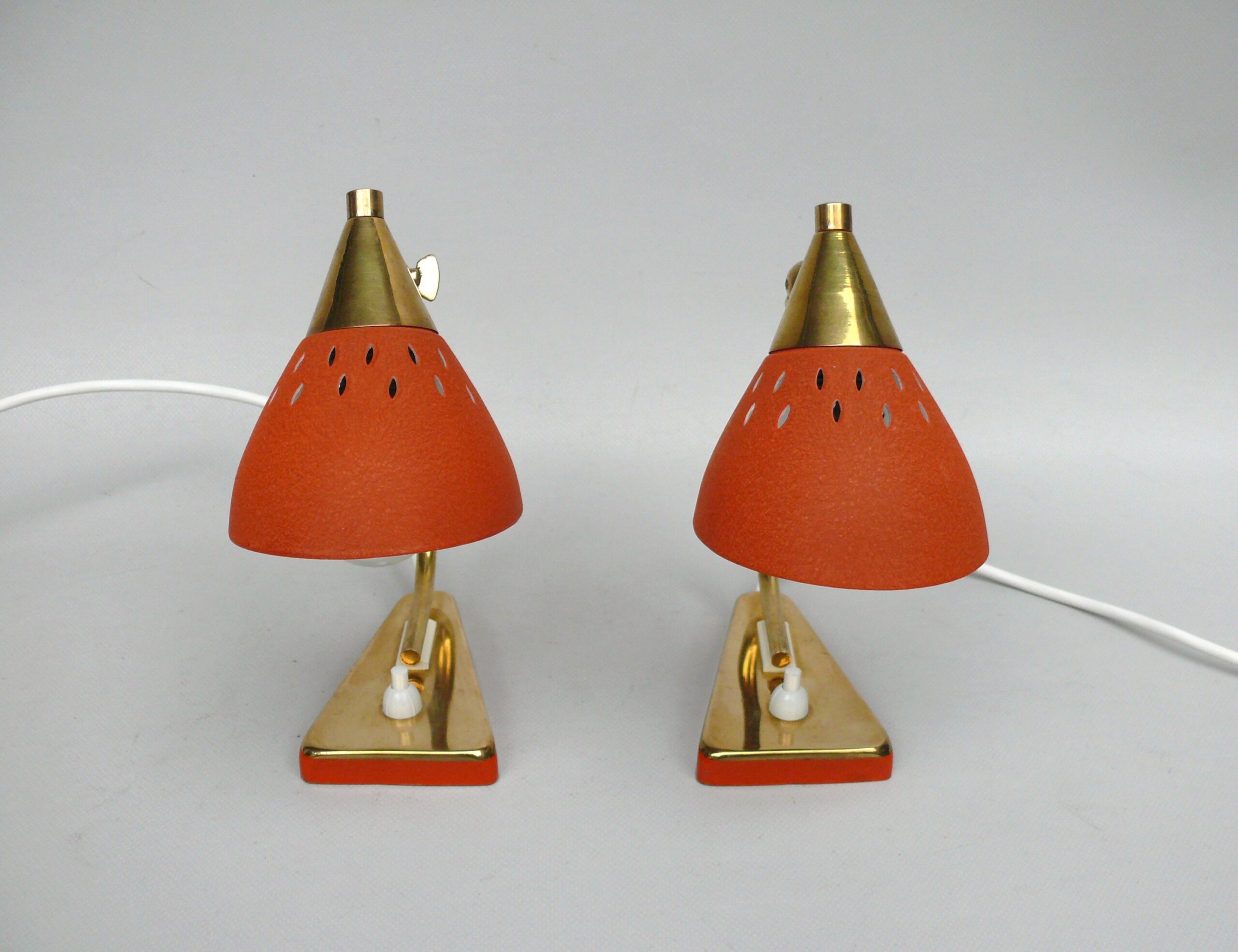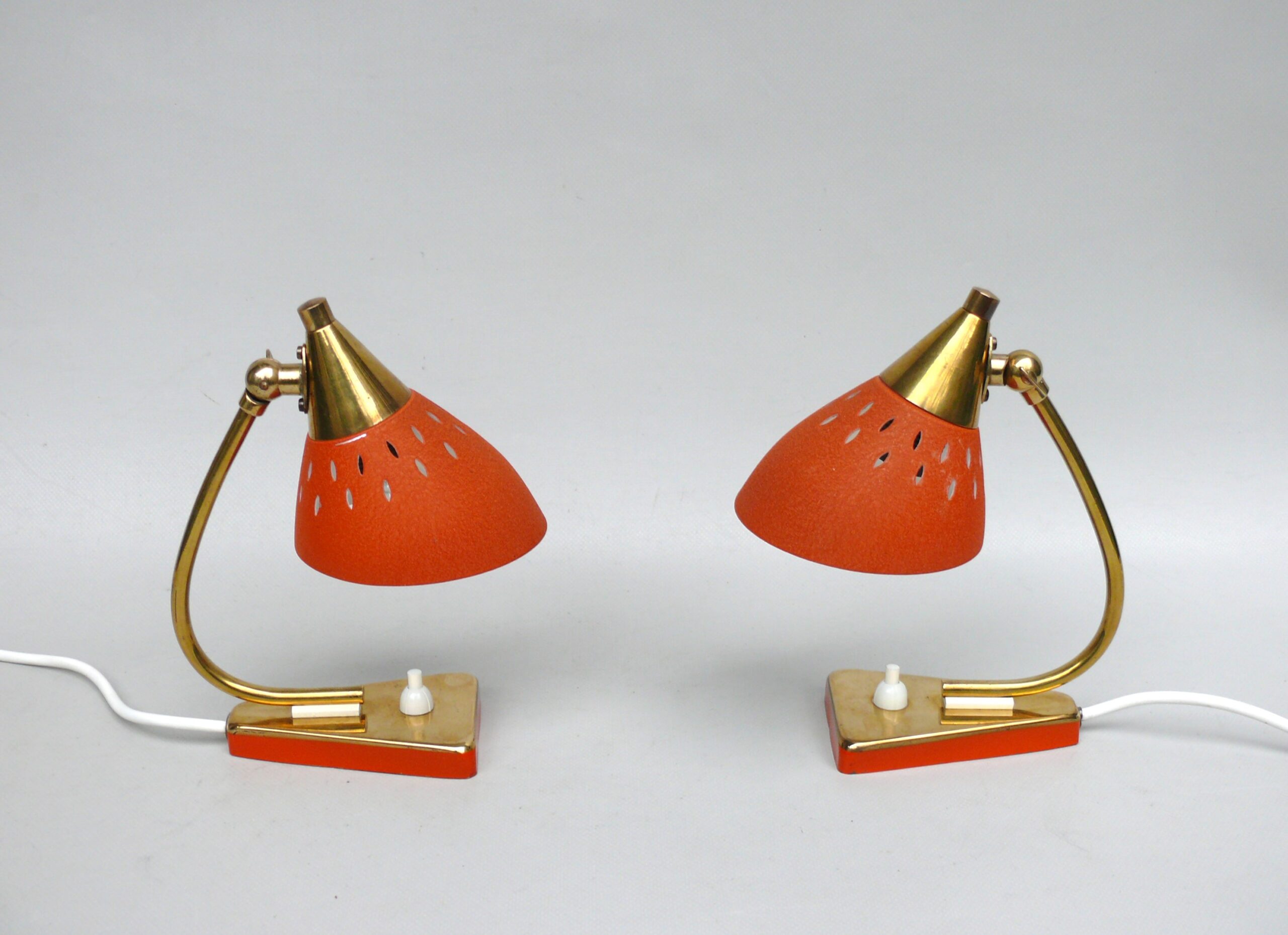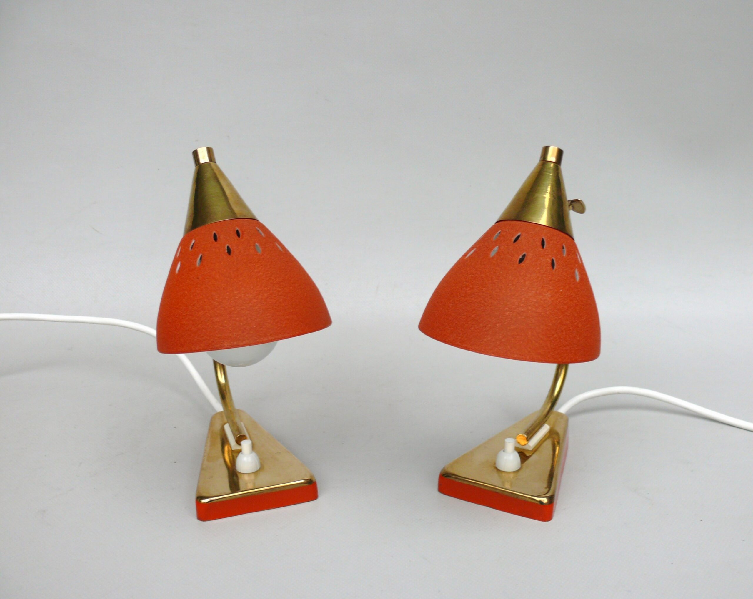 NP19 – 1 Paar Nachttischleuchten, 50er Jahre, Deutschland, orange, weiß, Messing, zugeschrieben Gebr. Cosack, Neheim-Hüsten