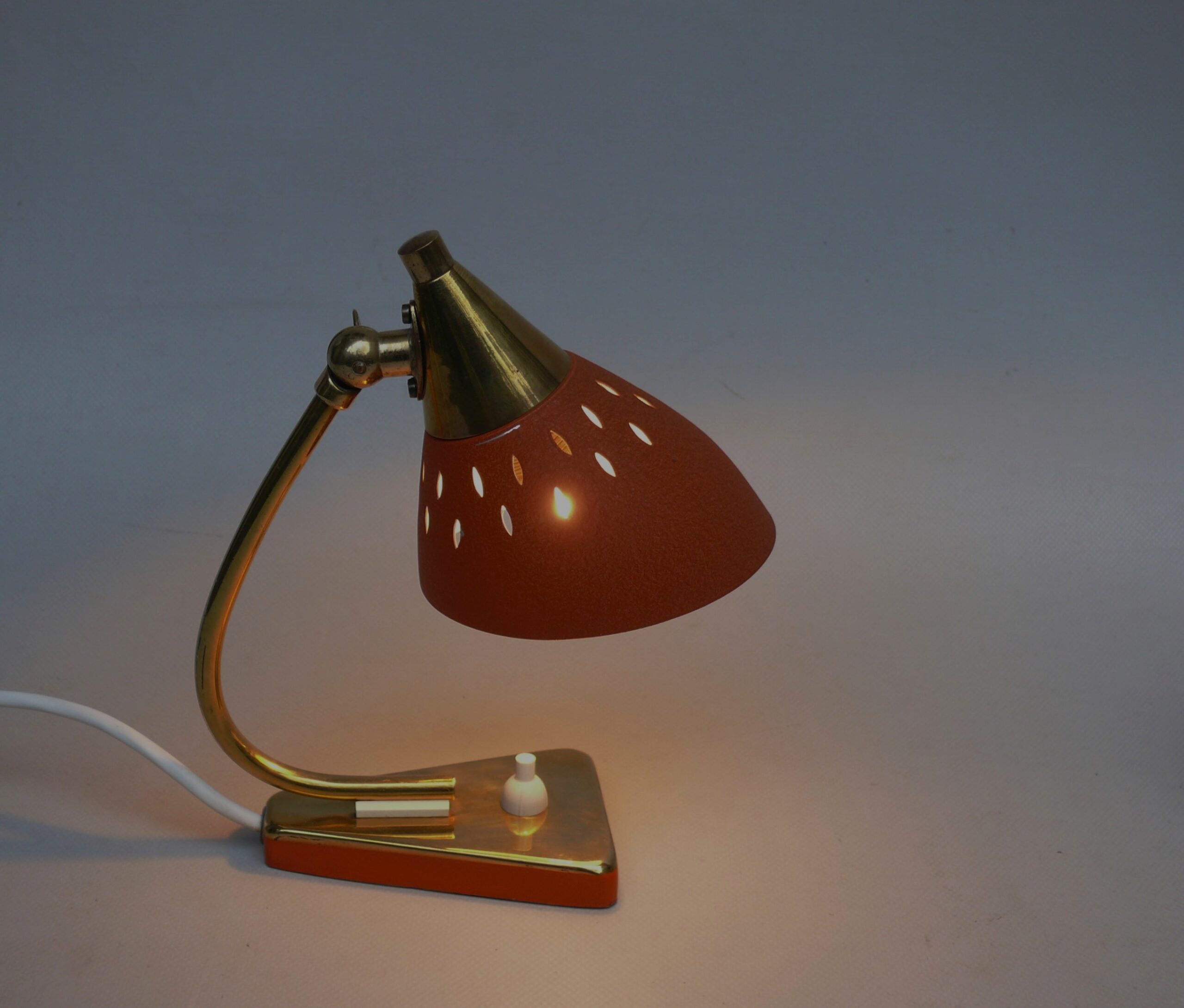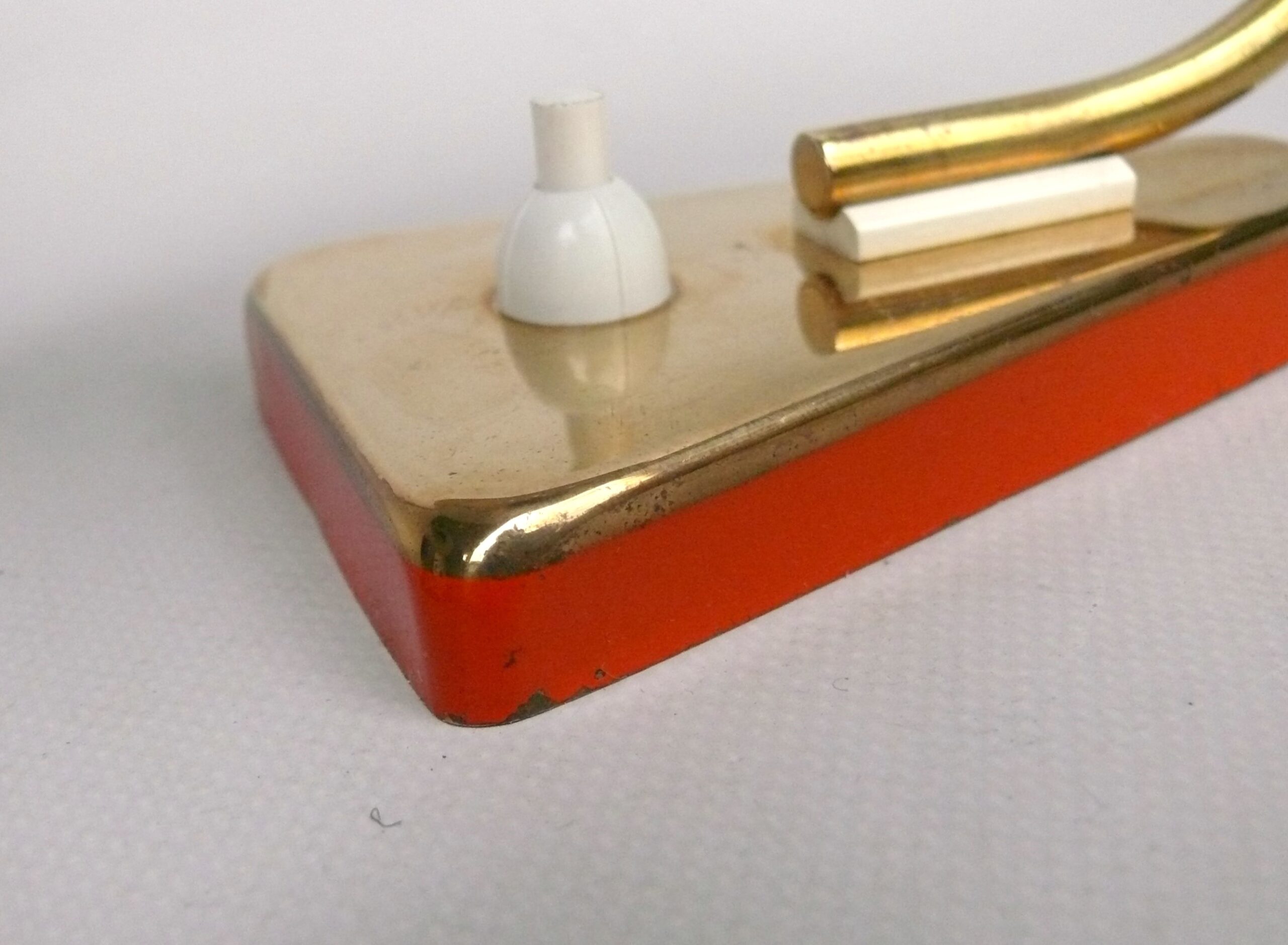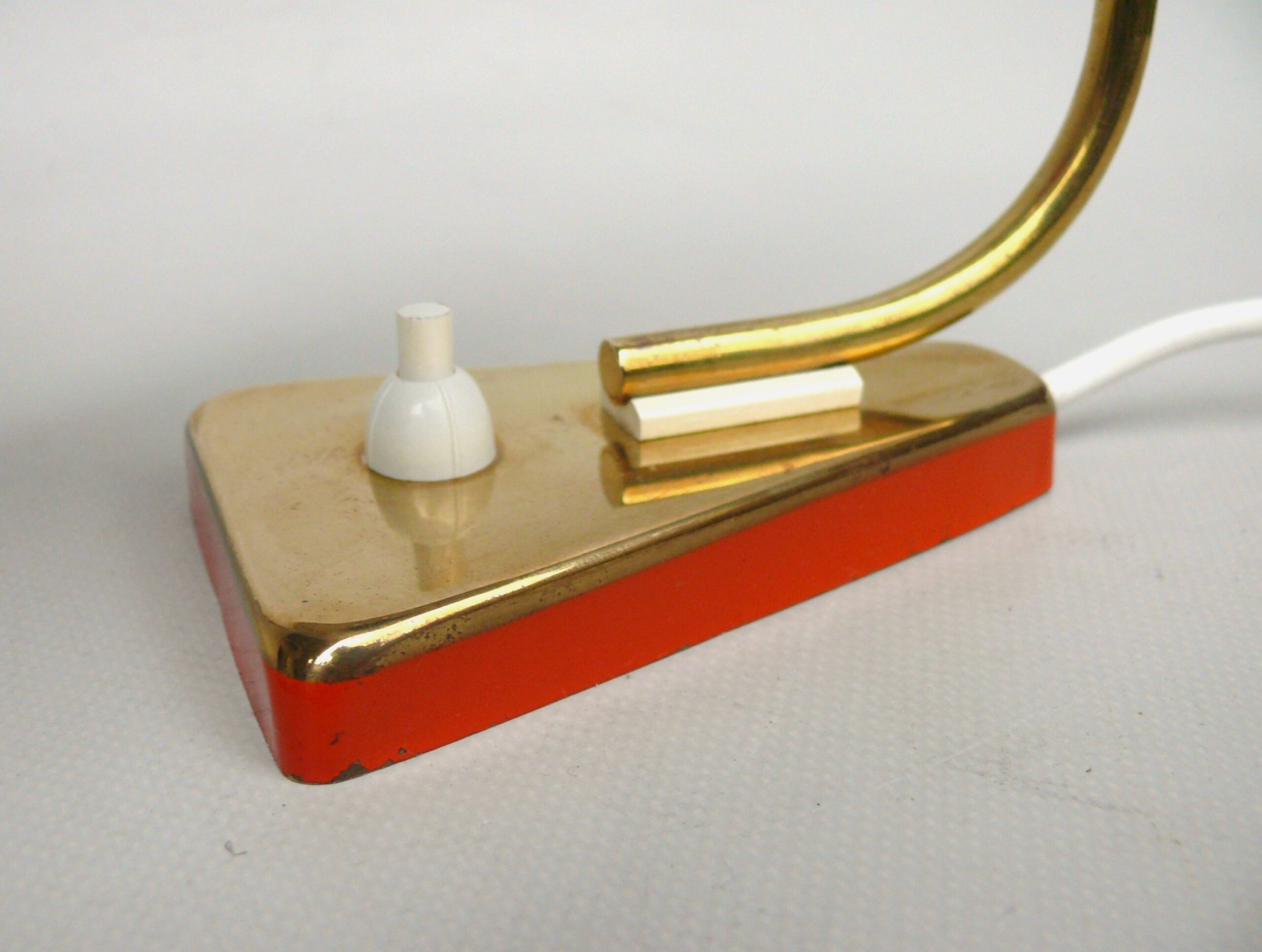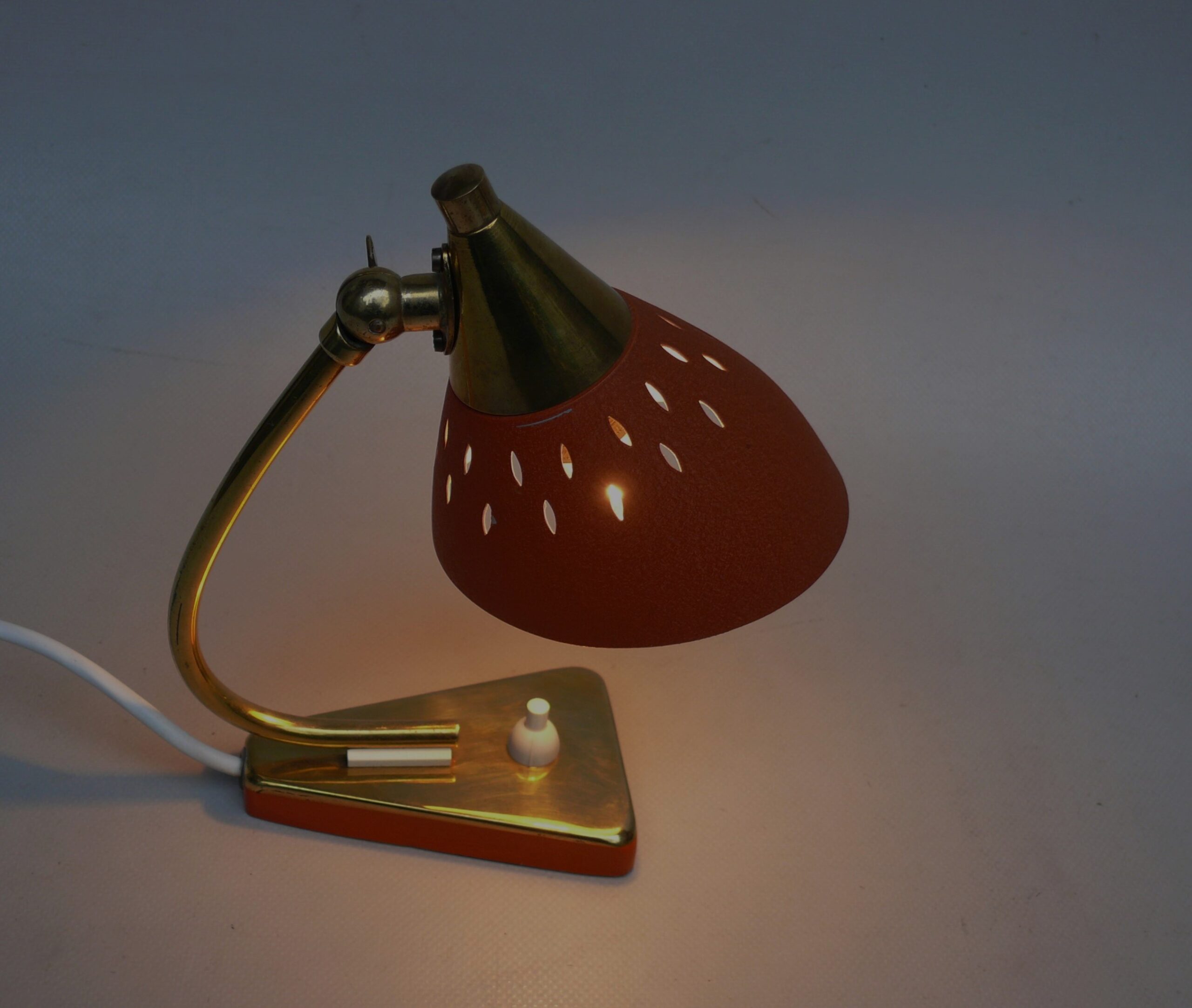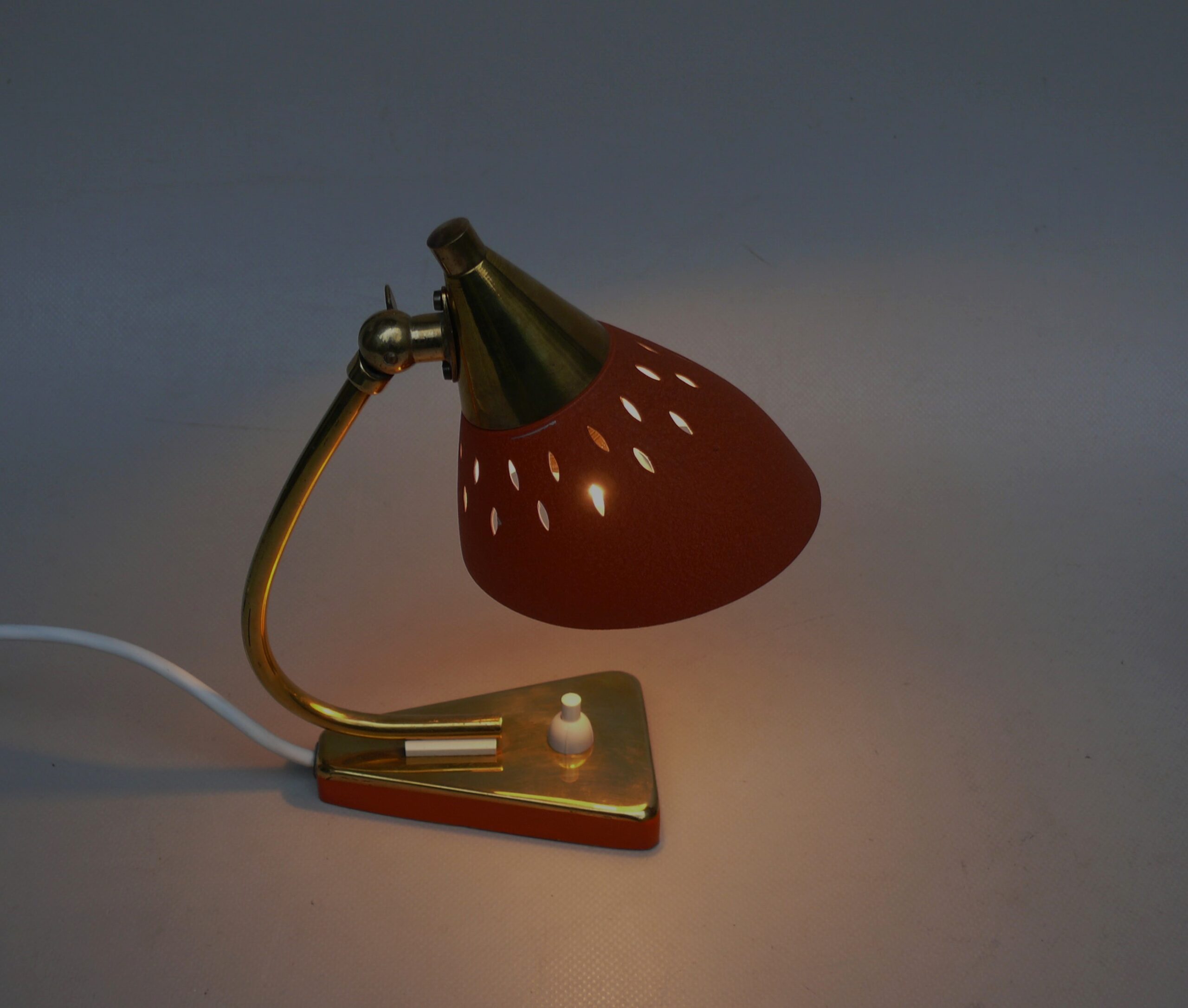 Ein Paar zierliche und außergewöhnlichte Nachttischleuchten, hergestellt in den 50er Jahren in Deutschland.Elegant ist die Kombination von Messing mit schwarz, rot und beige.